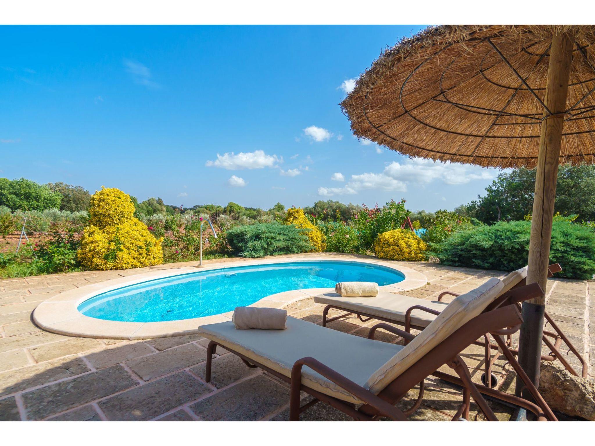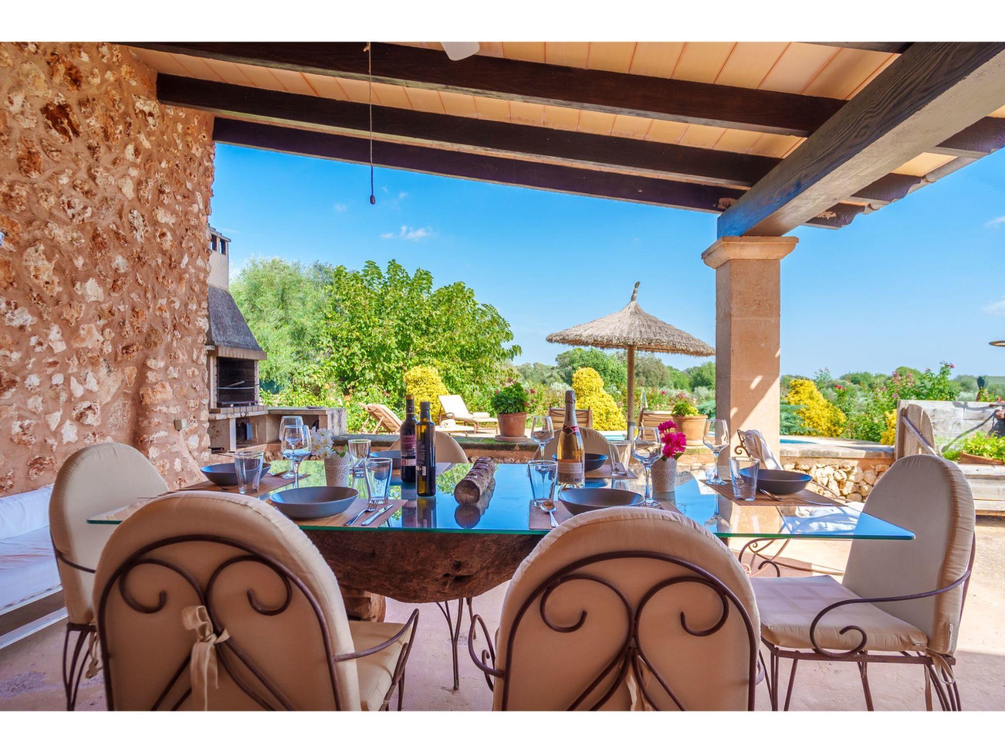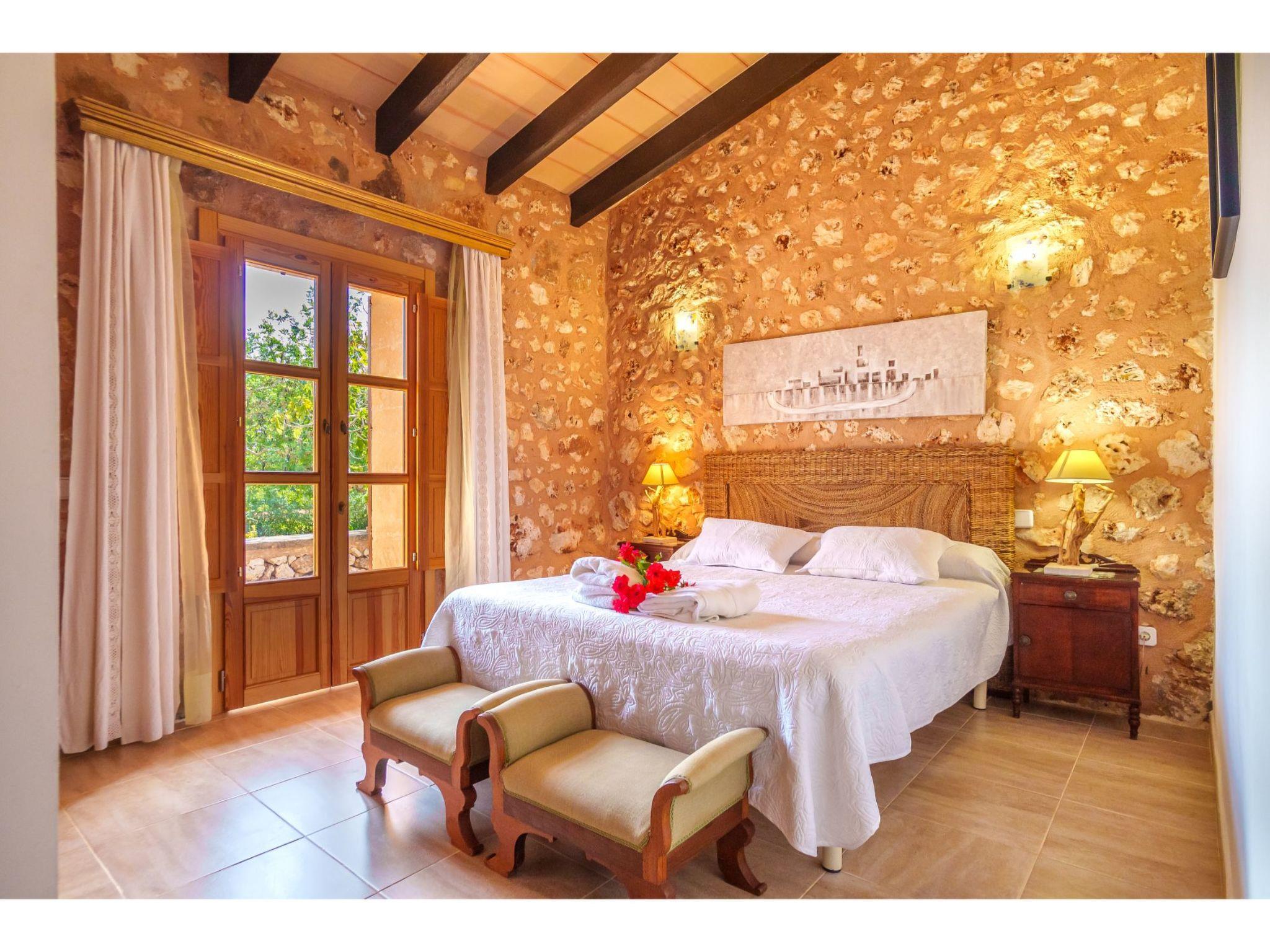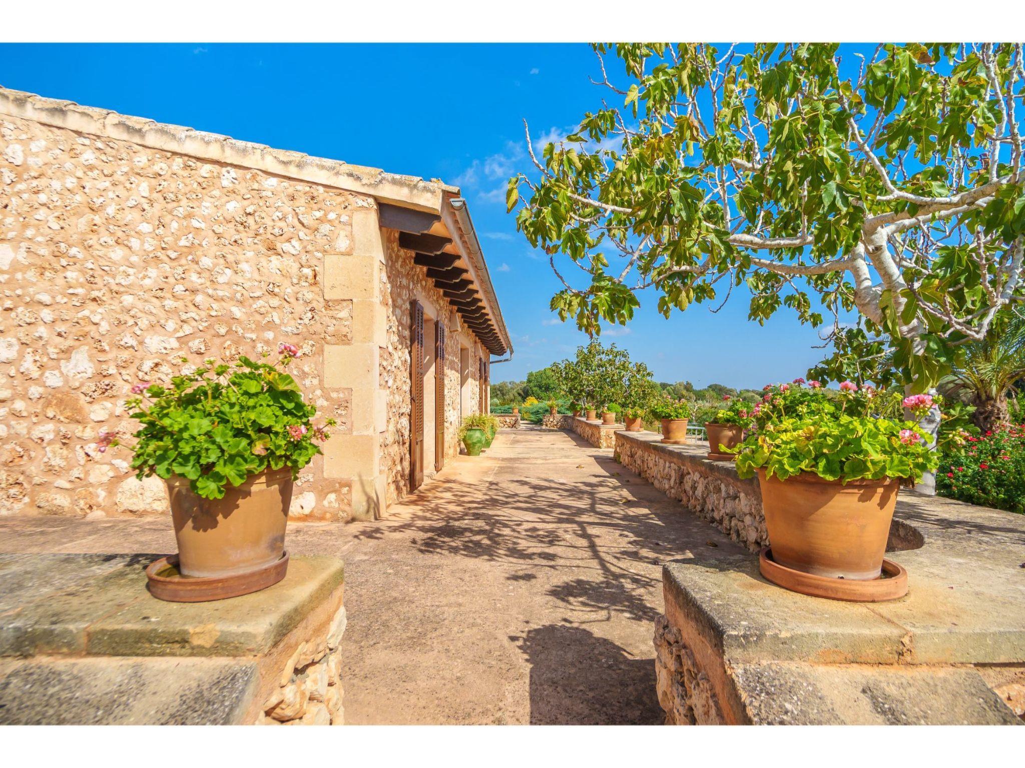 Porreres: Cosy, rustic farm estate "Los Geranios", surrounded by trees, meadows and fields. Outside the resort, 6 km from the centre of Porreres, in a quiet position, traffic calmed area, in a cul-de-sac. Private: natural state property, beautiful, well-kept garden, orchard, lawn for sunbathing, swimming pool kidney shaped (6 x 3 m, depth 60 - 150 cm, seasonal availability: 01.Mar. - 31.Oct.). Outdoor shower, arbour, pergola, terrace, garden furniture, barbecue. In the house: internet access, WiFi, air conditioning, washing machine. Parking on the premises. Bus stop "Porreras" 7 km. Please note: car recommended. Suitable for families, suitable for seniors baby equipment on request (included). Object suitable for 6 adults. The owner does not accept any youth groups. Loading and unloading of baggage is possible at the holiday house. Airfield 40 km from the property.