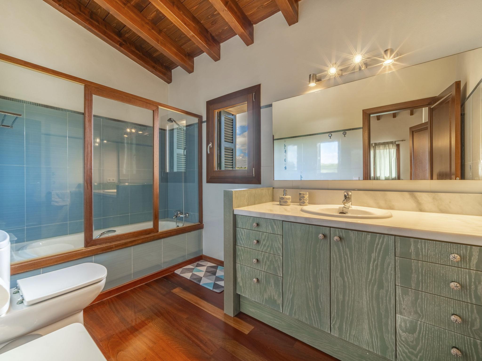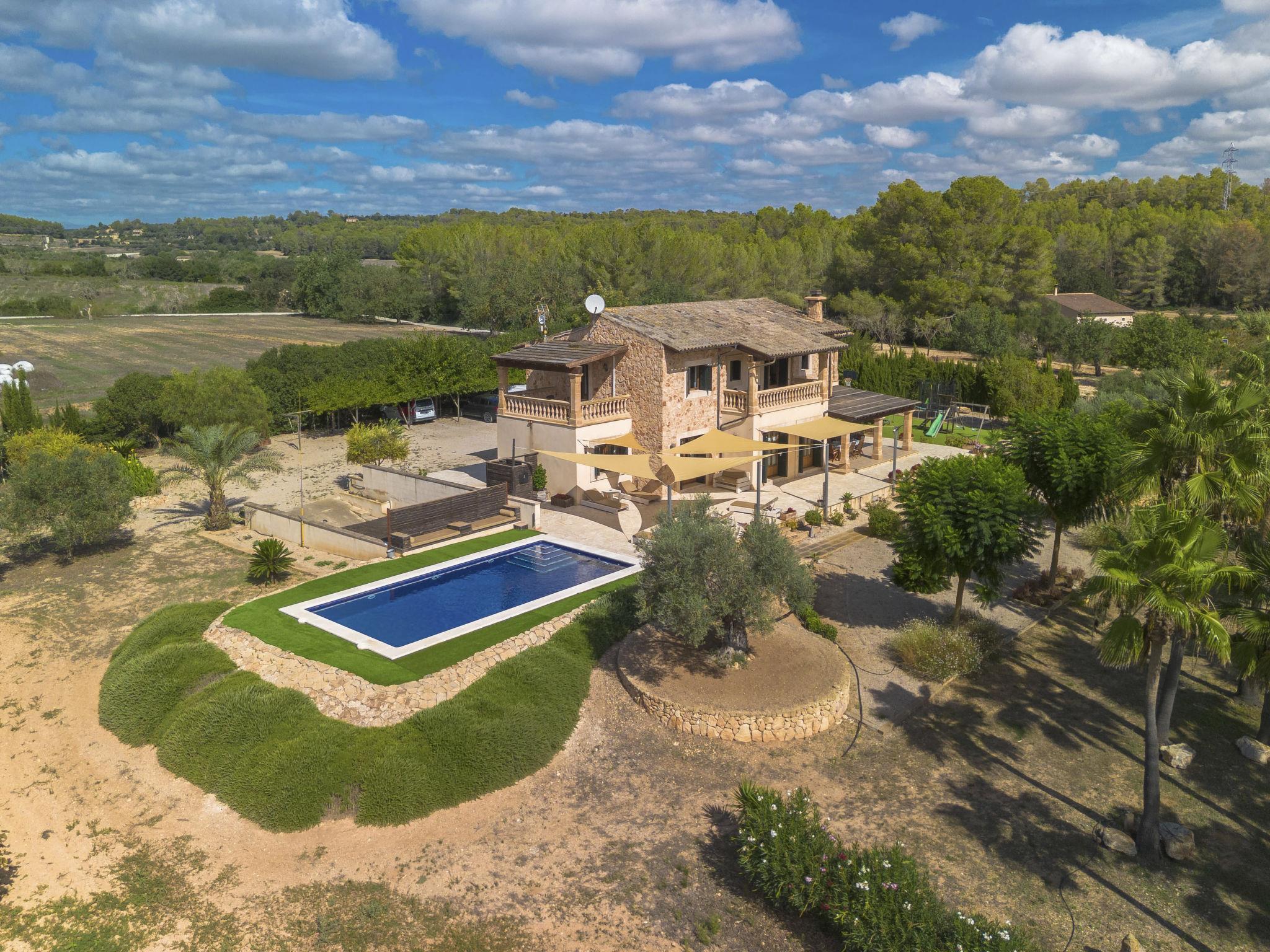 "Son Mainou", 5-room villa 270 m2 on 2 levels. Object suitable for 4 adults + 2 children. Spacious and bright, very comfortable and modern furnishings: living/dining room with open-hearth fireplace (only for decoration), satellite TV, air conditioning and forced-air heating. Exit to the patio, to the swimming pool. 1 double bedroom with 1 french bed (1 x 150 cm, length 200 cm), bath/shower/WC, satellite TV, air conditioning and forced-air heating. Exit to the garden. Large, open kitchen (oven, dishwasher, 4 ceramic glass hob hotplates, toaster, kettle, microwave, electric coffee machine) with dining table, hatch, air conditioning and forced-air heating. Exit to the patio. Shower/WC, bath or shower/WC. Upper floor: 1 double bedroom with 1 french bed (1 x 150 cm, length 200 cm), air conditioning and forced-air heating. 1 large double bedroom with 1 french bed (1 x 150 cm, length 200 cm). Exit to the balcony. 1 double bedroom with 1 french bed (1 x 150 cm, length 200 cm), shower/WC, air conditioning and forced-air heating. Exit to the balcony. Bath/WC. Natural stone floors. Patio. Terrace furniture, barbecue, deck chairs, covered balcony, sitting area. Very beautiful view of the countryside. Facilities: washing machine, dryer, iron, children's high chair, baby cot for up to 2 year olds, hair dryer. Internet (WiFi, free). Parking at the house. Please note: suitable for families. Non-smoking house. ETV/4859