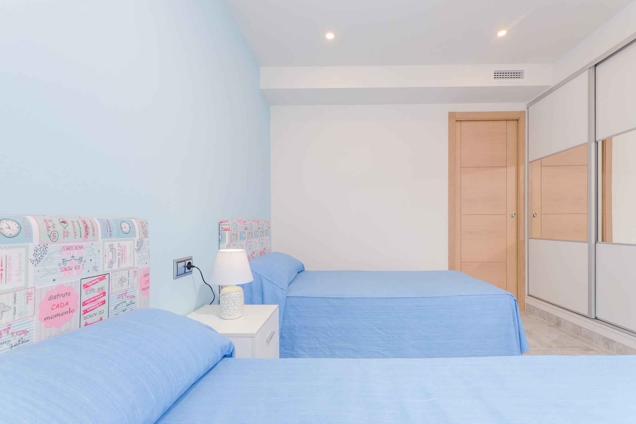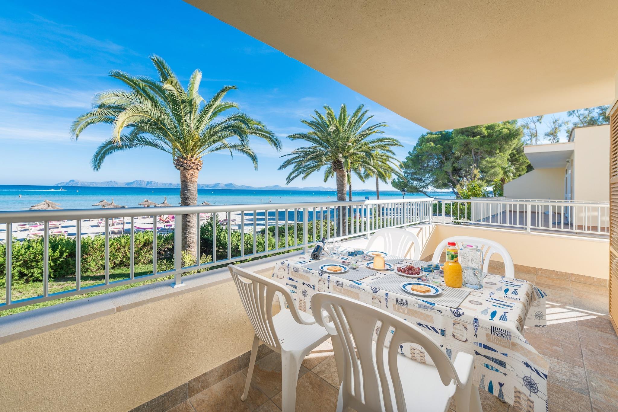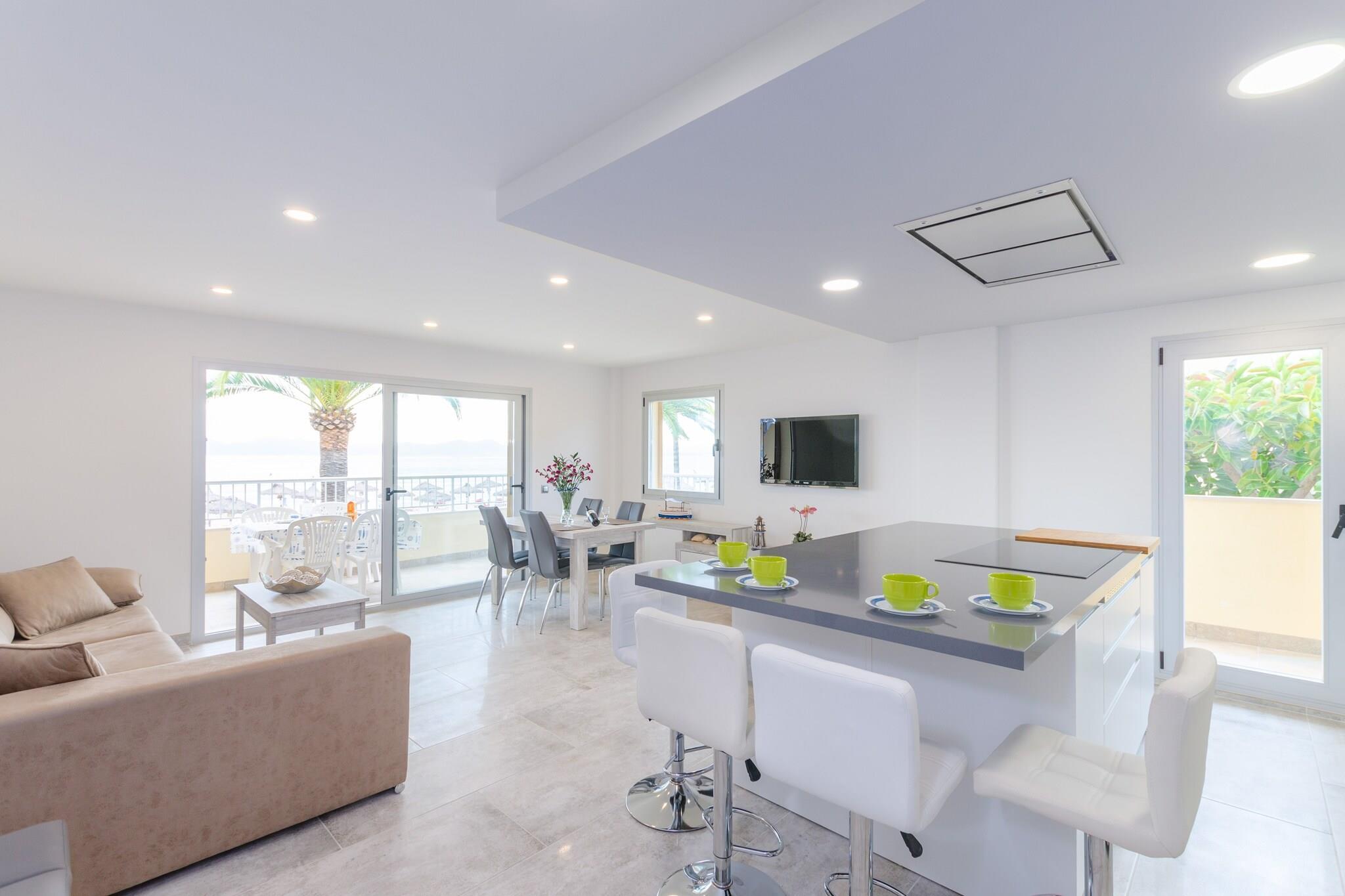 Seaside komfort og udsigt Vågn op til en flot udsigt over Middelhavet og Tramuntana-bjergene fra den private terrasse i denne rummelige lejlighed i Puerto de Alcúdia. Kun få skridt fra den fælles græsplæne kan du gå direkte ud på Alcúdia-strandens gyldne sand, hvor havet indbyder til en forfriskende svømmetur. Lejligheden blander komfort og stil og byder på et opholds-, spise- og køkkenområde i åbent plan med moderne apparater, en satellit-tv-stue og rigelig plads til familie eller venner. Livlig beliggenhed ved stranden Dette hjem placerer dig lige i det pulserende hjerte af Puerto de Alcúdia. Barer, caféer, isbarer, supermarkeder og butikker ligger langs gaderne lige uden for din dør. En kort gåtur tager dig til livlige pubber for aftenunderholdning, mens nærliggende transportforbindelser gør det nemt at udforske øen. Familier vil elske det rolige, lave vand i Alcúdia-bugten, mens golfspillere kan nyde en runde på Golf d'Alcanada, kun 10 km væk. Smag af Mallorca Madelskere vil sætte pris på blandingen af ??lokal og international spisning inden for få minutter fra lejligheden. Fra frisk fisk og skaldyr på restauranter ved vandet til tapas serveret i rustikke taverner, hvert måltid føles som en del af ferien. Prøv Ca'n Punyetes for autentiske mallorcanske retter, eller nyd god middag på Restaurante Miramar med udsigt over lystbådehavnen. For en mindeværdig dagstur, tag til Lighthouse of Formentor, hvor en betagende udsigt passer perfekt til en picnic ved havet.