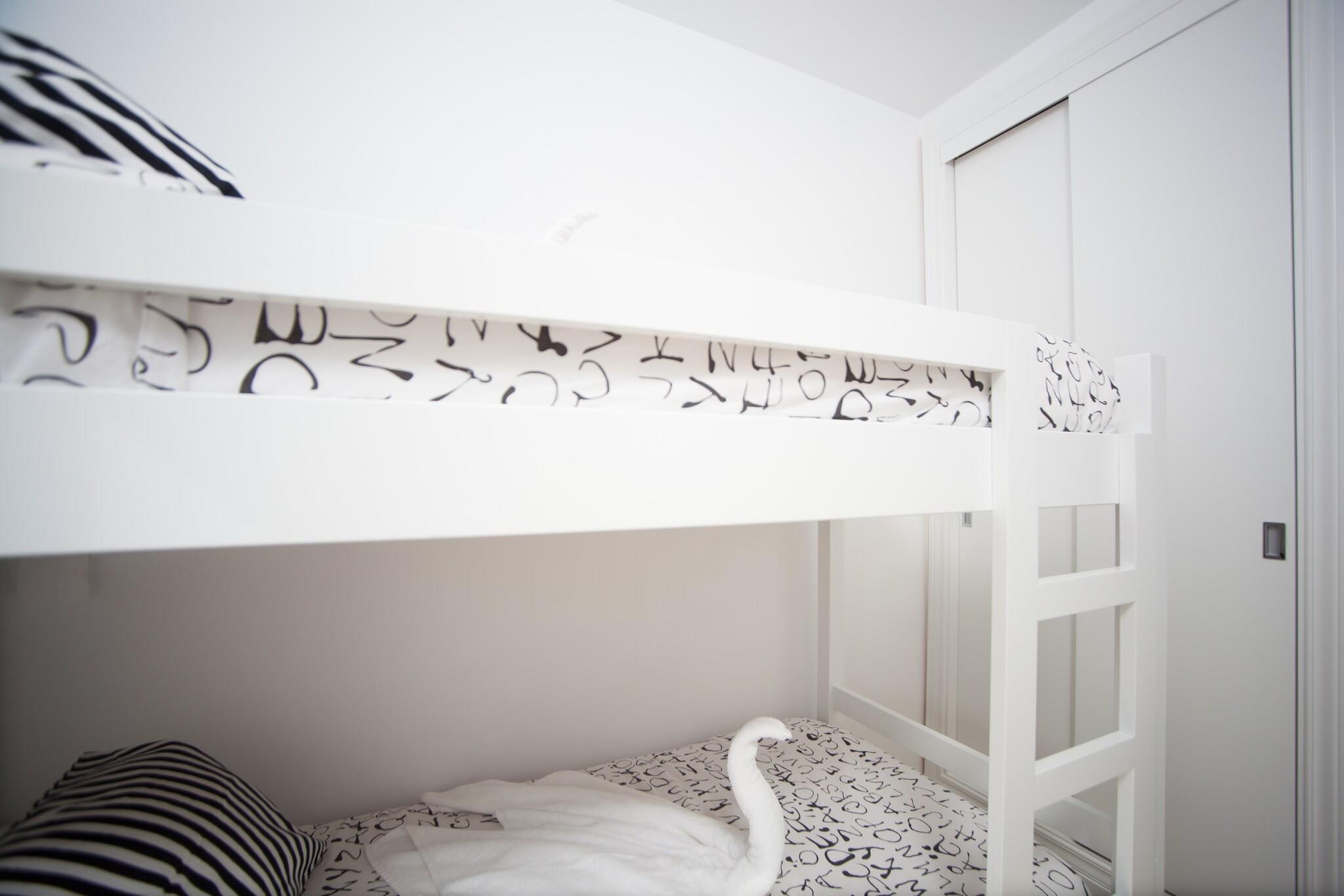 Stue, Køkken(komfur, kaffemaskine), soveværelse(2x enkeltseng), soveværelse(dobbeltseng), soveværelse(køjeseng), badeværelse, badeværelse, ovn, mikrobølgeovn, køle-fryseskab, badekar, bruser, håndvask, håndvask, toilet, toilet, balkon eller terrasse, klimaanlæg, barneseng, barnestol