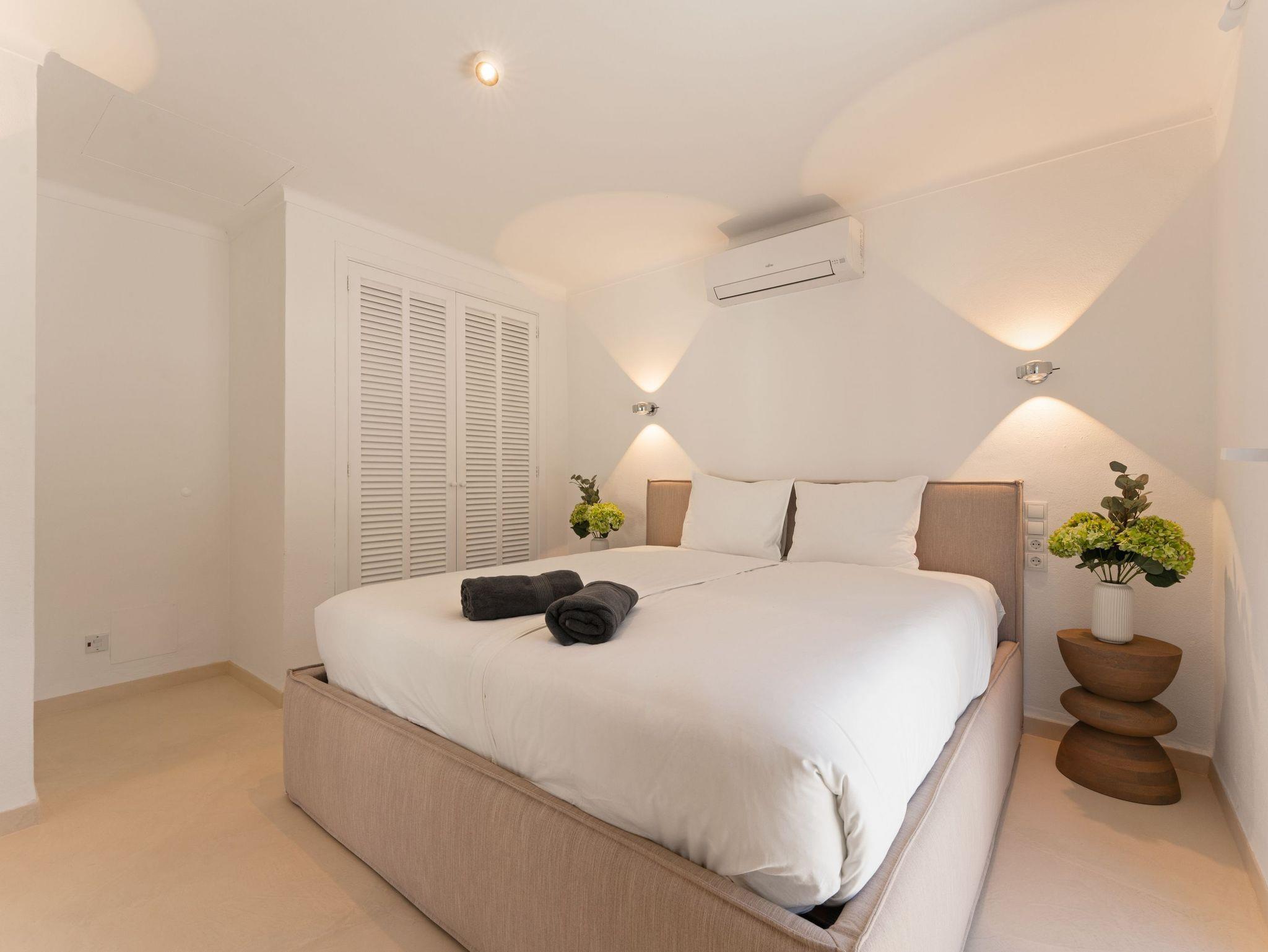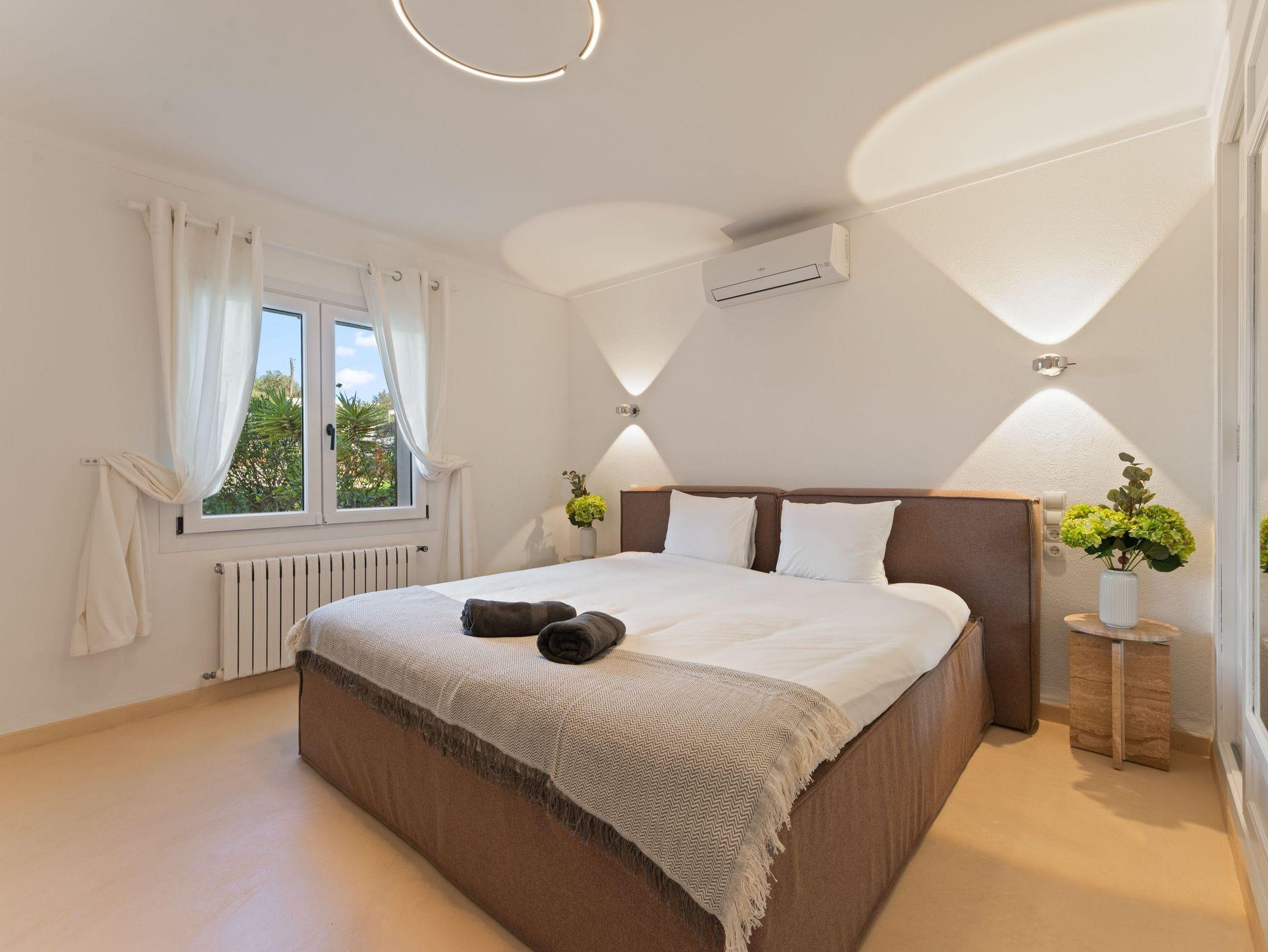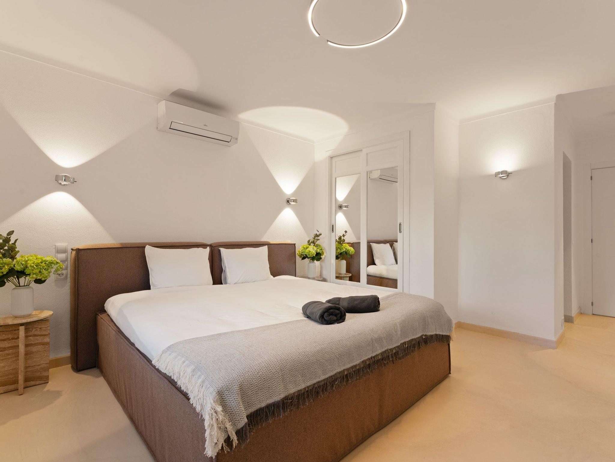 Sie bietet vier großzügige, liebevoll eingerichtete Schlafzimmer mit komfortablen Boxspring- und Polsterbetten aus natürlichen Materialien, Einbauschränken und jeweils Klimaanlage.