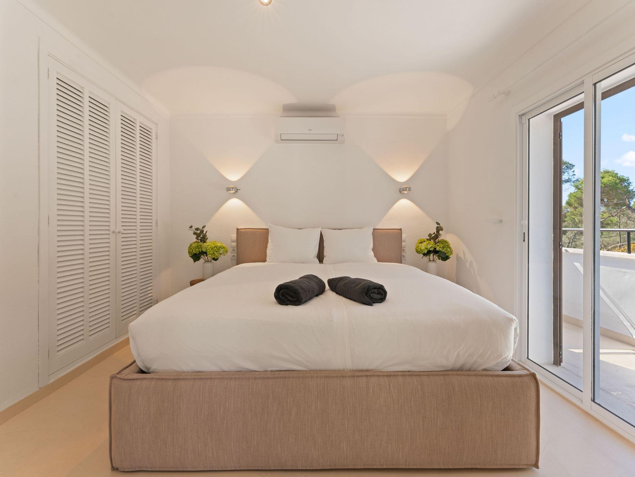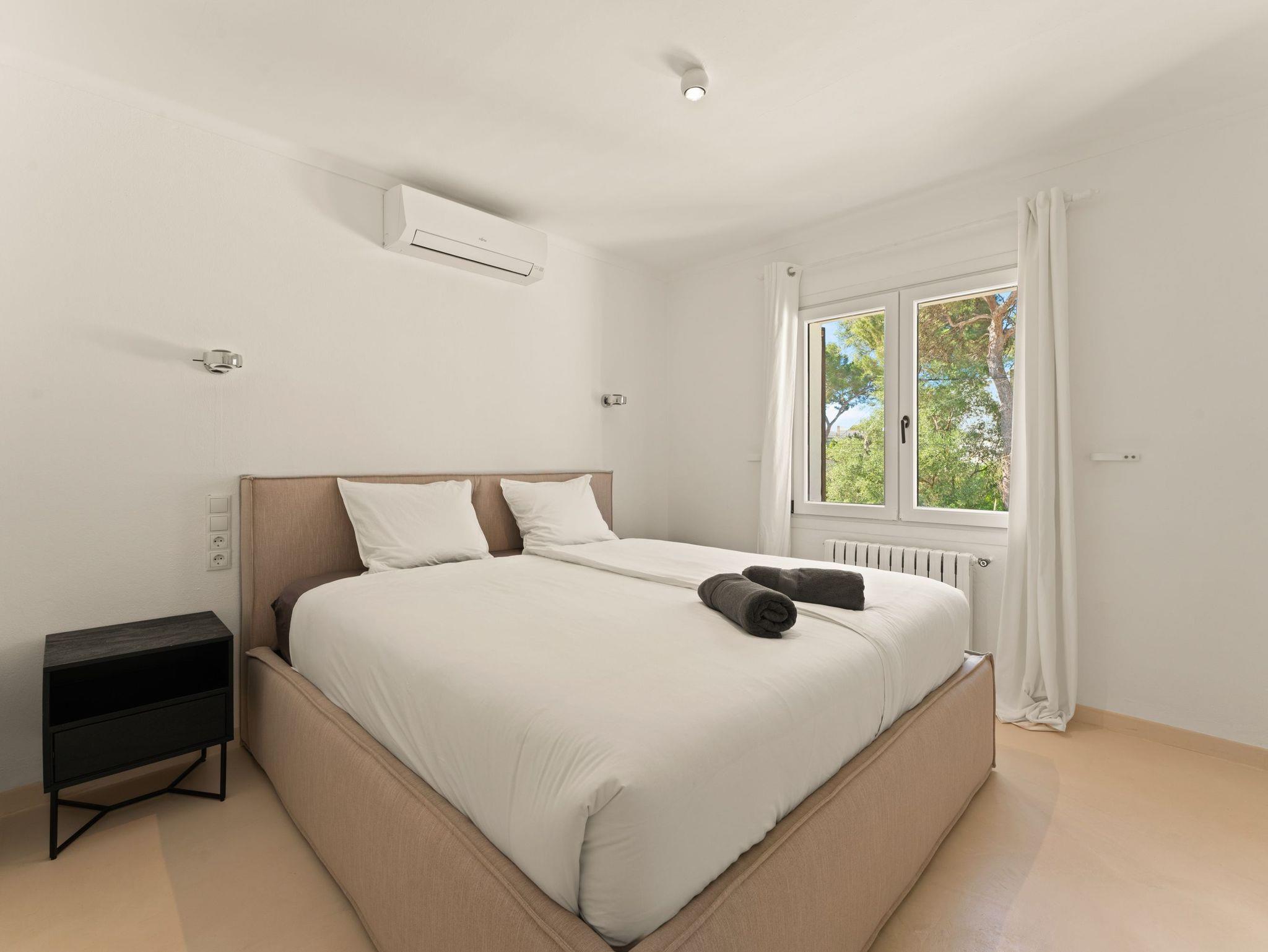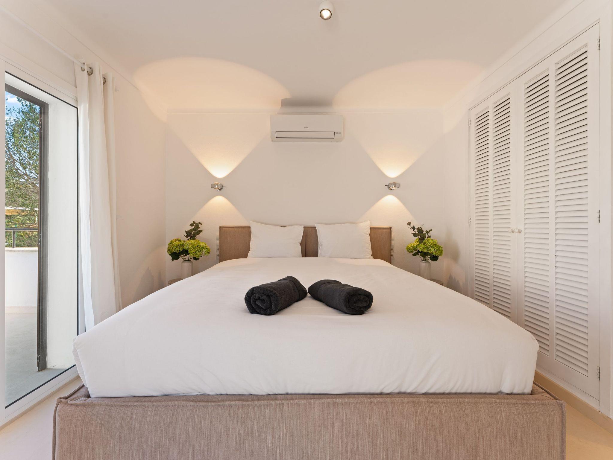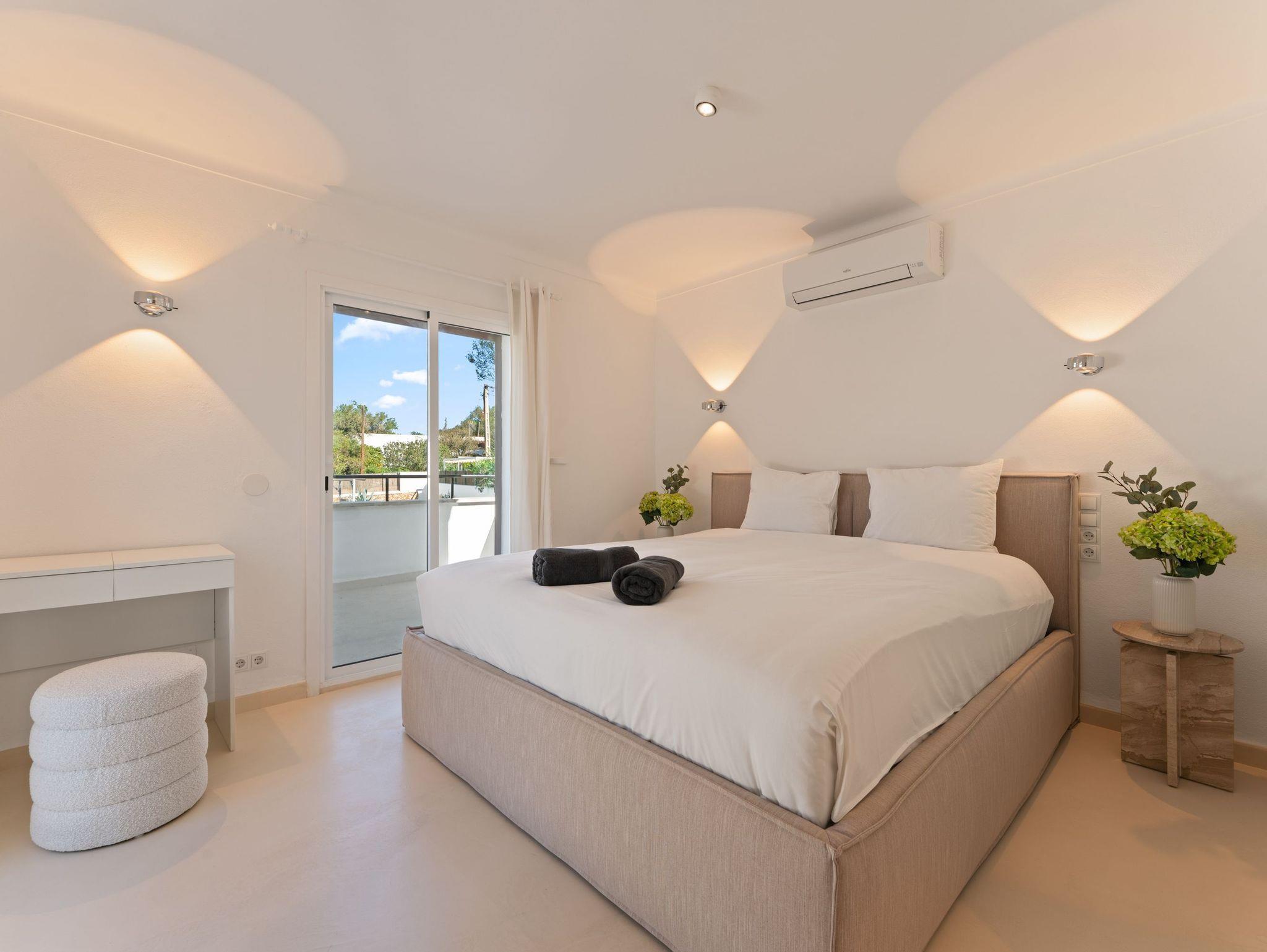 Sie bietet vier großzügige, liebevoll eingerichtete Schlafzimmer mit komfortablen Boxspring- und Polsterbetten aus natürlichen Materialien, Einbauschränken und jeweils Klimaanlage.