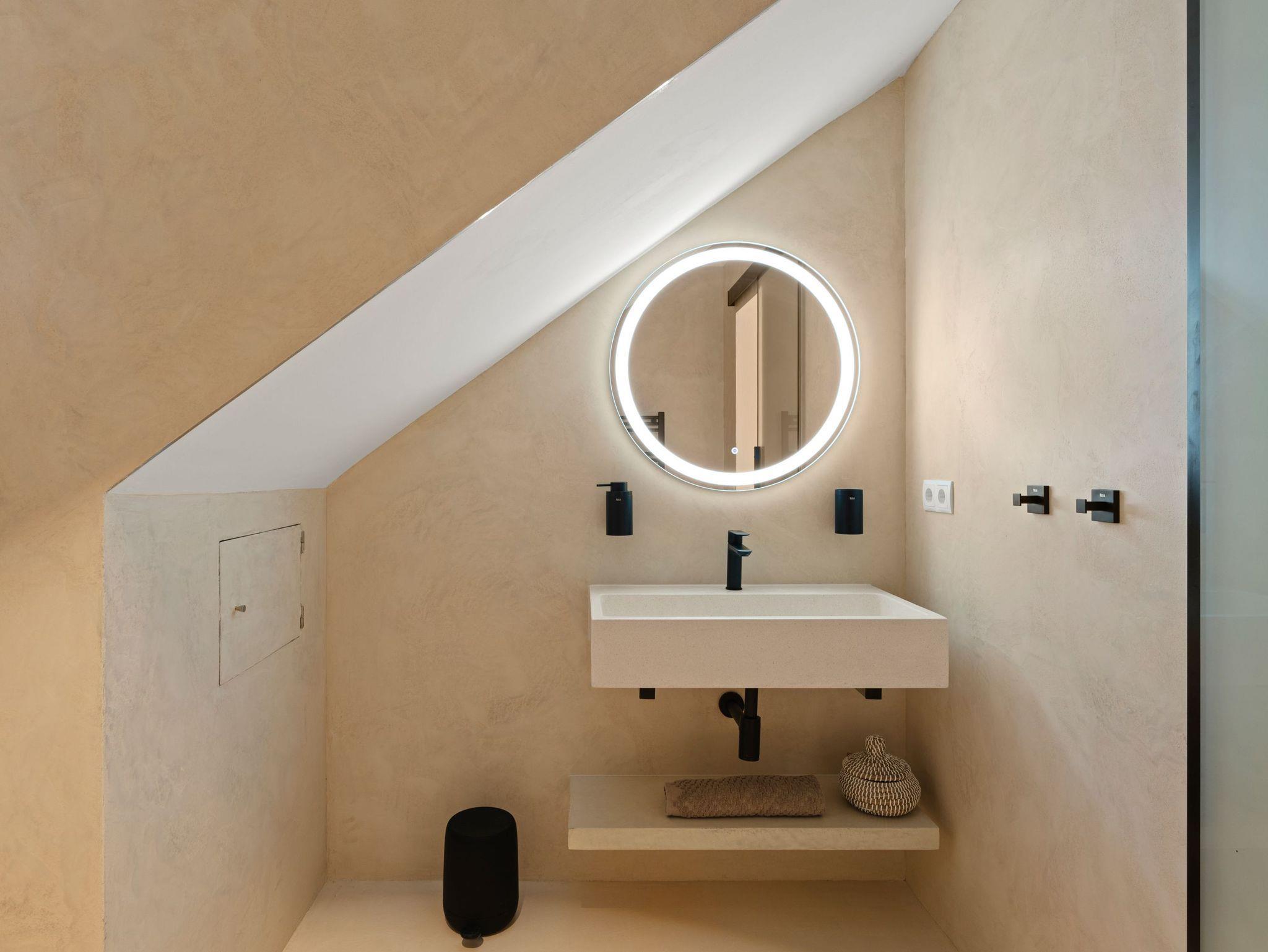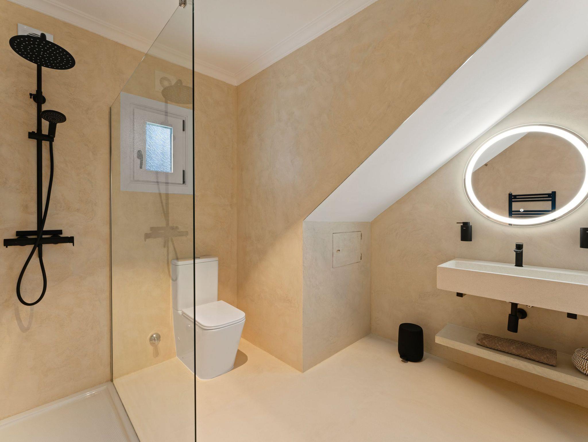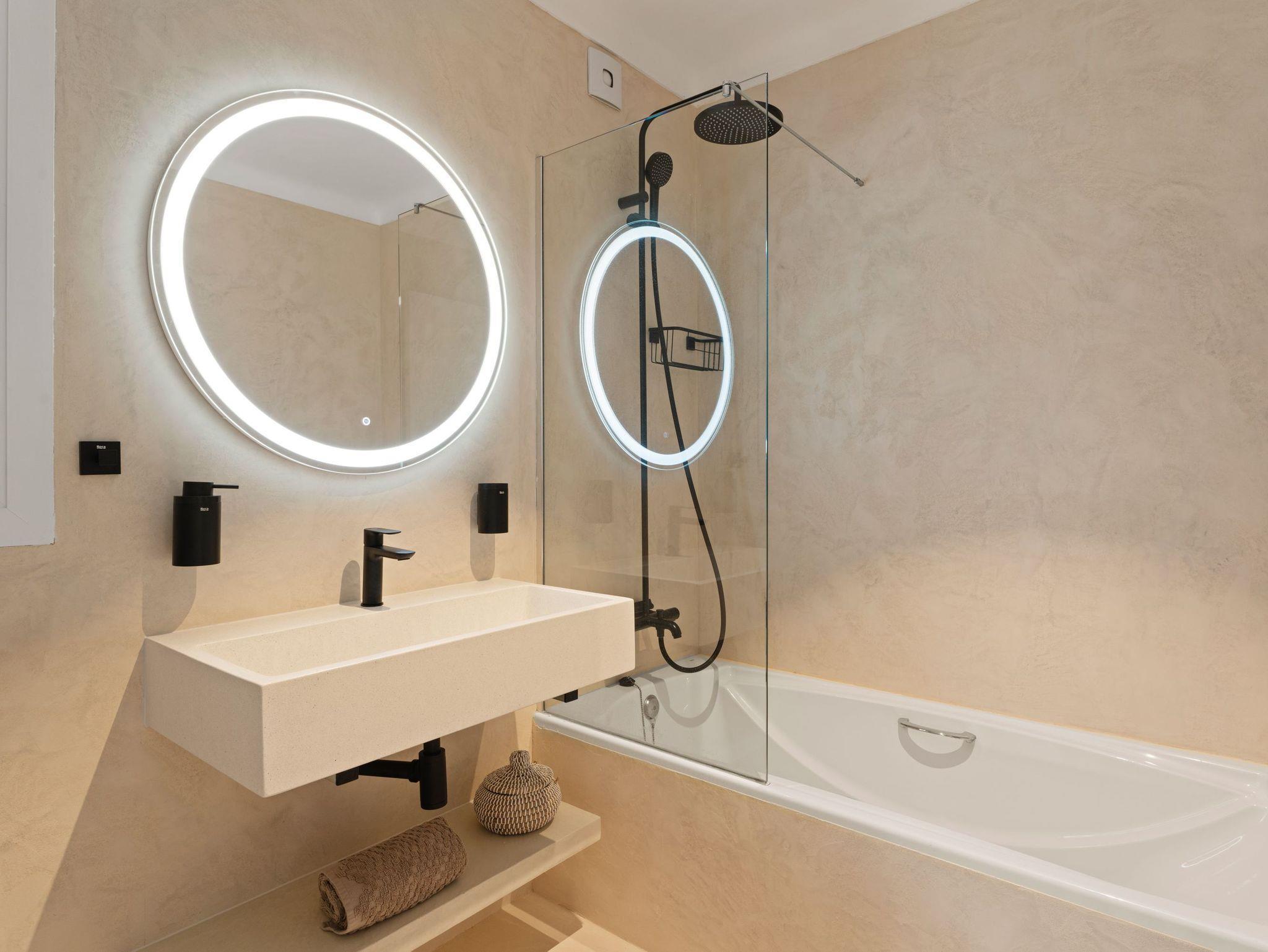 Es gibt drei voll ausgestattete Badezimmer. Eines der Badezimmer ist ein Bad en suite, das direkt an das Hauptschlafzimmer angeschlossen ist. Dieses sowie die beiden weiteren stilvollen Badezimmer sind mit hochwertigen Armaturen, LED-Spiegeln, Föhnen, Regenshower-Duschen sowie handgefertigten mallorquinischen Terrazzo-Waschtischen ausgestattet.