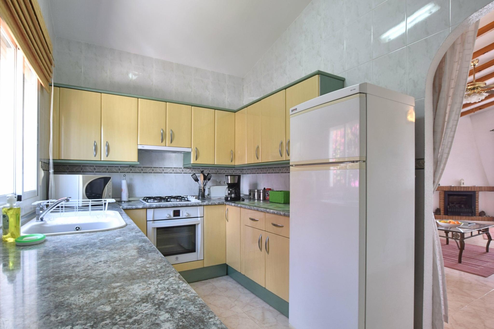 Stueetage: (Køkken(kogeplade(Komfur med fire kogeplader, gas), brødrister, komfur, kaffemaskine, ovn, mikrobølgeovn, køle-fryseskab), stue / spisestue(Fjernsyn, pejs, sofahjørne, stereoanlæg, klimaanlæg), soveværelse(dobbeltseng eller 2 enkeltsenge Senge, klimaanlæg), soveværelse(enkeltseng, køjeseng, klimaanlæg), badeværelse(bruser, håndvask, toilet)) solarium, vaskemaskine, terrasse(overdækket), terrasse, have(indhegnet), havemøbler, solstole, grill, parkering, Parasol, swimmingpool(privat), strygebræt