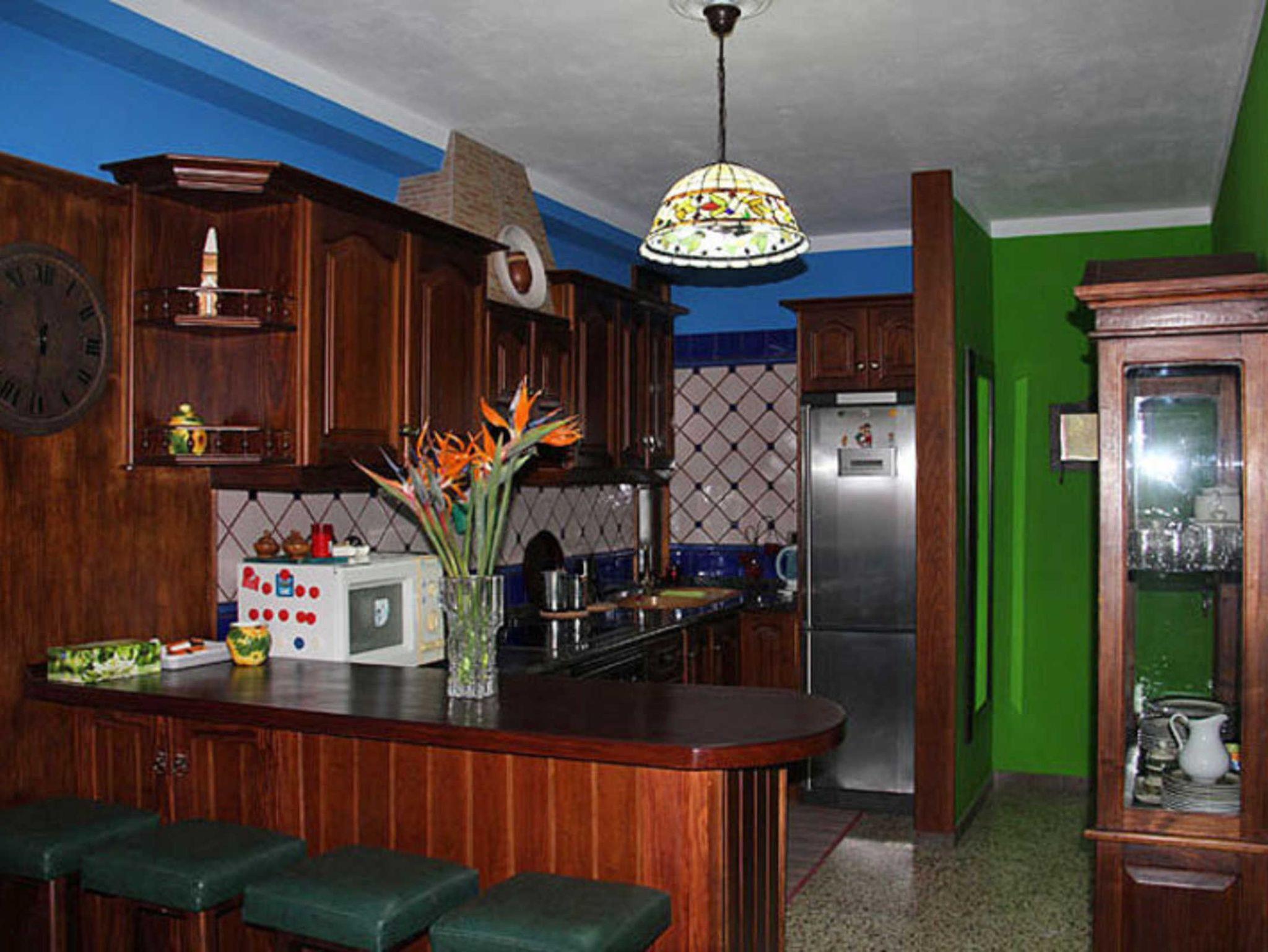 Die Küche ist etwas abgetrennt vom Wohnzimmer und gut ausgestattet. In den Schränken und einer schönen Vitrine findet das Geschirr seinen Platz.