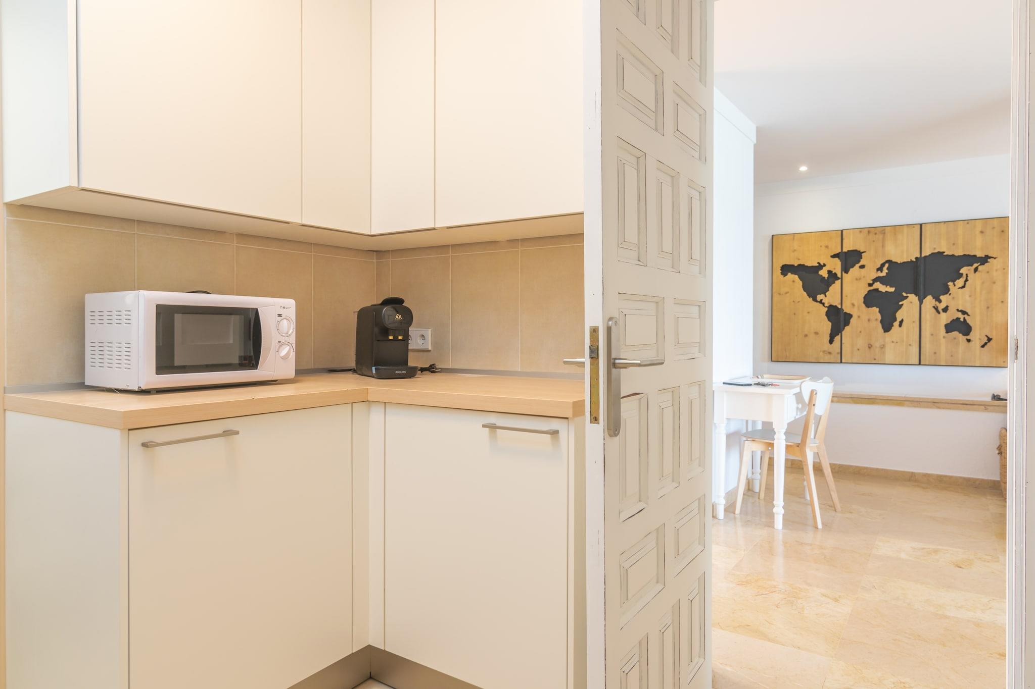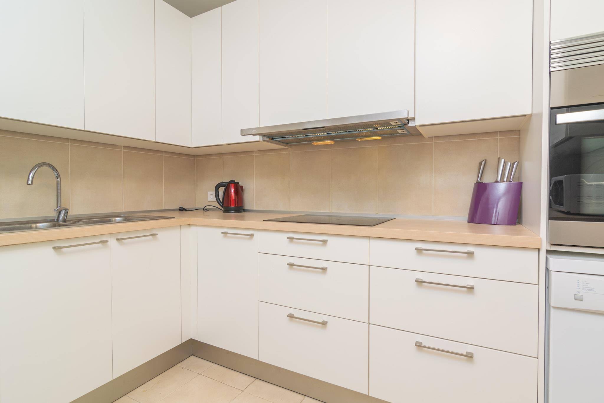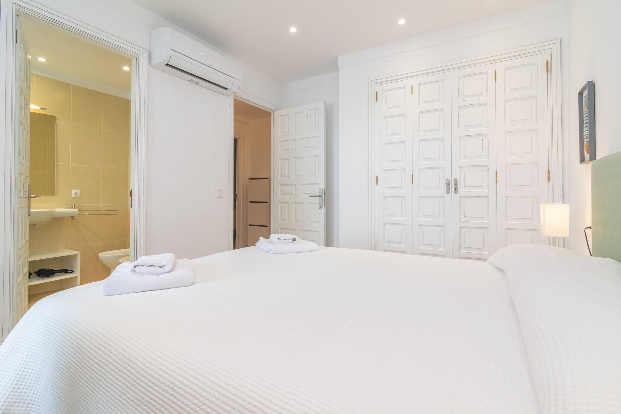 Start din dag med morgenmad på terrassen, hvor du kan nyde den fredfyldte udsigt over Middelhavet og bjergene. Uderummet er perfekt til at solbade eller nyde måltider og drinks med sine kære. Lejligheden ligger i en bygning og har direkte naboer, men tilbyder en fredelig atmosfære. Indenfor er to-etagers lejlighed smagfuldt indrettet til komfort og afslapning. Det overordnede niveau har en lys stue-spisestue med AC og Smart TV, et selvstændigt køkken med keramisk kogeplade og et gæstetoilet. Der er også vaskemaskine, strygejern og strygebræt. Ovenpå, tre soveværelser med aircondition inkluderer et med to enkeltsenge, et med en enkeltseng og et med en dobbeltseng og en-suite bruser. Et separat badeværelse med badekar tjener gulvet. Centralvarme sikrer komfort året rundt, og babyudstyr såsom en tremmeseng og højstol er tilgængelige. Kun 200 meter fra Playa Pollença er lejligheden ideelt placeret for strandelskere og opdagelsesrejsende. Nyd den charmerende promenade, lokale butikker og restauranter, eller begiv dig til nærliggende perler som Formentor, Cala Sant Vicenç og landsbyerne Pollença og Alcúdia. Kæledyr og arrangementer er ikke tilladt. Udvendig parkering til en bil er tilgængelig. Turistskat og eventuelle gebyrer kan være gældende.