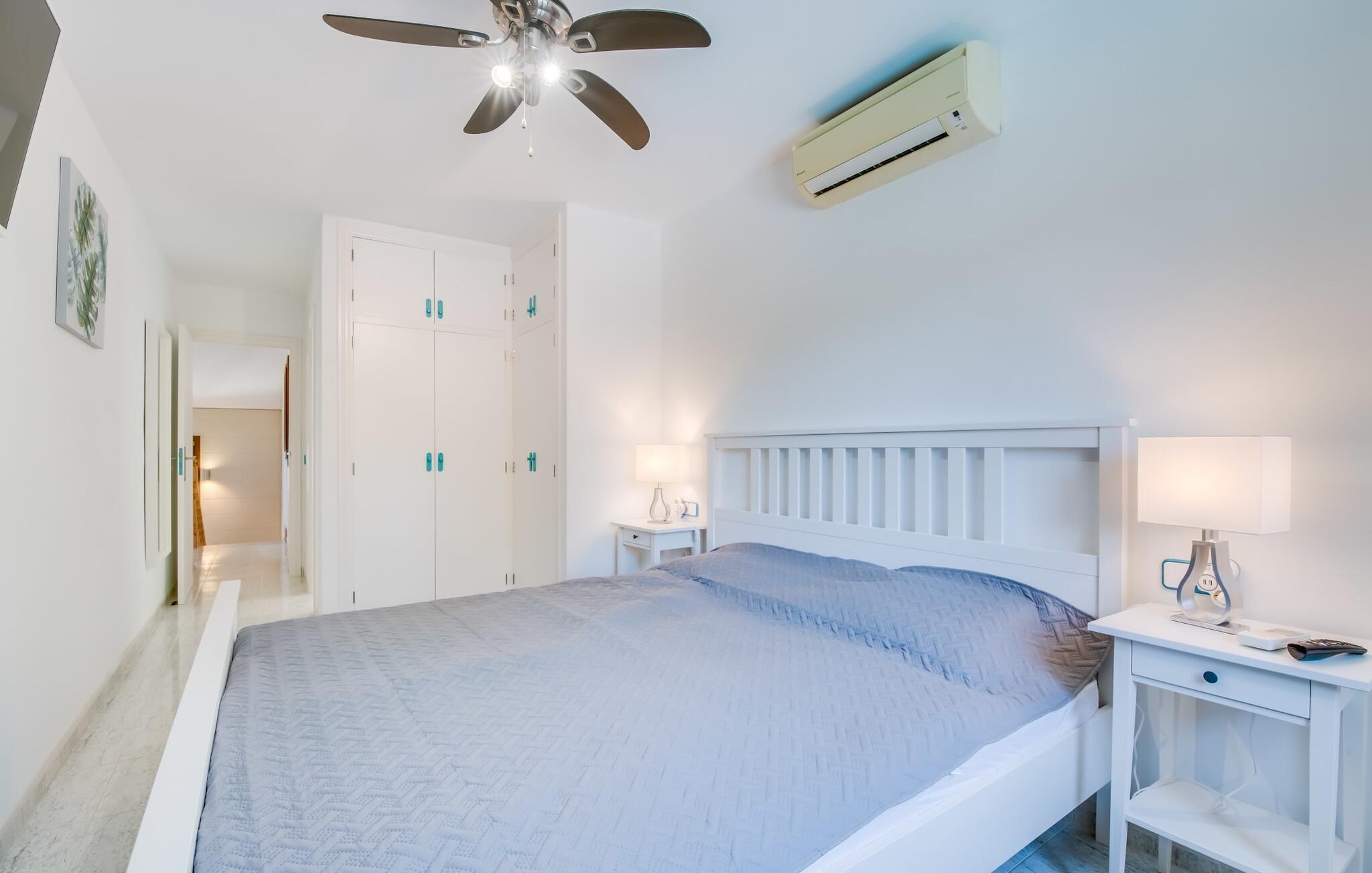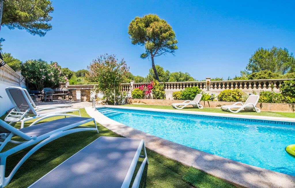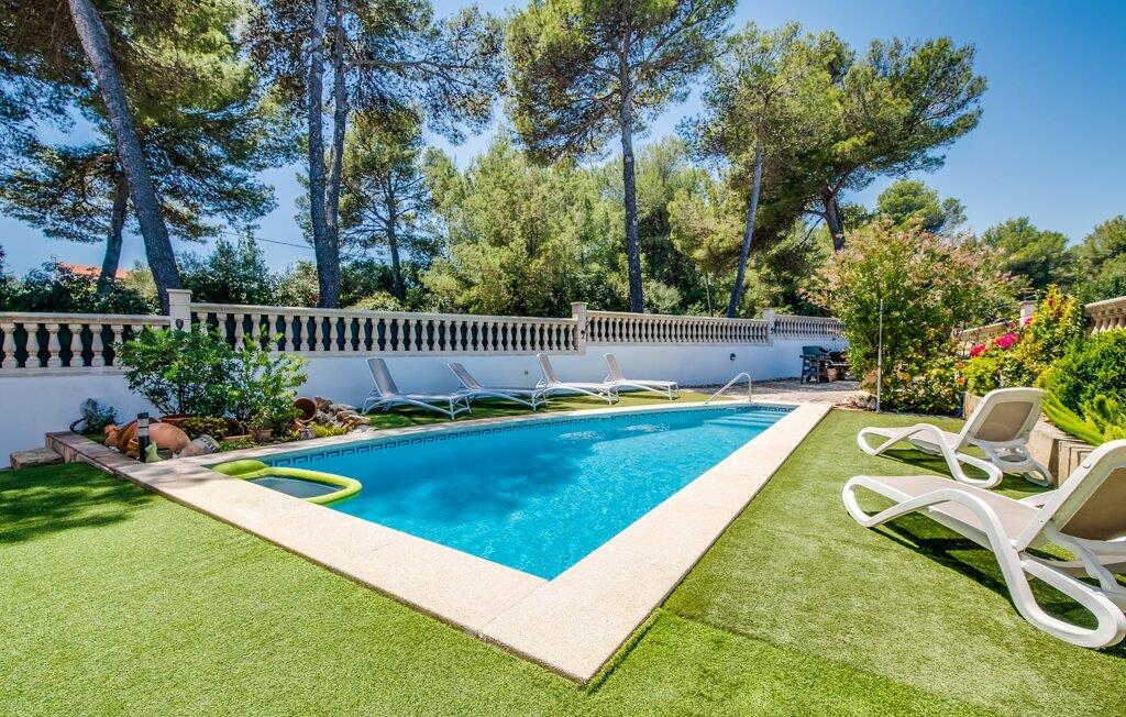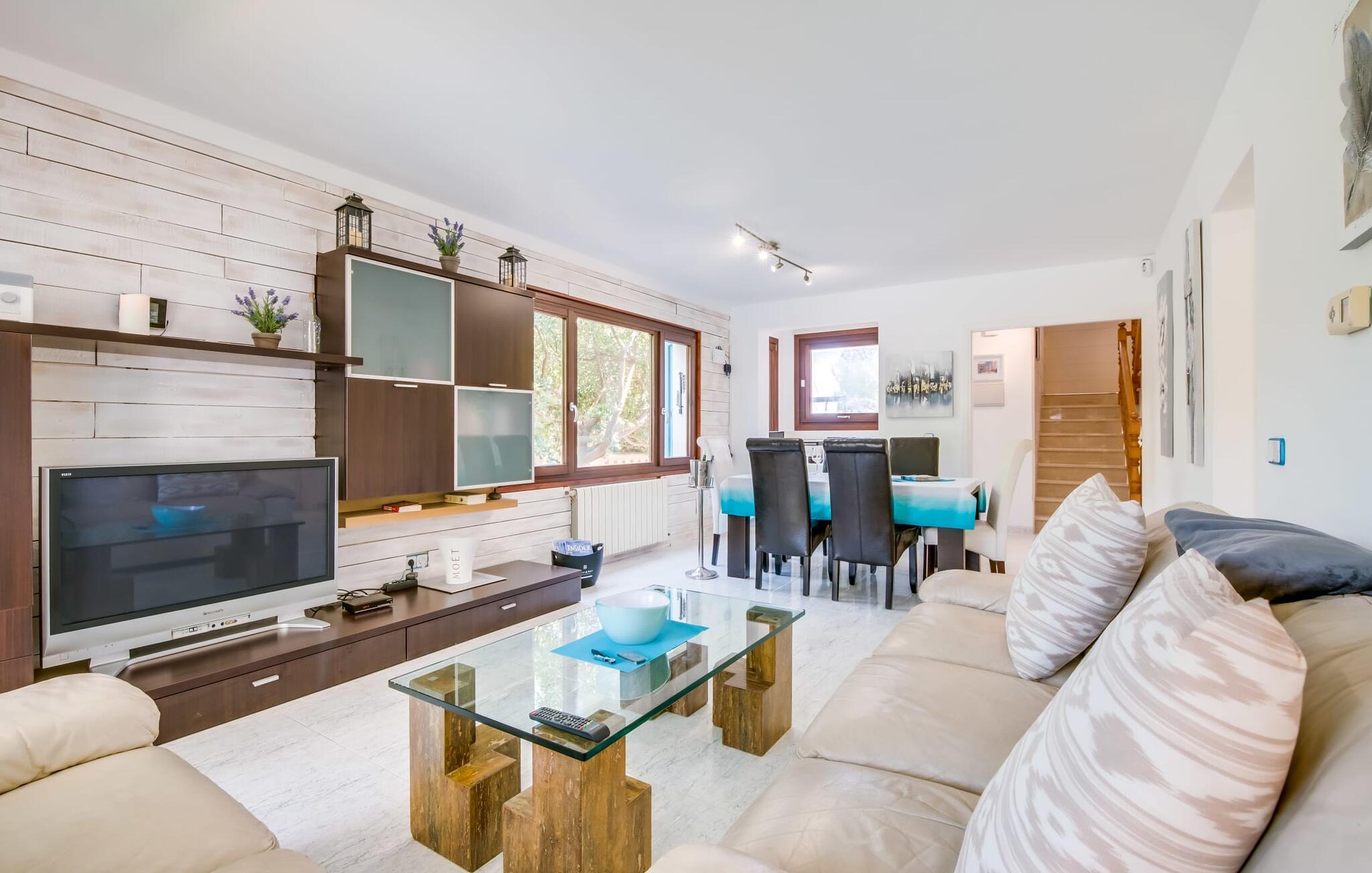 Placeringen er fantastisk: så tæt på havet, at I endda kan se det fra balkonen; En gåtur til vandet tager kun et par minutter. Villaen "Punta Blava", bygget i et typisk enfamilies boligområde, er indrettet i hvidt og har skodder, der skinner i samme turkisblå som poolen i haven. Huset på Mallorcas østkyst har en hyggelig maritim atmosfære og byder på masser af komfort, især for familier med børn. Højdepunkter: swimmingpoolen med kunstgræs og liggestole omkring, den overdækkede terrasse og grillpladsen med en paellapande. Der er en gynge i forhaven til de mindste. Indretningen er moderne, med masser af hvidt, kombineret med forskellige naturtoner og mørkt træ, som umiddelbart får jer til at føle jer godt tilpas. I stueplan er der åben opholds- og spiseafdeling samt veludstyret køkken med direkte adgang til udearealet. Også i stueetagen er der et soveværelse og et moderne badeværelse. En trappe fører til første sal med to soveværelser, hver med eget badeværelse. Ved havet: Dette er ikke noget problem selv med små børn, hvis I tilbringer jeres ferie i villaen "Punta Blava". Kun omkring 100 m adskiller jer fra kysten. Det smukke hus med turkise skodder og swimmingpool ligger på en lang grund i en urbanisering på øens østkyst. Cala Ratjada ligger mindre end 4 km derfra i bil. De nærmeste strande som Font de Sa Cala og Platja de Son Moll ligger henholdsvis kun 1,4 km og 2 km væk. En lille bugt med adgang til havet og en lille strand ligger lige udenfor jeres dør.