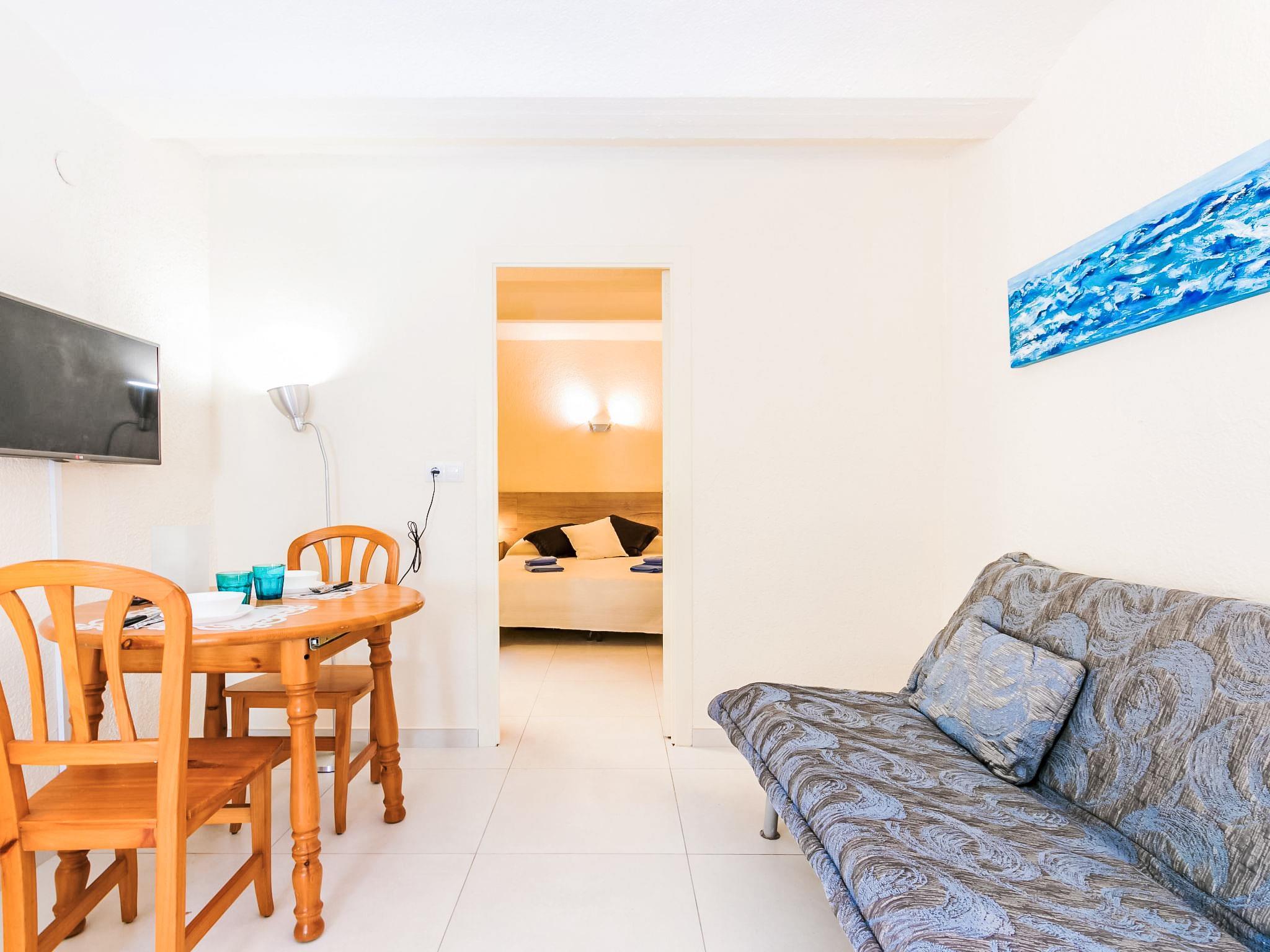 2-room apartment 30 m2. Very simple furnishings: small living/dining room with TV. 1 small room with 2 beds (90 cm, length 190 cm). Open kitchen (2 ceramic glass hob hotplates, microwave, freezer, electric coffee machine). Shower/WC. No heating option. Terrace furniture. Facilities: washing machine. Internet (WiFi, free). Please note: non-smokers only, no parking. TV only ES. No lift. Interior apartment.Shared terrace space without views . NO PARKING . NO heating. HUTG007511