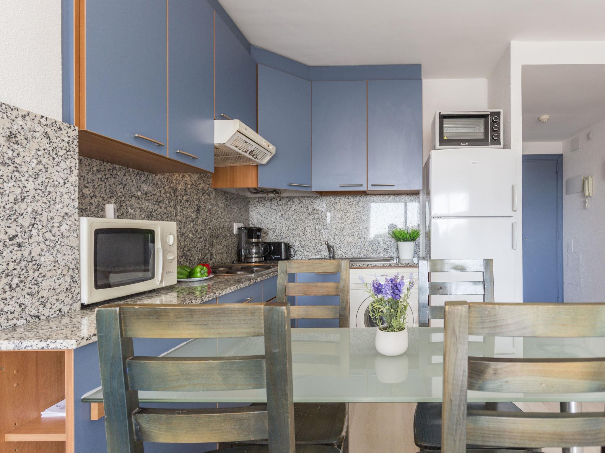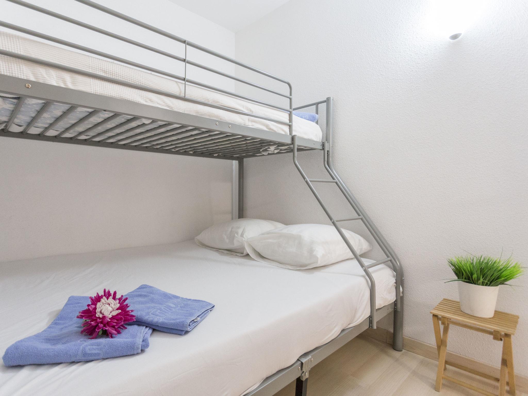 3-room apartment 45 m2, south-east facing position. Comfortable furnishings: living/dining room with 1 double sofabed (140 cm, length 190 cm), satellite TV and fan. 1 room with 1 french bed (140 cm, length 190 cm). Exit to the balcony. 1 room with 2 beds (90 cm, length 190 cm), 1 x 1 bunk beds (140 cm, length 190 cm). (4 hot plates, microwave, electric coffee machine) with dining table, air conditioning. Bath/WC. No heating option. Balcony 10 m2, south facing position and, east facing position. Balcony furniture. Distant view of the sea, the mountains and the resort. Facilities: washing machine. Please note: TV only FR. HUTG050304 // Reg. Nr.: ESFCTU000017019000347190000000000000000000HUTG0503044