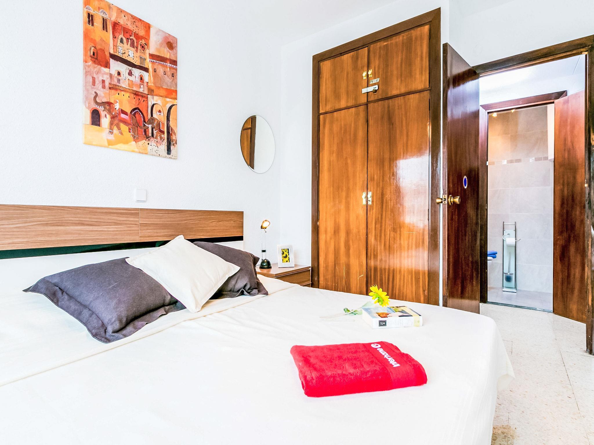 2-room apartment 42 m2 on 5th floor. Very simple and rustic furnishings: open living/sleeping room with curtain with 2 beds (90 cm, length 190 cm). Exit to the veranda. 1 room with 2 beds (90 cm, length 190 cm). Open kitchen (oven, 4 ceramic glass hob hotplates, microwave). Shower/WC. No heating option. Terrace 10 m2. Balcony furniture. Side view of the sea. Facilities: Internet (WiFi, free). Please note: fridge without freezer, non-smoking house. TV only DE, FR. Apartment without washing machine. HUTG006594 // Reg. Nr.: ESFCTU000017019000135339000000000000000000HUTG0065948
