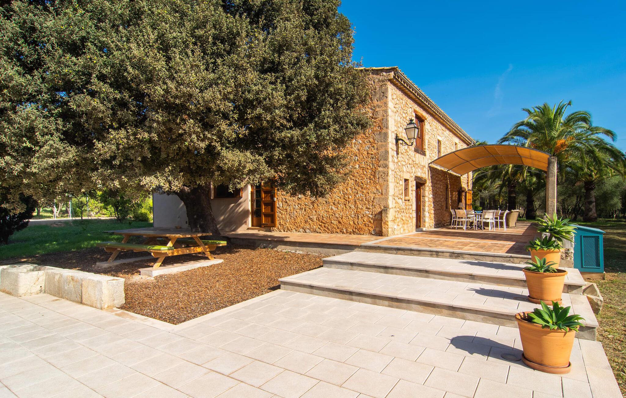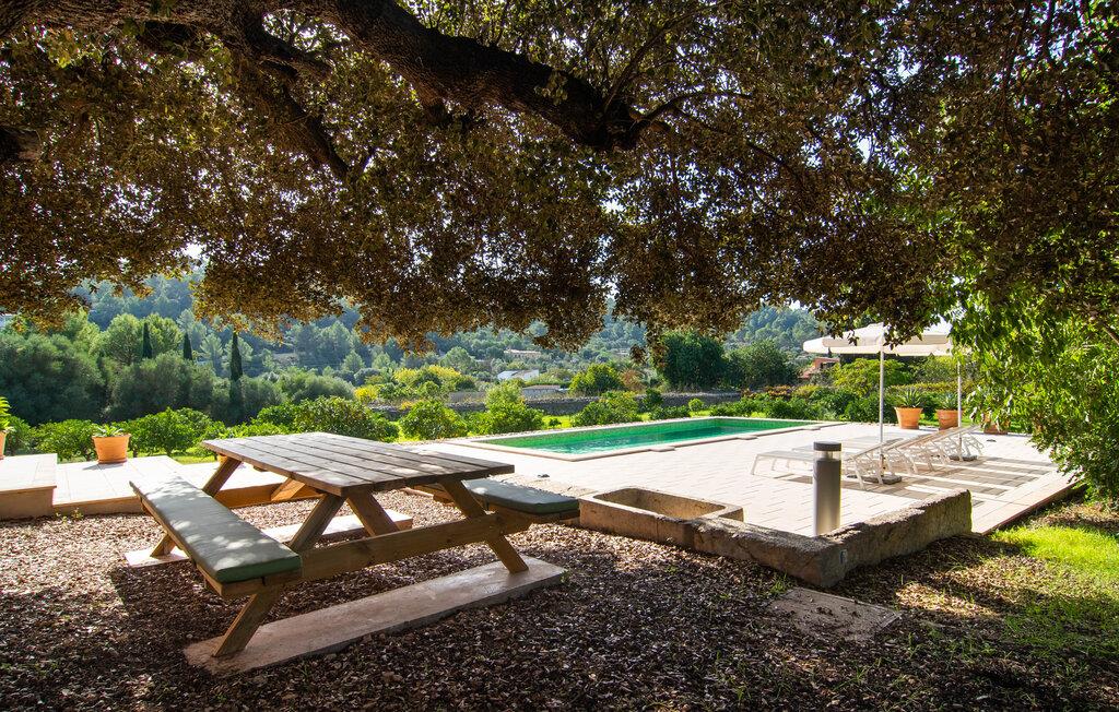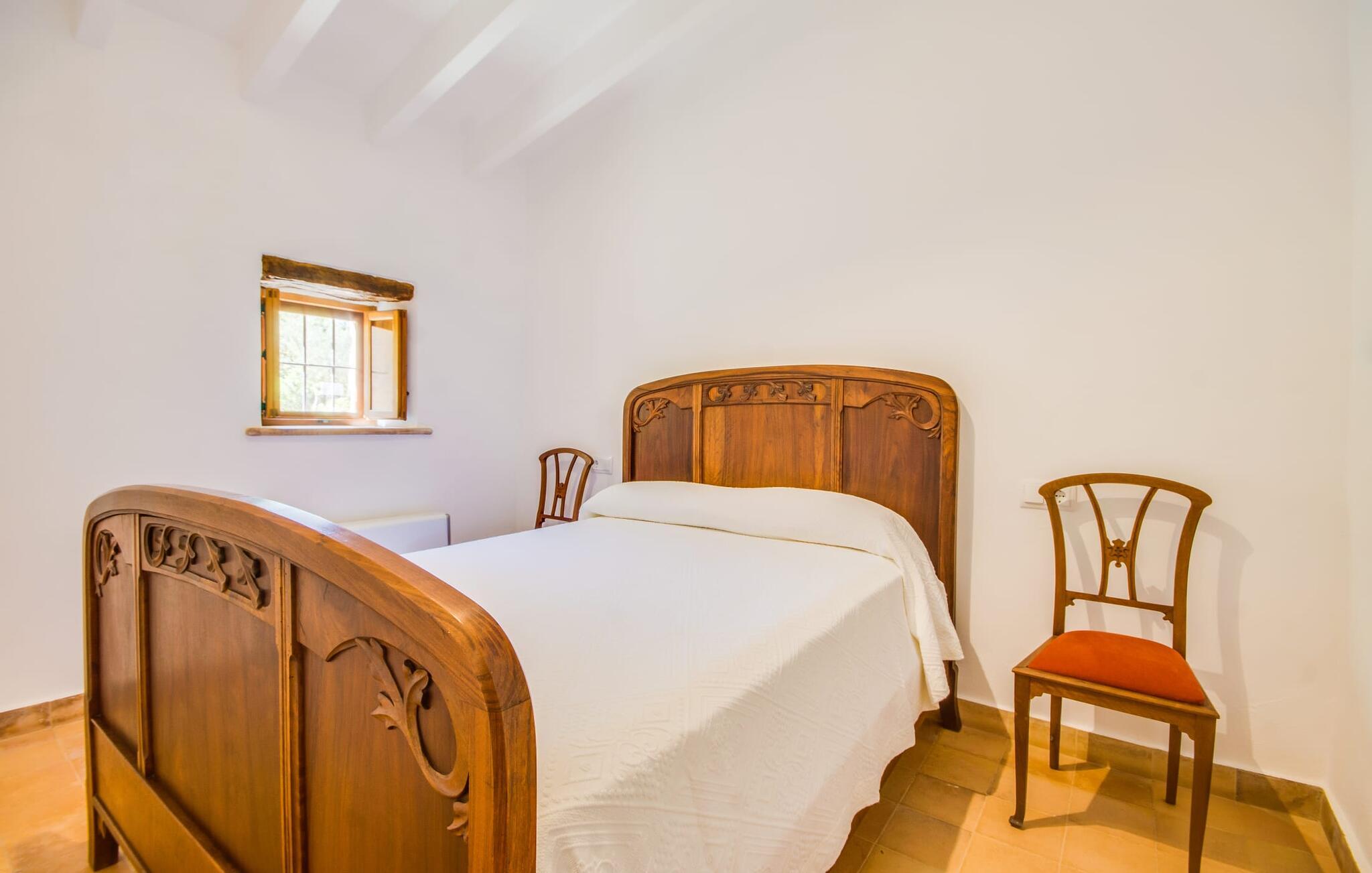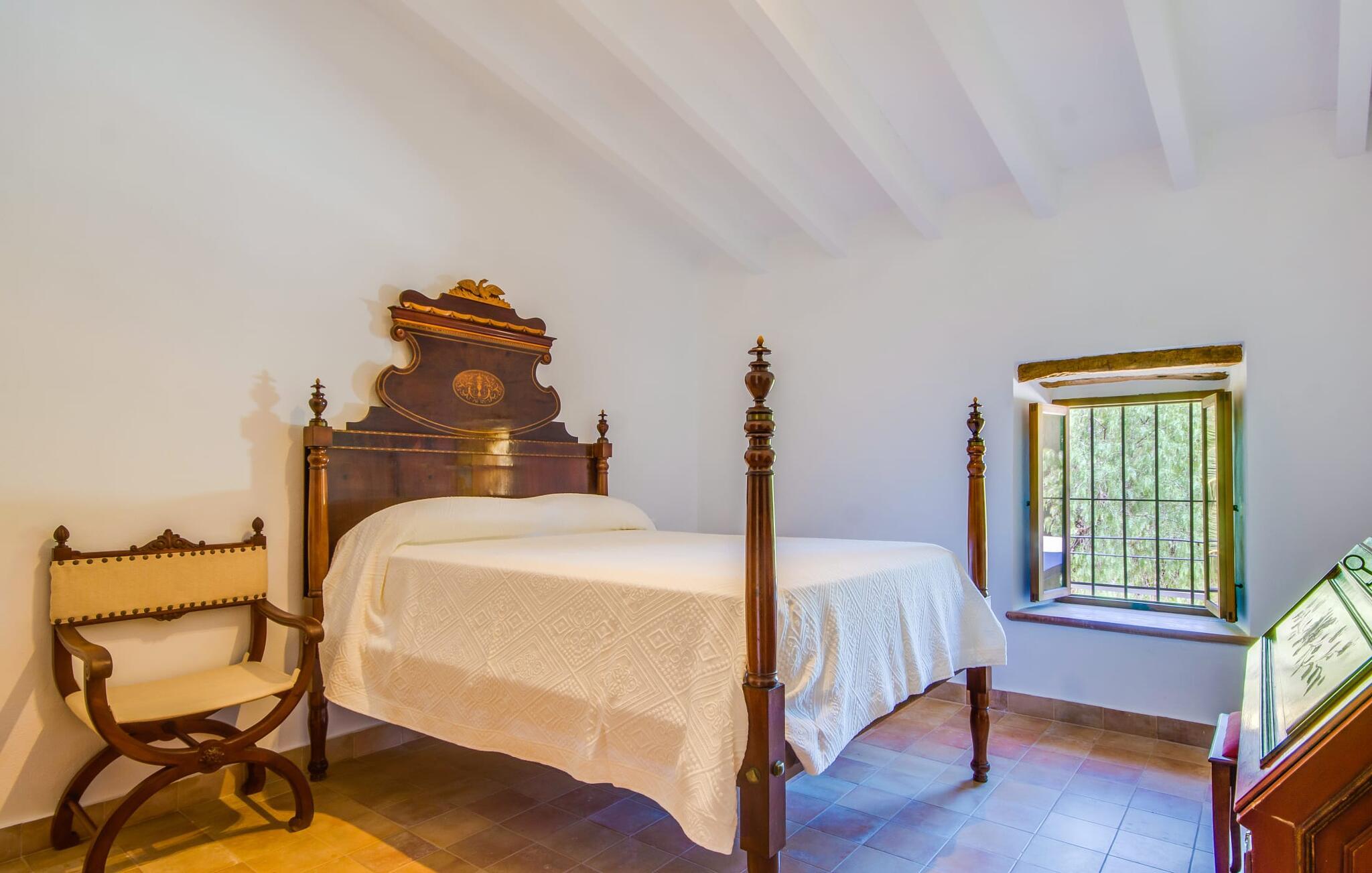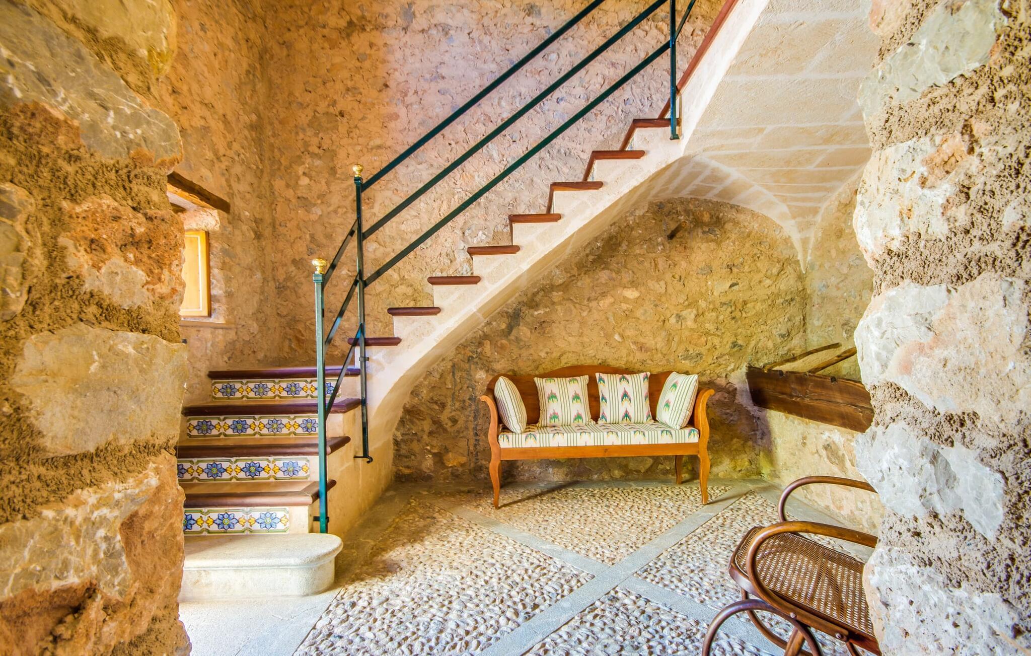 Villa "S'Erisal" er et fantastisk feriehus i hjertet af Mallorca, perfekt til dem, der leder efter en luksuriøs ferie. Når I kører langs den lange allé af palmetræer, vil I blive mødt af smukke grunde, herunder en appelsintræplantage og en rummelig terrasse perfekt til afslapning. Over 100 år gammel har ejendommen en charmerende blanding af restaurerede møbler og moderne detaljer, der sikrer både komfort og stil. Den rummelige terrasse emmer af en fortryllende charme med sine smukke gamle gulvtegl og soltag. Slap af på komfortable møbler, samles om bordet eller lounge under det knudrede oliventræ. Den indbydende pool inviterer jer til at slappe af med en forfriskende drink, mens I nyder udsigten over Tramuntana-bjergene. (Poolen er lukket fra november til slutningen af marts). Gå ind i villaen via den omsluttede terrasse og en lille entré dekoreret med natursten og flodsten. Den store stue har pejs og direkte adgang til terrassen, hvilket giver mulighed for problemfri indendørs-udendørs ophold. To soveværelser deler badeværelse i stueetagen, mens der er yderligere to soveværelser med fælles badeværelse ovenpå. Villaen imponerer med en harmonisk blanding af restaurerede møbler og moderne elementer, mens de tykke vægge sikrer en behagelig kølig atmosfære på varme sommerdage. Beliggende nær den charmerende by Alaró, kan gæsterne udforske de lokale butikker og nyde gågaden. Ydermere ligger Incas gamle bydel kun en kort køretur væk, og de nærmeste strande ligger cirka 30 km fra villaen. Samlet set tilbyder "S'Erisal" en fortryllende ramme for en uforglemmelig ferieoplevelse.
