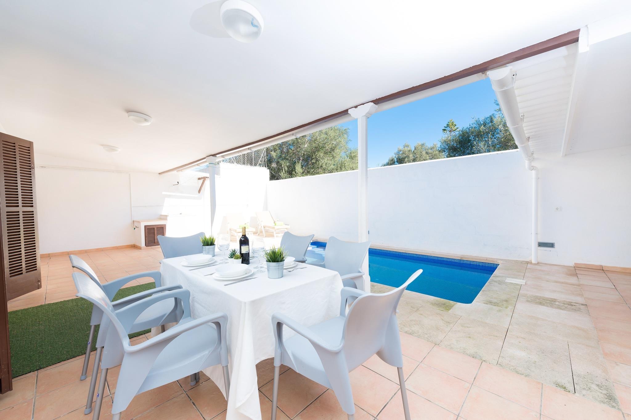 Privat Pool Retreat Træd ind i en fredfyldt flugt i dette charmerende hus, der byder på en saltvandspool (5 x 3 m, dybde 1,1-1,7 m) og en møbleret veranda perfekt til udendørs spisning eller aftendrinks. To liggestole inviterer dig til at slikke den mallorcanske sol eller slappe af med en bog. En kort gåtur på 600 meter bringer dig til den uberørte S'Estalella-strand, mens den forreste terrasse byder på fredelige morgener med kaffe eller udsigt til solnedgangen med familie og venner. Komfortable opholdsrum Indenfor flyder opholds- og spiseområdet i åbent plan ind i et moderne køkken udstyret med induktionskomfur, mikroovn, køleskab og alt hvad du behøver for at tilberede dine yndlingsmåltider. Huset byder på tre soveværelser med aircondition - to dobbeltværelser og et med to enkeltsenge - plus to badeværelser med bruser. Ekstraudstyr omfatter en vaskemaskine, strygebræt og strygejern på terrassen. Plads til en barneseng eller høj stol gør den ideel til familier, der rejser med små. Spisning og aktiviteter ved stranden S'Estanyol er perfekt for strandentusiaster, der er ivrige efter at udforske nærliggende bugter og krystalklart vand. Besøg Es Trenc, Sa Ràpita eller Ses Covetes for en dag ved havet. Der er masser af lokale spisemuligheder, med adskillige restauranter og barer kun få skridt fra ejendommen, der serverer frisk fisk og skaldyr og traditionelle mallorcanske retter. Butikker, offentlig transport og væsentlige ting er inden for rækkevidde, hvilket gør dit ophold både afslappende og bekvemt. Kæledyr er ikke tilladt, og arrangementer er forbudt.