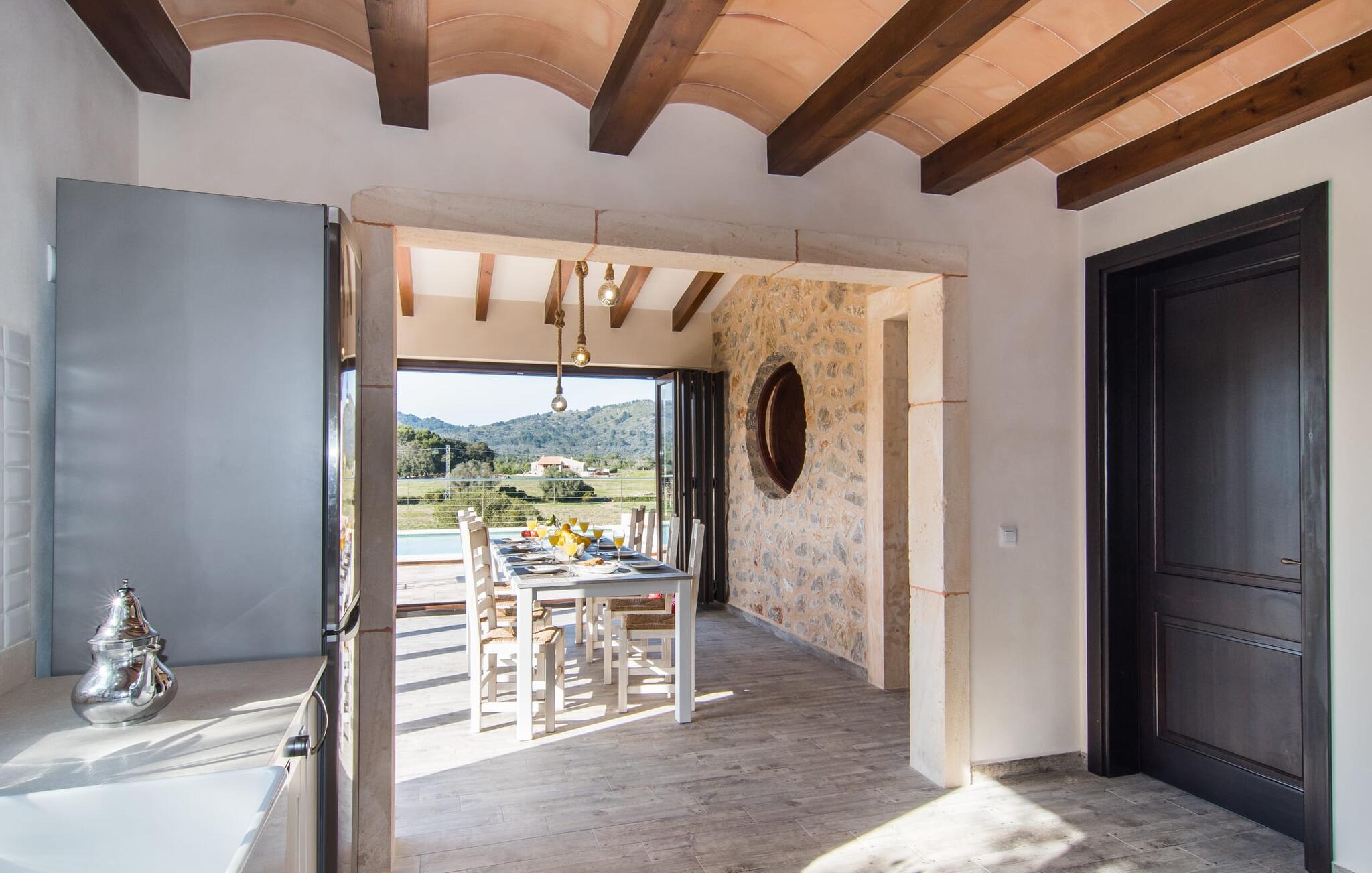 Hvis I beslutter jer for at tilbringe jeres ferie i en villa, vil I normalt sætte pris på nærheden til det fri: Selvom Artà, den næste større by, kun ligger et stenkast væk, vil I være midt i det grønne på jeres nye placering. Byggevilla S'Hort de Carrossa. Udsigten fra udendørsområdet af det smukke landskab er den reneste farveterapi, der fortryller jeres øjne med forskellige farver - alt efter årstiden. Efter at have nydt en afslappende nat, træder I ud på terrassen, strækker jer lidt, og glider så ned i poolen og genoplader, mens I glider gennem vandet midt i et postkortlignende landskab. Intet vil ændre sig, hvis I beslutter jer for at begynde at grille senere på eftermiddagen for at forkæle jer selv og familien med en skøn udendørs middag. Den milde, lune luft er en af ??grundene til, at Mallorca er så populær blandt feriegæster. Denne villa giver jer forskellige muligheder for at nyde det milde klima på den store terrasse, hvor I finder solbadeområder, lounge siddepladser og et overdækket område. For at slappe af og nyde jeres ferie fuldt ud, behøver I ikke engang at forlade villaen. Vinduerne til husets spiseplads kan åbnes så bredt, at ydersiden og indersiden af ??denne villa næsten smelter sammen.