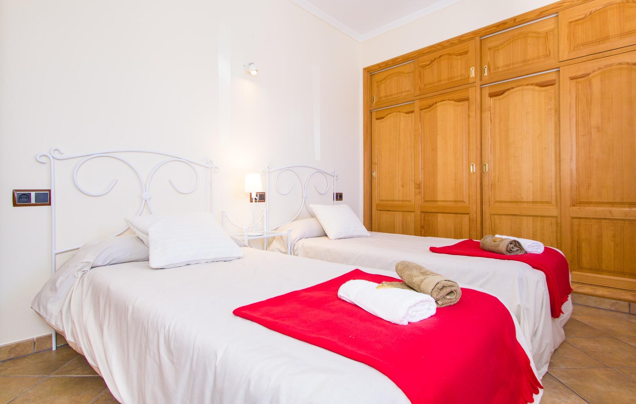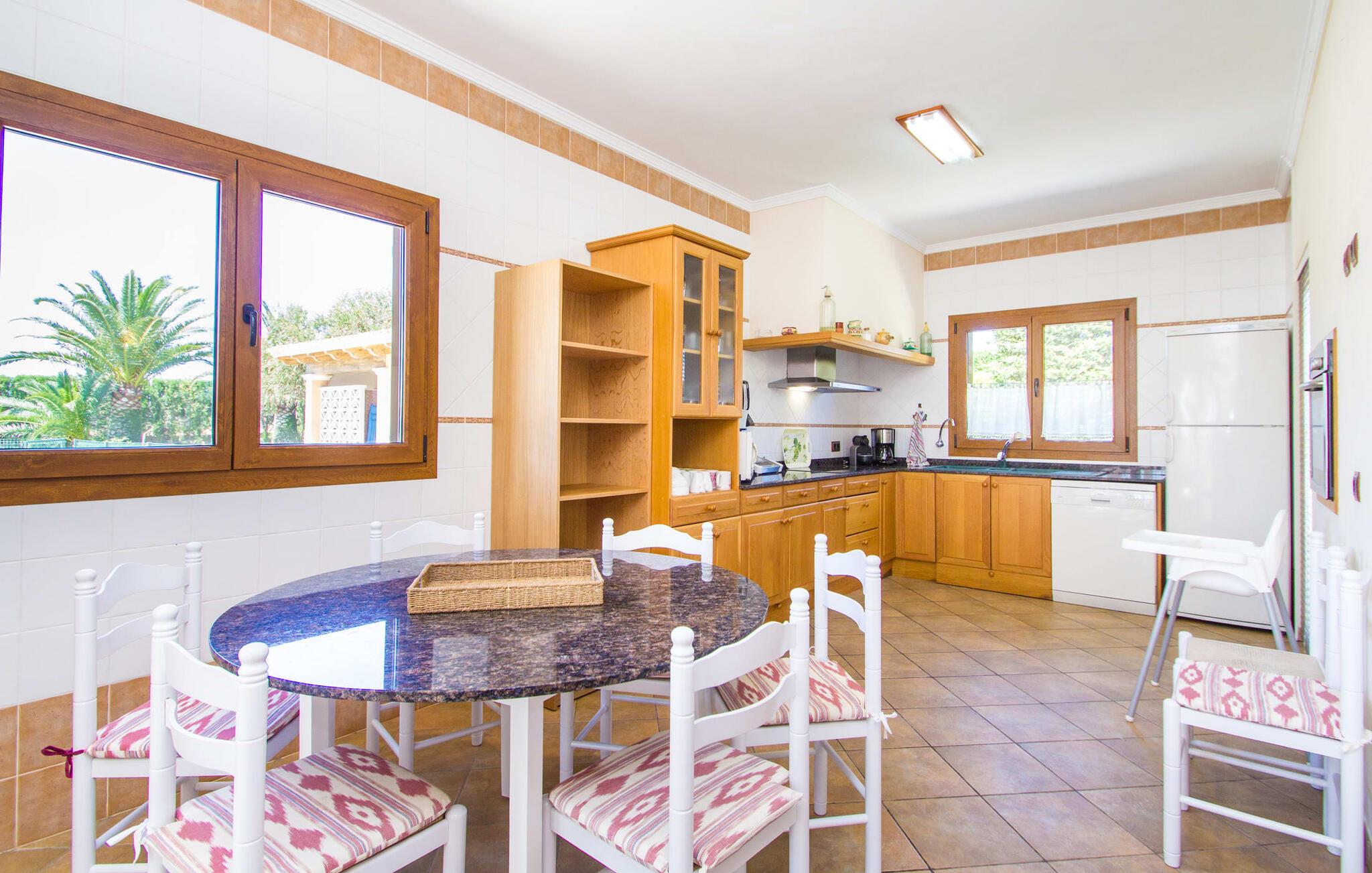 Hvis I er fan af skandinaviske, muntre farveskemaer, vil I straks forelske jer i husets indretning. Farverne på fliser, vægge og møbler harmonerer med hinanden og komplementeres charmerende af villaens belysningskoncept. I den store stue og spisestue kan I se den knitrende ild i pejsen eller slappe af i de store, hvide lædersofaer og se en film på fladskærms-tv'et. Køkkenet, der er udstyret med et bord, har også alt det nødvendige redskab til at sætte prikken over i'et på jeres ferie på Mallorca. Hvis tiden er knap, er der altid mulighed for at forkorte tilberedningen i mikrobølgeovnen. Ovnen er stilfuldt indbygget i væggen, og køleskabet tilbyder rigelig opbevaringsplads, selv til større shoppingture. Et af soveværelserne og et badeværelse ligger også i stueetagen. De to ekstra badeværelser, hvoraf det ene er indrettet i nautisk blå og hvid, samt fire yderligere soveværelser ligger på øverste niveau og fører ud til stuen. Et af badeværelserne har endda et badekar, hvis poolen og havet er for meget for jer. Værelserne ovenpå har også adgang til solterrassen med udsigt over poolen, haven og de landlige omgivelser.