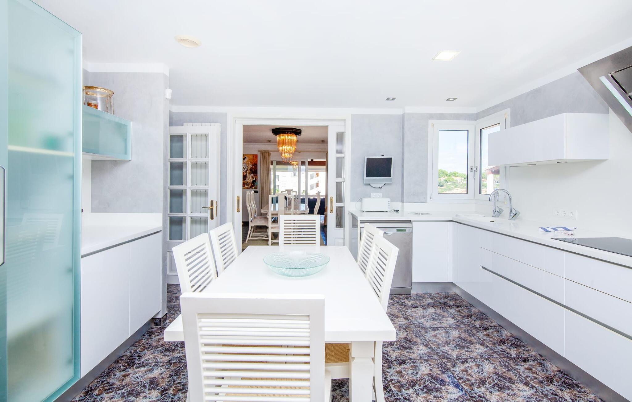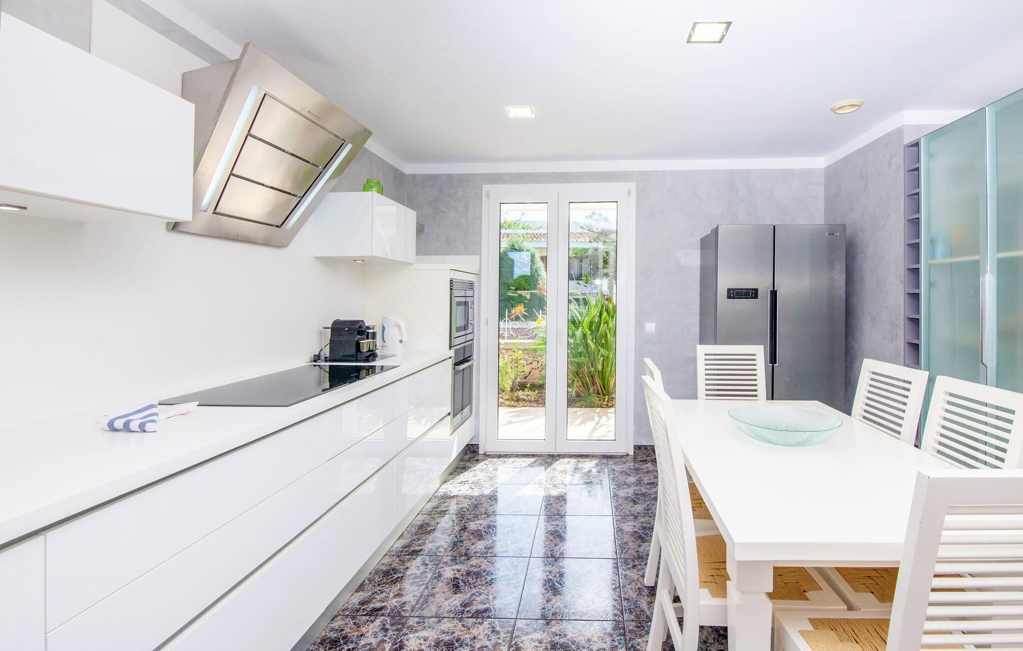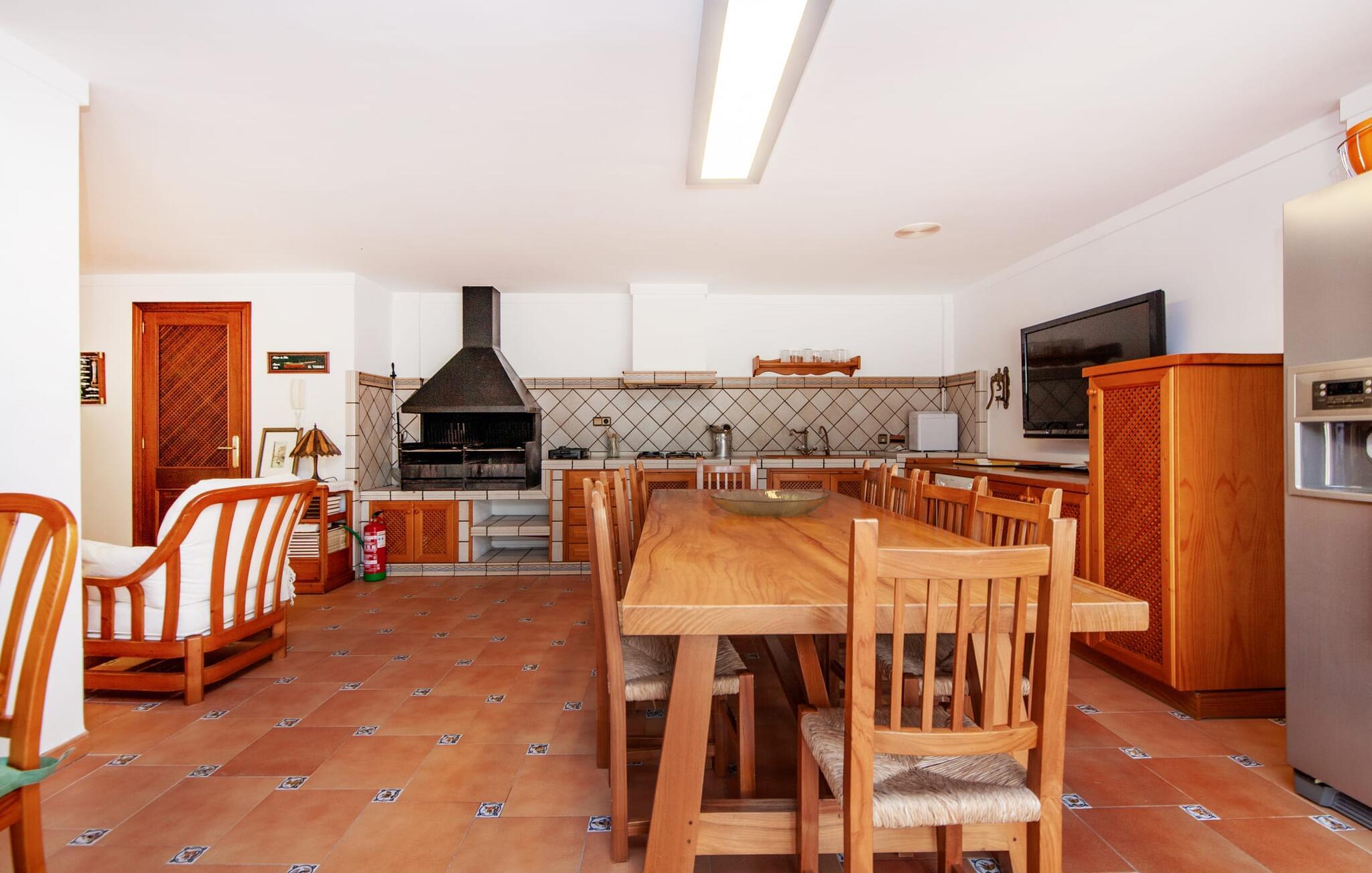 Indenfor udstråler villaen elegance og rummelighed. Den nederste etage indeholder en stue med sommerkøkken og indendørs grill, et soveværelse med dobbeltseng og et komplet badeværelse med badekar. Stueetagen har også et brusebad. Ovenpå finder I en stor stue/spisestue med komfortable siddepladser, et tv og et generøst spisebord samt et fuldt udstyret køkken og tre dobbeltværelser - hvoraf det ene har eget badeværelse og et ekstra brusebad.