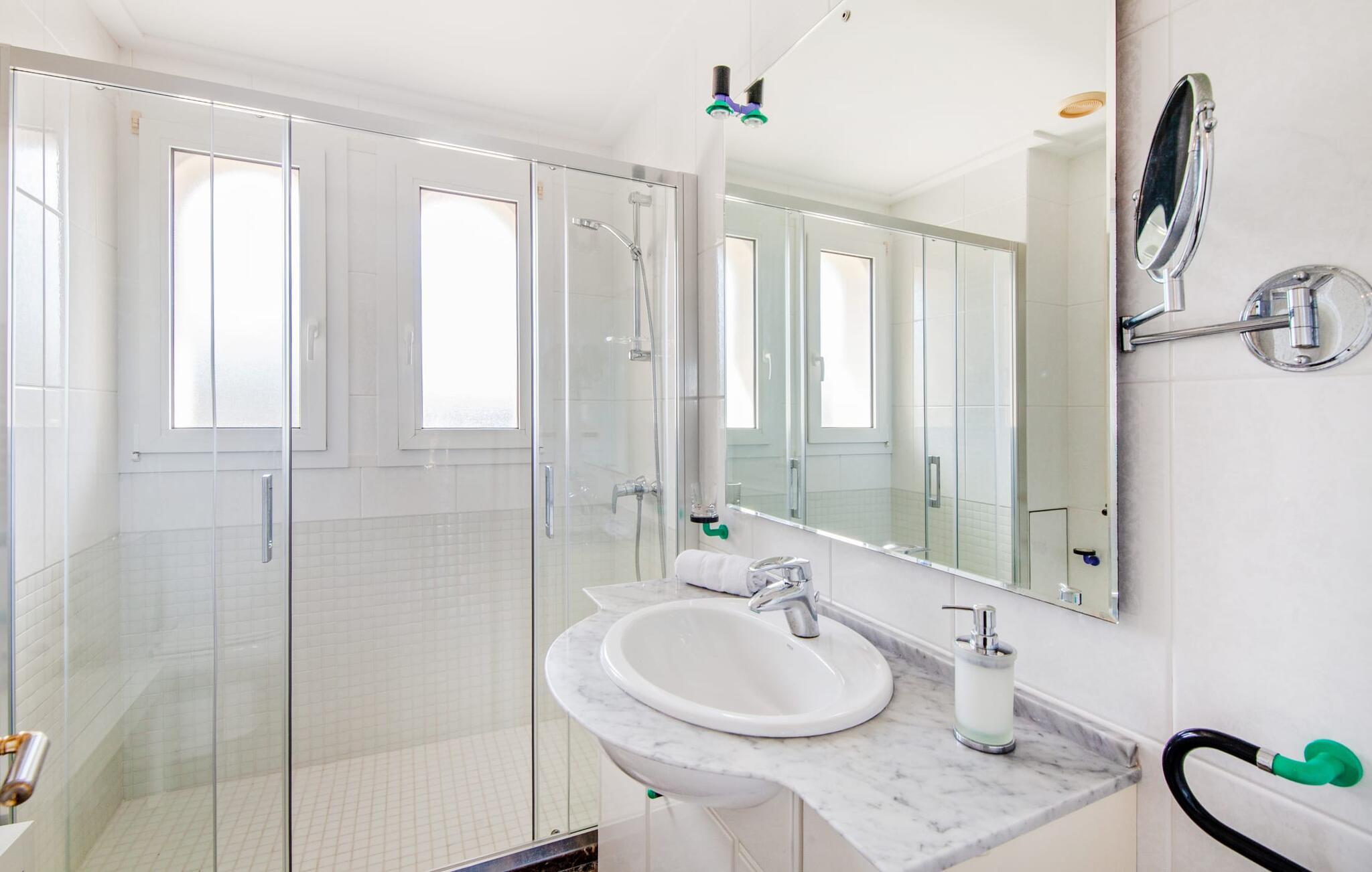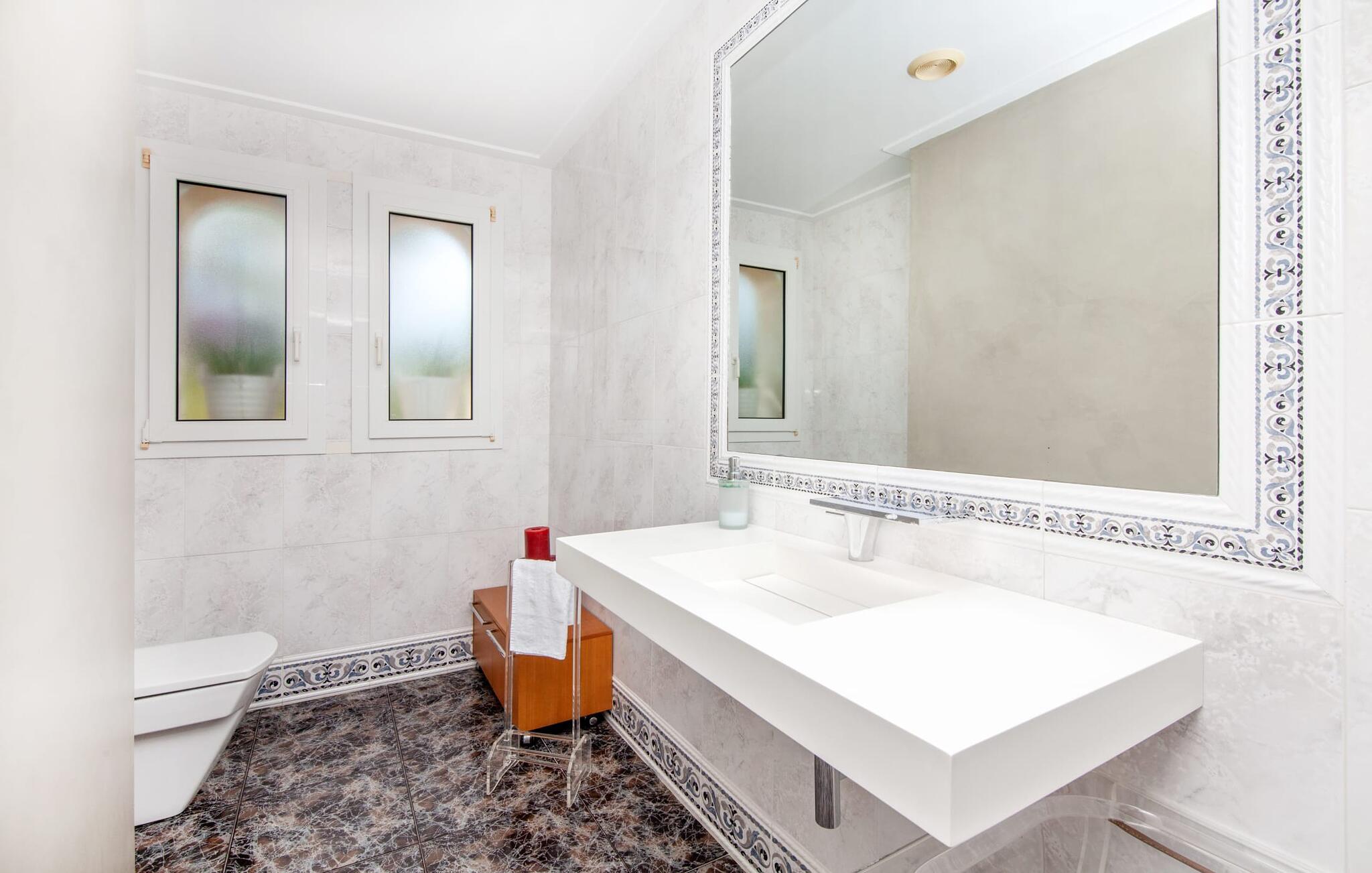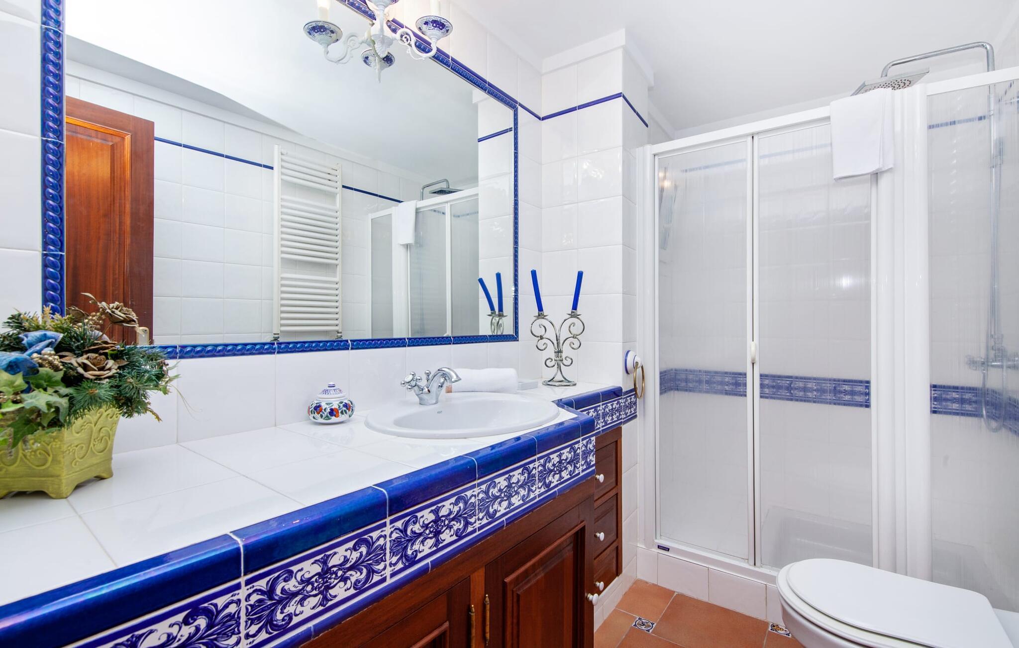 Indenfor udstråler villaen elegance og rummelighed. Den nederste etage indeholder en stue med sommerkøkken og indendørs grill, et soveværelse med dobbeltseng og et komplet badeværelse med badekar. Stueetagen har også et brusebad. Ovenpå finder I en stor stue/spisestue med komfortable siddepladser, et tv og et generøst spisebord samt et fuldt udstyret køkken og tre dobbeltværelser - hvoraf det ene har eget badeværelse og et ekstra brusebad.