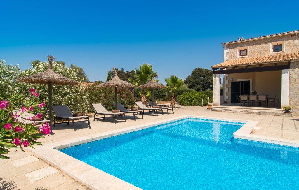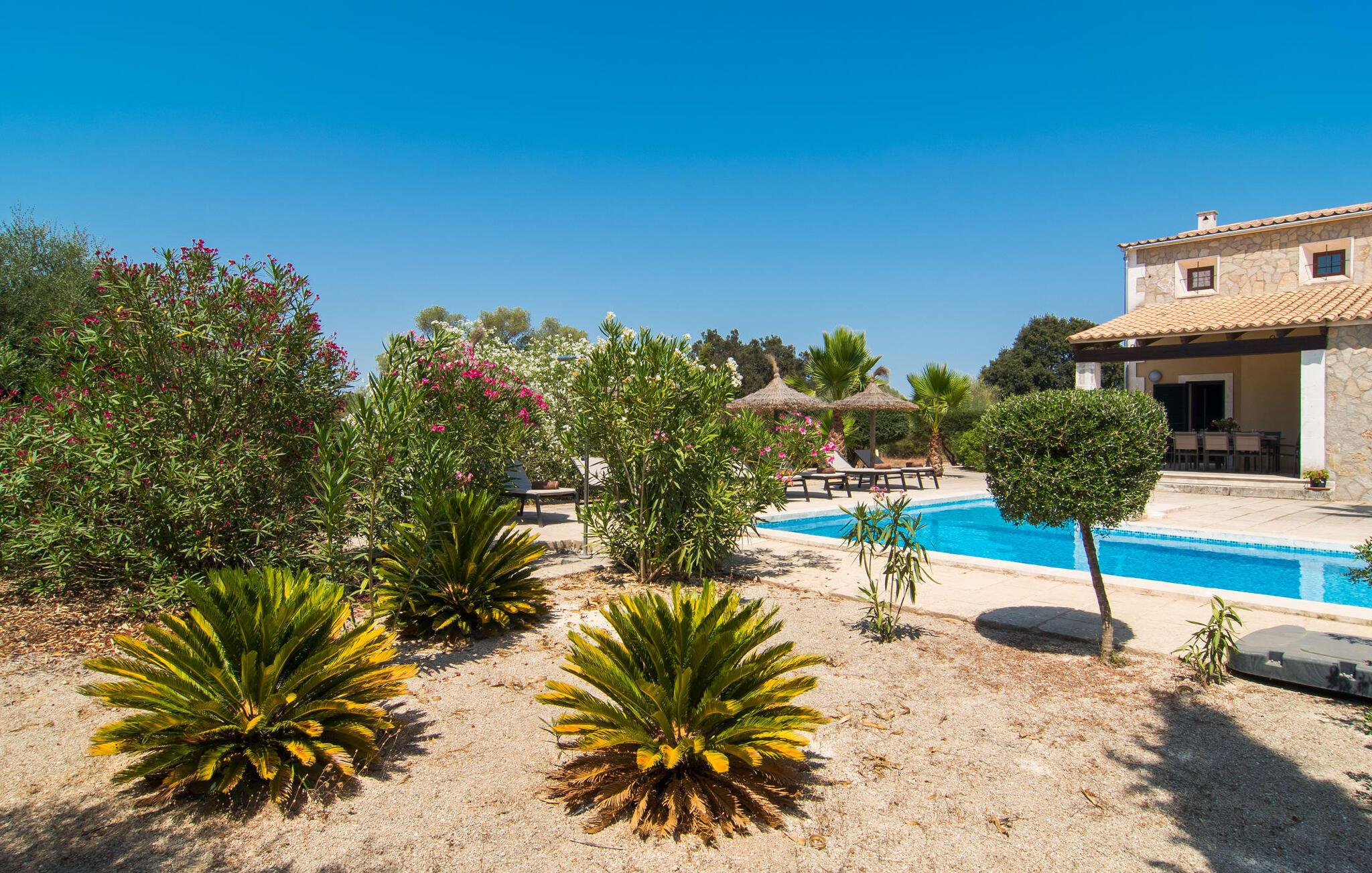 Den nybyggede villa "Sa Cantera" er beliggende i en rolig, men bekvem beliggenhed mellem Algaida og San Gual. Villaen er omgivet af blomstrende oleandere og unge palmer og egetræer og har en indbydende L-formet pool med nem adgang og plads til otte liggestole af træ i skyggen af bambusparasoller. Gæsterne kan nyde udendørs spisning på en overdækket terrasse nær hovedhuset med en grill. Sportsentusiaster vil sætte pris på adgang til en nærliggende tennisbane. Indvendigt emmer villaen af lys og elegance med hvide vægge, lyse klinker og smarte barokmøbler. Det kompakte køkken er fuldt udstyret med moderne apparater, og opholdsstuen har et designer-spisebord. Hovedhuset har fire velindrettede soveværelser, hver med aircondition, LCD-tv og masser af opbevaringsplads. Casita tilbyder et hyggeligt rum for par eller bedsteforældre med eget badeværelse. Med sin smukke have, rummelige terrasse og adgang til nærliggende strande og Palma er "Sa Cantera" perfekt til store grupper, der søger afslapning og eventyr. "Sa Cantera" er en nybygget villa med et hovedhus og et gæstehus med masser af rustik charme og et traditionelt præg i en smuk, afsondret landlig beliggenhed nær byen Algaida. Til daglig shopping er Algaida kun 10 minutter væk. I kan nyde shopping og kultur i øens hovedstad Palma, som kun ligger 20 minutter væk i bil – det er cirka samme afstand til strand og hav, da Platja de Palma eller Cuidad Jardin ligger cirka lige langt væk. Elforbrug skal betales kontant på stedet.