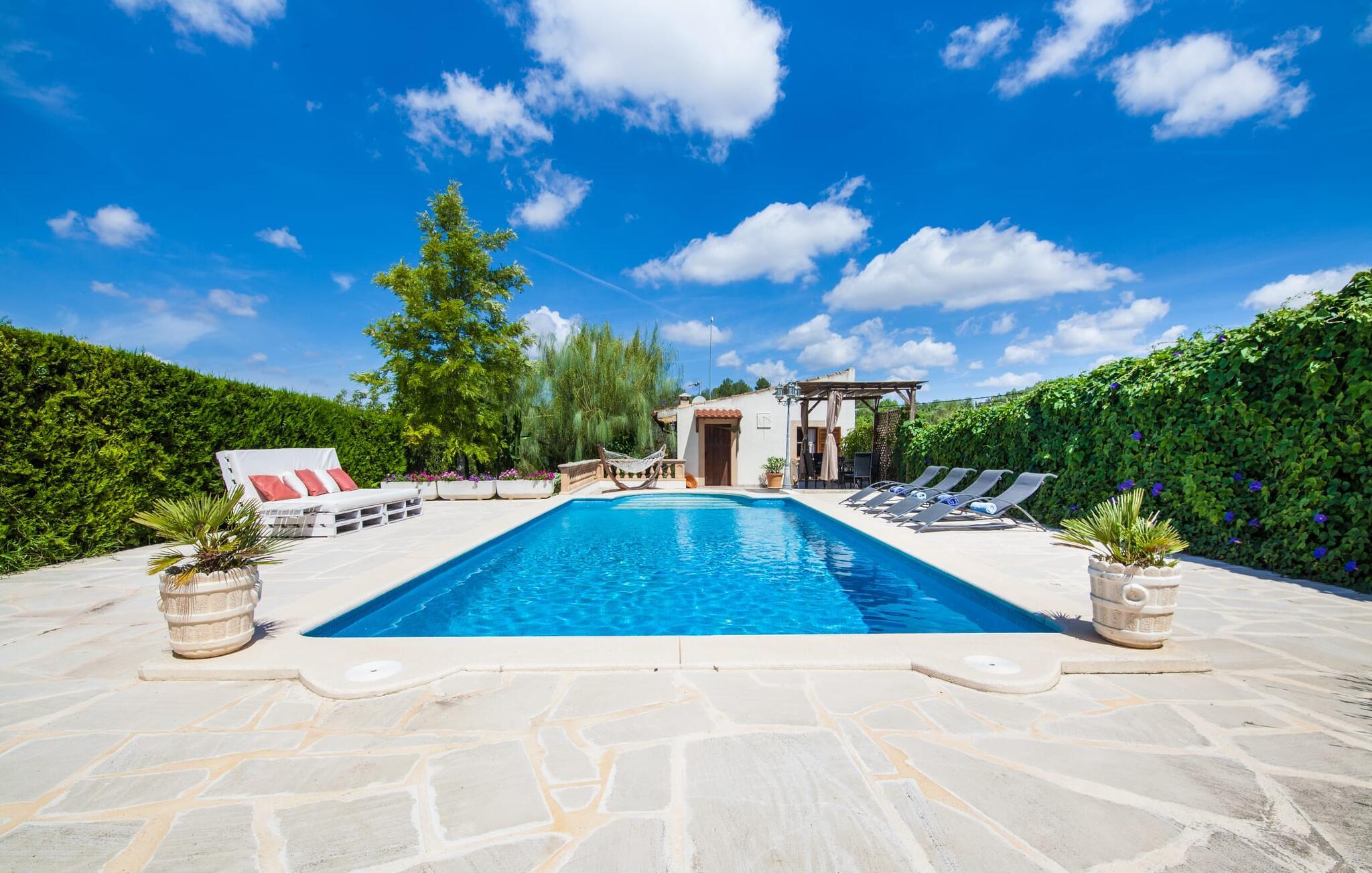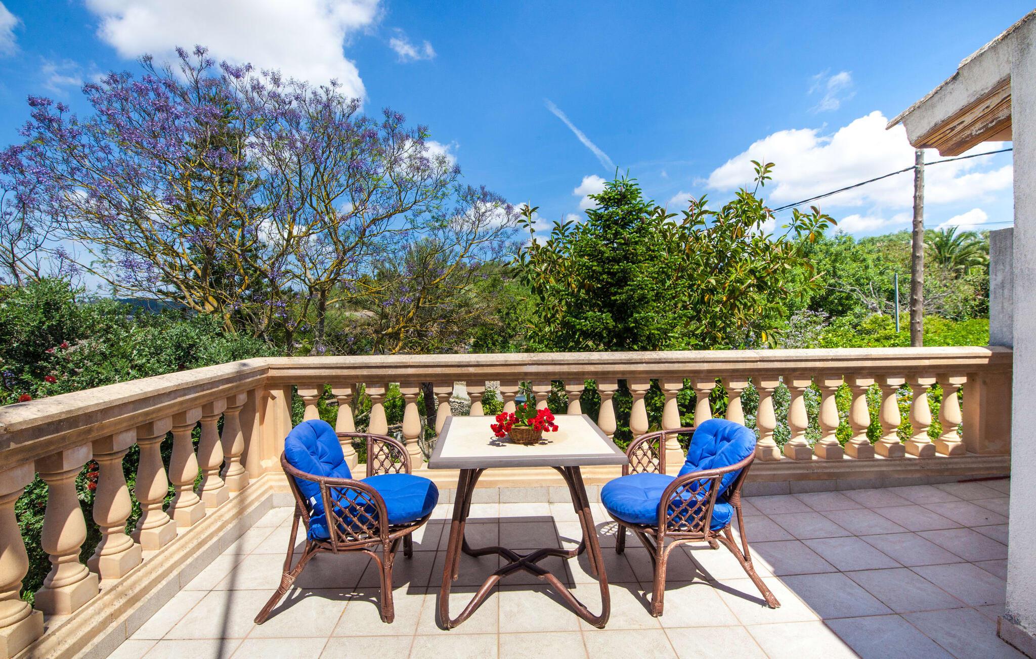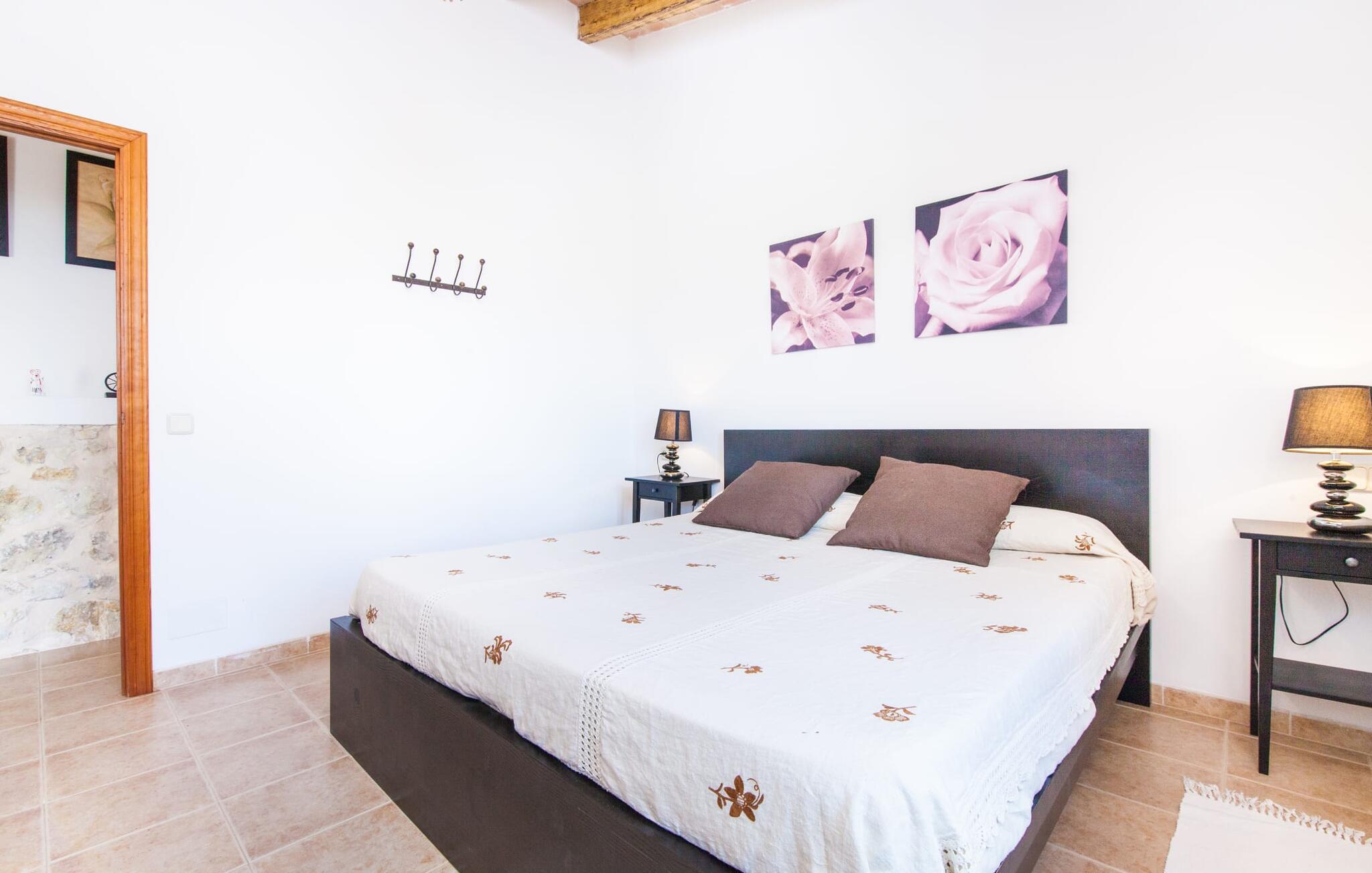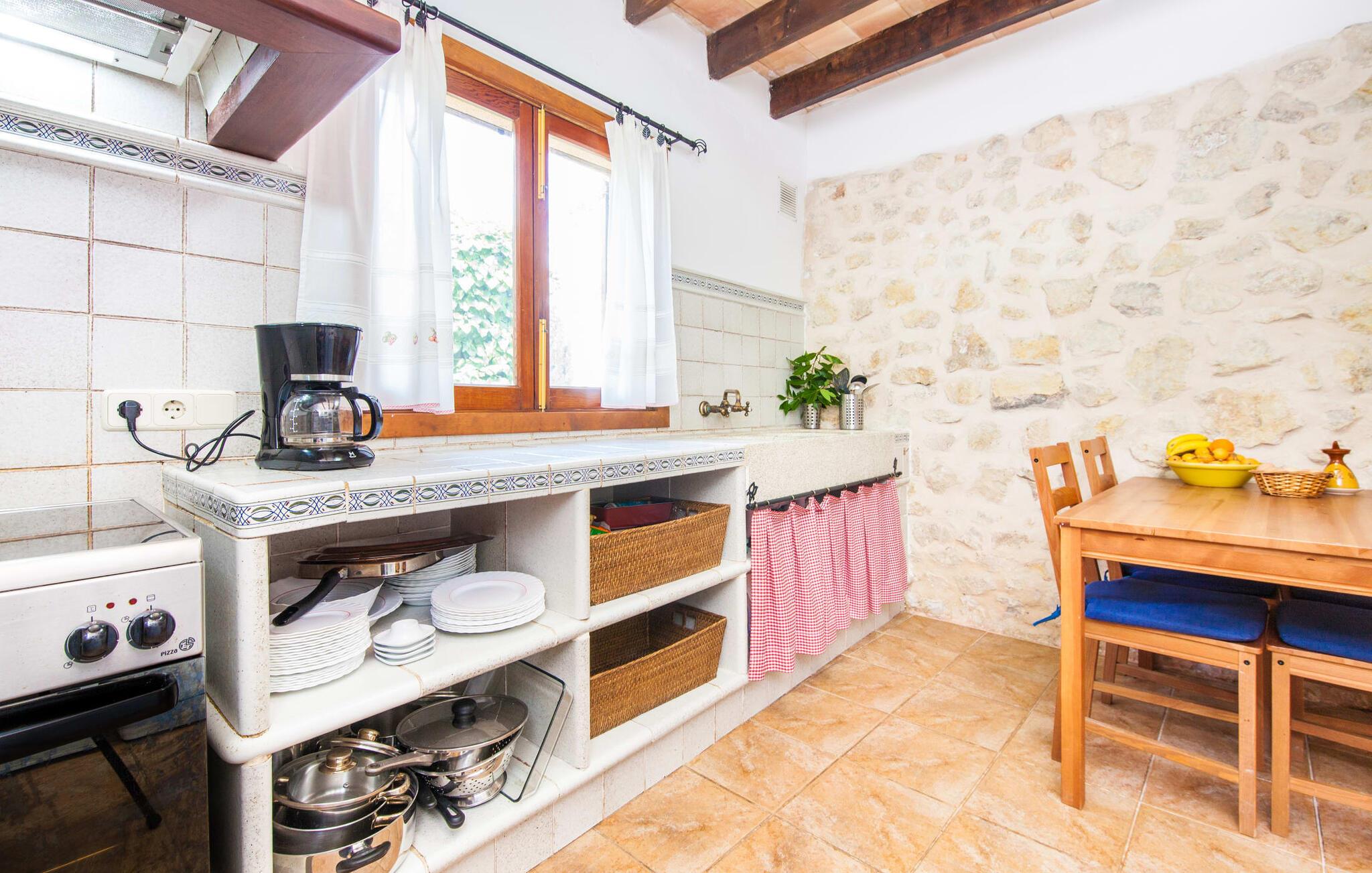 Villaen "Sa Caseta den Tronca" vil glæde jer med sit storslåede udeareal. Alt er smukt plantet, hver centimeter er grøn og blomstrer. Selv udefra giver villaen et rustikt og autentisk indtryk. Nogle af vandområderne er dekoreret med farverige mosaikker og har natursten overalt. Foran huset er der overdækket terrasse og grillplads, hvor I kan tilberede lækre delikatesser. Et andet højdepunkt ved udendørsområdet er den vidunderlige pool. Et spring i det kolde vand er en sikker forfriskning på varme sommerdage. Derudover er der masser af muligheder tilgængelige i og omkring villaen, når det kommer til at finde et sted at slappe af. I kan læne jer tilbage på liggestolene, slappe af i chill-out loungen eller lade jeres bekymringer ligge i hængekøjen. Foretrækker I skygge, er der også en lille overdækket terrasse med opholdsområde ved poolen. Og med vores egen legeplads med gynger og rutsjebaner bliver der også taget godt hensyn til de små, der rejser med os. Det indre af villaen "Sa Caseta den Tronca" er meget rustikt indrettet. I stuen er der en behagelig lædersofa og en gammel brændeovn, som i kombination med den indbyggede varmeovn giver hyggelig varme og en behagelig atmosfære i vintermånederne. Møblerne i dette rum er også overvejende traditionel. Fra stuen fører en dør ind til køkkenet, som er udstyret med en åben naturstensvæg og et lille spisebord. I stueetagen finder I også et soveværelse med dobbeltseng og et badeværelse. De synlige træbjælkelofter og de klassiske møbler giver en masse mallorcansk flair. På øverste etage er der yderligere to soveværelser med dobbeltsenge og et badeværelse med en synlig naturstensvæg, en dobbelt vask og et badekar. Herfra er der også adgang til husets altan. Der finder I et opholdsområde, hvorfra I kan skue ud over trætoppene og nyde omgivelserne i jeres sommerhus i fulde drag. Denne villa ligger midt på øen, nær Sant Joan. Hvis I slentrer gennem byens gader, vil I opdage endnu mere af det autentiske Mallorca. Placeringen af villaen er ideel til udflugter i alle retninger. Med jeres lejebil kan I nå de smukke strande, som kan nås via den tydeligt hørbare vej lige foran huset. Disse strande, herunder den lange sandstrand Can Picafort i Alcúdia-bugten, ligger omkring 30 km fra ejendommen. Palma, Mallorcas hovedstad, ligger cirka 37 km væk. Der vil I opdage masser af interessante seværdigheder, gode restauranter og varierede stier og vandrestier. Efter ca. 6 km kørsel kommer I til Sineu kommune. Hver onsdag er der markedsdag der. Det siges, at dette er det smukkeste bondemarked på hele Mallorca. Typiske mallorcanske delikatesser og tøj, lædervarer og fantastiske julesouvenirs kan købes på markedet. Tro os: I kan simpelthen ikke gå glip af en tur dertil. Den autentiske villa "Sa Caseta den Tronca" ligger midt på øen, nær Sant Joan kommune. Udeområdet omkring feriehuset er virkelig idyllisk. Der er et supermarked ca. 3,2 km væk, hvor I kan gøre jeres daglige indkøb. Der er også en række hyggelige restauranter i byen Sant Joan og i Sineu, ca. 6 km væk, finder Mallorcas smukkeste bondemarked sted hver onsdag.