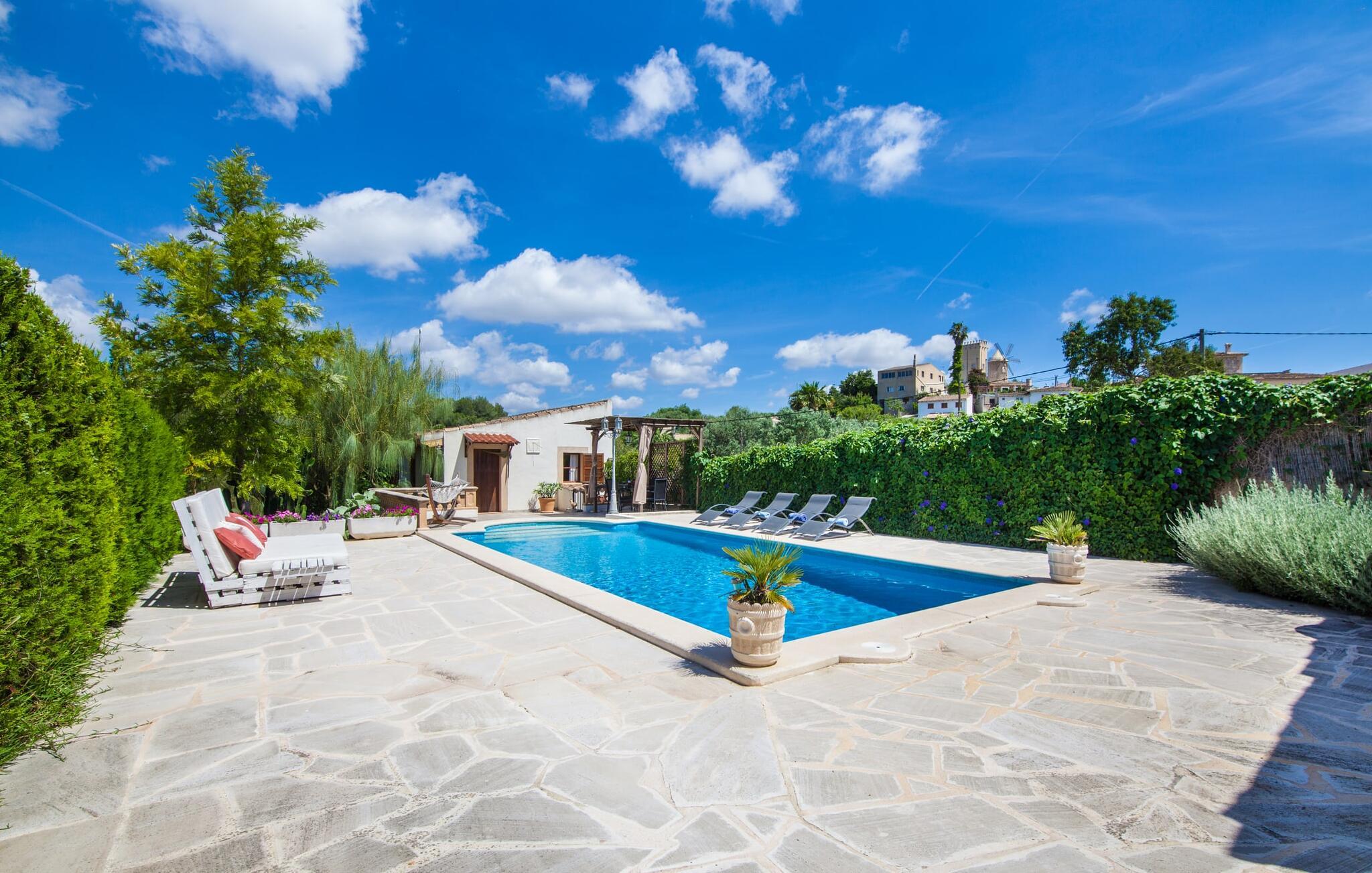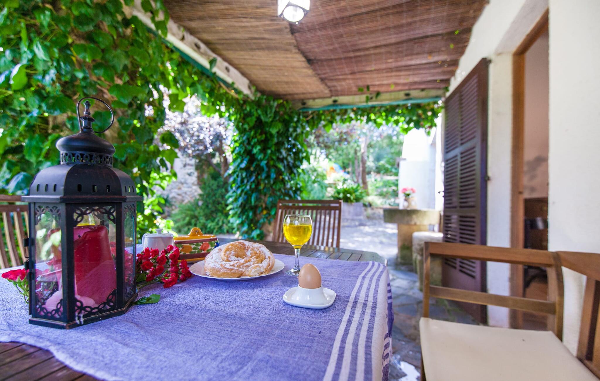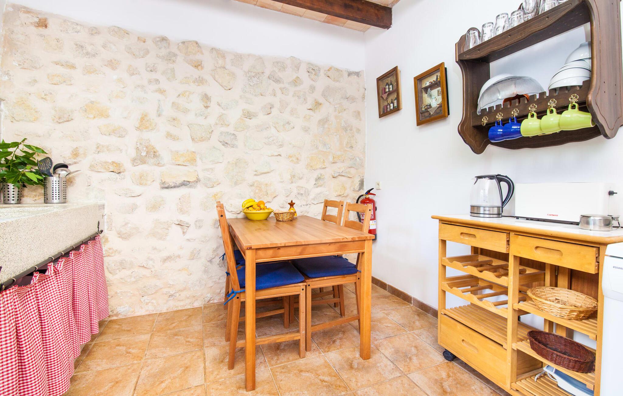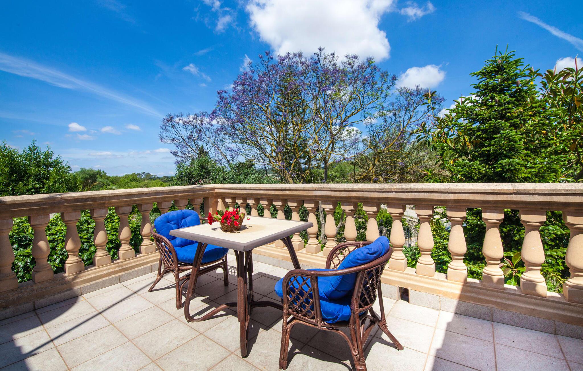Villaen "Sa Caseta den Tronca" vil glæde jer med sit storslåede udeareal. Alt er smukt plantet, hver centimeter er grøn og blomstrer. Selv udefra giver villaen et rustikt og autentisk indtryk. Nogle af vandområderne er dekoreret med farverige mosaikker og har natursten overalt. Foran huset er der overdækket terrasse og grillplads, hvor I kan tilberede lækre delikatesser. Et andet højdepunkt ved udendørsområdet er den vidunderlige pool. Et spring i det kolde vand er en sikker forfriskning på varme sommerdage. Derudover er der masser af muligheder tilgængelige i og omkring villaen, når det kommer til at finde et sted at slappe af. I kan læne jer tilbage på liggestolene, slappe af i chill-out loungen eller lade jeres bekymringer ligge i hængekøjen. Foretrækker I skygge, er der også en lille overdækket terrasse med opholdsområde ved poolen. Og med vores egen legeplads med gynger og rutsjebaner bliver der også taget godt hensyn til de små, der rejser med os. Det indre af villaen "Sa Caseta den Tronca" er meget rustikt indrettet. I stuen er der en behagelig lædersofa og en gammel brændeovn, som i kombination med den indbyggede varmeovn giver hyggelig varme og en behagelig atmosfære i vintermånederne. Møblerne i dette rum er også overvejende traditionel. Fra stuen fører en dør ind til køkkenet, som er udstyret med en åben naturstensvæg og et lille spisebord. I stueetagen finder I også et soveværelse med dobbeltseng og et badeværelse. De synlige træbjælkelofter og de klassiske møbler giver en masse mallorcansk flair. På øverste etage er der yderligere to soveværelser med dobbeltsenge og et badeværelse med en synlig naturstensvæg, en dobbelt vask og et badekar. Herfra er der også adgang til husets altan. Der finder I et opholdsområde, hvorfra I kan skue ud over trætoppene og nyde omgivelserne i jeres sommerhus i fulde drag. Denne villa ligger midt på øen, nær Sant Joan. Hvis I slentrer gennem byens gader, vil I opdage endnu mere af det autentiske Mallorca. Placeringen af villaen er ideel til udflugter i alle retninger. Med jeres lejebil kan I nå de smukke strande, som kan nås via den tydeligt hørbare vej lige foran huset. Disse strande, herunder den lange sandstrand Can Picafort i Alcúdia-bugten, ligger omkring 30 km fra ejendommen. Palma, Mallorcas hovedstad, ligger cirka 37 km væk. Der vil I opdage masser af interessante seværdigheder, gode restauranter og varierede stier og vandrestier. Efter ca. 6 km kørsel kommer I til Sineu kommune. Hver onsdag er der markedsdag der. Det siges, at dette er det smukkeste bondemarked på hele Mallorca. Typiske mallorcanske delikatesser og tøj, lædervarer og fantastiske julesouvenirs kan købes på markedet. Tro os: I kan simpelthen ikke gå glip af en tur dertil. Den autentiske villa "Sa Caseta den Tronca" ligger midt på øen, nær Sant Joan kommune. Udeområdet omkring feriehuset er virkelig idyllisk. Der er et supermarked ca. 3,2 km væk, hvor I kan gøre jeres daglige indkøb. Der er også en række hyggelige restauranter i byen Sant Joan og i Sineu, ca. 6 km væk, finder Mallorcas smukkeste bondemarked sted hver onsdag.