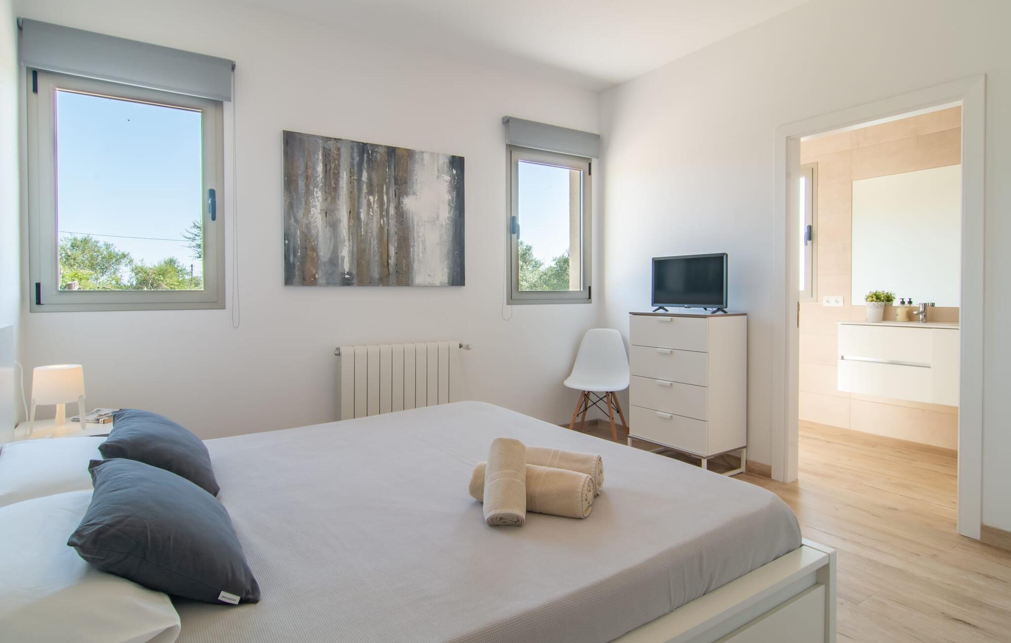 Ultramoderne, smukt vedligeholdt og i en virkelig utrolig beliggenhed - det er, hvad villaen "Sa Finca" nær Artà i det landlige øst for Mallorca byder på. Etplanshuset er indlejret i det typiske middelhavslandskab og byder ikke kun på masser af plads og privatliv på den store ejendom med en kærligt anlagt have, men også en vidunderlig udsigt til de grønne bakker i det fjerne. Lige bag villaen, som består af to sammenhængende bygninger, kan I lade solen skinne på maven på en af de komfortable liggestole på terrassen og køle af i den rektangulære pool. Den er også ideel til børn, da den takket være den blide hældning og de brede trin er ideel til deres første sving, selvfølgelig med passende svømmehjælpemidler. Men dem, der leder efter skygge, er også heldige: enten på den overdækkede terrasse lige ved siden af huset eller i den anden ende af poolen, hvor I finder et smukt lille overdækket udekøkken med grill, spisebord og stole. og et udendørs badeværelse. Lange aftener med familie og venner samt dejlig varme temperaturer og god mad er næsten garanteret! Interiøret i "Sa Finca" er lyst og åbent. At alle rum er i ét plan er særligt praktisk: I skal ikke vænne jer til at gå op og ned af trapper, hvilket er særligt praktisk, hvis I rejser med små børn. Møblerne er lige så smarte, moderne og af høj kvalitet, men er så klogt og kærligt udvalgt, at de samtidig fremstår afslappet og formidler en umiddelbar følelse af velvære. Hvide vægge og lyse gulve i opholds-spisestuen, der åbner ind i det stilrene, smarte køkken med udstyr af høj kvalitet, skaber en let, sommerlig atmosfære. I stuen er der en vidunderlig behagelig sofa, hvorpå I kan se et spændende tv-krimidrama. I har så valget mellem tre smagfuldt og diskret indrettede soveværelser, som har komfortable dobbeltsenge og store skabe til jeres feriegarderobe. Badeværelserne er helt i tråd med resten af huset: nyt, meget rent og velholdt, med bruseniche, store vinduer og smarte håndvaske. Ultramoderne og stilfuld inde og ude, villaen "Sa Finca" er beliggende i det smukke middelhavslandskab i den østlige del af Mallorca, kun 2,3 km fra den maleriske kunstnerby Artà. Huset i 1 plan er omgivet af en stor grund med nænsomt vedligeholdte græsplæner og oliventræer; en stor pool inklusive en hyggelig terrasse glitrer i solen. Forskellige familievenlige strande ligger kun 12 til 14 km væk med udlejningsbil.