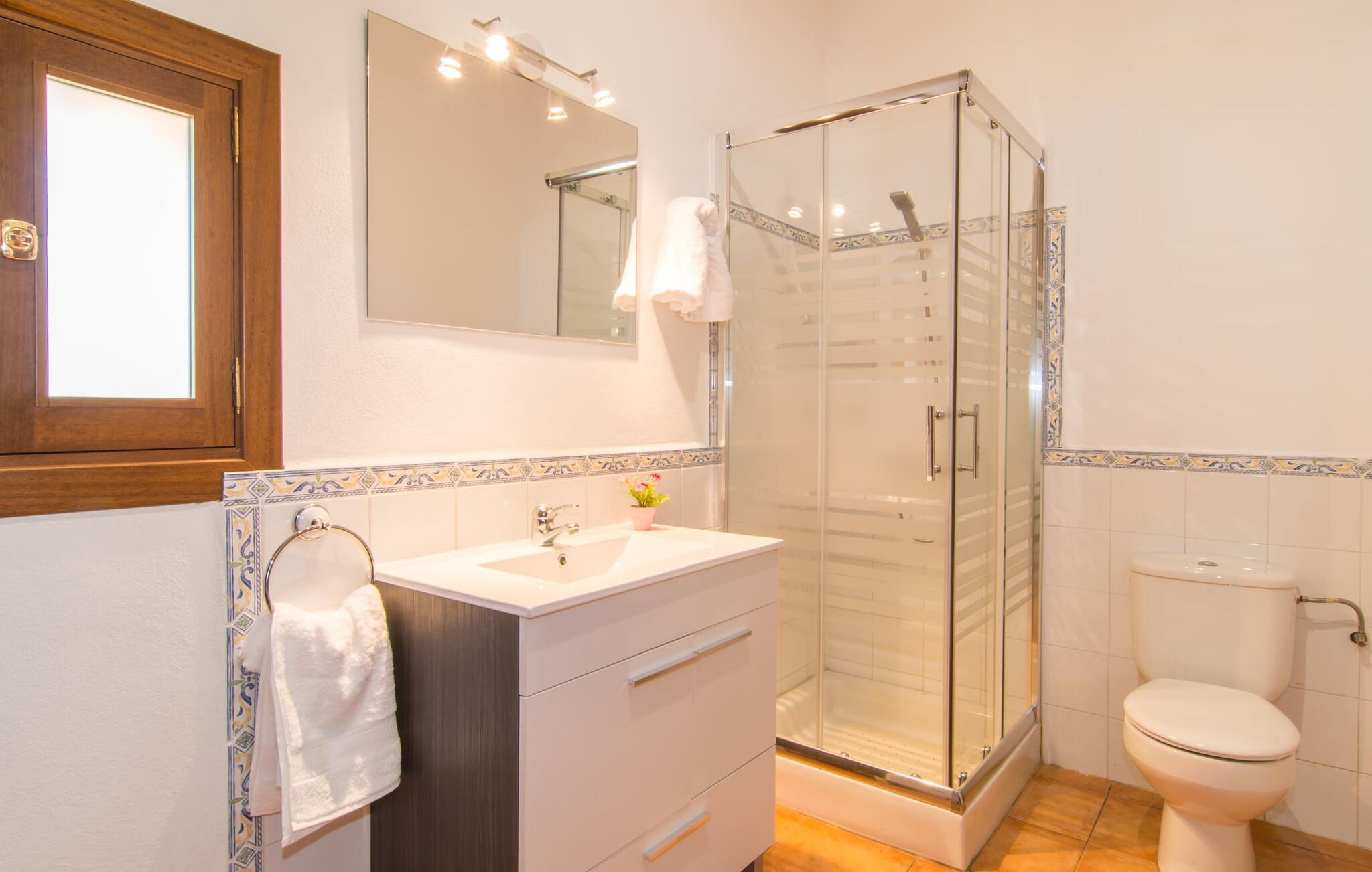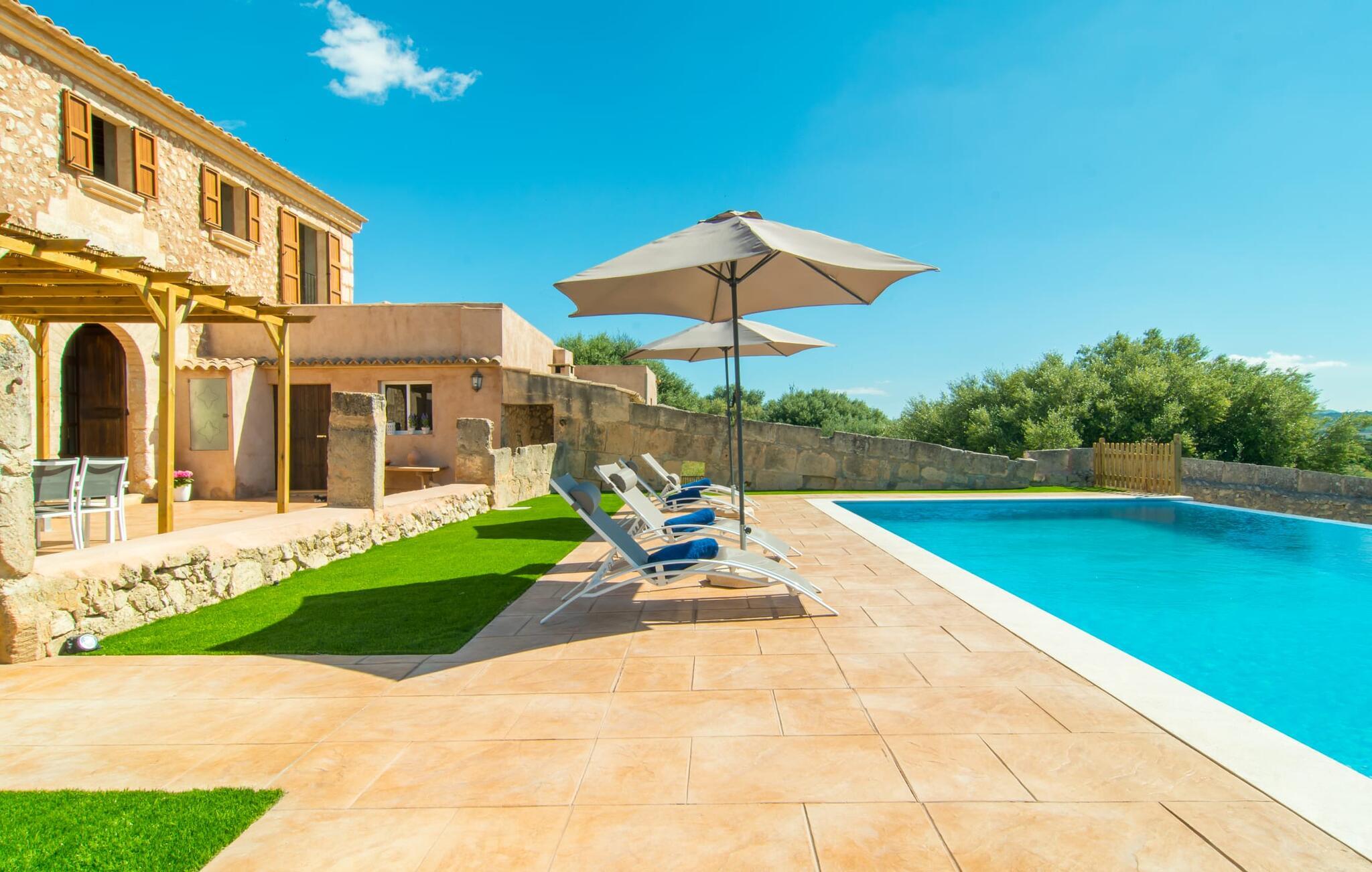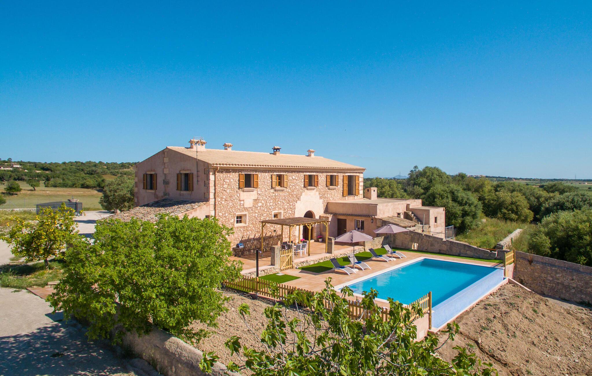 Som noget fra en billedbog hæver "Sa Font Authentic" sig over sletten i trekanten mellem Ariany, Petra og Sineu. Det byder på en betagende udsigt over det omkringliggende landskab - jeres ferie begynder i det øjeblik, I ankommer og får jeres første glimt af den fantastiske natur, der omgiver jer. Ejendommen er dejlig rummelig, men byder samtidig på idylliske områder lige ved siden af huset, der blot udstråler en følelse af hygge, så alle, der holder af meget plads omkring sig, bliver lige så tilfredse som dem, der elsker en hyggelig rede. atmosfære. Den 10 meter lange infinity-pool er den største udendørsattraktion. Bygget i 2017, er det dekoreret med blå mosaiksten og har en trappet indgang og en dyb ende. Mens I glider ubesværet hen over poolen, vil I også nyde en betagende udsigt, der normalt ikke er tilgængelig, når I svømmer. Lignende panoramaoplevelser kan nydes fra udendørsbruseren og på terrassearealerne på begge etager. Om I nyder udsigten fra liggestolen eller spisebordet, direkte under den mallorcanske sol eller under en markise - I bestemmer! Og der er også masser af pusterum indeni. Selvom I rejser med seks personer og yderligere to babyer, vil I finde plads nok til alle på den nederste etage, hvor I bor, som I ikke vil gå glip af, især på ferien. Stedets luftige indre charme er kendetegnet ved lyse vægge, terracotta gulvfliser og bevidst reserveret møblering og dekoration. Stue og spisestue er forbundet med en imponerende buegang og det fuldt udstyrede køkken med delvist frilagte murstenselementer skaber en behagelig kølig atmosfære, som kommer til udtryk i det luksuriøse køle/fryseskab. Brændeovnen giver sammen med nogle smukke ternepolstrede stole endnu en meget vellykket kontrast. Med så meget fred og ro omkring jer, vil I sove skønt i de to soveværelser med dobbeltsenge og soveværelset med to enkeltsenge. Der er plads nok til brusere mm i de to eksisterende badeværelser med dagslys, hvoraf det ene er bekvemt placeret i annekset ved poolen, hvor der også er en anden stor spiseplads, så når vejret er godt kan I slappe af her og nyd at feste indendørs og udendørs. Enhver, der holder ferie her, nyder fremragende forbindelser til den smukke mallorcanske by Petra, mens huset samtidig er omgivet af landskabets ro. Denne del af øen er stadig temmelig stille, med en del villaturisme og ugentlige markeder. For længere gåture gennem byen kan I tage til Manacor, omkring 15 km væk. Den historiske bymidte med sine mange små gader inviterer jer til at shoppe eller bare slappe af. Det lille samfund Sant Joan ligger mindre end 10 km væk og er hjemsted for den store gamle kirke Sant Joan Baptista, som har et storslået interiør. Flere sandstrande kan også hurtigt nås: den brede og ubebyggede naturstrand Son Serra de Marina ligger cirka 25 minutter nordøst, og i øst og sydøst er der flere smukke små bugter, de såkaldte Calas de Mallorca. Den vidunderligt luftige villa "Sa Font Authentic" er perfekt placeret og tilbyder en utrolig fjern udsigt. Udsigten strækker sig så langt som til Petra, kun 1,6 km væk, og de charmerende små gader og gyldenbrune stenhuse udgør en fremragende kulisse for jeres daglige ærinder. De smukke sandstrande i Alcúdia-bugten samt naturlige strande længere mod øst, herunder Cala Varques, kan nemt nås med lejebil.