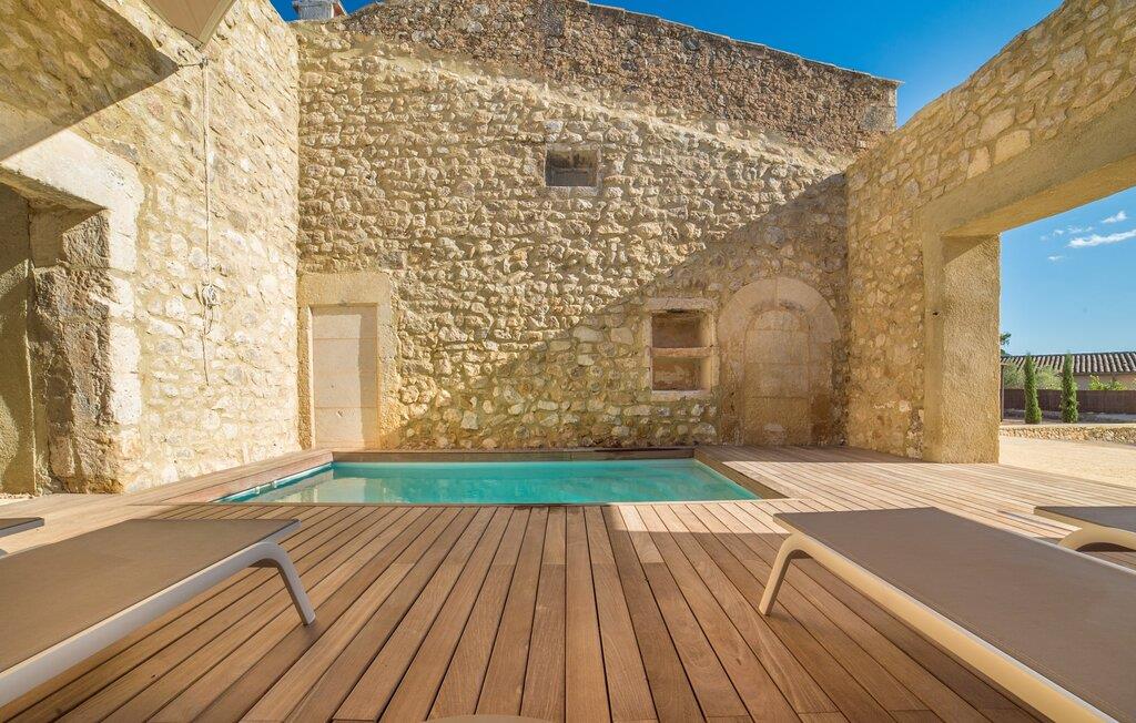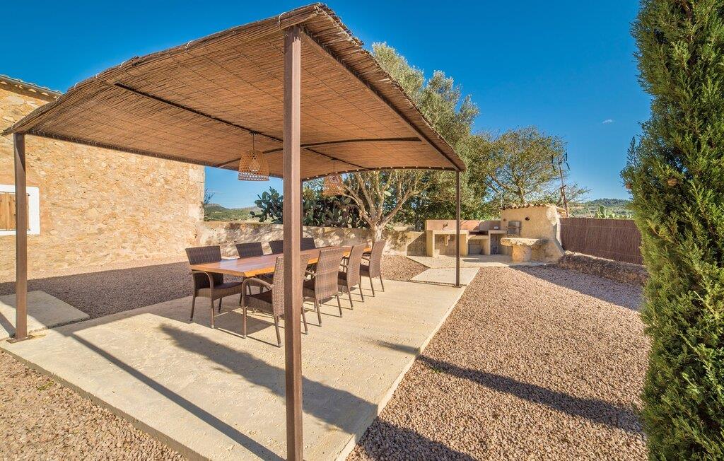 Den smukke feriefinca "Son Granada" er beliggende i det idylliske landskab i den østlige del af Mallorca. Her møder traditionel mallorcinsk arkitektur et elegant iscenesat udendørsområde. Slap af i det omhyggeligt designede poolområde, i læ for vinden og omgivet af høje sandstensvægge. Trægulvet, stilfulde markiser, overdådige liggestole og en indbydende udendørs bruser skaber en atmosfære, der inviterer jer til helt at slappe af. Haven er udformet som en rummelig terrasse: natursten og grus harmonerer med bygningens lyse natursten. I midten og smagfuldt overdækket er en skøn spiseplads med tilstødende udekøkken og kulgrill - det perfekte sted at nyde de lune sommernætter ved Middelhavet med venner og familie. Det 215 m² store indre af stuehuset, bygget i 1850, er kendetegnet ved en vellykket kombination af originale elementer og moderne komfort. Værelserne er behageligt kølige selv ved høje temperaturer og er tilgængelige via to separate indgange. I stueetagen er der udover opholdsstuen med flere siddepladser en spiseplads med bord og to køkkener, hvoraf det ene har et andet spisebord. Fire af de fem soveværelser er i stueetagen; På et galleri på øverste etage er der endnu et soveværelse til to gæster med eget badeværelse. I højre side af huset er der to soveværelser til hver to personer, mens der til venstre er et dobbeltværelse og et enkeltværelse. Moderne badeværelser med store brusekabiner er integreret i begge områder. Et af værelserne har en lille privat terrasse. Feriehuset er udstyret med WiFi og stabil mobiltelefonmodtagelse. Villaen "Son Granada" er omgivet af marker og græsgange og har en misundelsesværdig beliggenhed mellem Manacor og Felanitx i centrum af øen. Herfra har I adgang til hele øen; En direkte forbindelse til Palma samt let tilgængelige strande og klippefyldte bugter på østkysten gør denne ejendom til et ideelt udgangspunkt for en uforglemmelig ferie. Regionen er populær blandt vandrere og cyklister, mens Manacor byder på forskellige shoppingmuligheder.