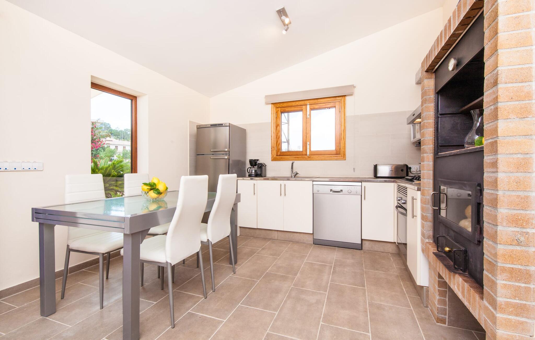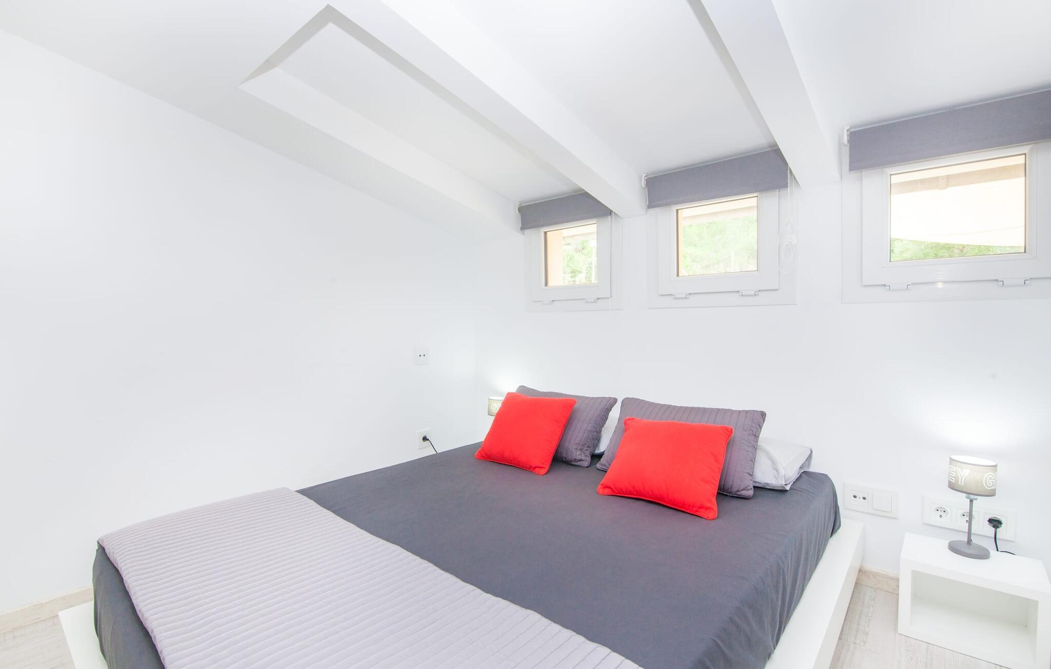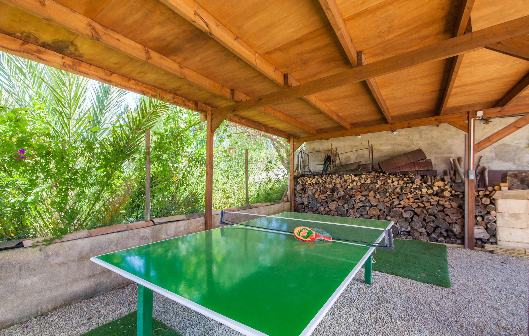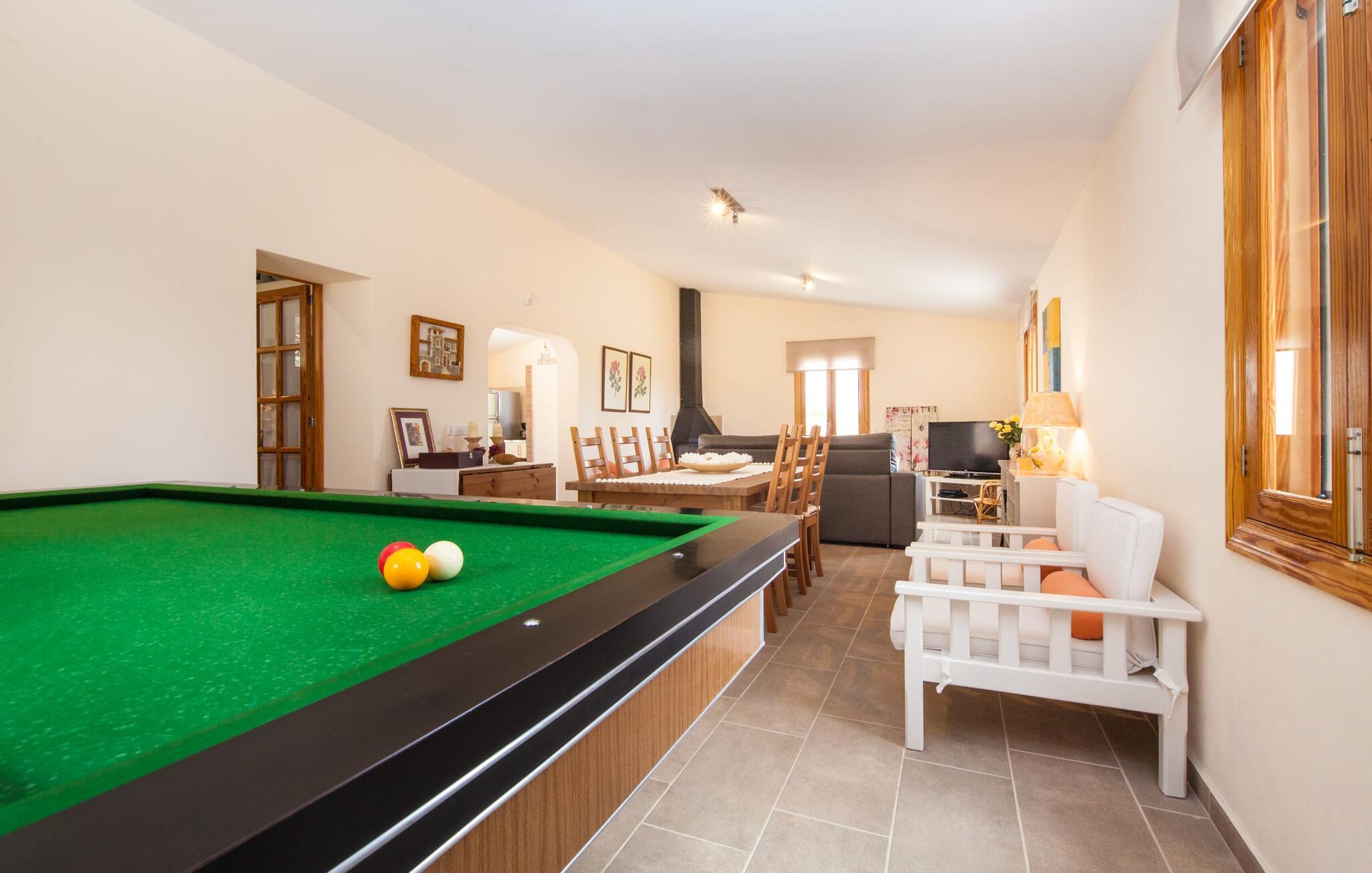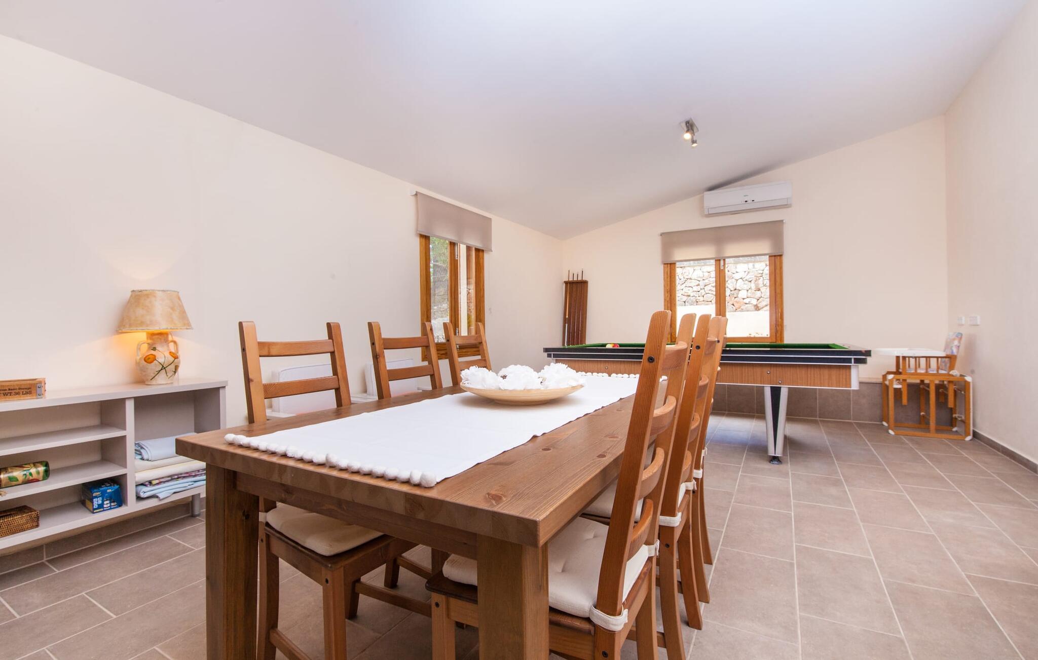 For dem af jer, der foretrækker det forrevne bjerglandskab og traditionelle landsbyer på Mallorca, er denne villa perfekt placeret: vandreområdet omkring Llucs helligdom er let at nå, der er god udsigt over den slående gotiske kirke, der har udsigt over Selva, og biler, der venter på parkeringspladsen, som ligger lidt under jorden, er altid klar til at springe i gang. Med jeres bagage i hånden fører en bred trappe jer direkte op til den velholdte pool. Dette danner den "gyldne middelvej" - den perfekte position mellem de to bygninger, der udgør ejendommen. Her finder I klapstole og liggestole til et lille pusterum i skyggen. Under soveafdelingens rummelige flade tag kan I (og jeres familie) nemt finde jer tilpas på den velpolstrede rattansofa, med ryggen beskyttet mod vinden og udsigt til det frodige grønne område foran jer. Grillen kan fyres sikkert op over i udekøkkenet. Med sine knudrede oliventræer, plantekasser, bougainvillea og chamaerops er haven virkelig en fryd for øjet. Det giver også masser af plads til hyggelige aftener udendørs, et roligt tilflugtssted med en god bog og masser af bordtennisspil. En vigtig bemærkning til dem med børn: Det dekorative metaltårn på stedet er en rest af minedrift og ikke et klatrestativ. I mellemtiden kan I spille et spil billard indendørs, som tilbyder et legende alternativ til en aften med fjernsyn foran pejsen. Takket være poolbordets placering kan konkurrencer foregå langt ud på natten uden frygt for at forstyrre andres søvn. Det specielle ved denne villa er, at den består af to helt adskilte områder: Stuen med gennemgang til det moderne køkken gør det at grille udendørs til et overdækket eventyr. Overfor finder I ejendomsområdet med de tre puristisk designede soveværelser. Bag loungen fører en glasdør til en trappe, som igen fører jer ind i et forværelse med siddepladser. Bagved venter to dobbeltsenge og to enkeltsenge på at blive redt op. Hver af sengene vil med garanti få jer til at drømme helt i hvidt. Tre komfortable badeværelser med vaskemaskiner og brusere eller brusekar kan deles mellem jer - et i højre og et i husets venstre fløj samt et udendørs badeværelse, så I ikke skal vente længe, hvis I har brug for at høre bjergene kalde jeres navn en morgen. Selva er (stadig) et sted med en masse karakter! Hvis I har lyst til at shoppe, vil I være tæt nok på centrum til enten at gå ind til byen eller tage den lille forbindelsesvej, der fører dertil. Vejene snor sig op ad bakke og vejene snor sig ned ad bakke - en fantastisk måde at varme musklerne op og forberede sig på længere ture. Med urtelikør, brød og olivenolie i rygsækken er det næsten som en træning i sig selv. Det gælder uanset om I i første omgang blot vil valfarte til Sankt Lawrence Kirke, hvorfra I kan nyde en spektakulær udsigt over Artà og Alcúdia-bugten, eller om I tager den 12 km lange tur herfra Caimari til helligdommen Lluc. Når det kommer til væsker til jeres rejse, bør jeres første anløbshavn være en smagning af de varer, der tilbydes i Binissalem, centrum for mallorcansk vinproduktion. I Inca, øens shoppingparadis, er der også et rustikt kælderhus – og nok restauranter til at give byen et solidt fundament. Men hvis I synes, at I smelter i varmen, skal I bare starte med en tur til Playa de Muro, 30 km væk. I udkanten af den charmerende by Selva, kun 5 km nord for Inca, byder den sommerlige "Sa Mina de San Cayetano" på optimale betingelser for en vellykket (vandre)ferie og fordybelse i mallorcinsk landsbyliv. Ud over supermarkedet Aprop, kun 1 km væk, er der flere restauranter og cykeludlejning i byen. Serra del Norte med det berømte Lluc-kloster ligger kun 14 km væk, mens Badia d'Alcúdia ligger omkring 30 km fra villaen; En dag med svømning i Playa de Muro eller i Can Picafort er en fantastisk måde at runde jeres ferie af på en forfriskende måde. Bemærk venligst, at denne ejendom ikke accepterer ungdomsgrupper eller polterabender. En ungdomsgruppe på denne ejendom består af personer under 30 år. Book ikke denne ejendom, hvis I er en ungdomsgruppe eller en polterabendgruppe, da jeres reservation vil blive afvist, når den er booket, hvilket også kan være tilfældet ved ankomst til ejendommen eller under jeres ophold, og I vil ikke modtage en refusion.