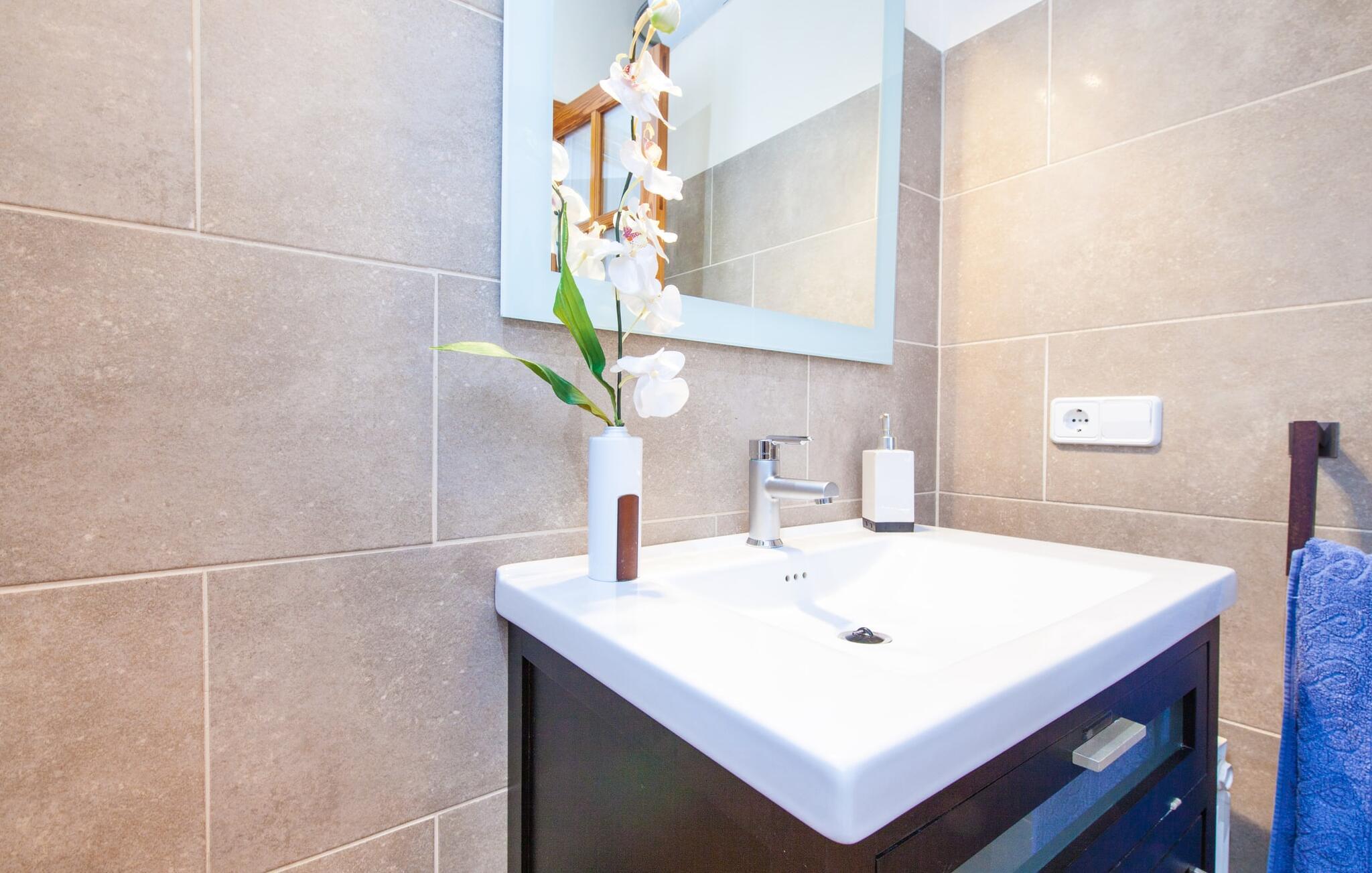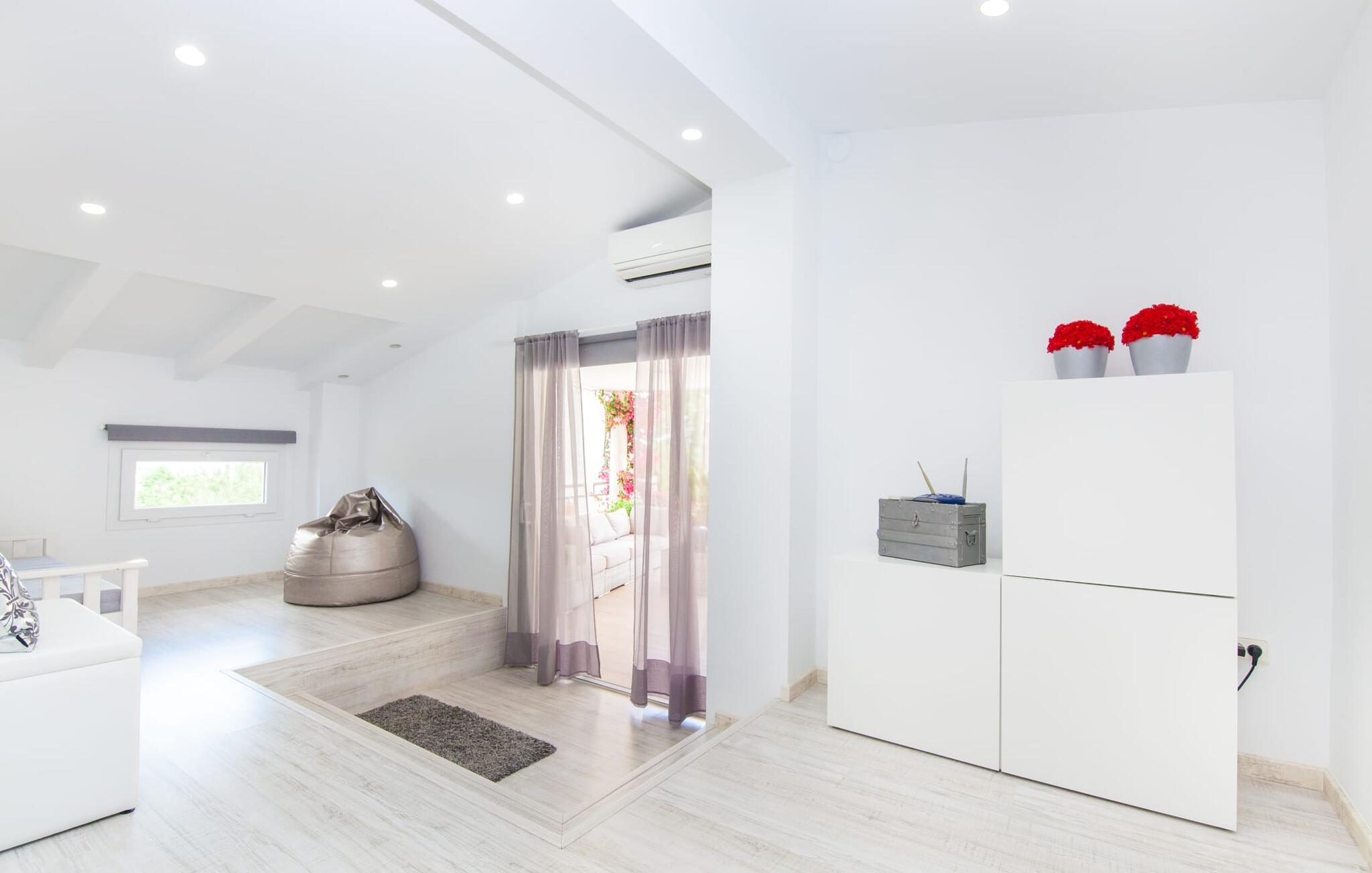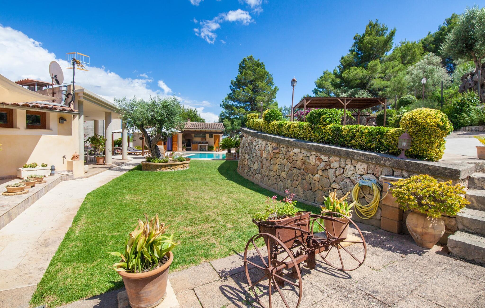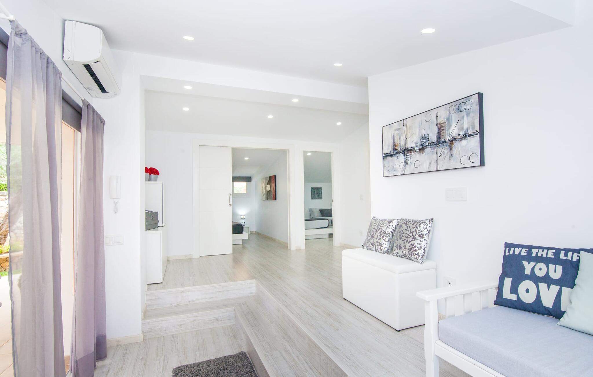 For dem af jer, der foretrækker det forrevne bjerglandskab og traditionelle landsbyer på Mallorca, er denne villa perfekt placeret: vandreområdet omkring Llucs helligdom er let at nå, der er god udsigt over den slående gotiske kirke, der har udsigt over Selva, og biler, der venter på parkeringspladsen, som ligger lidt under jorden, er altid klar til at springe i gang. Med jeres bagage i hånden fører en bred trappe jer direkte op til den velholdte pool. Dette danner den "gyldne middelvej" - den perfekte position mellem de to bygninger, der udgør ejendommen. Her finder I klapstole og liggestole til et lille pusterum i skyggen. Under soveafdelingens rummelige flade tag kan I (og jeres familie) nemt finde jer tilpas på den velpolstrede rattansofa, med ryggen beskyttet mod vinden og udsigt til det frodige grønne område foran jer. Grillen kan fyres sikkert op over i udekøkkenet. Med sine knudrede oliventræer, plantekasser, bougainvillea og chamaerops er haven virkelig en fryd for øjet. Det giver også masser af plads til hyggelige aftener udendørs, et roligt tilflugtssted med en god bog og masser af bordtennisspil. En vigtig bemærkning til dem med børn: Det dekorative metaltårn på stedet er en rest af minedrift og ikke et klatrestativ. I mellemtiden kan I spille et spil billard indendørs, som tilbyder et legende alternativ til en aften med fjernsyn foran pejsen. Takket være poolbordets placering kan konkurrencer foregå langt ud på natten uden frygt for at forstyrre andres søvn. Det specielle ved denne villa er, at den består af to helt adskilte områder: Stuen med gennemgang til det moderne køkken gør det at grille udendørs til et overdækket eventyr. Overfor finder I ejendomsområdet med de tre puristisk designede soveværelser. Bag loungen fører en glasdør til en trappe, som igen fører jer ind i et forværelse med siddepladser. Bagved venter to dobbeltsenge og to enkeltsenge på at blive redt op. Hver af sengene vil med garanti få jer til at drømme helt i hvidt. Tre komfortable badeværelser med vaskemaskiner og brusere eller brusekar kan deles mellem jer - et i højre og et i husets venstre fløj samt et udendørs badeværelse, så I ikke skal vente længe, hvis I har brug for at høre bjergene kalde jeres navn en morgen. Selva er (stadig) et sted med en masse karakter! Hvis I har lyst til at shoppe, vil I være tæt nok på centrum til enten at gå ind til byen eller tage den lille forbindelsesvej, der fører dertil. Vejene snor sig op ad bakke og vejene snor sig ned ad bakke - en fantastisk måde at varme musklerne op og forberede sig på længere ture. Med urtelikør, brød og olivenolie i rygsækken er det næsten som en træning i sig selv. Det gælder uanset om I i første omgang blot vil valfarte til Sankt Lawrence Kirke, hvorfra I kan nyde en spektakulær udsigt over Artà og Alcúdia-bugten, eller om I tager den 12 km lange tur herfra Caimari til helligdommen Lluc. Når det kommer til væsker til jeres rejse, bør jeres første anløbshavn være en smagning af de varer, der tilbydes i Binissalem, centrum for mallorcansk vinproduktion. I Inca, øens shoppingparadis, er der også et rustikt kælderhus – og nok restauranter til at give byen et solidt fundament. Men hvis I synes, at I smelter i varmen, skal I bare starte med en tur til Playa de Muro, 30 km væk. I udkanten af den charmerende by Selva, kun 5 km nord for Inca, byder den sommerlige "Sa Mina de San Cayetano" på optimale betingelser for en vellykket (vandre)ferie og fordybelse i mallorcinsk landsbyliv. Ud over supermarkedet Aprop, kun 1 km væk, er der flere restauranter og cykeludlejning i byen. Serra del Norte med det berømte Lluc-kloster ligger kun 14 km væk, mens Badia d'Alcúdia ligger omkring 30 km fra villaen; En dag med svømning i Playa de Muro eller i Can Picafort er en fantastisk måde at runde jeres ferie af på en forfriskende måde. Bemærk venligst, at denne ejendom ikke accepterer ungdomsgrupper eller polterabender. En ungdomsgruppe på denne ejendom består af personer under 30 år. Book ikke denne ejendom, hvis I er en ungdomsgruppe eller en polterabendgruppe, da jeres reservation vil blive afvist, når den er booket, hvilket også kan være tilfældet ved ankomst til ejendommen eller under jeres ophold, og I vil ikke modtage en refusion.