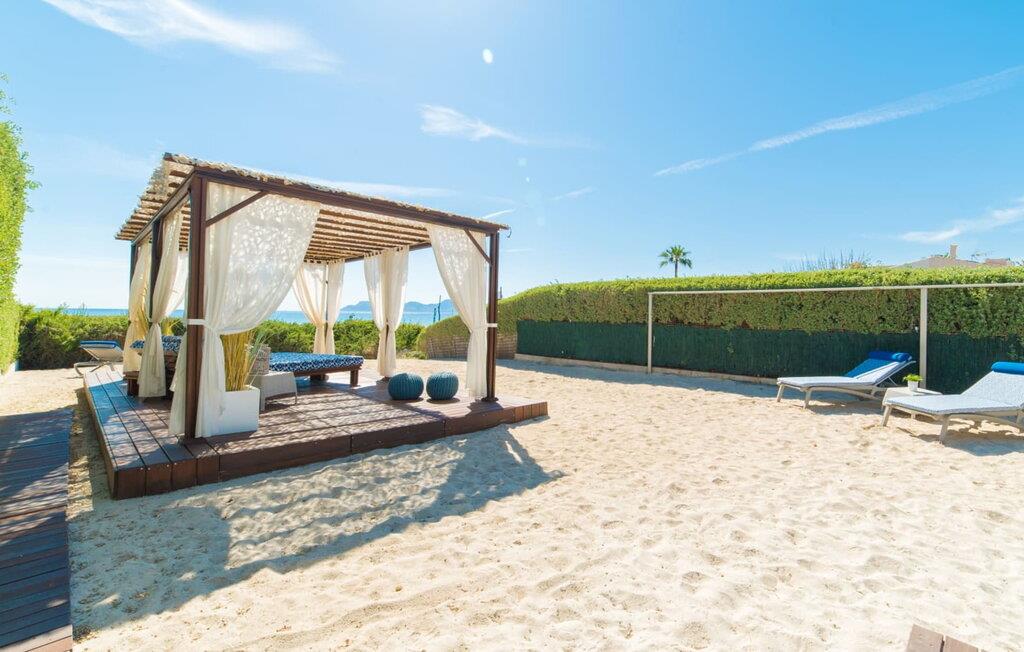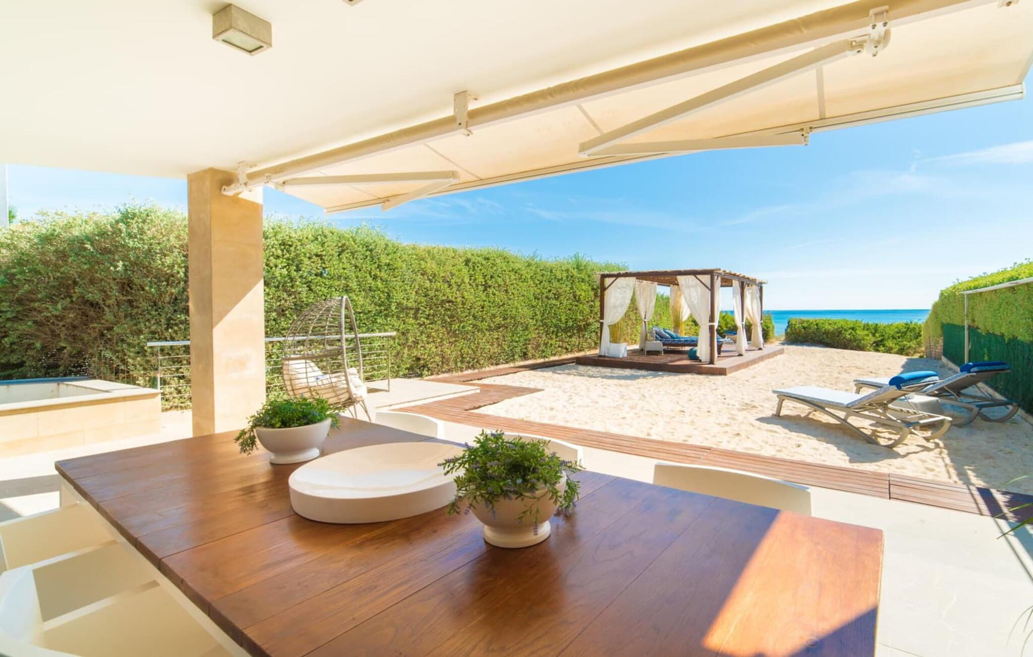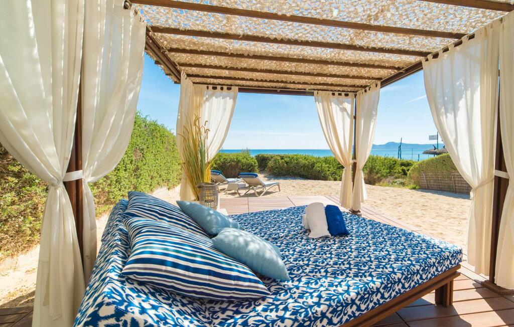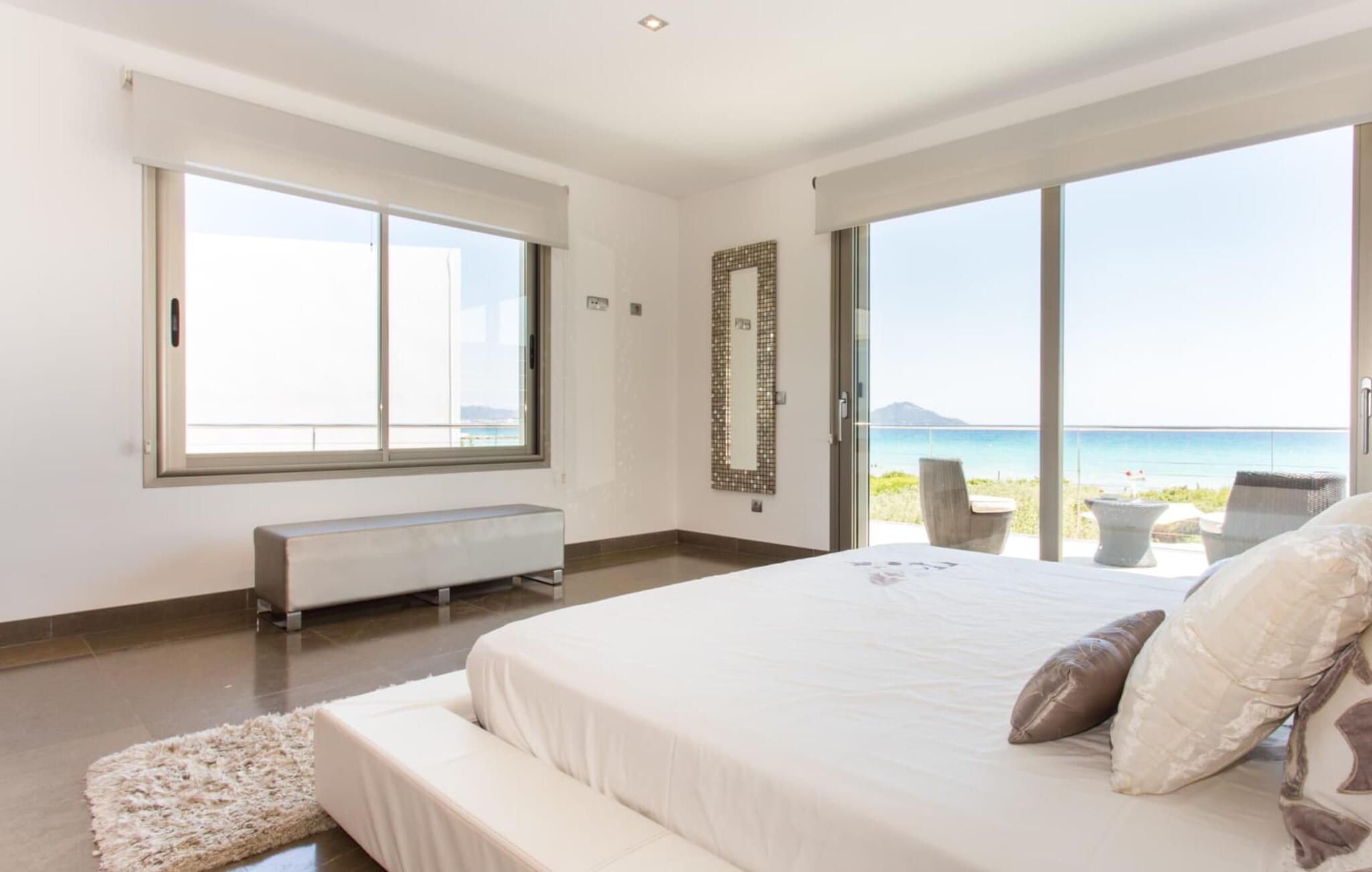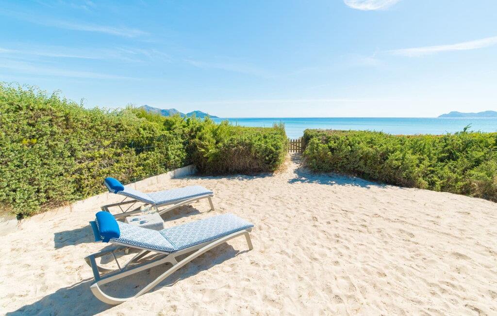 Du kan ikke være tættere på stranden på Mallorca end i villaen "Sa Platja". Den hvide sandstrand er bogstaveligt talt en del af jeres baghave. Herfra fører en kort sti over klitterne direkte til det flade, turkise vand i Playa de Muro på østkysten. I kan nyde de smukke solopgange enten fra jeres seng eller fra den storslåede liggestol i jeres strandhave. Nyd jeres måltider på den overdækkede terrasse ved huset. Det tilbyder en sensationel havudsigt. Om nødvendigt kan skyggeområdet udvides med en markise. Fra terrassen fører glasdøre ind til ferievillaens smagfulde og højkvalitets interiør. En lys, venlig stue venter jer i stueetagen. Det er åbent til spisestuen og luksuriøst udstyret køkken med ø og morgenmadsbar. Et af de tre hyggelige soveværelser og et badeværelse er også placeret på dette niveau. Ovenpå er der yderligere et soveværelse med dobbeltseng med en-suite badeværelse og et elegant master bedroom. Begge værelser har udgang til en solterrasse med smuk havudsigt. Huset er fuldt udstyret med aircondition og varme. I er også velkommen til at lave hjemmekontorarbejde, hvis det er nødvendigt. Der er en stabil WiFi-forbindelse og et fiberoptisk netværk. Fra villaen "Sa Platja" fører en kort sti over klitterne direkte til det flade, turkise vand i Playa de Muro på østkysten. Villaen ligger tæt på den 10 km lange sandbugt Alcúdia. Det er en del af et velholdt boligområde og byder på gode indkøbsmuligheder samt cocktailbarer og restauranter i umiddelbar nærhed.