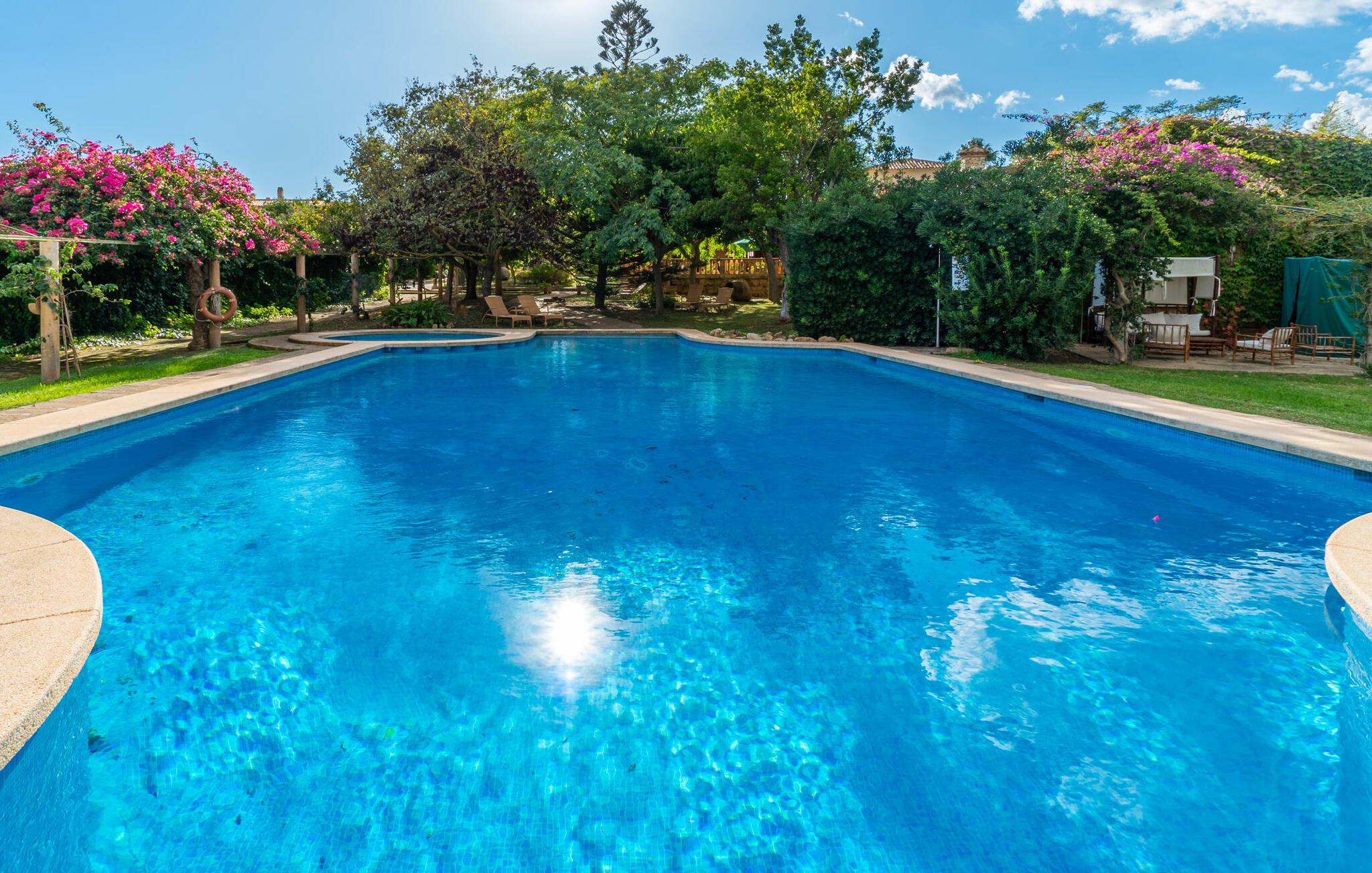En unik ro omgiver ejendommen, hvor lejligheden "Sa Posada d'Aumallia 32" ligger. Græsplæner, små stier og mange middelhavsplanter, herunder århundredgamle træer, præger området og giver altid luftig, naturlig skygge. Forskellige områder inviterer jer til at tilbringe afslappende timer udendørs: komfortable liggestole, lounge, spisebord og hyggelige siddepladser. Fra alle steder kan I nyde en vidunderlig udsigt over landskabet. Den 18 meter lange pool, som er omgivet af prydplanter og solbadeområder, lover en behagelig forfriskning. Hvis I kan lide sport, kan I bruge tennisbanen eller fitnesscentret. Til wellness-øjeblikke er der en omfattende spa med sauna og tyrkisk bad. I kan også bruge et alsidigt mødelokale efter aftale. Den rummelige lejlighed med en stor panoramaterrasse imponerer med sin klassiske elegance. En hyggelig opholdsstue med en komfortabel sovesofa, tv og spisebord samt et moderne tekøkken og selvfølgelig en stor seng og et tilhørende badeværelse med badekar og bruser. Denne lejlighed i det sydlige Mallorca er ideel til et roligt wellness-ophold. Lejligheden "Sa Posada d'Aumallia 32" er en del af "Aumallia Hotel & Spa", et charmerende landhotel med en rolig beliggenhed. Det er tæt på Porto Colom og golfbanen Vall d'Or. Det store område fuld af flair er ideelt til en afslappende ferie på Mallorca. Porto Colom-stranden og de berømte Dragon Caves kan nås på 10 minutter i bil.