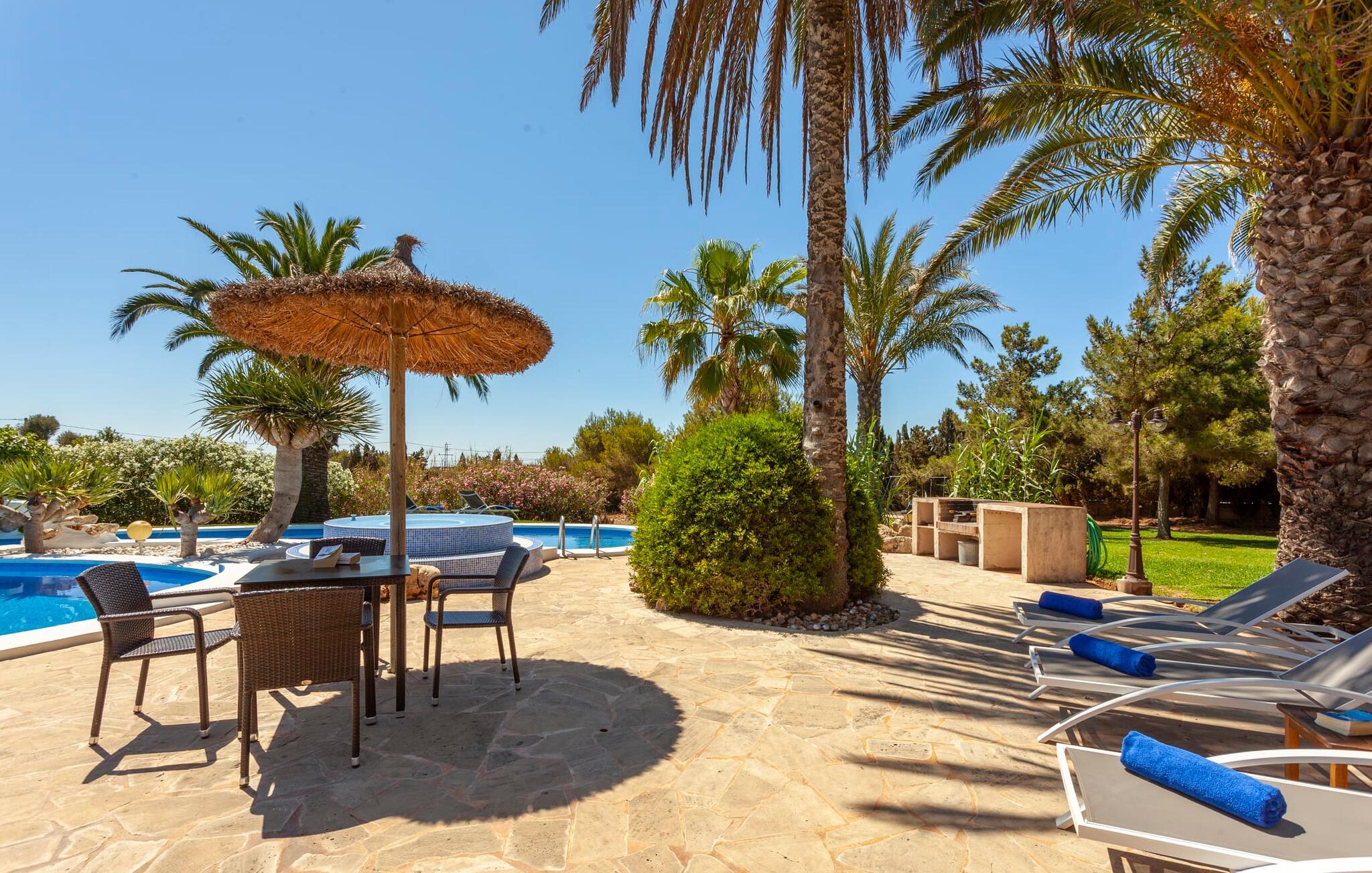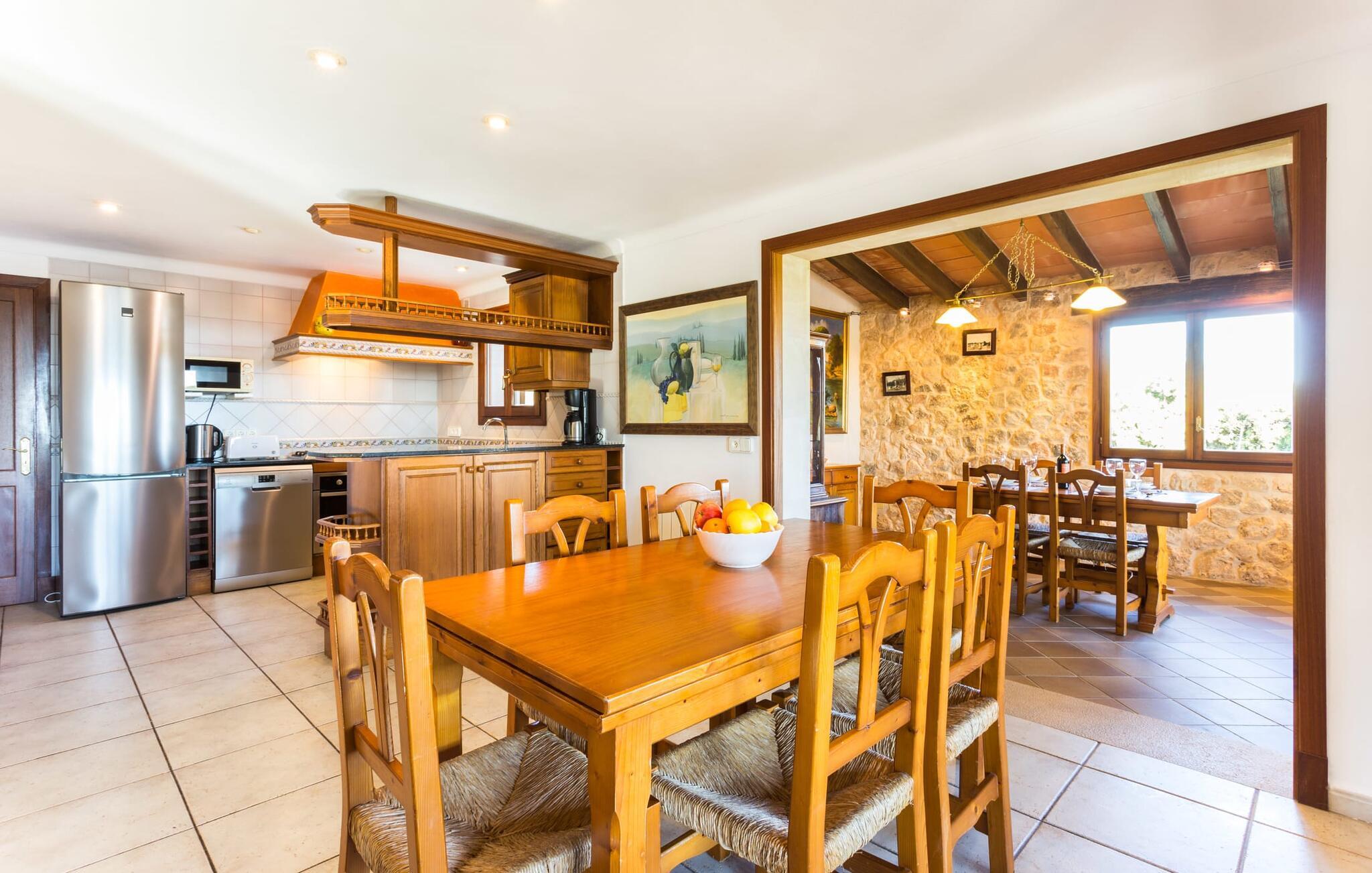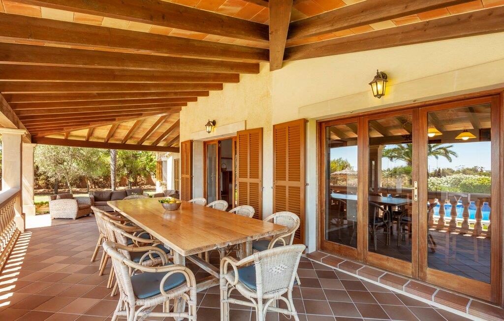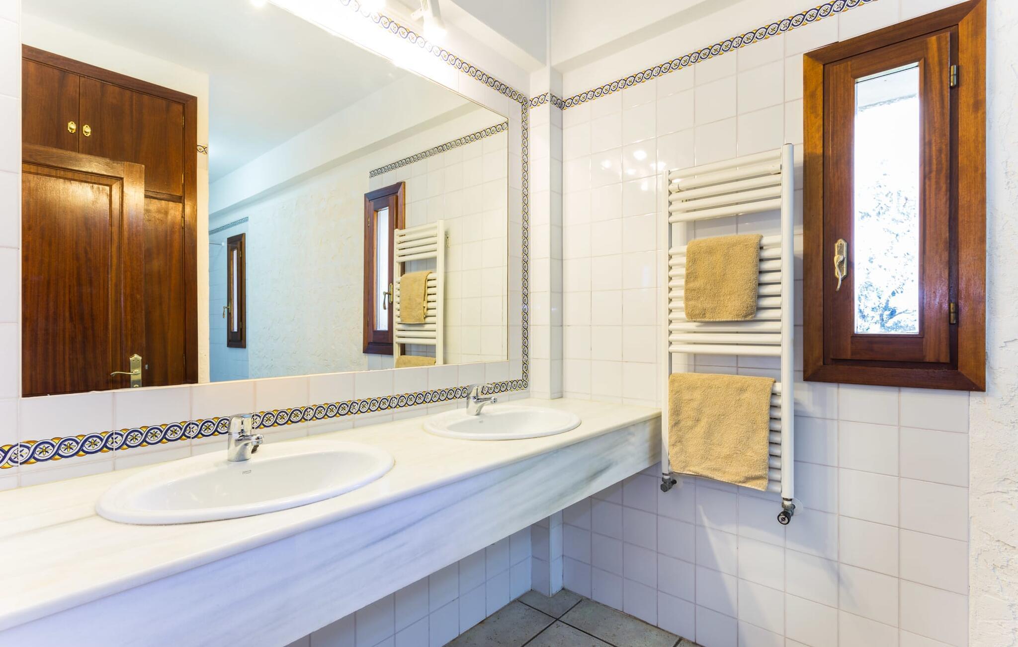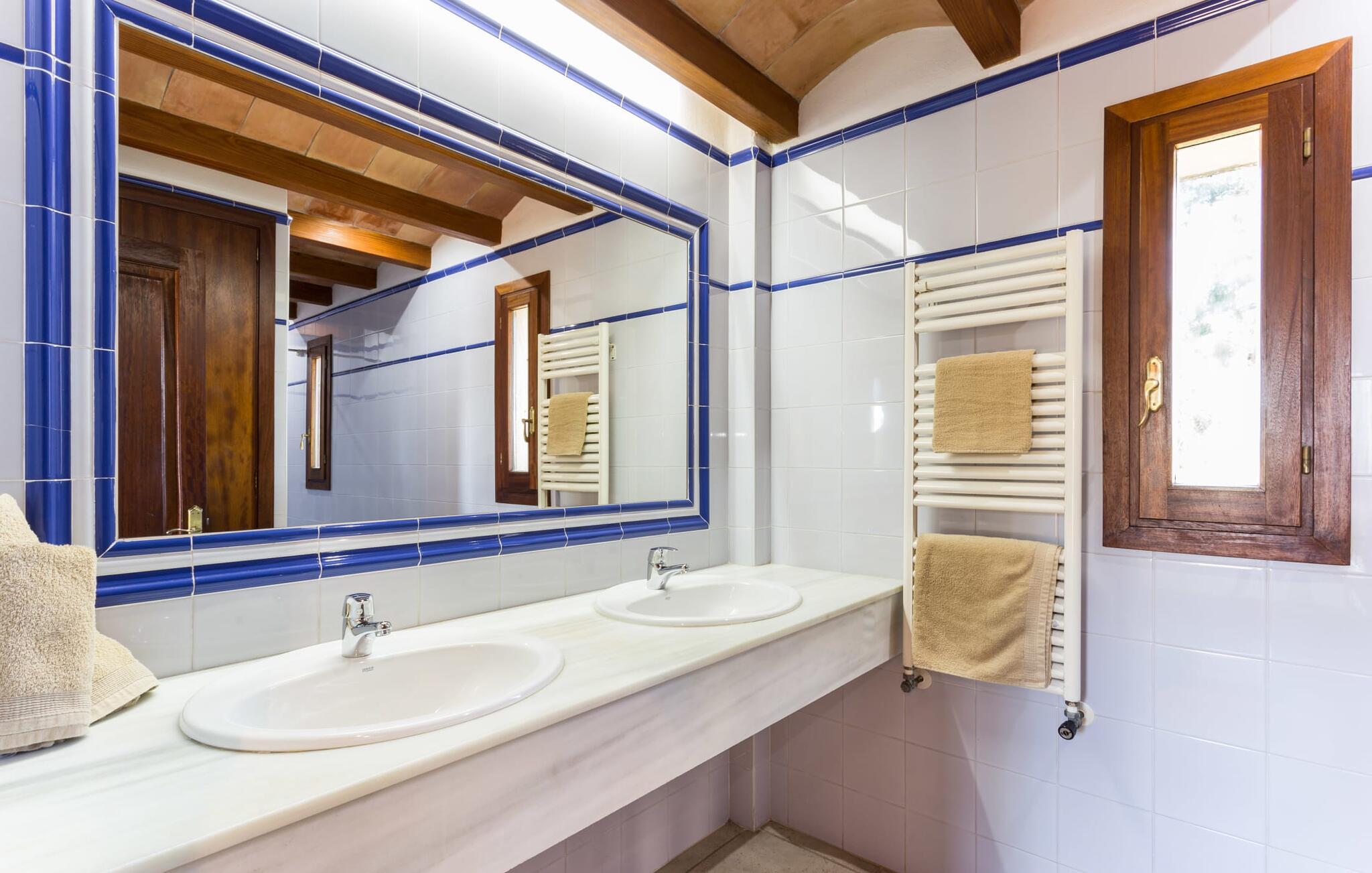 Her kan I virkelig nyde livet på landet: i den fremragende vedligeholdte, rummelige villa "Sa Tanca Nova" på en stor ejendom med imponerende palmer og et kærligt designet poolområde, der kan måle sig med et stjernehotel. Det sandfarvede hus med den særligt smukke overdækkede terrasse, hvorfra I har en fantastisk udsigt over haven, vil imponere jer i enhver henseende. Går I ned et par trin fra terrassen, befinder I jer ved den let skrånende pool, som glimter turkis i solen - og denne pool er alt andet end et kedeligt rektangel. Det har ikke kun et udendørs spabad, men det har også en cirkulær grundplan med en smuk lille ø i midten, samt en bro som et ekstra højdepunkt. Det er ikke kun børnene, der vil elske at svømme en omgang eller to her! Og hvis I ikke har lyst til en kølig forfriskning, kan I enten slappe af på en af de komfortable liggestole – eller spille en omgang bordtennis med jeres medrejsende ved husets bord. Så nyd frisklavede delikatesser fra murstensgrillen og en godnatdrink på de komfortable kurvestole på terrassen - og det er den perfekte afslutning på jeres dag! En rustik stil, smagfuldt kombineret med moderne elementer, indbydende, høj kvalitet - sådan kan hele interiøret i denne villa opsummeres. Lyse farver blev brugt i alle rum, suppleret med accenter af natursten og stilfuldt placeret kunst på væggene. Nogle smukke mørke træbjælker kan også ses på lofterne. I stueplan finder I udover entré og badeværelse det åbne køkken, der fører til spise- og opholdsafdelingen med god plads samt et hyggeligt diskret indrettet dobbeltværelse med et smart badeværelse. I stuen kan I nyde pejsens behagelige knitren fra den store sofa og se en spændende krimi om aftenen med et glas rødvin. Yderligere tre soveværelser, hver med deres eget moderne badeværelse, tilbyder retreater på øverste etage. "Sa Tanca Nova" er indlejret i det smukke middelhavslandskab i den sydlige del af øen. Dette gør jeres sommerhus til det perfekte udgangspunkt for lange gåture, vandreture eller cykelture gennem naturen. Vil I løbe ærinder eller bare slappe af på en hyggelig café, er det bedst at køre til den smukke naboby S'Horta, som kun ligger 3,4 km væk og har kun 1.000 indbyggere. Her er altid dejligt stille og afslappet – det bliver kun lidt livligere om lørdagen, hvor de lokale sælger frisk lokal frugt og grønt på det ugentlige marked. Der sker helt sikkert mere i Cala d'Or, kun 3,7 km væk, et typisk mallorcansk, charmerende feriested omkring "Golden Bay", der har givet den sit navn. Udover fantastiske strande for enhver smag - mange mindre bugter ligger meget tæt på hinanden - er der også masser af barer, restauranter, shoppingmuligheder og et pulserende natteliv. Et landsted lige ud af en billedbog: Villaen "Sa Tanca Nova" blev bygget midt i et smukt middelhavslandskab, der inviterer jer til at slappe af og slappe af. Den klassiske bygning med overdækket terrasse er placeret på en rummelig ejendom, hvor det specielle poolområde især skiller sig ud: det kølige vand strømmer her i cirkler, herunder en lille bro og et spabad. Den idylliske landsby S'Horta ligger kun 3,4 km væk, og stranden i Cala d'Or ligger kun 3,7 km væk. Bemærk venligst, at denne ejendom ikke accepterer ungdomsgrupper eller polterabender. En ungdomsgruppe på denne ejendom består af personer på 25 år eller derunder. Book ikke denne ejendom, hvis I er en ungdomsgruppe eller polterabend, da jeres reservation vil blive afvist, når den er booket, hvilket også kan være tilfældet ved ankomst til ejendommen eller under jeres ophold, og I vil ikke modtage en refusion. Aircondition er inkluderet i denne ejendom, men brug mellem kl. 20.00 og 8.00 er inkluderet i prisen. Valgfri brug af varme er inkluderet i prisen for 10 timer pr. dag i vintermånederne, hvorefter det betales kontant på stedet.