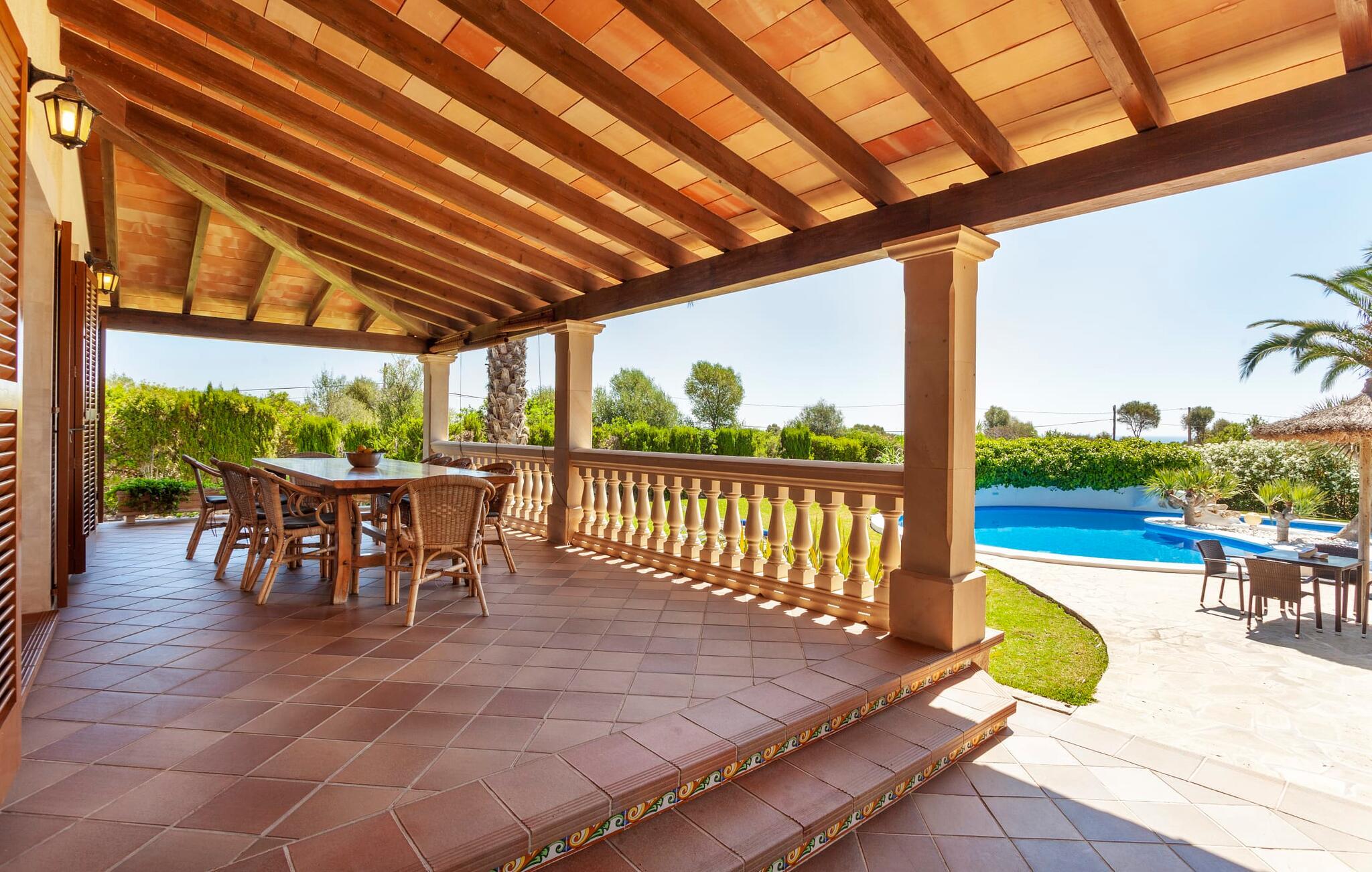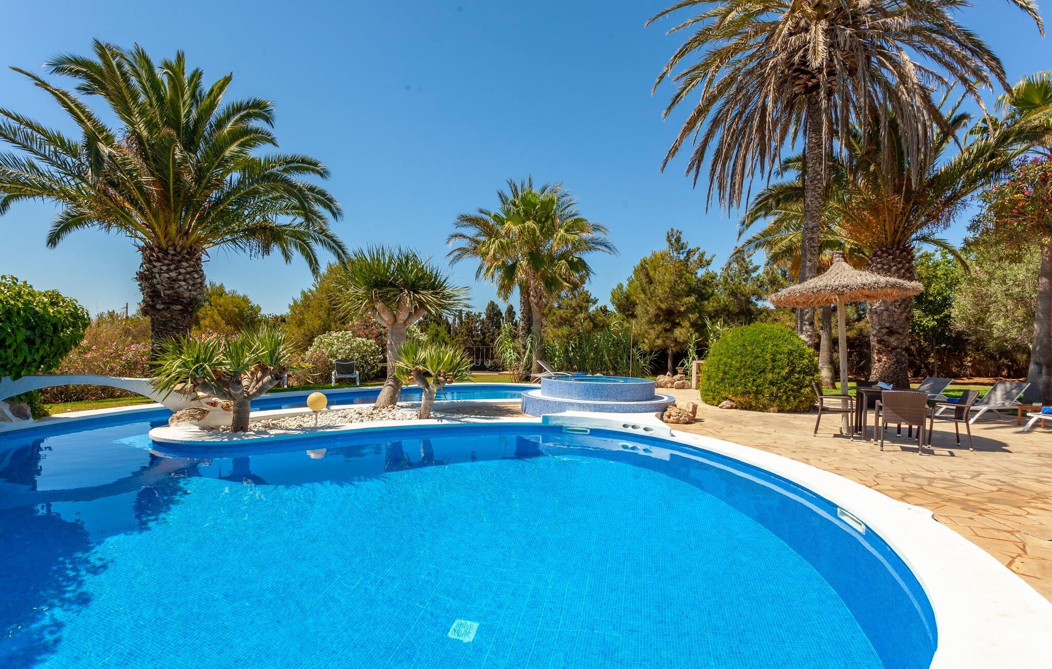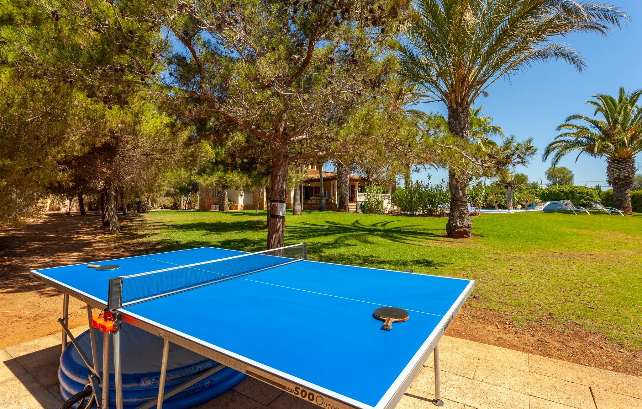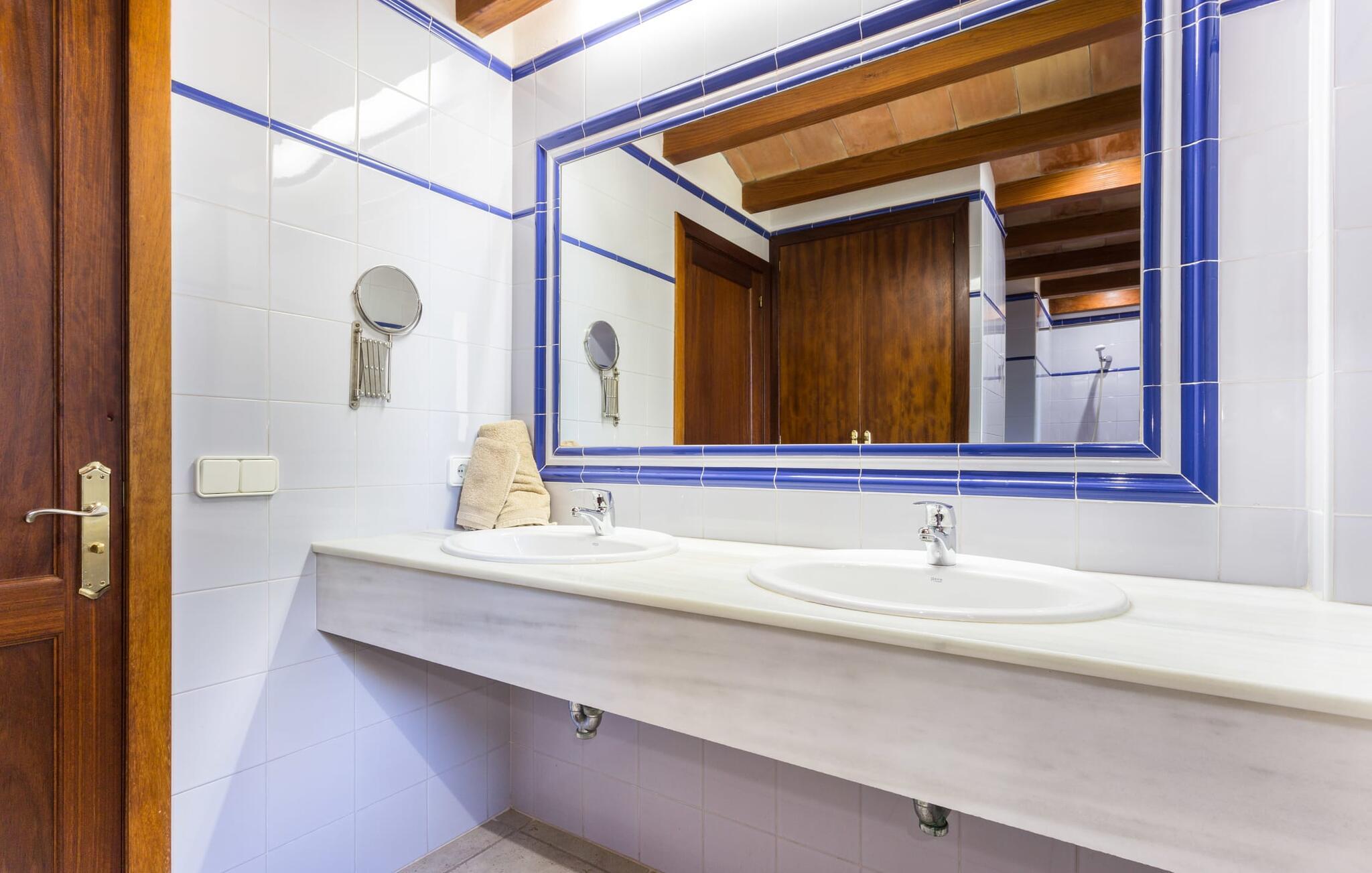 Her kan I virkelig nyde livet på landet: i den fremragende vedligeholdte, rummelige villa "Sa Tanca Nova" på en stor ejendom med imponerende palmer og et kærligt designet poolområde, der kan måle sig med et stjernehotel. Det sandfarvede hus med den særligt smukke overdækkede terrasse, hvorfra I har en fantastisk udsigt over haven, vil imponere jer i enhver henseende. Går I ned et par trin fra terrassen, befinder I jer ved den let skrånende pool, som glimter turkis i solen - og denne pool er alt andet end et kedeligt rektangel. Det har ikke kun et udendørs spabad, men det har også en cirkulær grundplan med en smuk lille ø i midten, samt en bro som et ekstra højdepunkt. Det er ikke kun børnene, der vil elske at svømme en omgang eller to her! Og hvis I ikke har lyst til en kølig forfriskning, kan I enten slappe af på en af de komfortable liggestole – eller spille en omgang bordtennis med jeres medrejsende ved husets bord. Så nyd frisklavede delikatesser fra murstensgrillen og en godnatdrink på de komfortable kurvestole på terrassen - og det er den perfekte afslutning på jeres dag! En rustik stil, smagfuldt kombineret med moderne elementer, indbydende, høj kvalitet - sådan kan hele interiøret i denne villa opsummeres. Lyse farver blev brugt i alle rum, suppleret med accenter af natursten og stilfuldt placeret kunst på væggene. Nogle smukke mørke træbjælker kan også ses på lofterne. I stueplan finder I udover entré og badeværelse det åbne køkken, der fører til spise- og opholdsafdelingen med god plads samt et hyggeligt diskret indrettet dobbeltværelse med et smart badeværelse. I stuen kan I nyde pejsens behagelige knitren fra den store sofa og se en spændende krimi om aftenen med et glas rødvin. Yderligere tre soveværelser, hver med deres eget moderne badeværelse, tilbyder retreater på øverste etage. "Sa Tanca Nova" er indlejret i det smukke middelhavslandskab i den sydlige del af øen. Dette gør jeres sommerhus til det perfekte udgangspunkt for lange gåture, vandreture eller cykelture gennem naturen. Vil I løbe ærinder eller bare slappe af på en hyggelig café, er det bedst at køre til den smukke naboby S'Horta, som kun ligger 3,4 km væk og har kun 1.000 indbyggere. Her er altid dejligt stille og afslappet – det bliver kun lidt livligere om lørdagen, hvor de lokale sælger frisk lokal frugt og grønt på det ugentlige marked. Der sker helt sikkert mere i Cala d'Or, kun 3,7 km væk, et typisk mallorcansk, charmerende feriested omkring "Golden Bay", der har givet den sit navn. Udover fantastiske strande for enhver smag - mange mindre bugter ligger meget tæt på hinanden - er der også masser af barer, restauranter, shoppingmuligheder og et pulserende natteliv. Et landsted lige ud af en billedbog: Villaen "Sa Tanca Nova" blev bygget midt i et smukt middelhavslandskab, der inviterer jer til at slappe af og slappe af. Den klassiske bygning med overdækket terrasse er placeret på en rummelig ejendom, hvor det specielle poolområde især skiller sig ud: det kølige vand strømmer her i cirkler, herunder en lille bro og et spabad. Den idylliske landsby S'Horta ligger kun 3,4 km væk, og stranden i Cala d'Or ligger kun 3,7 km væk. Bemærk venligst, at denne ejendom ikke accepterer ungdomsgrupper eller polterabender. En ungdomsgruppe på denne ejendom består af personer på 25 år eller derunder. Book ikke denne ejendom, hvis I er en ungdomsgruppe eller polterabend, da jeres reservation vil blive afvist, når den er booket, hvilket også kan være tilfældet ved ankomst til ejendommen eller under jeres ophold, og I vil ikke modtage en refusion. Aircondition er inkluderet i denne ejendom, men brug mellem kl. 20.00 og 8.00 er inkluderet i prisen. Valgfri brug af varme er inkluderet i prisen for 10 timer pr. dag i vintermånederne, hvorefter det betales kontant på stedet.