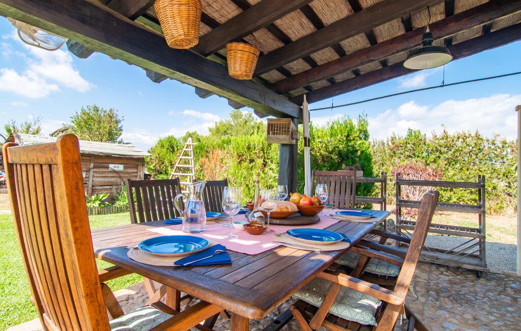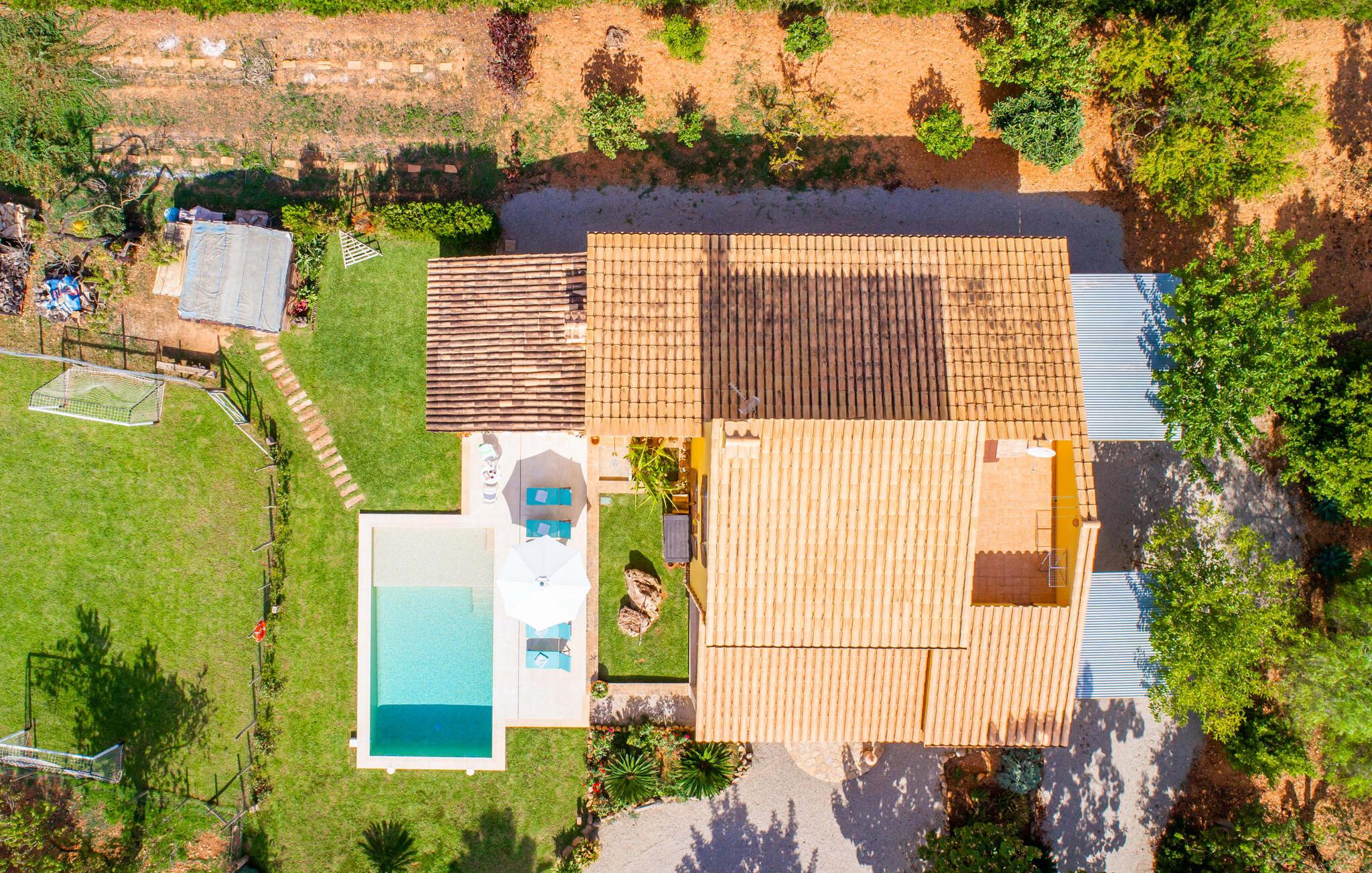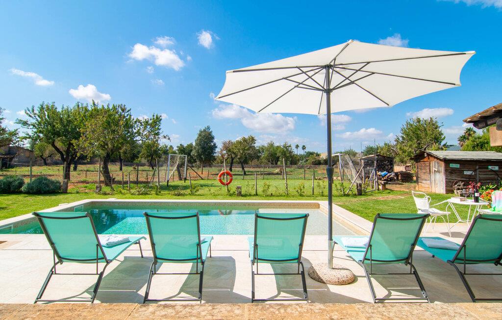 I en venlig, solrig gul og med brune træskodder rejser villaen "Sa Tanqueta" sig op i den smukke blå himmel over Mallorcas landlige centrum. Huset er beliggende på en velholdt ejendom på over 5.000 m², som byder på en masse variation, især for familier med børn. Mens de voksne sidder på den overdækkede terrasse eller slapper af på liggestolene, drømmer og kigger ud i det fjerne, kan de små lege i det skrånende bassin eller på den tilstødende fodboldbane og derefter slippe dampen ud på gyngen. Senere kan alle samles i det veludstyrede udekøkken ved siden af poolen, indrammet af gardiner, der svajer i vinden, og nyde de frisklavede lækkerier på grillen – en perfekt dag for store og små: Det er altså hvordan interiøret er "Sa Tanqueta" kan bedst beskrives - et smukt, hyggeligt midlertidigt hjem. Villaen imponerer med sin landlige, rustikke atmosfære, dygtigt kombineret med moderne møbler og smukke dekorative detaljer. I stueetagen finder I den rummelige spisestue, herunder et stort spisebord i træ med tilhørende komfortable stole, samt det hyggelige køkken, hvor endnu et bord venter til fælles måltider. Stueetagen rummer desuden tre soveværelser med dobbeltsenge, hvoraf det ene er børneværelse med køjeseng og eget skrivebord, samt to badeværelser, der matcher husets stil, hvoraf det ene har badekar. En let buet trappe fører op til overetagen, hvor der er stue med sofa, lænestol, pejs og fjernsyn. For at sikre, at I har et sted til jeres aftensnacks og et glas ø-vin, har dette værelse også et større glas sofabord. I er i centrum af øen, det såkaldte "Granary of Mallorca", hvilket betyder: vidunderlige endeløse enge, marker, mandel- og olivenlunde, ideel til at gå, cykle, slukke og slappe af. Men den nærmeste by er heller ikke langt væk: Inca, bedst kendt for sine læderprodukter, ligger kun 3 km fra jeres bolig og kan hurtigt nås med lejebil. Her finder I alt hvad I skal bruge til jeres daglige behov og kan tage på en eller to indkøbsture. I bør ikke gå glip af et besøg på det ugentlige marked, som finder sted hver torsdag. Her finder I ikke kun de berømte lædervarer, men også mange andre interessante markedsboder. De talrige kælderrestauranter med en traditionel mallorcinsk atmosfære og lækre lokale retter er også meget populære; For en dag på stranden er det bedst at køre de 28 km til den mangfoldige bugt Alcúdia, som byder på forskellige strandstrækninger for enhver smag. Den solgule villa “Sa Tanqueta” ligger midt i et smukt middelhavslandskab, uden umiddelbare naboer og alligevel behageligt tæt på byen. På den familievenlige, rummelige ejendom - udover poolen, er der også græsplæner, fodboldmål og en gynge til børnene - kan I nyde absolut fred. For dagligvarer, restauranter og shopping kan I køre 3 km til Inca, den tredjestørste by på øen. De nærmeste strande, herunder Alcúdia-bugten og Playa de Muro, ligger cirka 28 km væk.