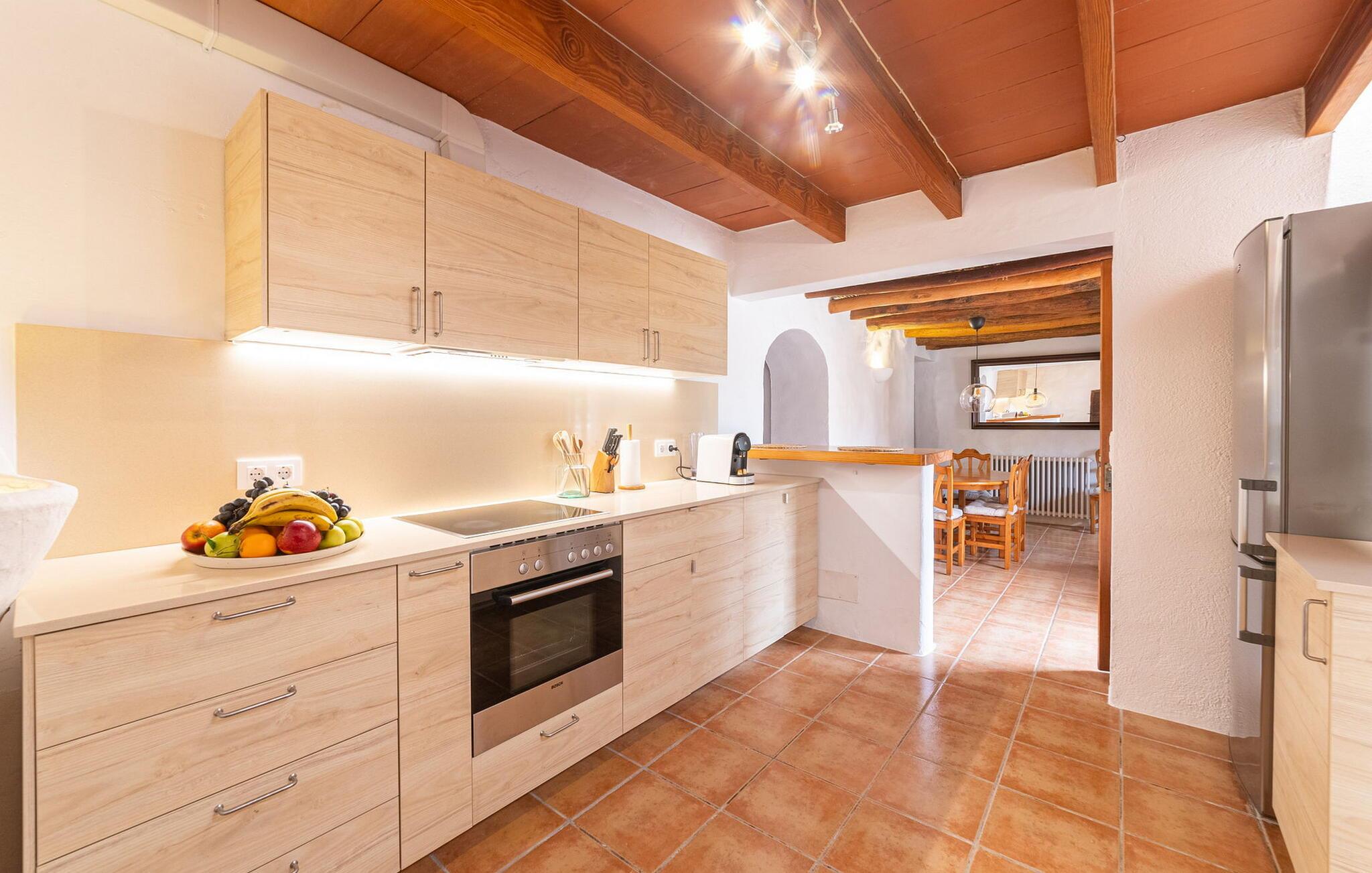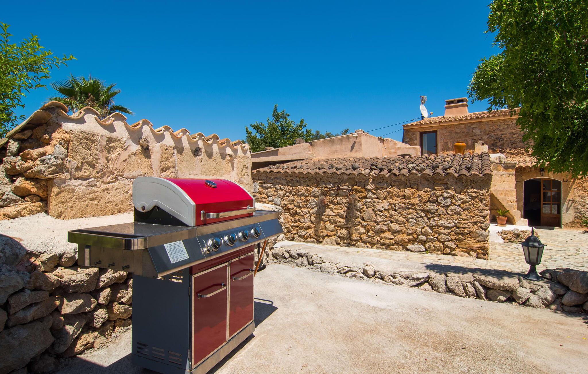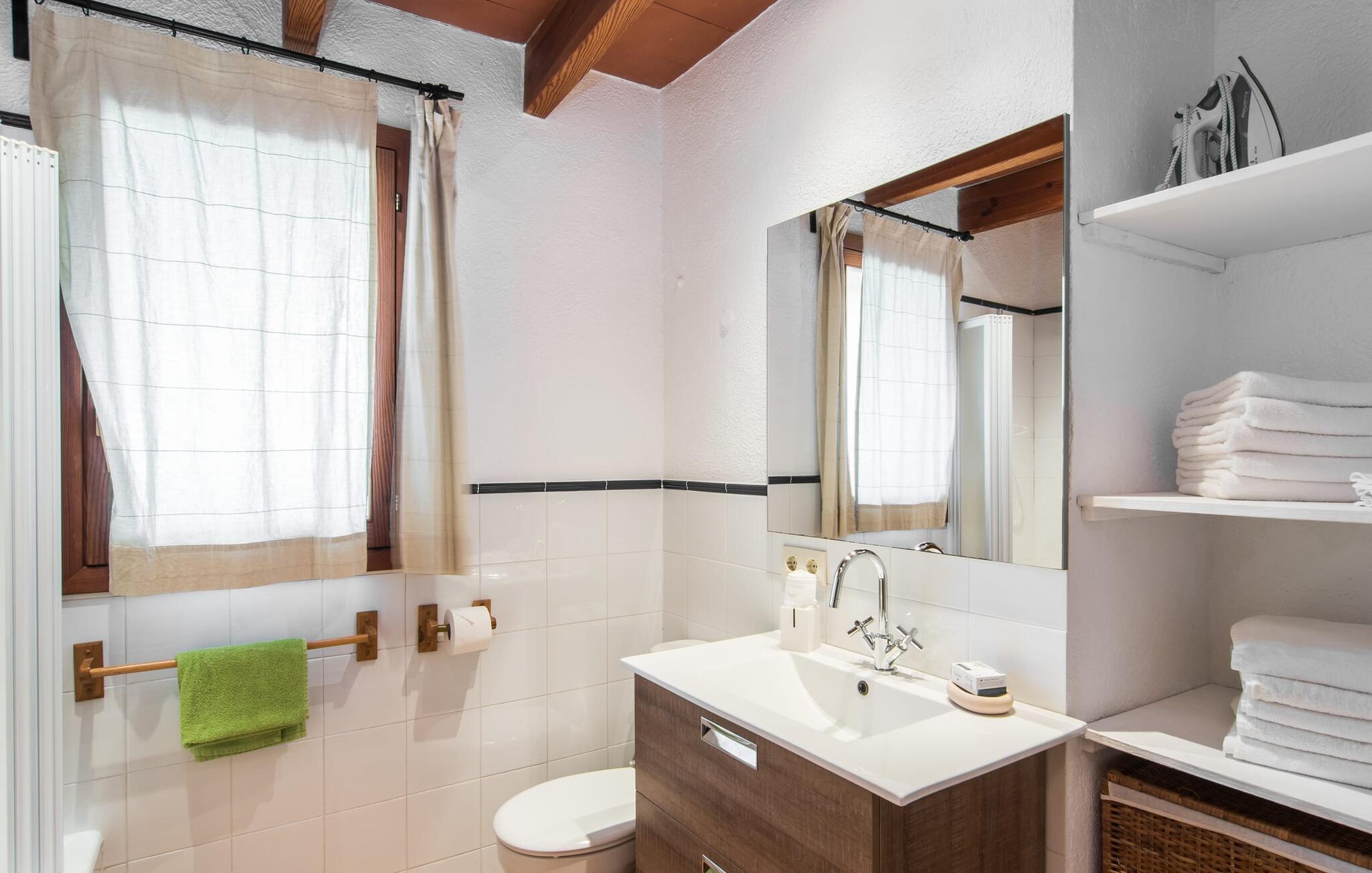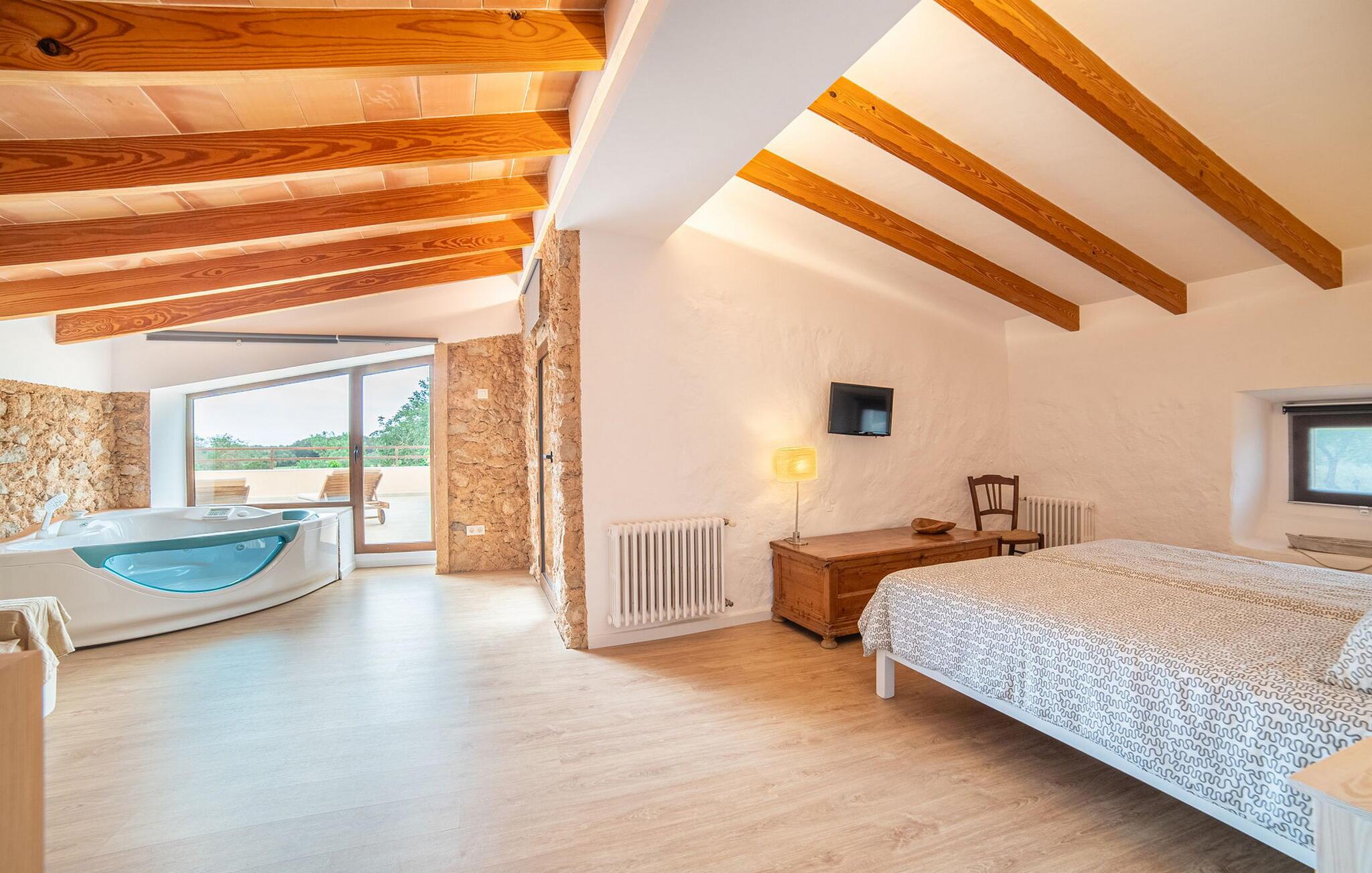 I husets stueetage finder I et stort værelse med åbent køkken og spisebord. De smukke lyse møbler harmonerer perfekt med de hvide vægge i denne rustikke villa, som med sine tagbjælker alene er ideel til folk, der længes efter en autentisk landlig følelse. Køkkenet er fuldt udstyret og moderne - her finder I alle de bekvemmeligheder, som en moderne husholdning har som vaskemaskine og opvaskemaskine, så alt er gjort hurtigt og I kan hellige jer fuldt ud afslapning, grunden til at komme til Mallorca. Fra dette område er der adgang til de tre soveværelser - hvoraf det ene er ret lille og ideelt som enkeltværelse - og et af badeværelserne. Fra dette værelse er der også adgang til den hyggelige lounge med to store sofaer, hvor gæsterne kan varme sig ved bålet eller slappe af, mens de ser tv. Måske er der endda en titel på det lille bibliotek, der tiltaler jer? En trætrappe fører jer til første sal, hvor der udover to badeværelser med bruser venter jer et særligt charmerende soveværelse: Dette værelse har også to sofaer og eget fjernsyn. Indgangen til dette rum er ret lav, så man skal bukke sig ned for at komme ind. Folk plejede at være meget mindre, end de er i dag! Dette soveværelse har også direkte udgang til førnævnte hævet terrasse, hvorfra en stenterrasse fører ned til pladsen foran huset.