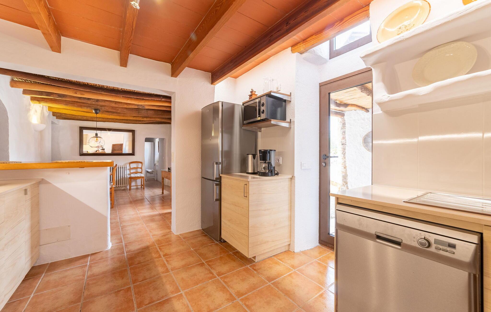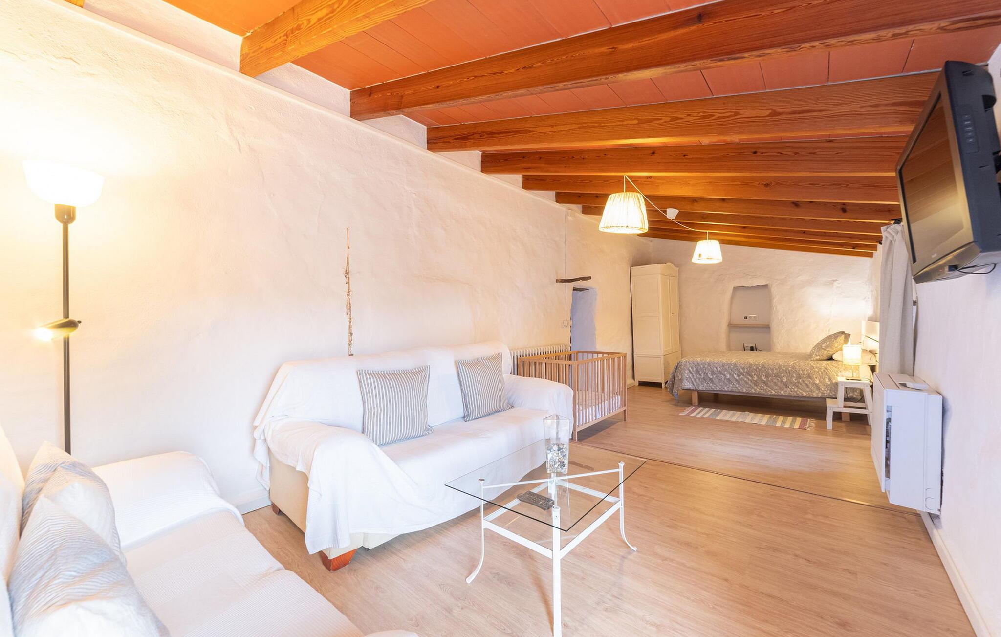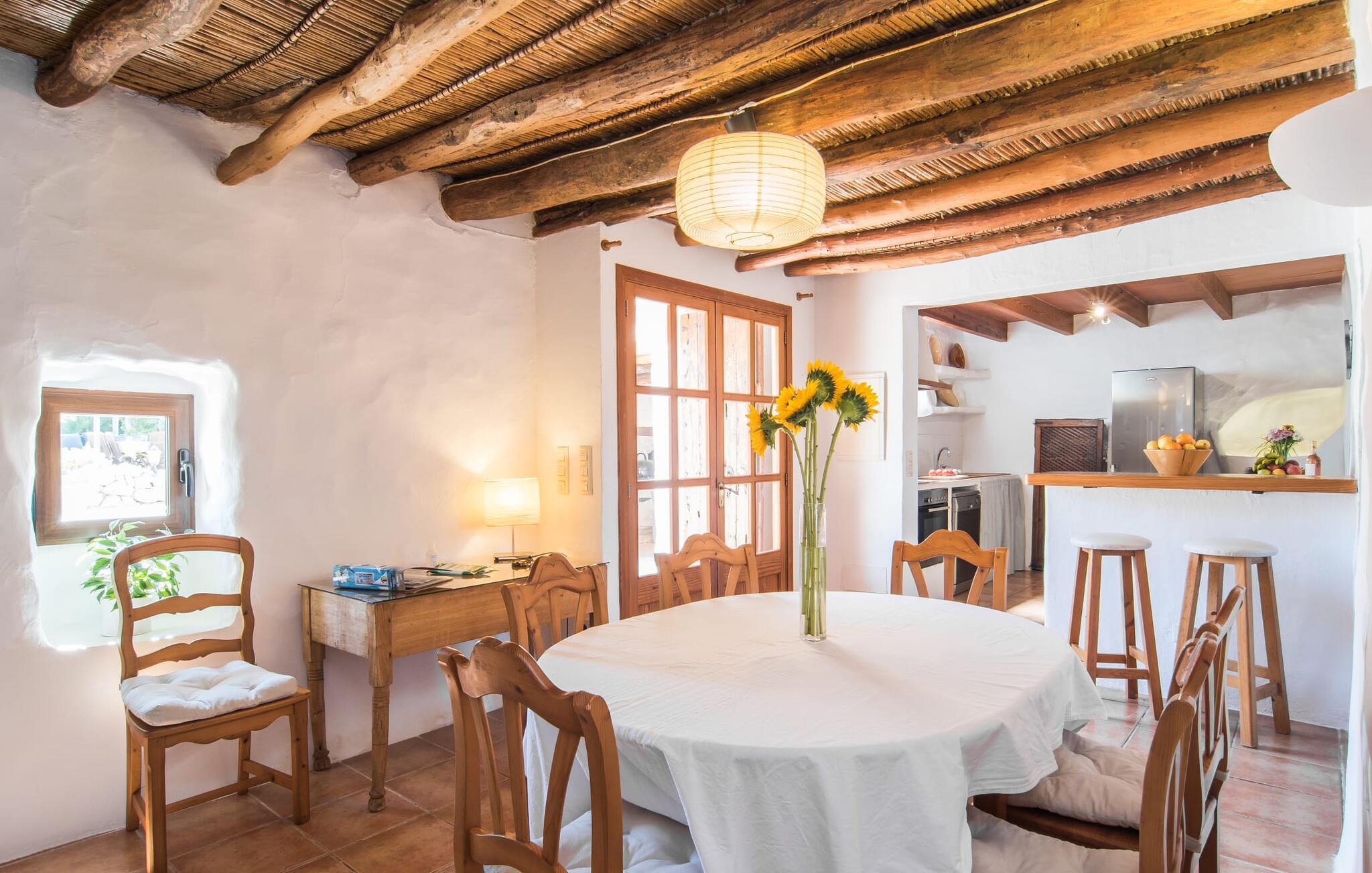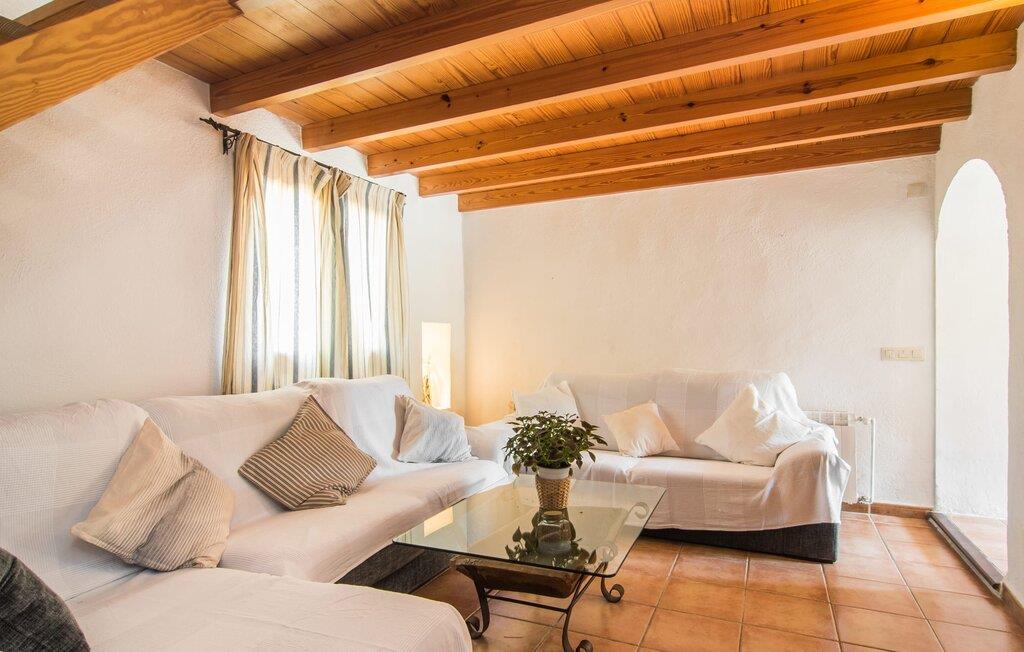 I husets stueetage finder I et stort værelse med åbent køkken og spisebord. De smukke lyse møbler harmonerer perfekt med de hvide vægge i denne rustikke villa, som med sine tagbjælker alene er ideel til folk, der længes efter en autentisk landlig følelse. Køkkenet er fuldt udstyret og moderne - her finder I alle de bekvemmeligheder, som en moderne husholdning har som vaskemaskine og opvaskemaskine, så alt er gjort hurtigt og I kan hellige jer fuldt ud afslapning, grunden til at komme til Mallorca. Fra dette område er der adgang til de tre soveværelser - hvoraf det ene er ret lille og ideelt som enkeltværelse - og et af badeværelserne. Fra dette værelse er der også adgang til den hyggelige lounge med to store sofaer, hvor gæsterne kan varme sig ved bålet eller slappe af, mens de ser tv. Måske er der endda en titel på det lille bibliotek, der tiltaler jer? En trætrappe fører jer til første sal, hvor der udover to badeværelser med bruser venter jer et særligt charmerende soveværelse: Dette værelse har også to sofaer og eget fjernsyn. Indgangen til dette rum er ret lav, så man skal bukke sig ned for at komme ind. Folk plejede at være meget mindre, end de er i dag! Dette soveværelse har også direkte udgang til førnævnte hævet terrasse, hvorfra en stenterrasse fører ned til pladsen foran huset.