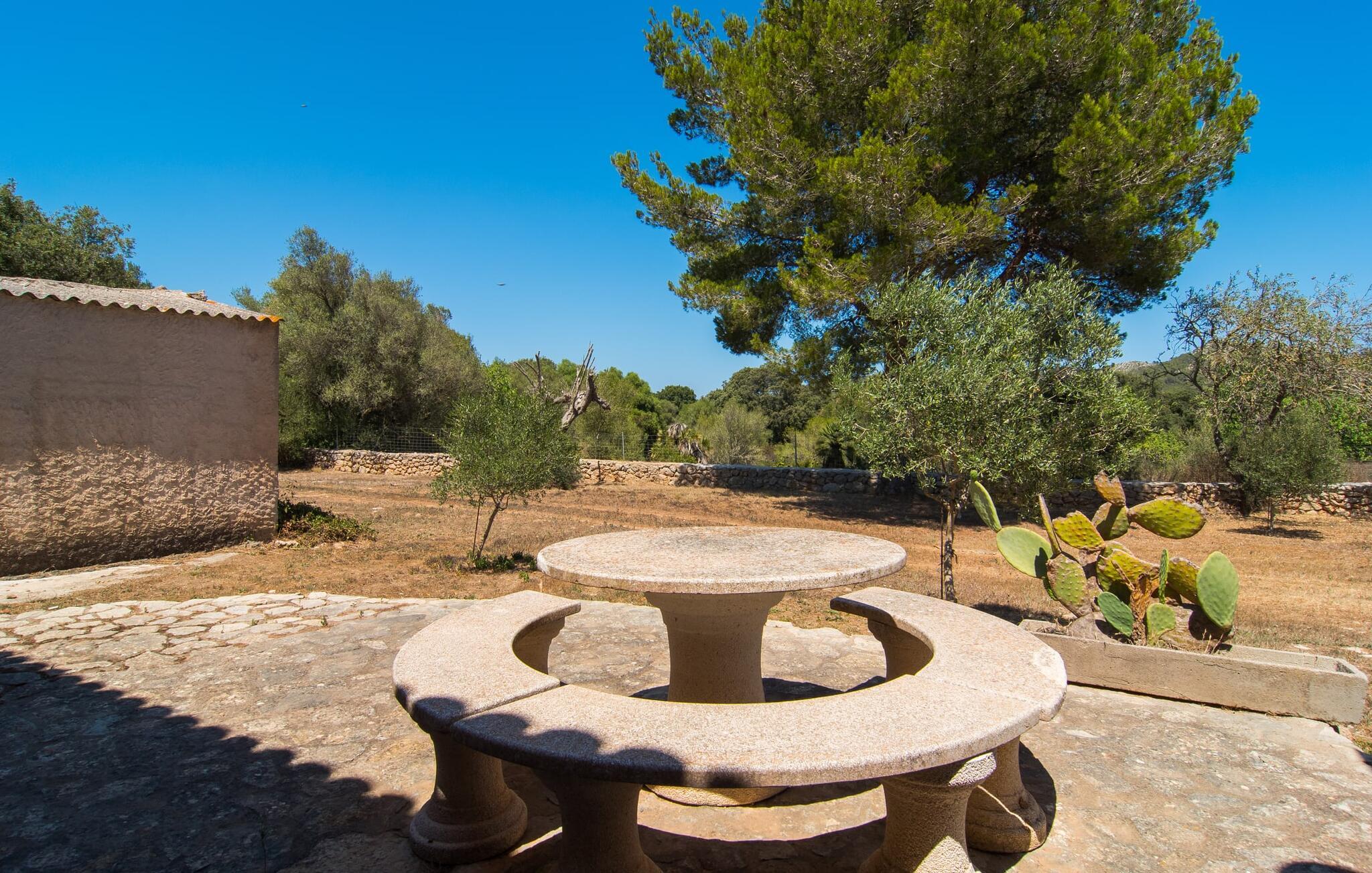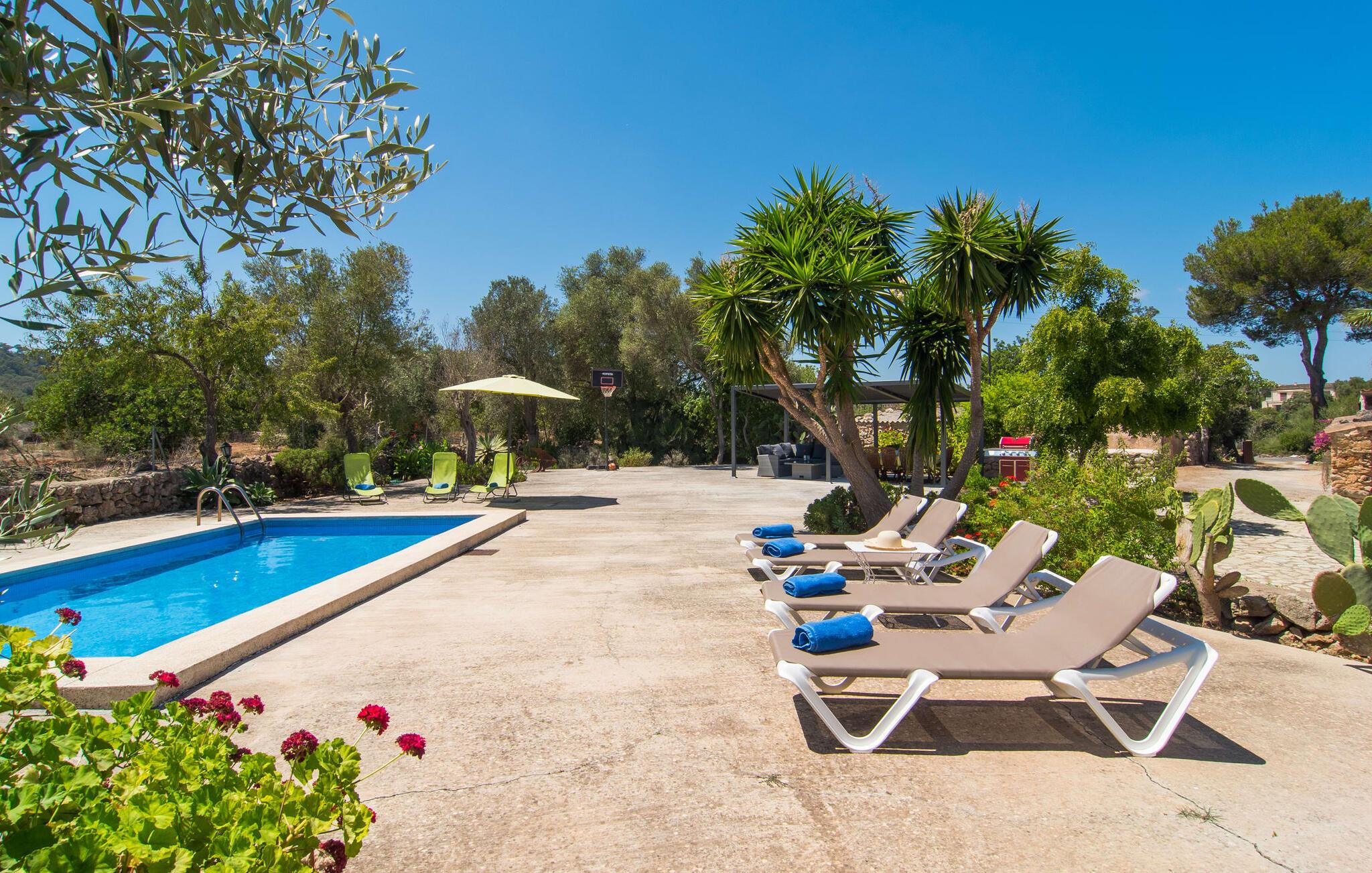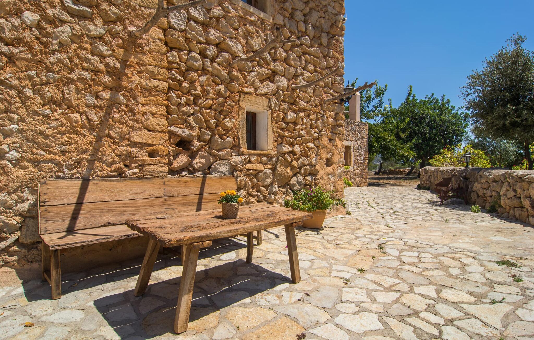 Har I altid drømt om at sove under stjernerne? Så er villaen "Sa Torre de Canyamel" det rigtige sted for jer! Det skønne udendørsområde har den store fordel, at I takket være de mange træer, palmer og kaktusser er i godt selskab, når I bruger udendørssengen en lun aften. Øvinden blæser bestemt ikke så hårdt, at den blæser jer omkuld, som den gjorde i en af Theodor Storms børnehistorier. Det venlige klima er trods alt en af hovedårsagerne til, at en storslået have som denne er et vigtigt kriterium for denne villa: Her kan I boltre jer i poolen lige så meget, I vil, beundre museumsploven, som... har kom fra svundne dage i Snik ind i haven eller brug de hyggelige siddepladser til en hyggelig snak. Særligt attraktivt og typisk for de naturlige grundakkorder, der definerer denne villas karakter, er siddeområdet, hvis træoprindelse stadig tydeligt ses. Der er endda en indbygget grill, hvor I kan tilberede delikatesser beskyttet under en pergola med bambustag og finde alt, hvad I skal bruge til at servere maden. Lille sidestentrappe fører til det lidt højere terrasseområde. Basketkurven giver de mindste mulighed for at slippe dampen ud, mens de spiller. På bænkene foran fincafacadens smukke, landlige murværk kan I lade den varme eftermiddagssol skinne på jeres ansigter.