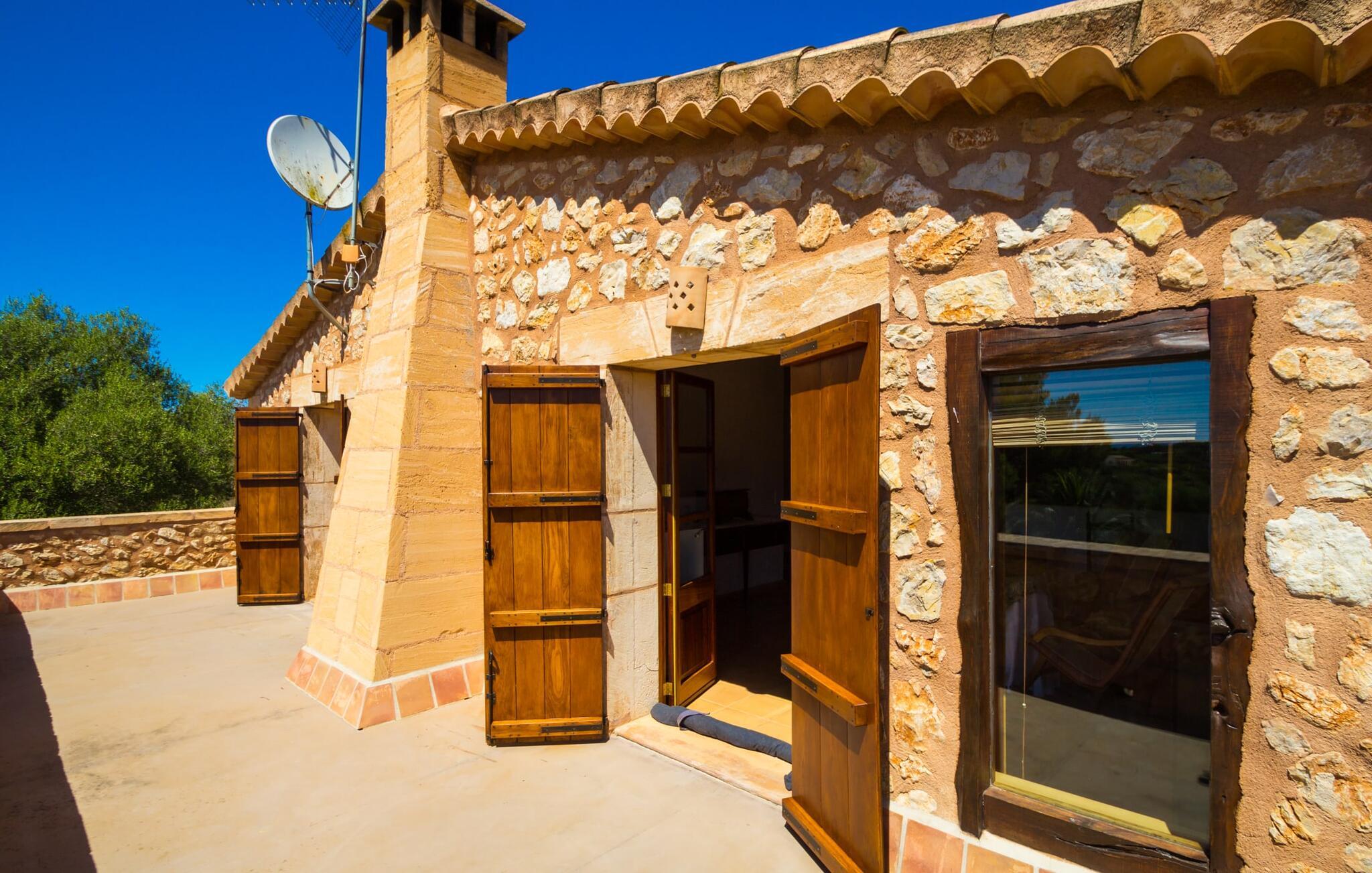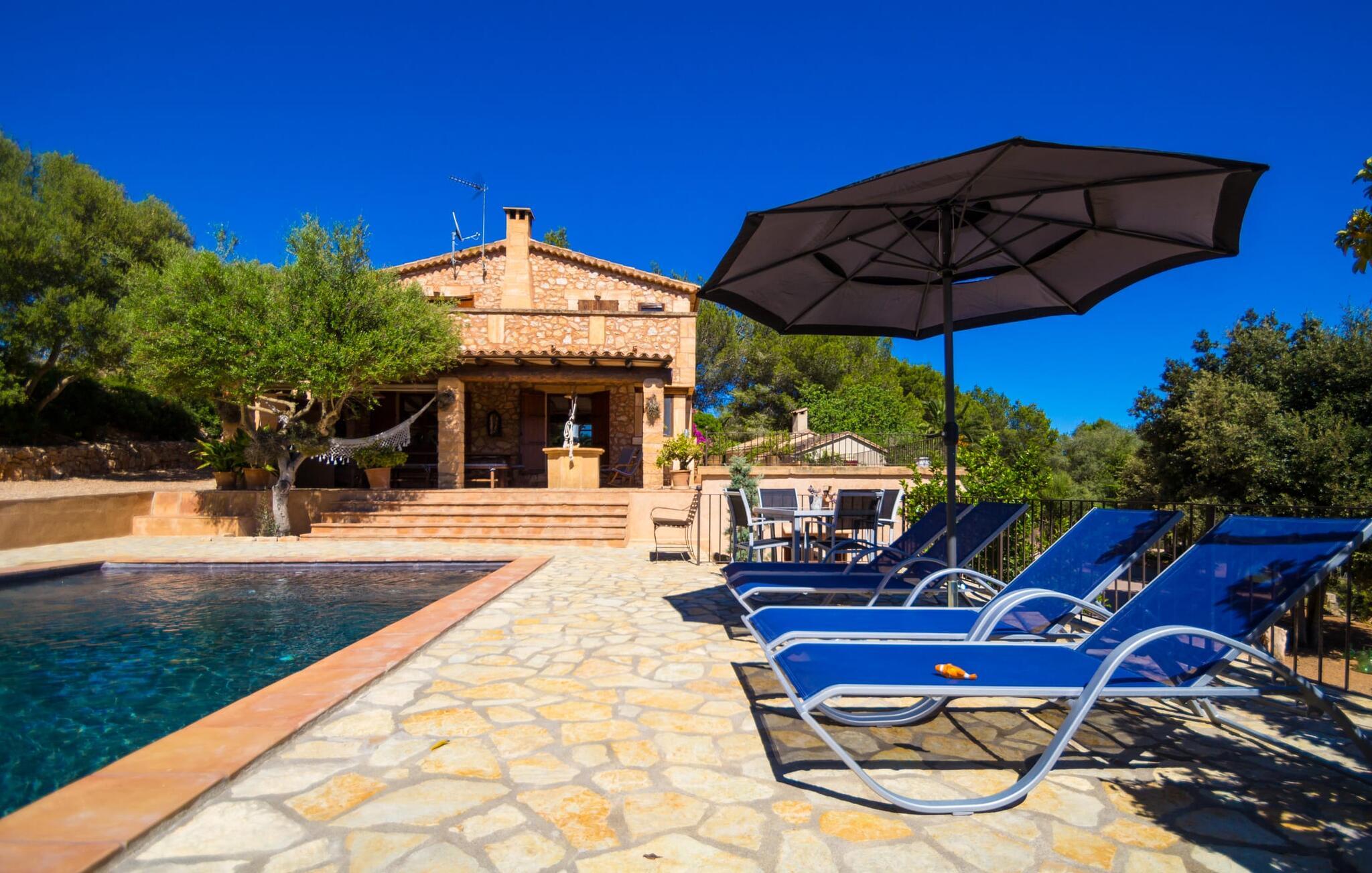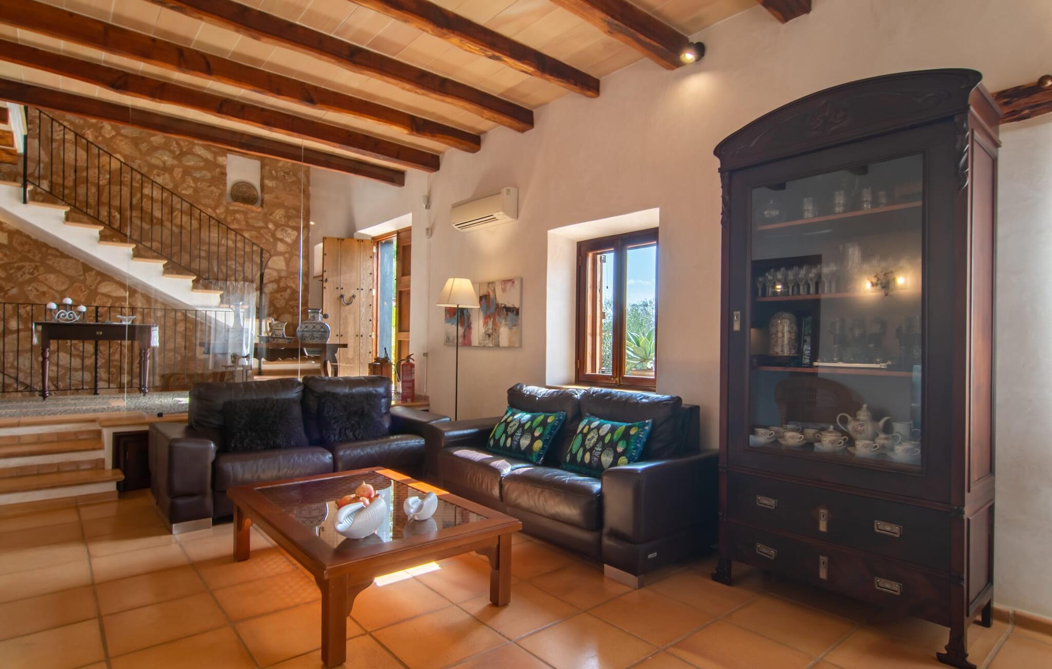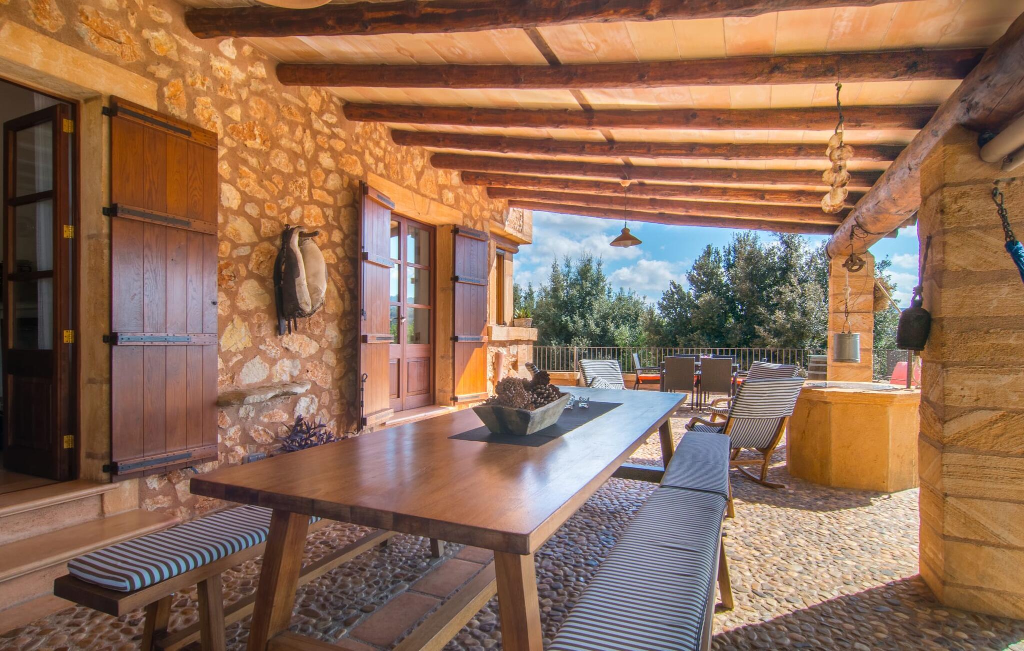 Bemærk - dette er en ejendom for elskere. For elskere af god smag og levende æstetik, der vil bemærke fra første øjeblik, de træder ind i ejendommen, at denne villa opfylder deres behov. Det smukke område er præget af en helt speciel stemning; Den er designet, så den omgiver huset som en meget smuk have med frodige træer og emmer af en hyggelig idyl. Blomster og grønne planter i bede, små vægge, terrassearealer på adskilte plan og individuelle dekorative stykker skaber et indbydende helhedsbillede. Udendørsområdets virkelige blikfang er naturligvis den imponerende pool med en længde på 12 m. Den har trapper for meget behagelig adgang og er stemningsfuldt oplyst om natten. Solterrassen, belagt med natursten, ligger lige ved siden af poolen; De komfortable liggestole inviterer jer til at slappe af af hjertens lyst under middelhavshimlen. De to medfølgende parasoller beskytter jer mod overdreven UV-stråling. Andre indbydende siddemuligheder på den store terrasse omfatter sofaen og det lille bord, som kan rumme middag for op til fire personer. Terrassen, designet med flodsten, byder ikke kun på masser af siddepladser, men også en sensationelt smuk udsigt over poolområdet og videre. Hvis I har lyst, skal I bare slappe af i hængekøjen og lade blikket vandre i det fjerne. Grillen inviterer jer til at nyde solide grillaftener, hvor I kan nyde de udsøgte regionale specialiteter, som I måske har købt på markedet tidligere på dagen. Den skønne altan på øverste etage giver endnu en mulighed for uforstyrret solbadning. Det er simpelthen skønt at sidde her ved solopgang eller solnedgang og nyde den fantastiske udsigt. Fra terrassen i stueplan kommer I ind i huset gennem to dobbeltdøre. Denne indgang fører til det store køkken-alrum, som byder på et behageligt rum til at blive hængende og tilberede og nyde måltider sammen. Køkkenet er rummeligt nok til også at rumme et stort solidt spisebord, der kan rumme op til otte personer til middag. Det moderne køkken er let at rengøre og fuldt udstyret, inklusive en filterkaffemaskine og elkedel. En stor gang, som kan lukkes med en glasskydedør, fører til den hyggelige stue. Forskellige komfortable sofaer og lænestole giver jer mulighed for at slappe af og måske ikke gøre noget i et stykke tid. De massive synlige bjælker udstråler en hjemlig og rustik atmosfære og inviterer jer til at blive hængende. Rent praktisk kan pejsen også bruges og ses fra spise- og opholdsstue. I den kølige årstid kan I finde jer tilpas ved den knitrende pejs og varme jer op, mens I kigger ind i de dansende flammer. Tre brede trin fører fra opholdsrummet ind i gangen og opgangen, der gør et herskabeligt indtryk med sin naturstensvæg og markante støttepiller. Dobbeltværelserne formidler en elegant charme og imponerer med lyse farver, der er dygtigt kombineret med nogle førsteklasses kontraster. Badeværelserne med dagslys imponerer med deres meget individuelle, funktionelle og moderne design. De smukkeste strande på Mallorca, den berømte Calas de Mallorca, kan også nemt nås fra villaen "Sa Tartova". Nogle af de følgende strande er rigtige insider-tips med uberørt karakter. Efter en vellykket dag fuld af ferieaktiviteter, kan I slappe af i privatlivets fred i jeres egen villa, måske svømme et par strækninger og afslutte dagen med lyst. Villaen "Sa Tortava" er en særlig slående ferieejendom, der opfylder selv de højeste standarder for komfort og stil. Det har en idyllisk beliggenhed, kun omkring 3 kilometer sydøst for centrum af Manacor. Manacor har en god infrastruktur. En af de bedste strande i nærheden er Cala Mendia, omkring 13 km væk. Køreturen til Palma de Mallorca Lufthavn tager cirka 45 minutter.