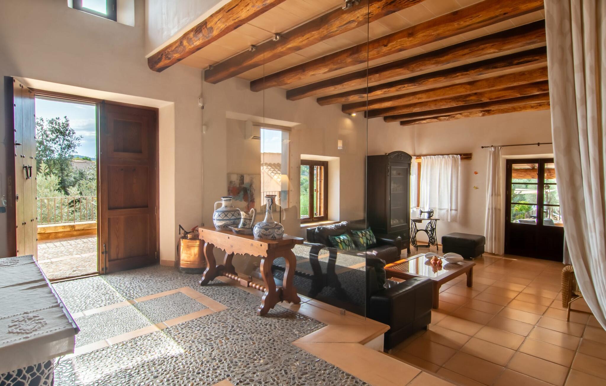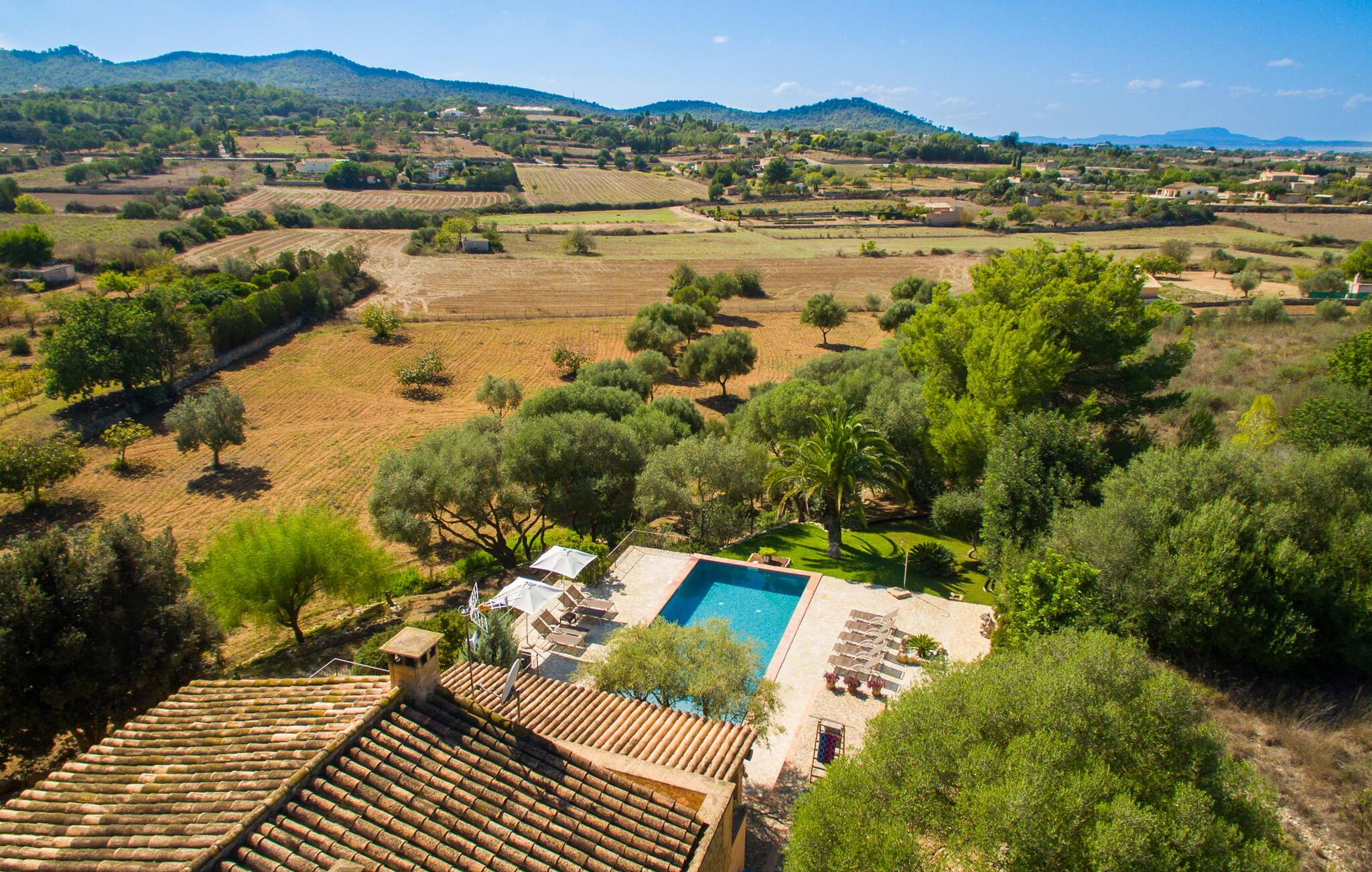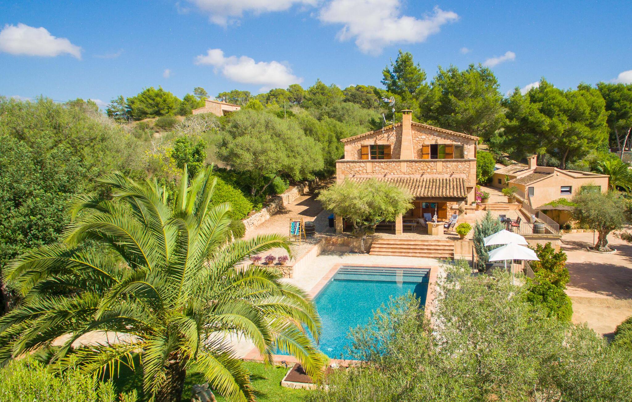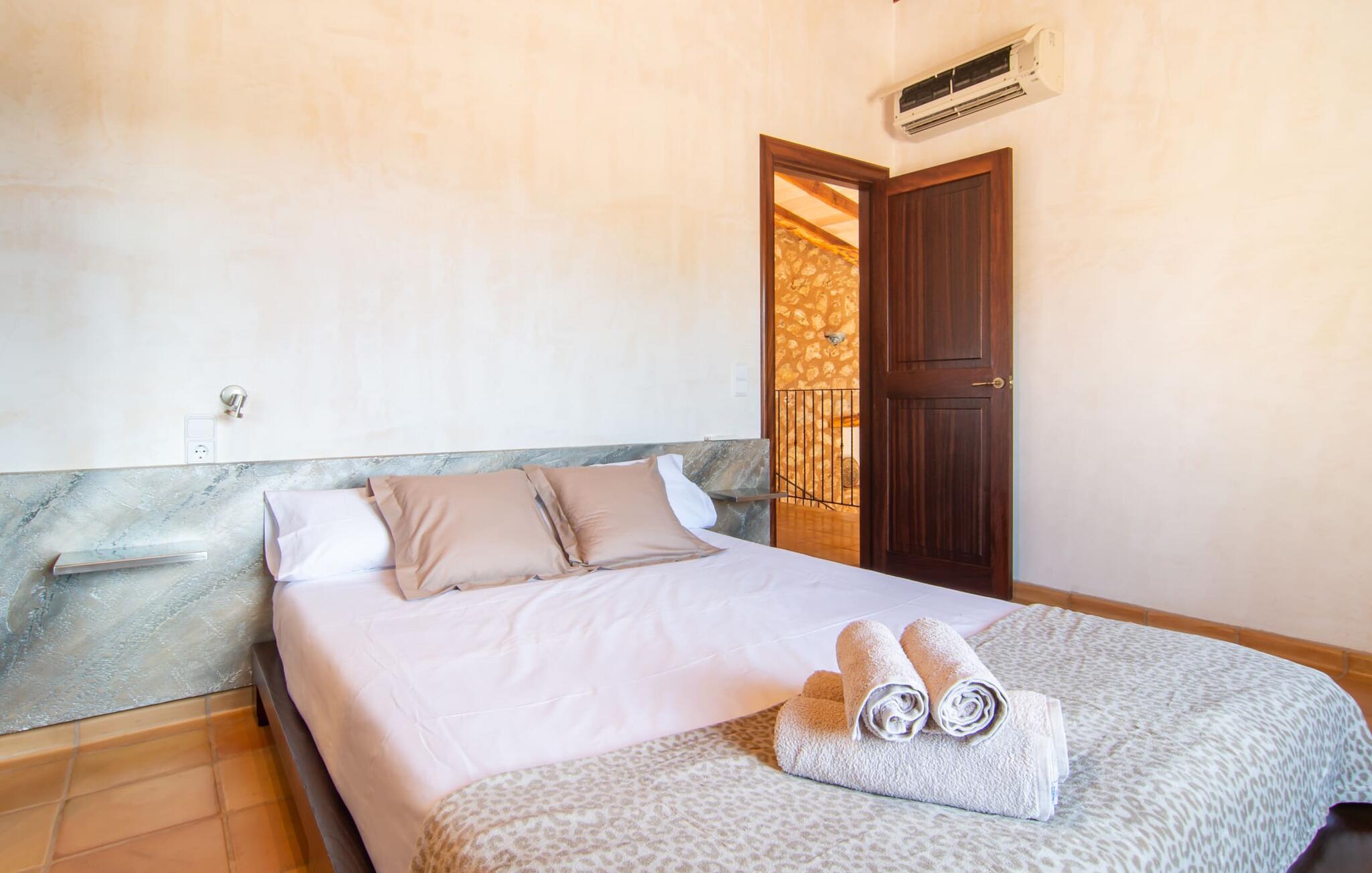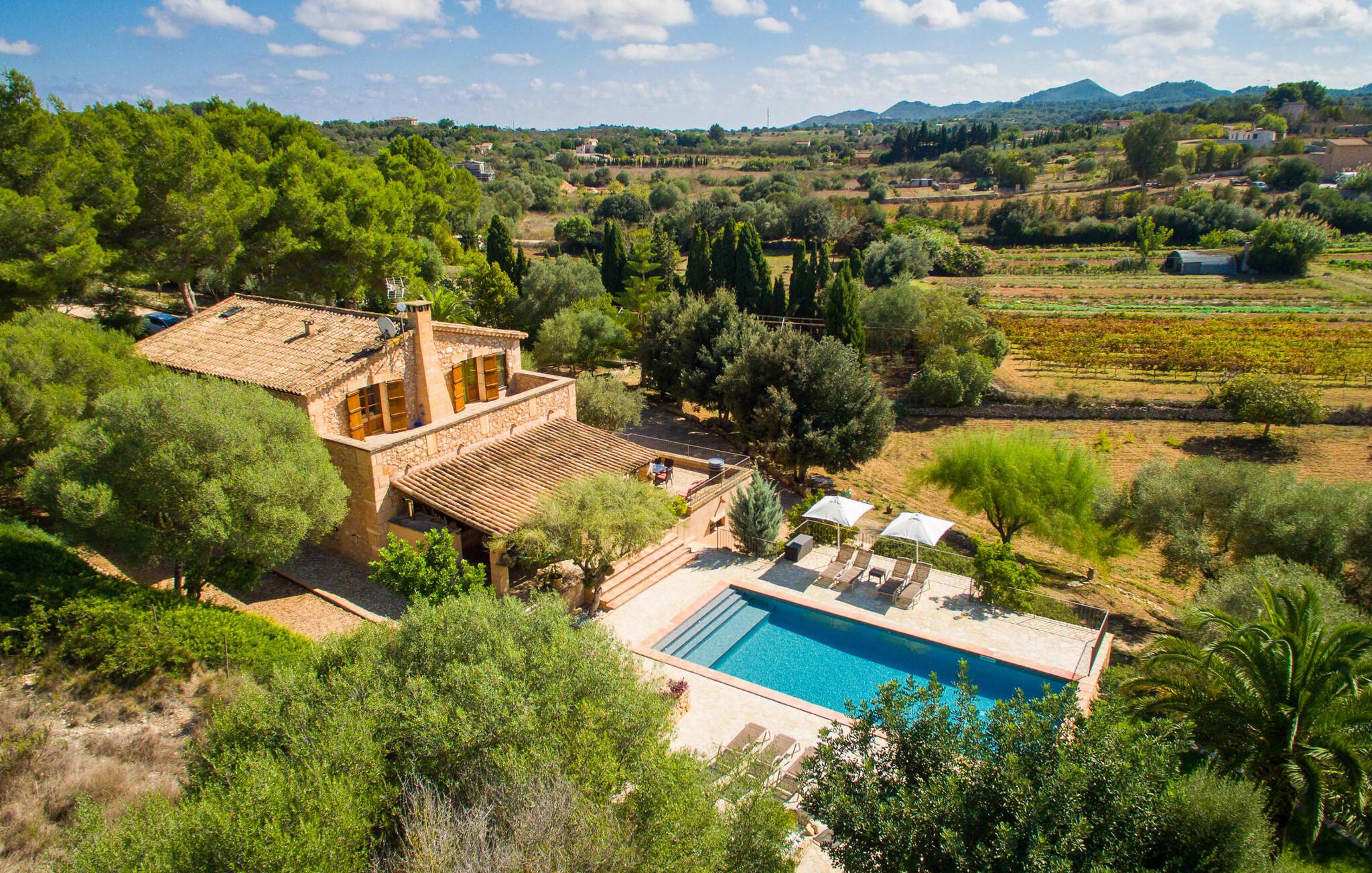 Bemærk - dette er en ejendom for elskere. For elskere af god smag og levende æstetik, der vil bemærke fra første øjeblik, de træder ind i ejendommen, at denne villa opfylder deres behov. Det smukke område er præget af en helt speciel stemning; Den er designet, så den omgiver huset som en meget smuk have med frodige træer og emmer af en hyggelig idyl. Blomster og grønne planter i bede, små vægge, terrassearealer på adskilte plan og individuelle dekorative stykker skaber et indbydende helhedsbillede. Udendørsområdets virkelige blikfang er naturligvis den imponerende pool med en længde på 12 m. Den har trapper for meget behagelig adgang og er stemningsfuldt oplyst om natten. Solterrassen, belagt med natursten, ligger lige ved siden af poolen; De komfortable liggestole inviterer jer til at slappe af af hjertens lyst under middelhavshimlen. De to medfølgende parasoller beskytter jer mod overdreven UV-stråling. Andre indbydende siddemuligheder på den store terrasse omfatter sofaen og det lille bord, som kan rumme middag for op til fire personer. Terrassen, designet med flodsten, byder ikke kun på masser af siddepladser, men også en sensationelt smuk udsigt over poolområdet og videre. Hvis I har lyst, skal I bare slappe af i hængekøjen og lade blikket vandre i det fjerne. Grillen inviterer jer til at nyde solide grillaftener, hvor I kan nyde de udsøgte regionale specialiteter, som I måske har købt på markedet tidligere på dagen. Den skønne altan på øverste etage giver endnu en mulighed for uforstyrret solbadning. Det er simpelthen skønt at sidde her ved solopgang eller solnedgang og nyde den fantastiske udsigt. Fra terrassen i stueplan kommer I ind i huset gennem to dobbeltdøre. Denne indgang fører til det store køkken-alrum, som byder på et behageligt rum til at blive hængende og tilberede og nyde måltider sammen. Køkkenet er rummeligt nok til også at rumme et stort solidt spisebord, der kan rumme op til otte personer til middag. Det moderne køkken er let at rengøre og fuldt udstyret, inklusive en filterkaffemaskine og elkedel. En stor gang, som kan lukkes med en glasskydedør, fører til den hyggelige stue. Forskellige komfortable sofaer og lænestole giver jer mulighed for at slappe af og måske ikke gøre noget i et stykke tid. De massive synlige bjælker udstråler en hjemlig og rustik atmosfære og inviterer jer til at blive hængende. Rent praktisk kan pejsen også bruges og ses fra spise- og opholdsstue. I den kølige årstid kan I finde jer tilpas ved den knitrende pejs og varme jer op, mens I kigger ind i de dansende flammer. Tre brede trin fører fra opholdsrummet ind i gangen og opgangen, der gør et herskabeligt indtryk med sin naturstensvæg og markante støttepiller. Dobbeltværelserne formidler en elegant charme og imponerer med lyse farver, der er dygtigt kombineret med nogle førsteklasses kontraster. Badeværelserne med dagslys imponerer med deres meget individuelle, funktionelle og moderne design. De smukkeste strande på Mallorca, den berømte Calas de Mallorca, kan også nemt nås fra villaen "Sa Tartova". Nogle af de følgende strande er rigtige insider-tips med uberørt karakter. Efter en vellykket dag fuld af ferieaktiviteter, kan I slappe af i privatlivets fred i jeres egen villa, måske svømme et par strækninger og afslutte dagen med lyst. Villaen "Sa Tortava" er en særlig slående ferieejendom, der opfylder selv de højeste standarder for komfort og stil. Det har en idyllisk beliggenhed, kun omkring 3 kilometer sydøst for centrum af Manacor. Manacor har en god infrastruktur. En af de bedste strande i nærheden er Cala Mendia, omkring 13 km væk. Køreturen til Palma de Mallorca Lufthavn tager cirka 45 minutter.