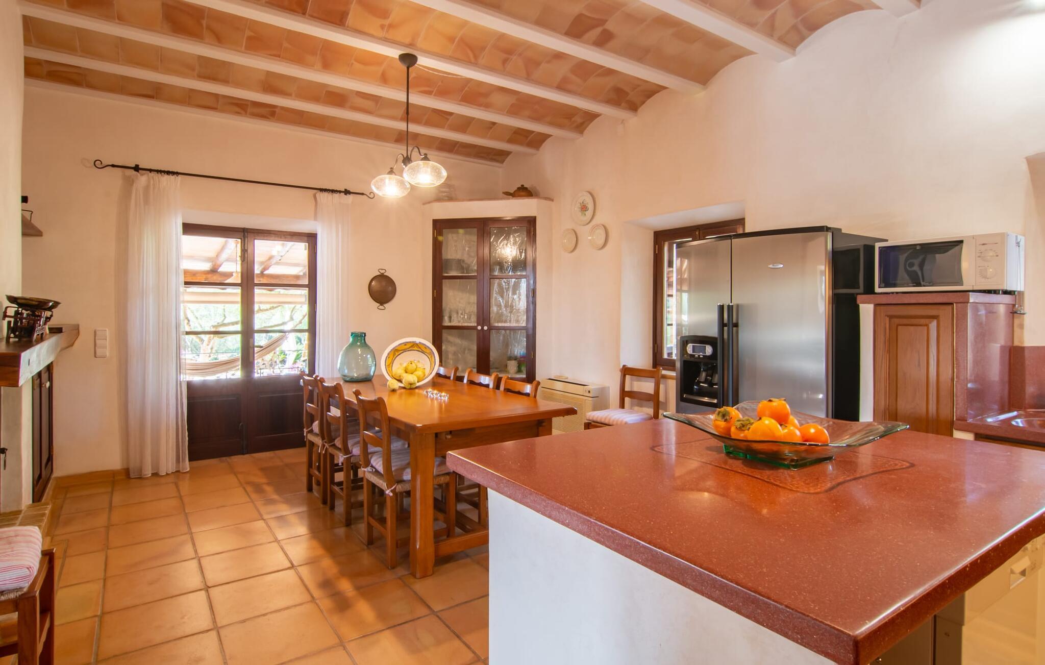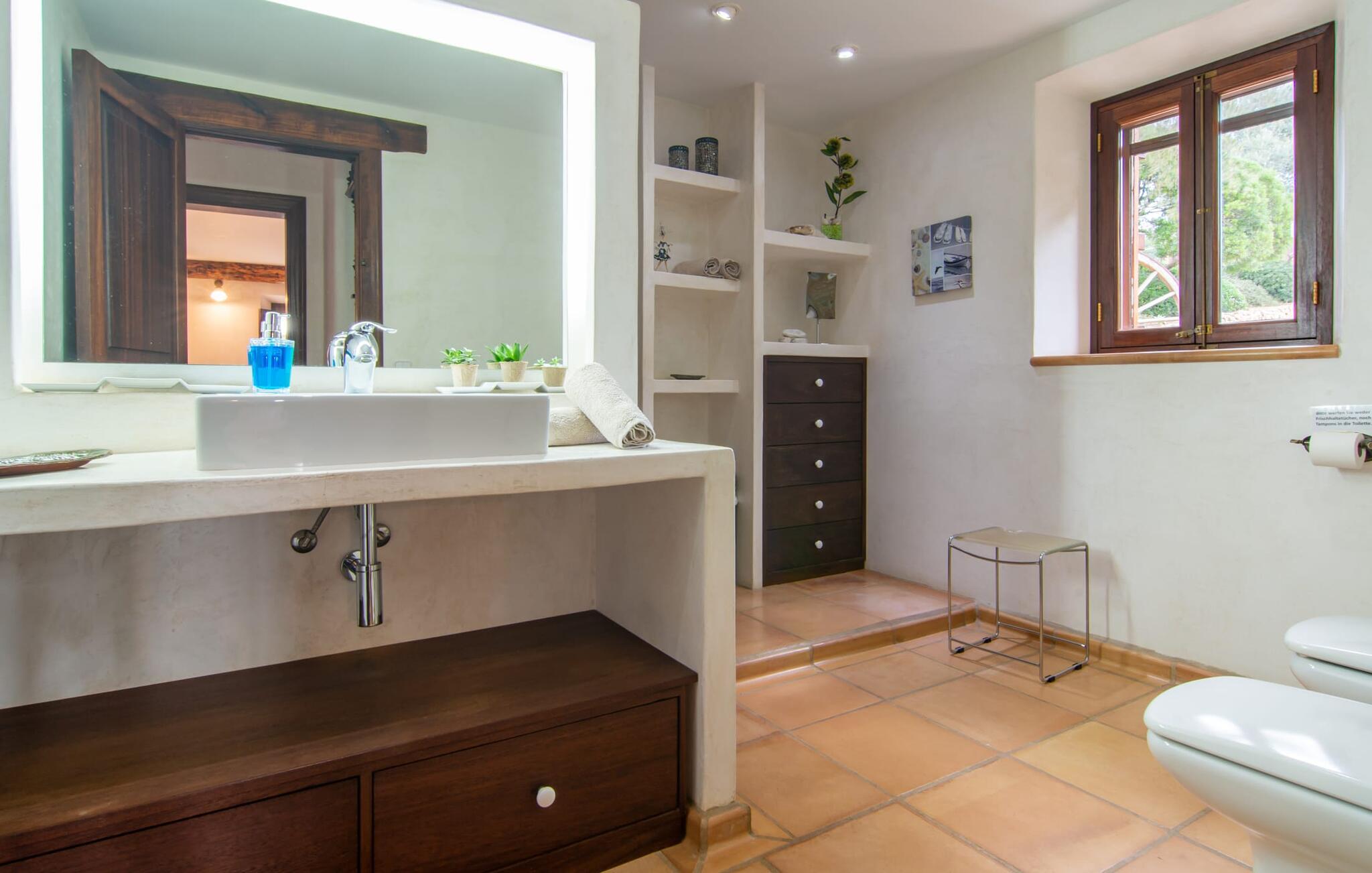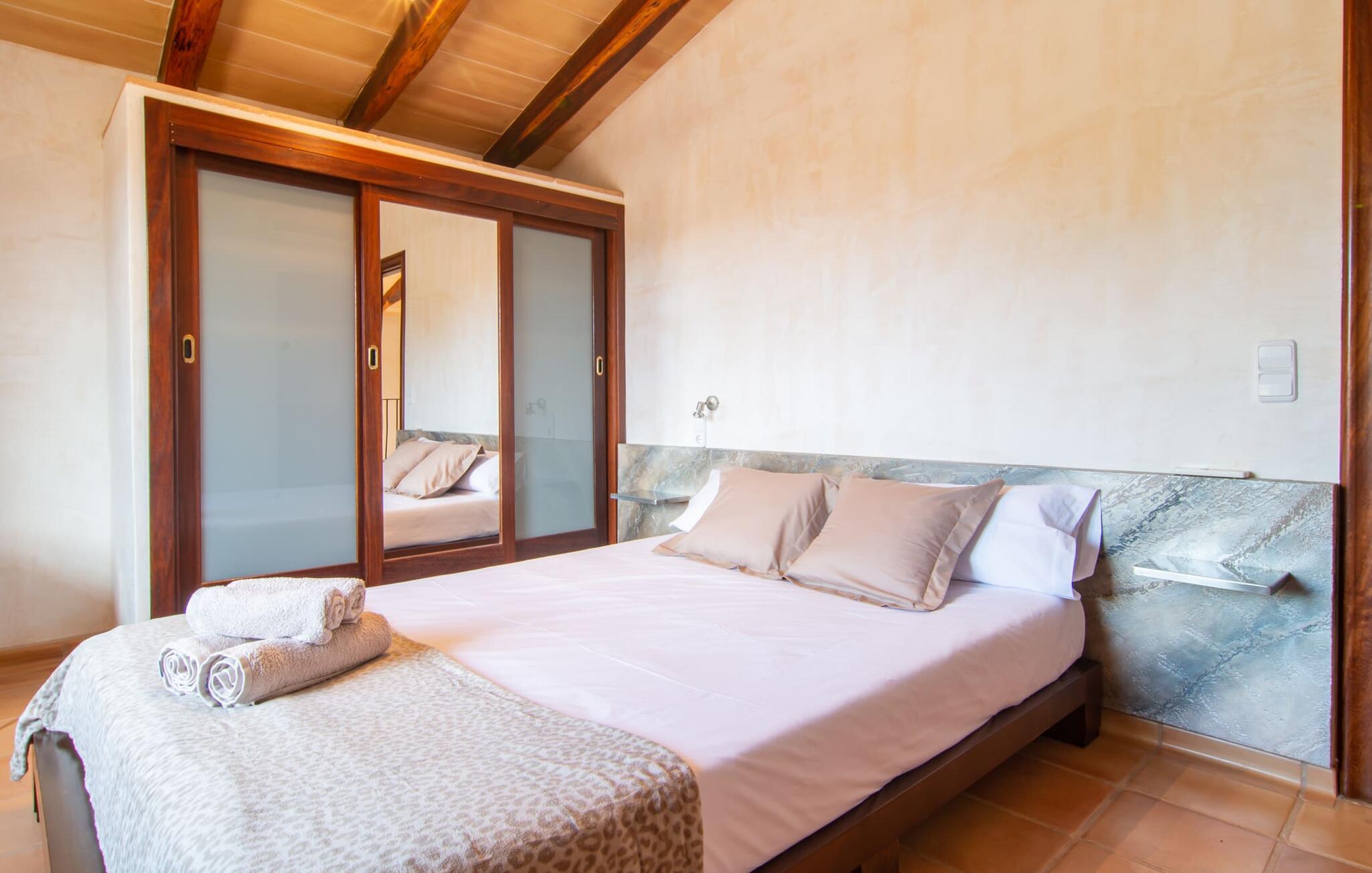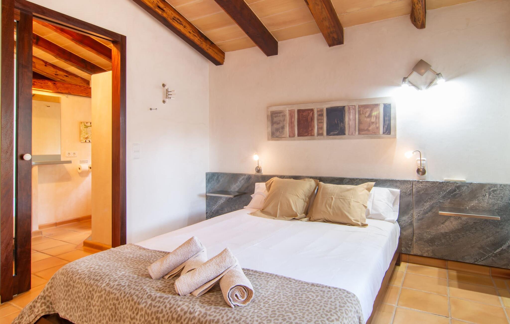 Bemærk - dette er en ejendom for elskere. For elskere af god smag og levende æstetik, der vil bemærke fra første øjeblik, de træder ind i ejendommen, at denne villa opfylder deres behov. Det smukke område er præget af en helt speciel stemning; Den er designet, så den omgiver huset som en meget smuk have med frodige træer og emmer af en hyggelig idyl. Blomster og grønne planter i bede, små vægge, terrassearealer på adskilte plan og individuelle dekorative stykker skaber et indbydende helhedsbillede. Udendørsområdets virkelige blikfang er naturligvis den imponerende pool med en længde på 12 m. Den har trapper for meget behagelig adgang og er stemningsfuldt oplyst om natten. Solterrassen, belagt med natursten, ligger lige ved siden af poolen; De komfortable liggestole inviterer jer til at slappe af af hjertens lyst under middelhavshimlen. De to medfølgende parasoller beskytter jer mod overdreven UV-stråling. Andre indbydende siddemuligheder på den store terrasse omfatter sofaen og det lille bord, som kan rumme middag for op til fire personer. Terrassen, designet med flodsten, byder ikke kun på masser af siddepladser, men også en sensationelt smuk udsigt over poolområdet og videre. Hvis I har lyst, skal I bare slappe af i hængekøjen og lade blikket vandre i det fjerne. Grillen inviterer jer til at nyde solide grillaftener, hvor I kan nyde de udsøgte regionale specialiteter, som I måske har købt på markedet tidligere på dagen. Den skønne altan på øverste etage giver endnu en mulighed for uforstyrret solbadning. Det er simpelthen skønt at sidde her ved solopgang eller solnedgang og nyde den fantastiske udsigt. Fra terrassen i stueplan kommer I ind i huset gennem to dobbeltdøre. Denne indgang fører til det store køkken-alrum, som byder på et behageligt rum til at blive hængende og tilberede og nyde måltider sammen. Køkkenet er rummeligt nok til også at rumme et stort solidt spisebord, der kan rumme op til otte personer til middag. Det moderne køkken er let at rengøre og fuldt udstyret, inklusive en filterkaffemaskine og elkedel. En stor gang, som kan lukkes med en glasskydedør, fører til den hyggelige stue. Forskellige komfortable sofaer og lænestole giver jer mulighed for at slappe af og måske ikke gøre noget i et stykke tid. De massive synlige bjælker udstråler en hjemlig og rustik atmosfære og inviterer jer til at blive hængende. Rent praktisk kan pejsen også bruges og ses fra spise- og opholdsstue. I den kølige årstid kan I finde jer tilpas ved den knitrende pejs og varme jer op, mens I kigger ind i de dansende flammer. Tre brede trin fører fra opholdsrummet ind i gangen og opgangen, der gør et herskabeligt indtryk med sin naturstensvæg og markante støttepiller. Dobbeltværelserne formidler en elegant charme og imponerer med lyse farver, der er dygtigt kombineret med nogle førsteklasses kontraster. Badeværelserne med dagslys imponerer med deres meget individuelle, funktionelle og moderne design. De smukkeste strande på Mallorca, den berømte Calas de Mallorca, kan også nemt nås fra villaen "Sa Tartova". Nogle af de følgende strande er rigtige insider-tips med uberørt karakter. Efter en vellykket dag fuld af ferieaktiviteter, kan I slappe af i privatlivets fred i jeres egen villa, måske svømme et par strækninger og afslutte dagen med lyst. Villaen "Sa Tortava" er en særlig slående ferieejendom, der opfylder selv de højeste standarder for komfort og stil. Det har en idyllisk beliggenhed, kun omkring 3 kilometer sydøst for centrum af Manacor. Manacor har en god infrastruktur. En af de bedste strande i nærheden er Cala Mendia, omkring 13 km væk. Køreturen til Palma de Mallorca Lufthavn tager cirka 45 minutter.