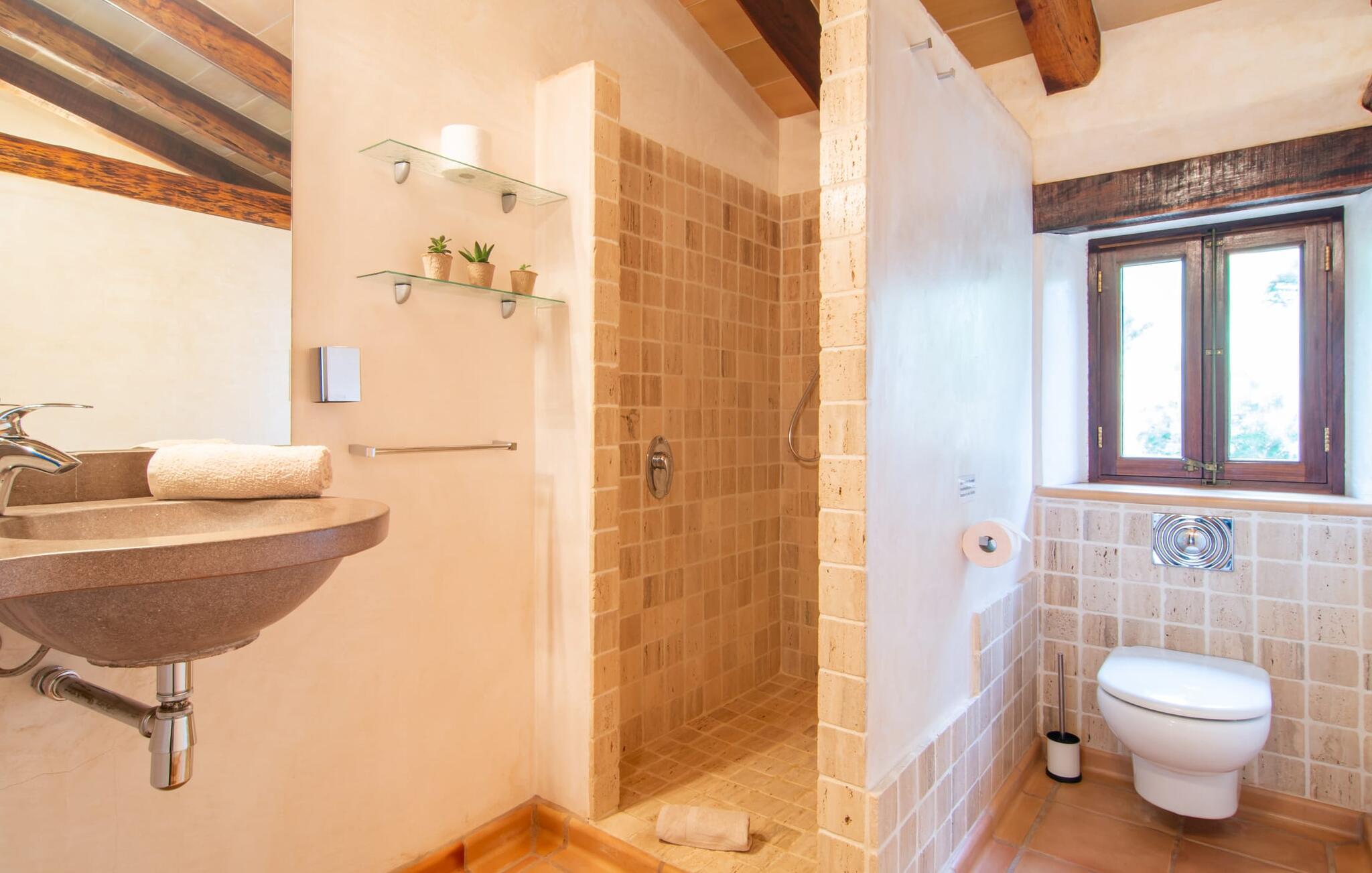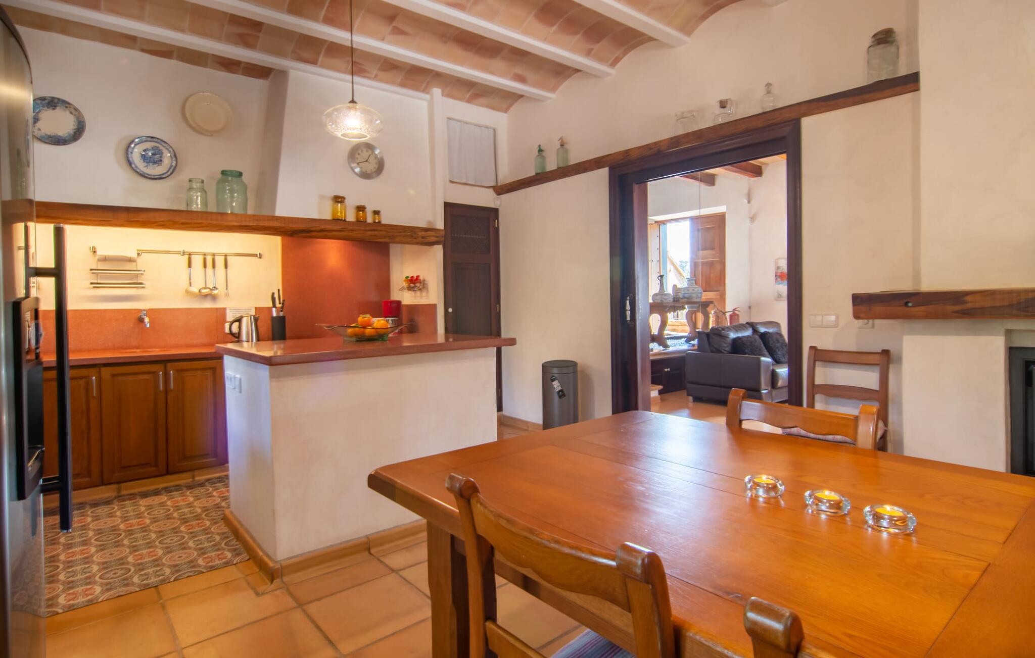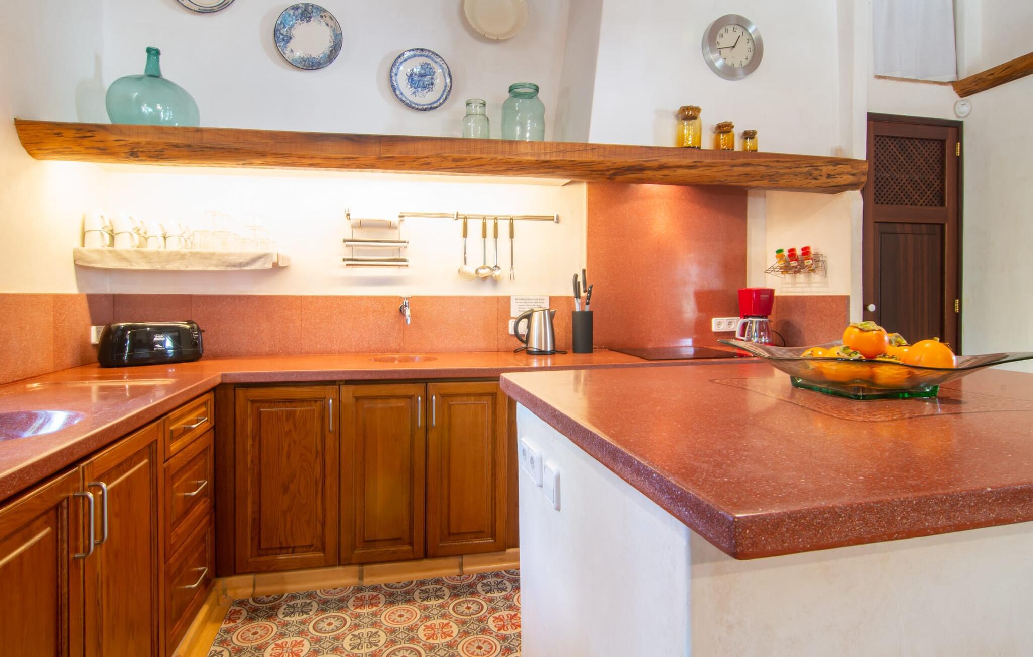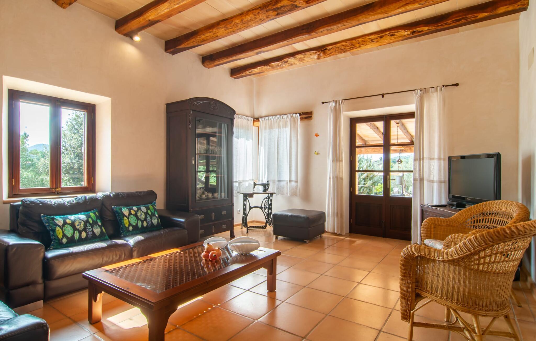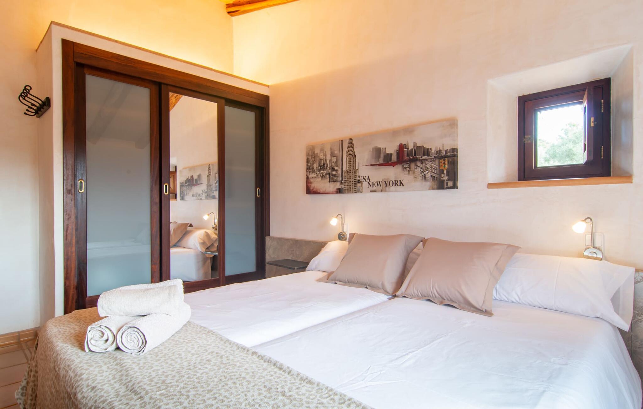 Bemærk - dette er en ejendom for elskere. For elskere af god smag og levende æstetik, der vil bemærke fra første øjeblik, de træder ind i ejendommen, at denne villa opfylder deres behov. Det smukke område er præget af en helt speciel stemning; Den er designet, så den omgiver huset som en meget smuk have med frodige træer og emmer af en hyggelig idyl. Blomster og grønne planter i bede, små vægge, terrassearealer på adskilte plan og individuelle dekorative stykker skaber et indbydende helhedsbillede. Udendørsområdets virkelige blikfang er naturligvis den imponerende pool med en længde på 12 m. Den har trapper for meget behagelig adgang og er stemningsfuldt oplyst om natten. Solterrassen, belagt med natursten, ligger lige ved siden af poolen; De komfortable liggestole inviterer jer til at slappe af af hjertens lyst under middelhavshimlen. De to medfølgende parasoller beskytter jer mod overdreven UV-stråling. Andre indbydende siddemuligheder på den store terrasse omfatter sofaen og det lille bord, som kan rumme middag for op til fire personer. Terrassen, designet med flodsten, byder ikke kun på masser af siddepladser, men også en sensationelt smuk udsigt over poolområdet og videre. Hvis I har lyst, skal I bare slappe af i hængekøjen og lade blikket vandre i det fjerne. Grillen inviterer jer til at nyde solide grillaftener, hvor I kan nyde de udsøgte regionale specialiteter, som I måske har købt på markedet tidligere på dagen. Den skønne altan på øverste etage giver endnu en mulighed for uforstyrret solbadning. Det er simpelthen skønt at sidde her ved solopgang eller solnedgang og nyde den fantastiske udsigt. Fra terrassen i stueplan kommer I ind i huset gennem to dobbeltdøre. Denne indgang fører til det store køkken-alrum, som byder på et behageligt rum til at blive hængende og tilberede og nyde måltider sammen. Køkkenet er rummeligt nok til også at rumme et stort solidt spisebord, der kan rumme op til otte personer til middag. Det moderne køkken er let at rengøre og fuldt udstyret, inklusive en filterkaffemaskine og elkedel. En stor gang, som kan lukkes med en glasskydedør, fører til den hyggelige stue. Forskellige komfortable sofaer og lænestole giver jer mulighed for at slappe af og måske ikke gøre noget i et stykke tid. De massive synlige bjælker udstråler en hjemlig og rustik atmosfære og inviterer jer til at blive hængende. Rent praktisk kan pejsen også bruges og ses fra spise- og opholdsstue. I den kølige årstid kan I finde jer tilpas ved den knitrende pejs og varme jer op, mens I kigger ind i de dansende flammer. Tre brede trin fører fra opholdsrummet ind i gangen og opgangen, der gør et herskabeligt indtryk med sin naturstensvæg og markante støttepiller. Dobbeltværelserne formidler en elegant charme og imponerer med lyse farver, der er dygtigt kombineret med nogle førsteklasses kontraster. Badeværelserne med dagslys imponerer med deres meget individuelle, funktionelle og moderne design. De smukkeste strande på Mallorca, den berømte Calas de Mallorca, kan også nemt nås fra villaen "Sa Tartova". Nogle af de følgende strande er rigtige insider-tips med uberørt karakter. Efter en vellykket dag fuld af ferieaktiviteter, kan I slappe af i privatlivets fred i jeres egen villa, måske svømme et par strækninger og afslutte dagen med lyst. Villaen "Sa Tortava" er en særlig slående ferieejendom, der opfylder selv de højeste standarder for komfort og stil. Det har en idyllisk beliggenhed, kun omkring 3 kilometer sydøst for centrum af Manacor. Manacor har en god infrastruktur. En af de bedste strande i nærheden er Cala Mendia, omkring 13 km væk. Køreturen til Palma de Mallorca Lufthavn tager cirka 45 minutter.
