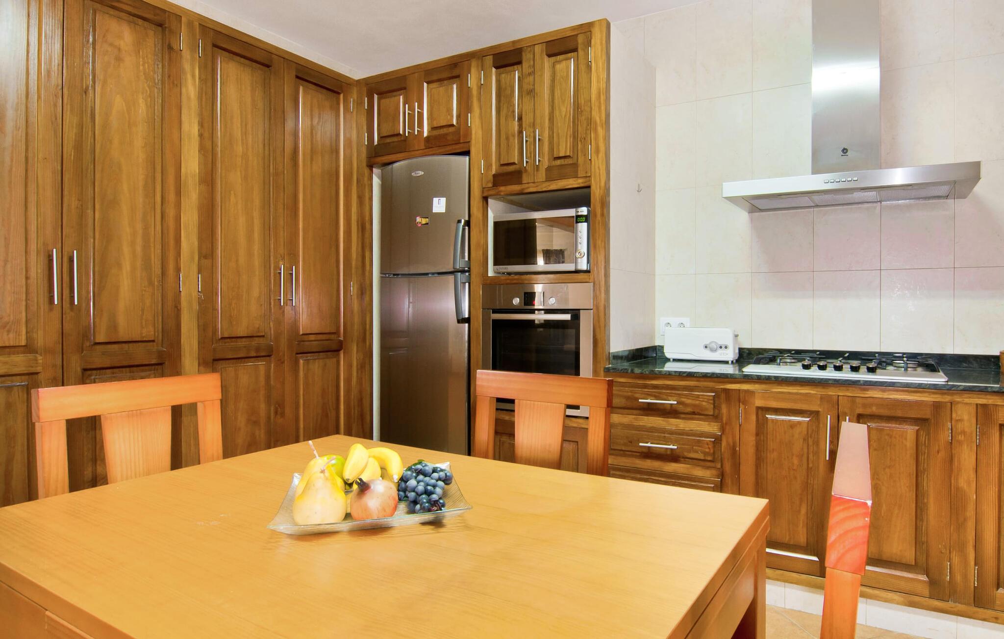Atmosfærisk beliggende mellem en tæt hæk af middelhavsbuske byder villaen "Sa Vinya Gran" sine gæster velkommen i en behagelig landlig og rolig atmosfære. På forsiden af ejendommen er der let grus, som er omkranset af terrasser dekoreret med naturstensplader i den bagerste del af haven. Den store pool ligger foran den overdækkede terrasse, omgivet af et flisebelagt område til solbadning og græsplæne. Store palmer pryder dette centrale udendørsområde og giver det en rustik, maritim flair. Poolen med komfortable trin er dekoreret med lyseblå mosaiksten. Her finder I også en udendørs bruser og et badekar. De otte moderne liggestole giver masser af muligheder for at slappe af mellem forfriskende dukkert i poolen, måske med en kølig drink eller en lille snack. Afhængigt af tidspunktet på dagen byder haven på lidt kølende skygge for at undslippe varmen. Medfølgende børn kan slippe dampen og lege på græsplænen og i poolen uden at forlade deres forældre ude af syne. Den overdækkede del af terrassen, der støder op til ejendommen, byder på et solidt spisebord. Nyd en hyggelig middag med en atmosfærisk udsigt over haven og den dybblå himmel. Om aftenen inviterer den indbyggede grill til grillmiddag. I kan finde lækre, friske regionale ingredienser hele dagen lang og tilberede og tilberede dem over kullene efter jeres smag. Som sædvanlig træder man direkte ind i huset fra terrassen, hvis enestående design afspejler udendørsområdets klare og stilrene linjer. Farverne og materialerne harmonerer perfekt og giver alle rum en vidunderlig hyggelig og indbydende rummelighed. Selvom I er mæt i denne villa, vil I altid have mulighed for at finde et roligt og ugeneret privat område. Flere og flere mennesker sætter pris på dette luksuriøse rum, især på ferie. Den rummelige stue/alrum giver jer mulighed for at slappe af på to komfortable sofaer, måske med en god bog eller endda en underholdende film, da det er her det store fladskærms-satellit-tv er placeret. Nyd en hyggelig middag indendørs ved det udvidelige spisebord. Det moderne køkken byder på alt hvad I behøver til jeres daglige behov, er udstyret til en høj standard og har masser af plads. Her finder I endnu et – mere uformelt – mindre spisebord. Faciliteterne omfatter en italiensk kaffemaskine og en elkedel. Rummelige og æstetisk designede soveværelser inviterer til refleksion og afslapning. For at sikre optimal afslapning er rummene fri for unødvendige dikkedarer. Der er to senge, der måler 1,50 x 1,90 m og fire senge, der måler 0,90 x 1,90 m. To store og luksuriøse badeværelser med naturligt lys og moderne indretning tilbyder komfort. Værelserne har strygejern og hårtørrer, så I behøver ikke at tage dem med. I kan tage en kort dagstur til blandt andet den smukke havn i den tidligere fiskerby Colonia de Sant Jordi (19 km). Hvis I kan lide at besøge stranden, er Villa "Sa Vinya Gran" perfekt for jer. De smukkeste strande på sydøstkysten – som den familievenlige Es Trenc strand – kan hurtigt nås med lejebil. Hvis I ønsker det, kan I udforske en af de mange forskellige bugter hver dag. Efter en begivenhedsrig dag kan I vende tilbage til jeres afslappende ferievilla og tilbringe aftenen efter jeres ønsker. Villaen "Sa Vinya Gran" med sit rummelige interiør er smukt beliggende i landlige omgivelser på en smuk og ugeneret ejendom, kun 10 minutter i bil sydøst for Campos. I Campos finder I barer, restauranter og butikker til jeres daglige behov. Fra villaen er der kun en kort køretur til Mallorcas sydlige strande. Lufthavnen ligger lidt over en halv times kørsel væk.