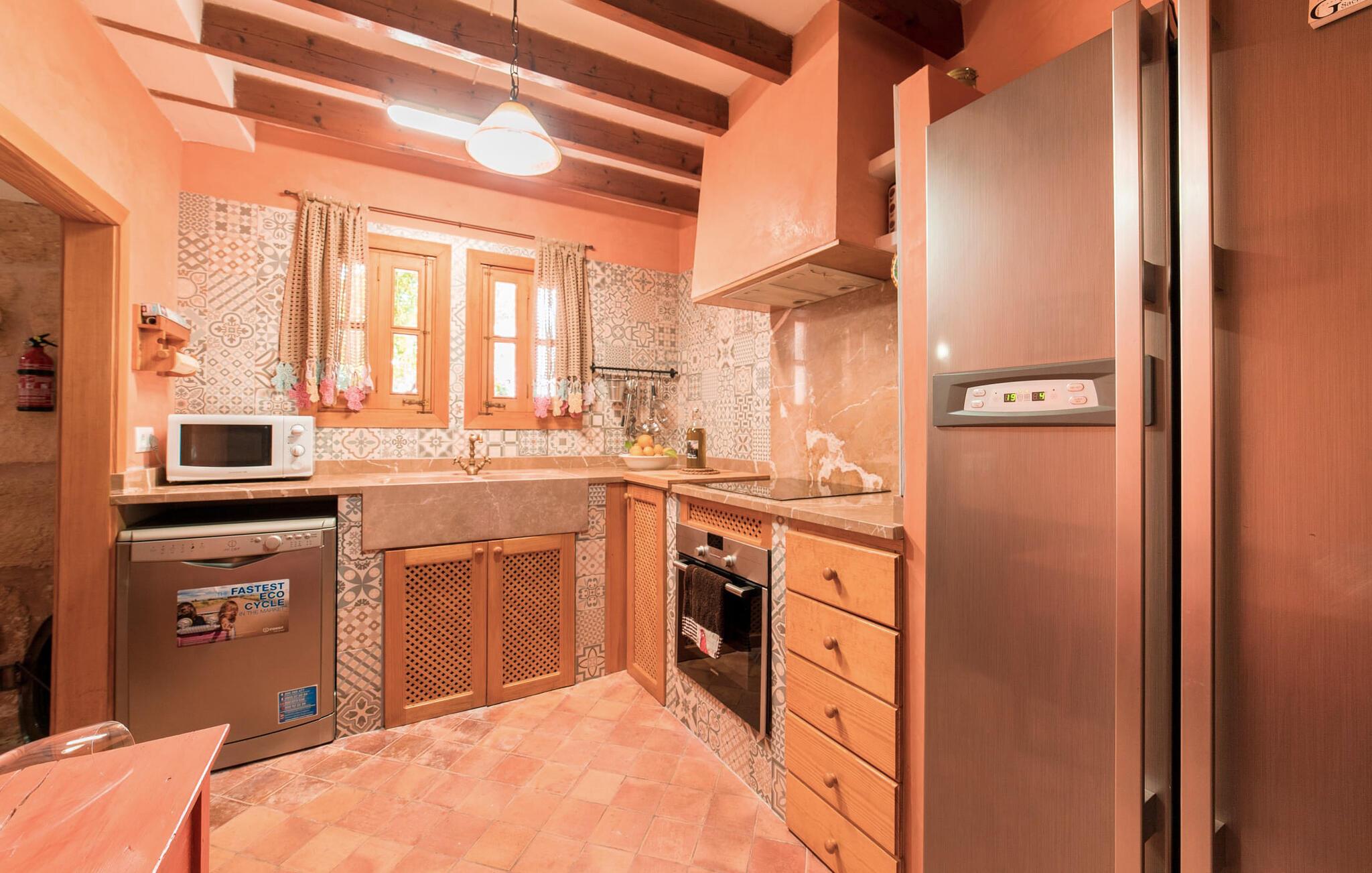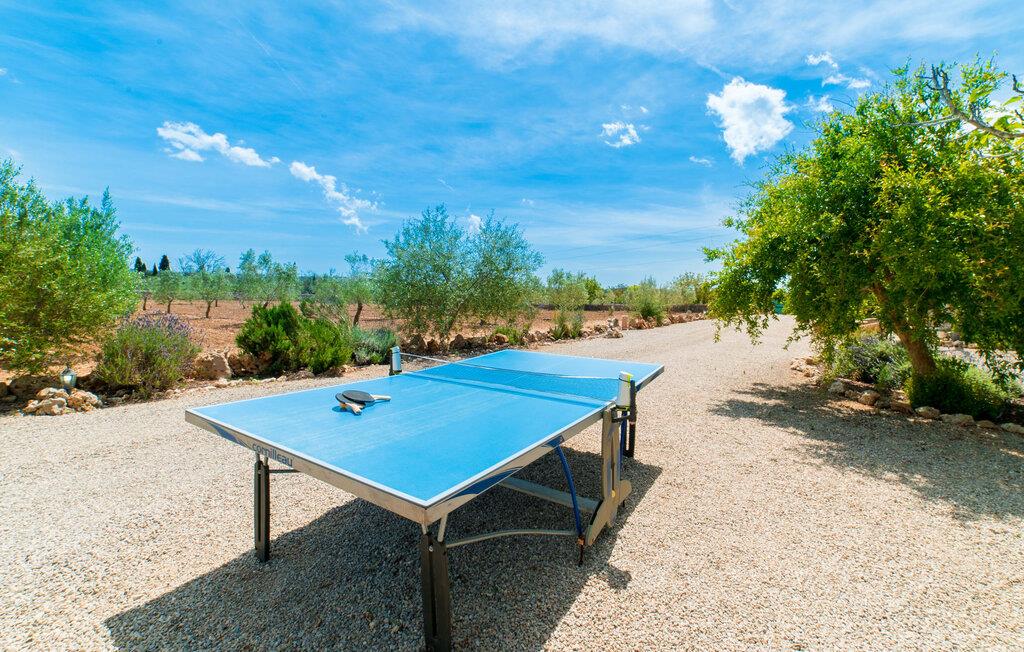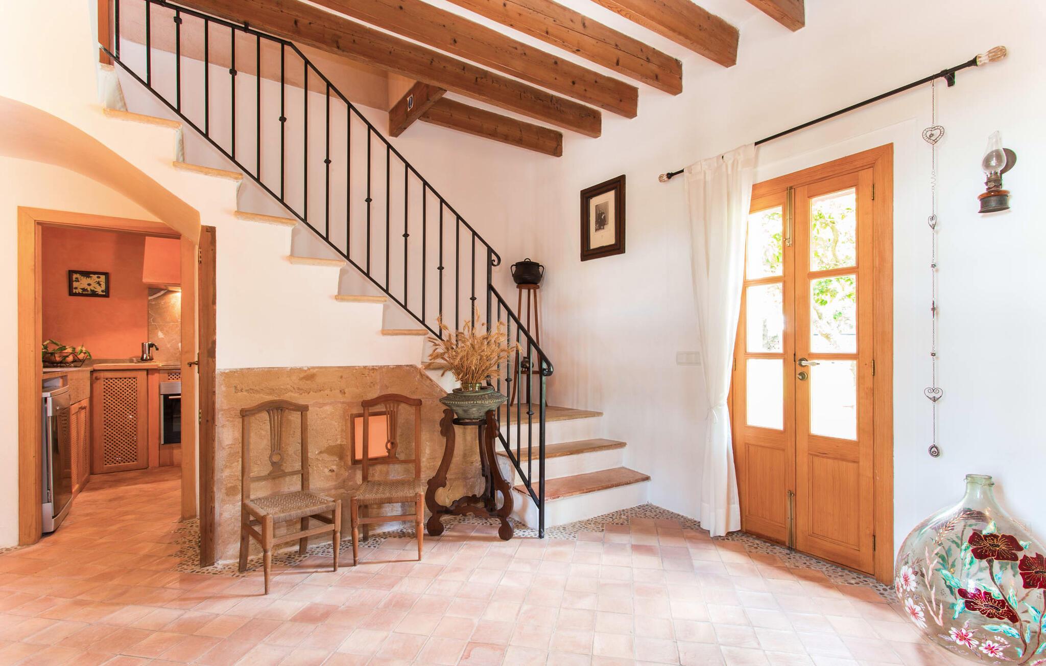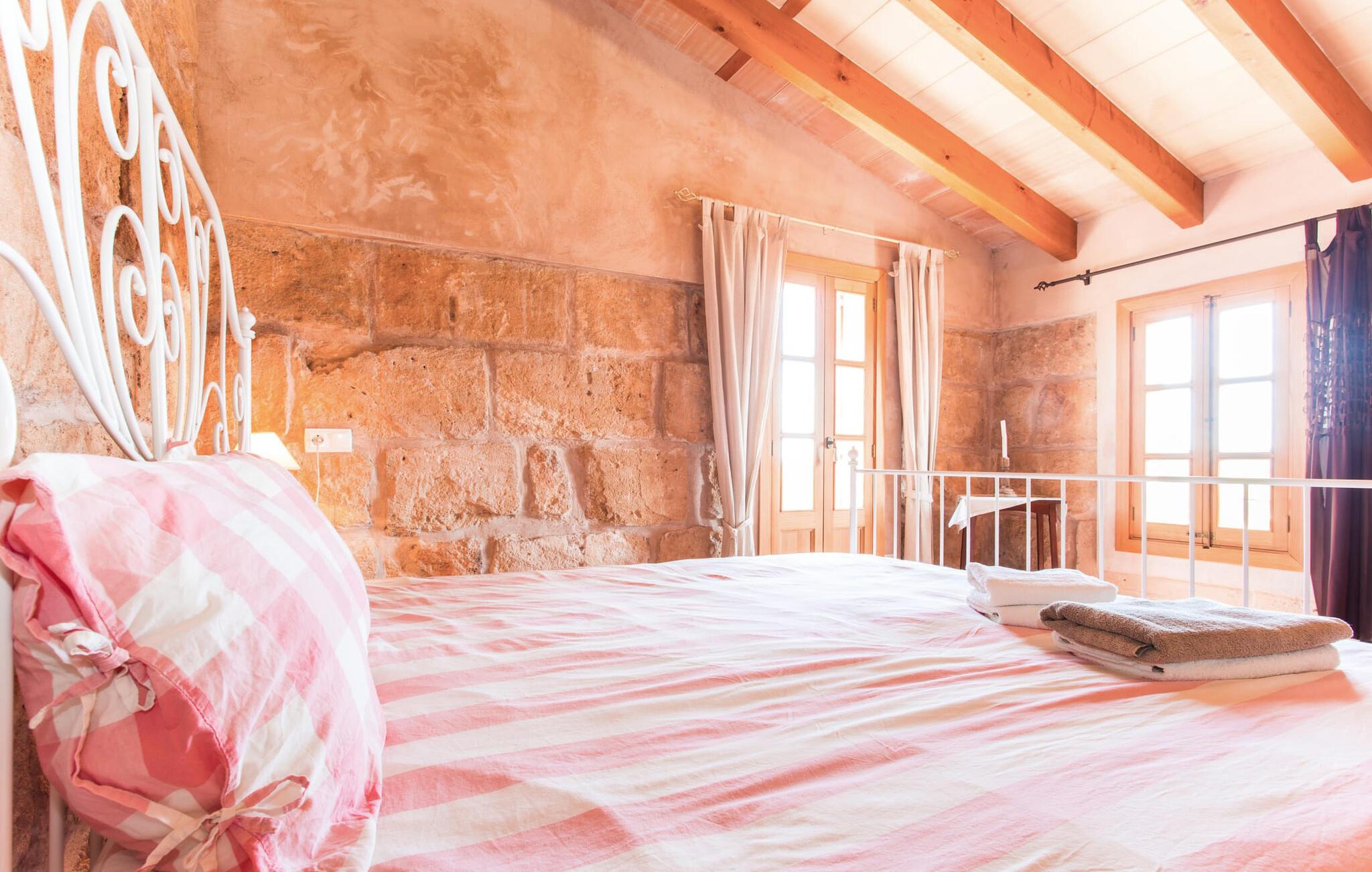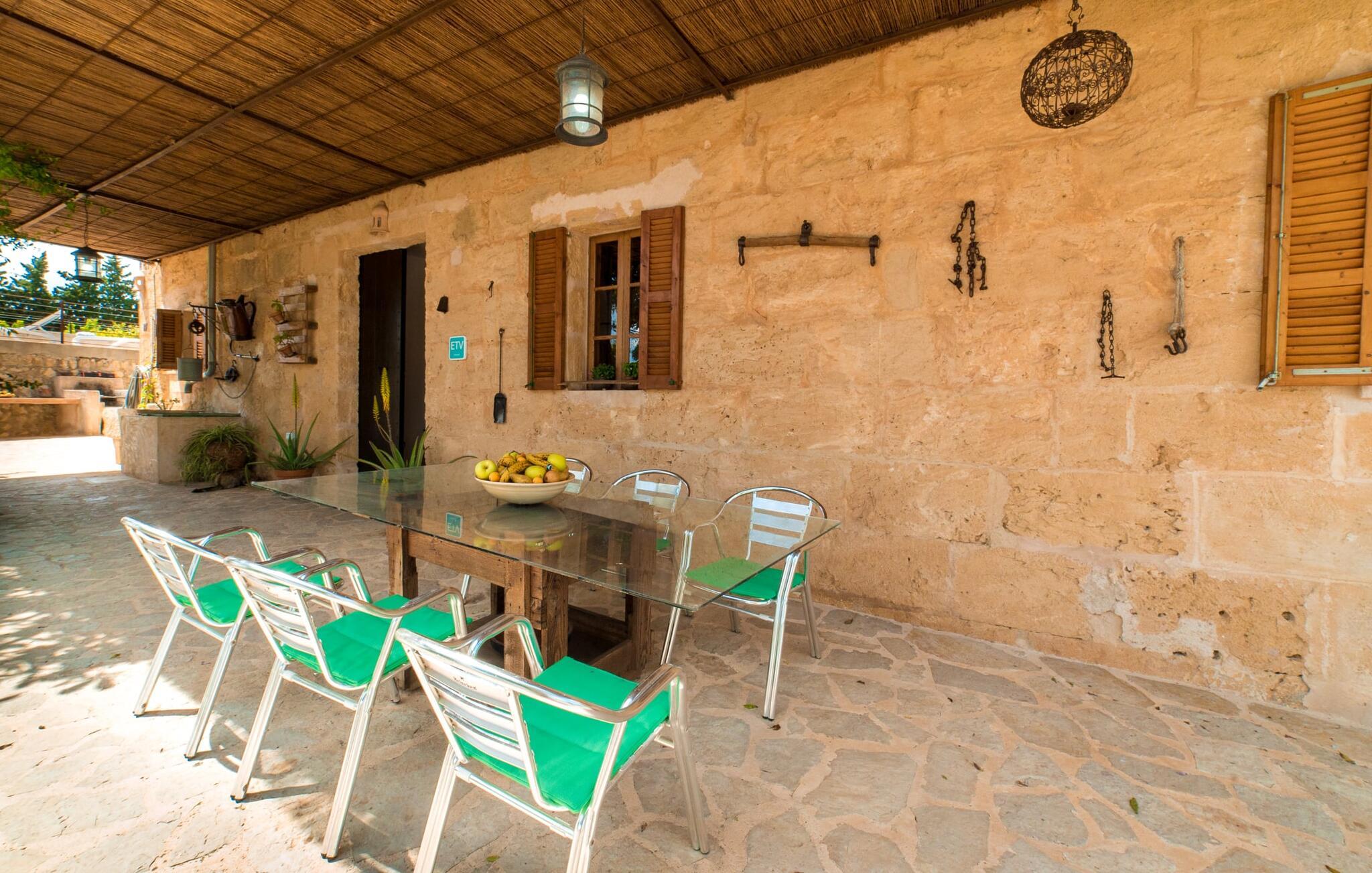 Leder I efter en autentisk mallorcansk ferie i idylliske, landlige omgivelser? Også en elegant stemning? Så tag et øjeblik og lær villaen "Sa Vinyasa Des Compte" lidt bedre at kende. Dette er en ejendom, der nemt opfylder alle disse krav, men der er meget mere her end det, så lad os venligst introducere jer til nogle af de finere detaljer. Bygningen ser ud, som om den altid har været en del af det lokale landskab, omgivet af høje nåletræer på den ene side og marker og haver på den anden. Oliventræerne på ejendommen udstråler middelhavskarakter. Dette storslåede terræn er ideelt til alle typer af afslappede udendørsaktiviteter. Langs hele villaens forside løber en overdækket stenpladeterrasse, som er ideel til hverdagen på ferien. Nyd jeres måltider sammen her ved det elegante spisebord og nyd udsigten over det omkringliggende landskab. Bare vær forberedt på at slappe af. Træskodder på vinduerne, en antik udseende stenfacade, et luftigt bambusudhæng og antikke dekorative elementer skaber en unik atmosfære, der inviterer jer til at blive hængende. Et par trin fører til den hævede pool, som er placeret i villaens tidligere vandtank. I kan til enhver tid komme her for at tage en forfriskende svømmetur i vandet eller nyde den varme middelhavssol på solterrassen. Bag huset er der en have med frugttræer og en stor græsplæne, hvor børnene kan lege af hjertens lyst. Der er også en muret grill, hvor I kan grille alle mulige lækkerier og nyde dem med hele besætningen, præcis som I forventer af en ferie. Det mest interessante ved denne villa er, at den har en økologisk køkkenhave, og selv træerne er vedligeholdt på en miljøvenlig måde. Derudover er der også høns i villaen, så I får friske æg om morgenen. Der er endda en venlig kat på ejendommen. Når I træder ind i boligen, vil I bemærke, at ejerne har lagt en stor indsats og sans for detaljerne i at skabe et usædvanligt indbydende miljø. Fusionen af moderne æstetisk design med ægte traditionelle elementer giver rummene en atmosfære fuld af charme og stil. Stedets autentiske karakter understreges af sandstensvægge og unikke antikviteter, som gør det til et ægte blikfang. Og hele interiøret har en smuk balance mellem dekorative gulvfliser og klassiske synlige loftsbjælker. Hoveddøren fører ind i stueetagens spisestue, hvis I ønsker at spise indenfor. Og på køligere aftener kan I tænde pejsen for at gøre det endnu hyggeligere. Til højre er der et hyggeligt soveværelse og et rummeligt badeværelse, der er flot og farverigt indrettet - bruseren bruger endda solopvarmet vand. Til venstre er køkkenet, som er udstyret med højkvalitets apparater til jeres komfort, herunder en kedel og en filterkaffemaskine. Dette er et fantastisk sted at prøve nogle traditionelle spanske opskrifter, mens I er på ferie og måske servere dem til resten af gruppen for at nyde. Den øverste etage er i det væsentlige ét stort rum, opdelt i forskellige rum gennem den smarte placering af et indbygget skab. Den hyggelige, airconditionerede stue er stedet at slappe af efter en lang dag med ferie. Hvis I vil, kan I se en god film på tv eller dvd. Soveværelserne ovenpå, et enkelt- og et dobbeltværelse, har hver deres egen karakteristiske stil, men begge er ideelle til en god nats søvn. Dobbeltværelset åbner direkte ud til den rummelige tagterrasse, som byder på en vidunderlig udsigt i alle retninger. Originale møbler lavet af forsendelsespaller er det perfekte sted at sidde udenfor om aftenen og nyde et godt glas vin. Enkeltværelset er farverigt indrettet og vil helt sikkert være det værelse, som yngre feriegæster ønsker at bo i. I kan købe dagligvarer og andre fornødenheder i Santa Margalida, hvor der er talrige supermarkeder, konditorier og restauranter. Vi anbefaler især morgenmadsbaren "El Sol" på stranden i Son Serra de Marina (ca. 15 km); Nyd en stilfuld brunch med udsigt over stranden og vandet, og der er endda livemusik om søndagen. Can Picafort har stadig fornemmelsen af en kystlandsby, hvor I kan gå en lang tur på promenaden langs den blege sandstrand, der strækker sig nordpå til Port d'Alcúdia. Barer, restauranter, butikker og endda natklubber sikrer en ferie, I aldrig vil glemme. Den autentiske mallorcanske villa "Sa Vinyasa Des Compte" er gemt væk på en 28.000 m² stor grund, kun 2 km syd for den lille by Santa Margalida på den nordlige del af øen. Den rolige beliggenhed er ideel for naturelskere. Sineu ligger 15 minutters kørsel derfra, og smukke Inca kan nås på cirka 25 minutter. Kystbyen Can Picafort ligger kun 11 km væk. Tag dertil for at nyde havet og shoppe dagligvarer og andre daglige fornødenheder.