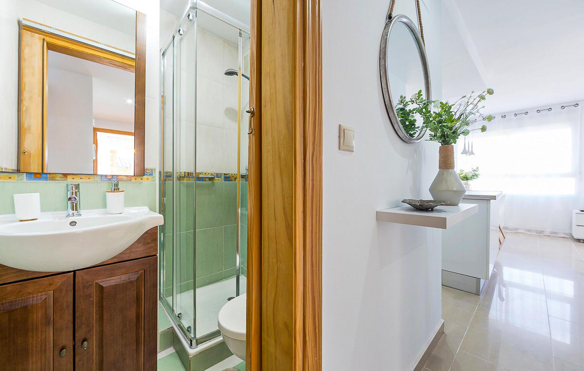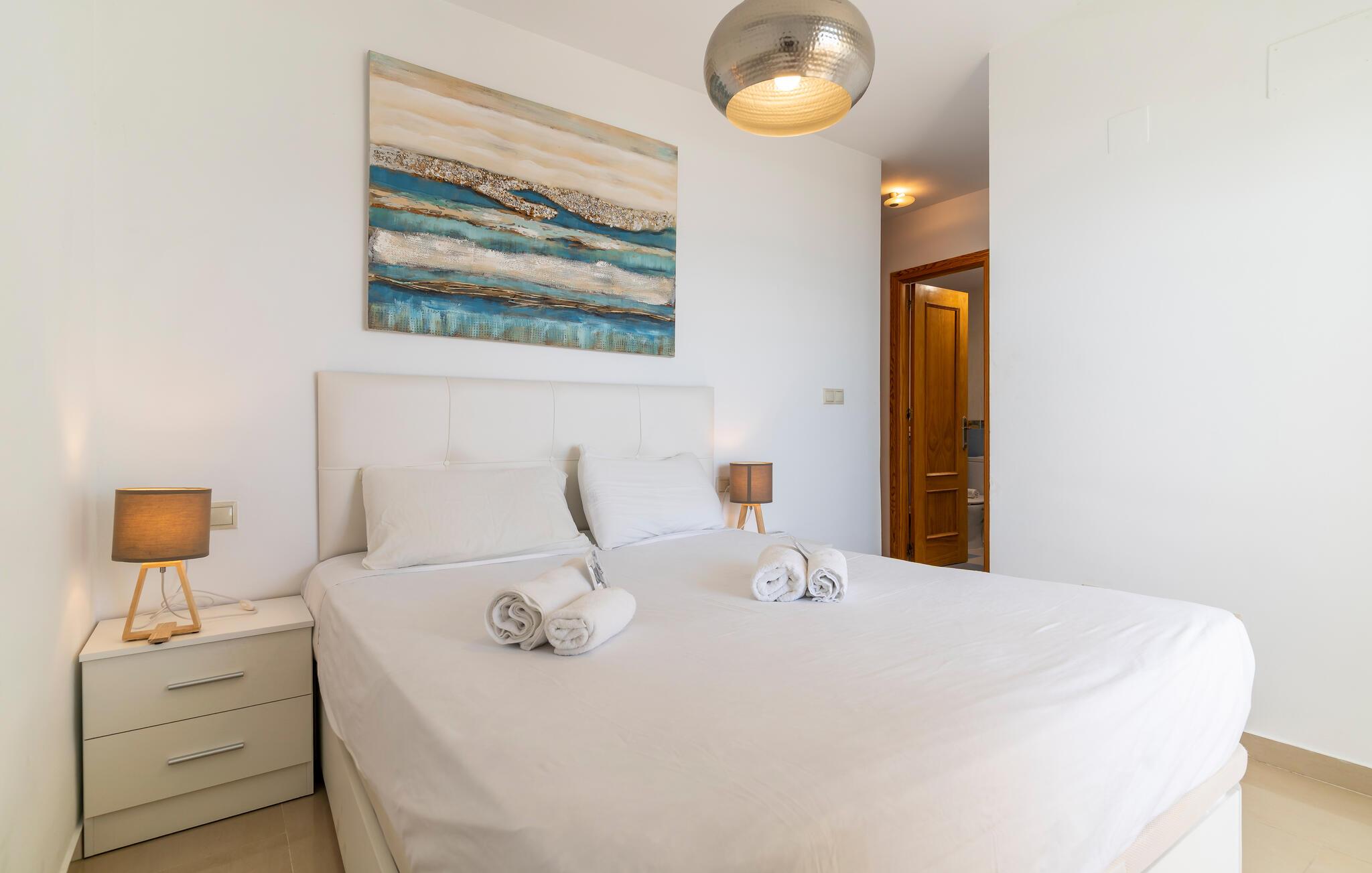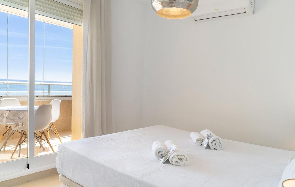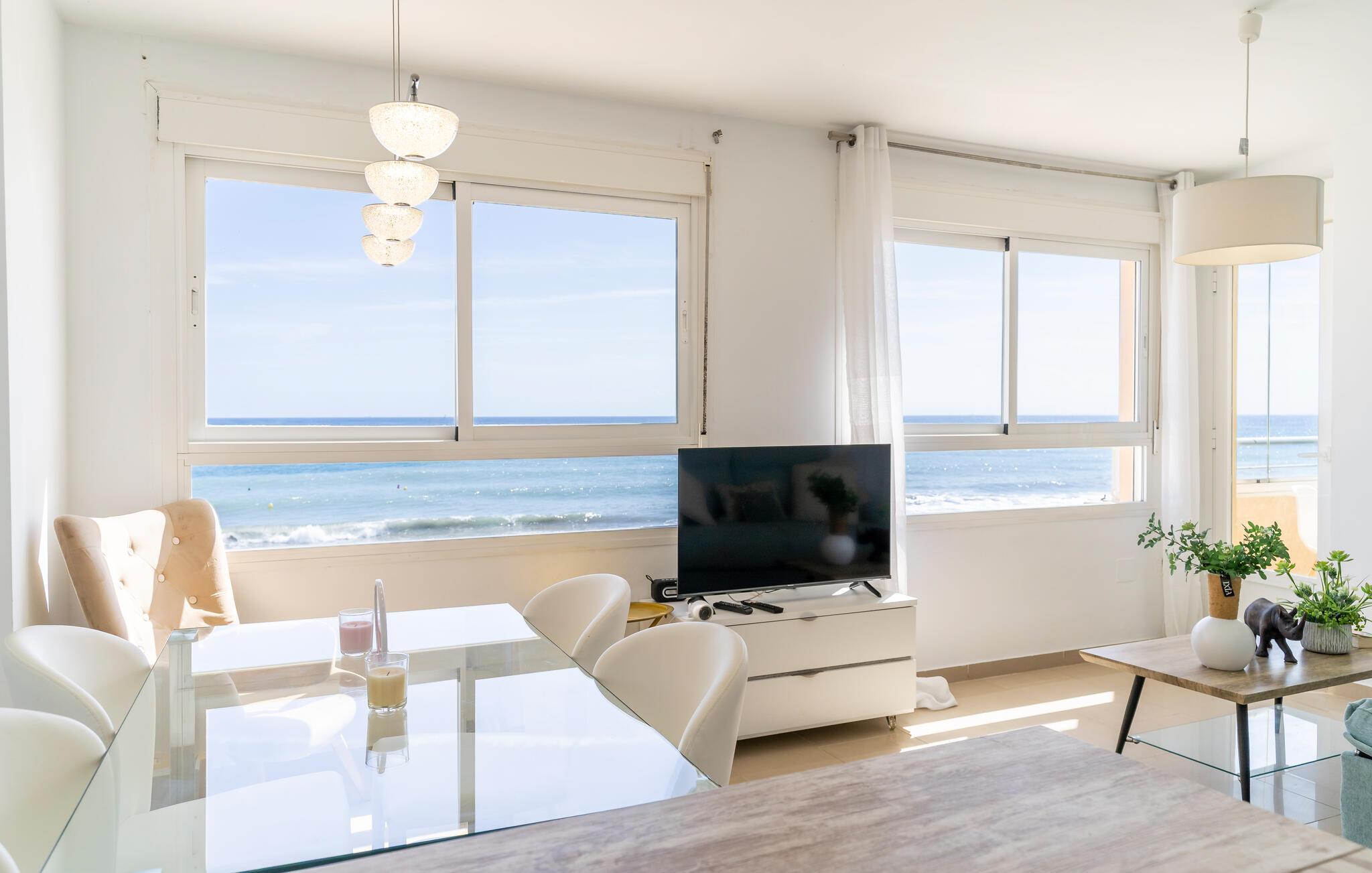 Lige ved den lange sandstrand i Sabinillas inviterer denne rummelige ferielejlighed jer til en uforglemmelig pause fra hverdagen sammen med familie eller venner. Uanset om I laver mad i det åbne køkken eller nyder måltiderne i det lyse spiseområde, har I altid udsigt til Middelhavet. Slap af om aftenen i den hyggelige sofa, nyd gode samtaler over et glas vin, eller stream en film.