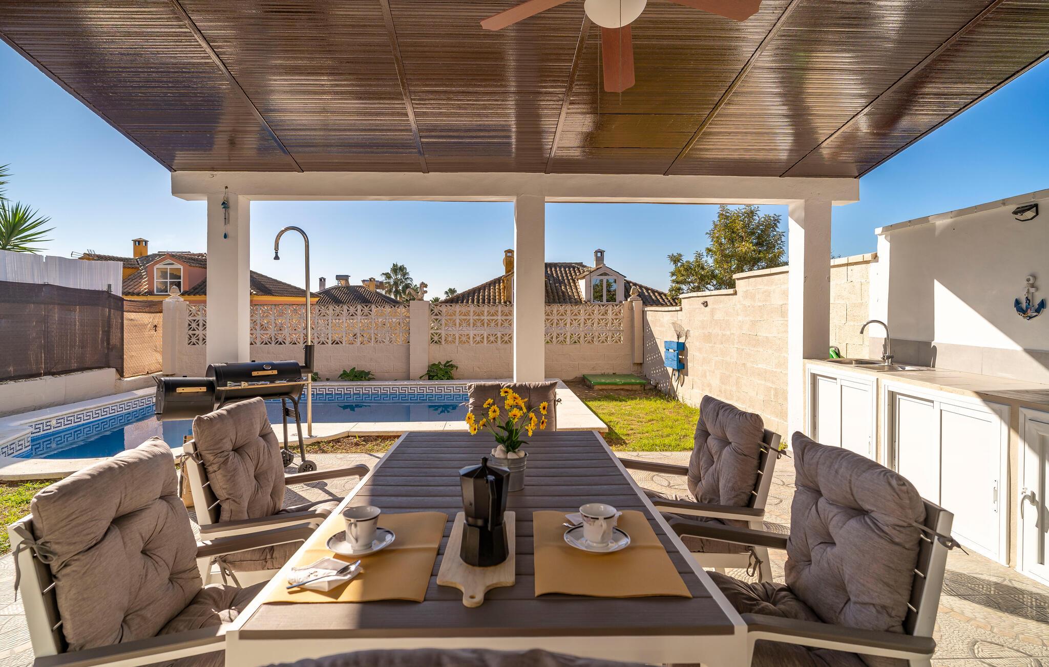 Begynd jeres dag med morgenmad på den overdækkede terrasse, som byder på en vidunderlig udsigt over haven og poolen. Bagefter kan I slappe af på en liggestol eller forfriske jer selv med en dukkert i poolens kølige vand. Benyt lejligheden til at afslutte dagen i skumringen med et hyggeligt samvær med et glas lokal vin.
