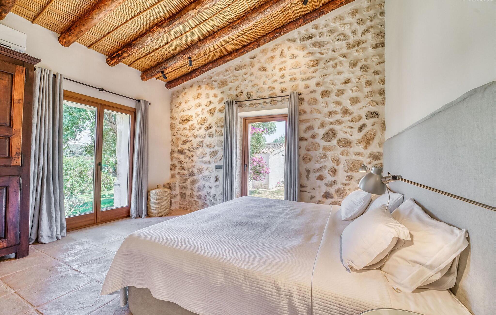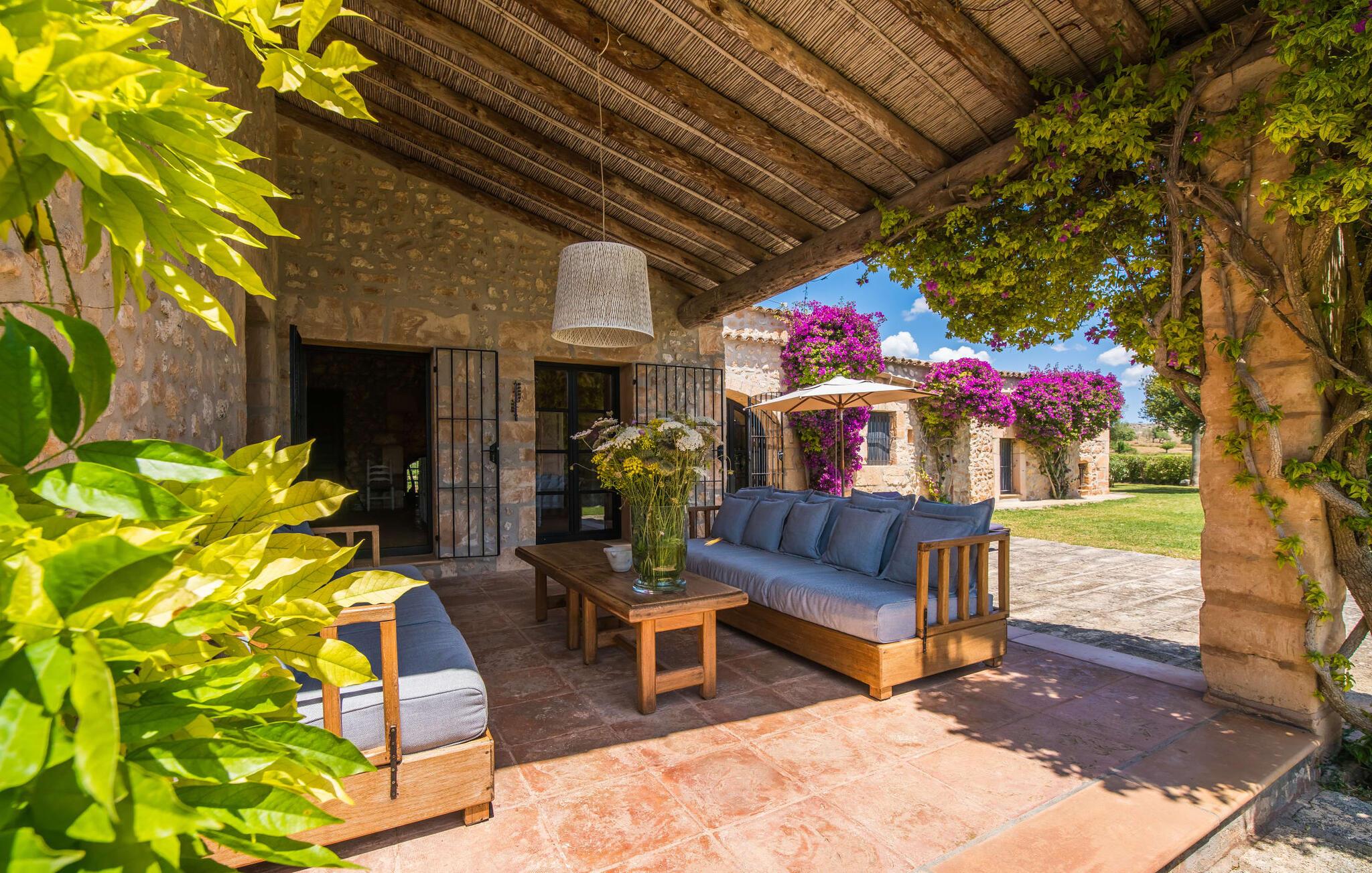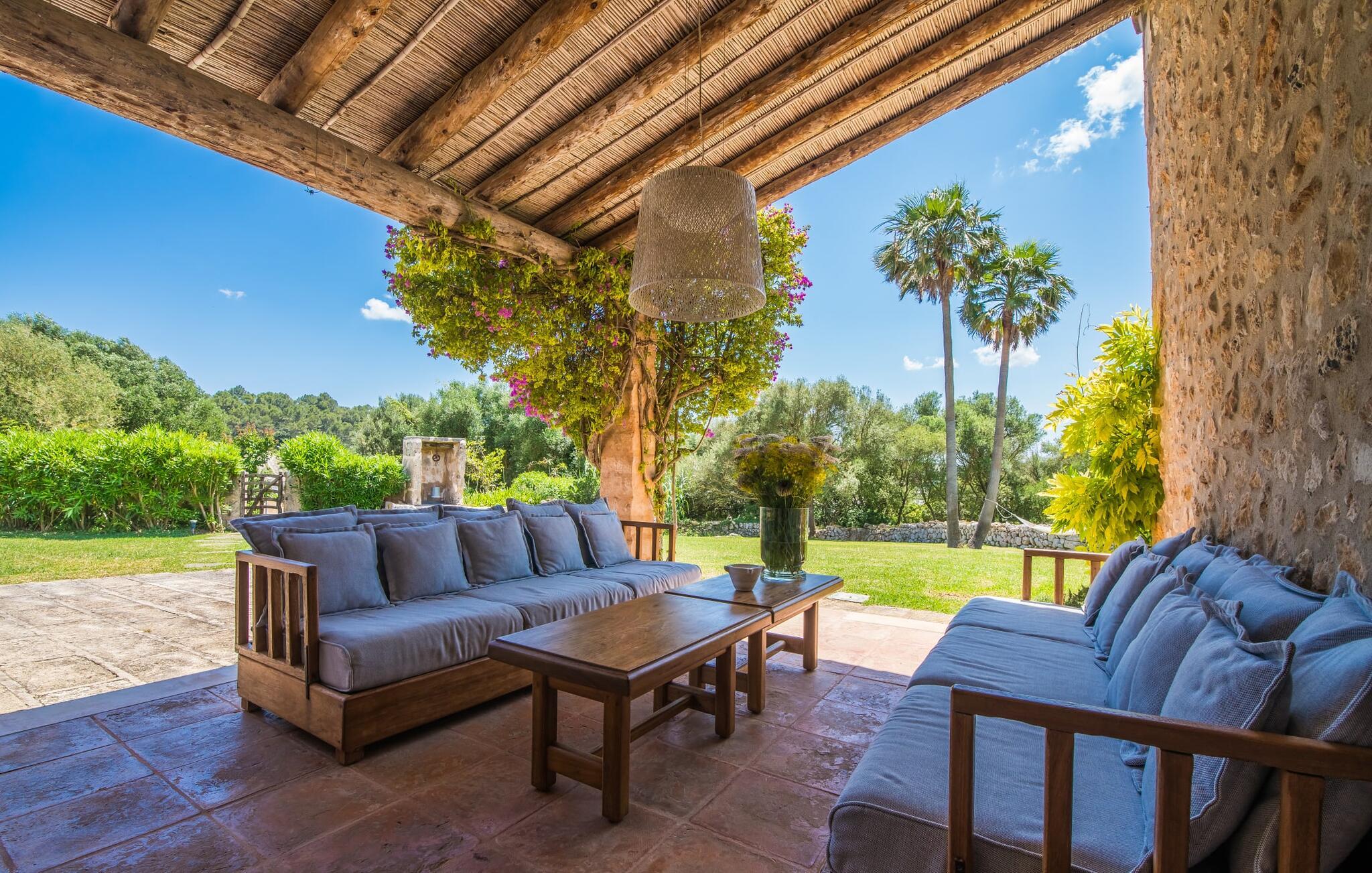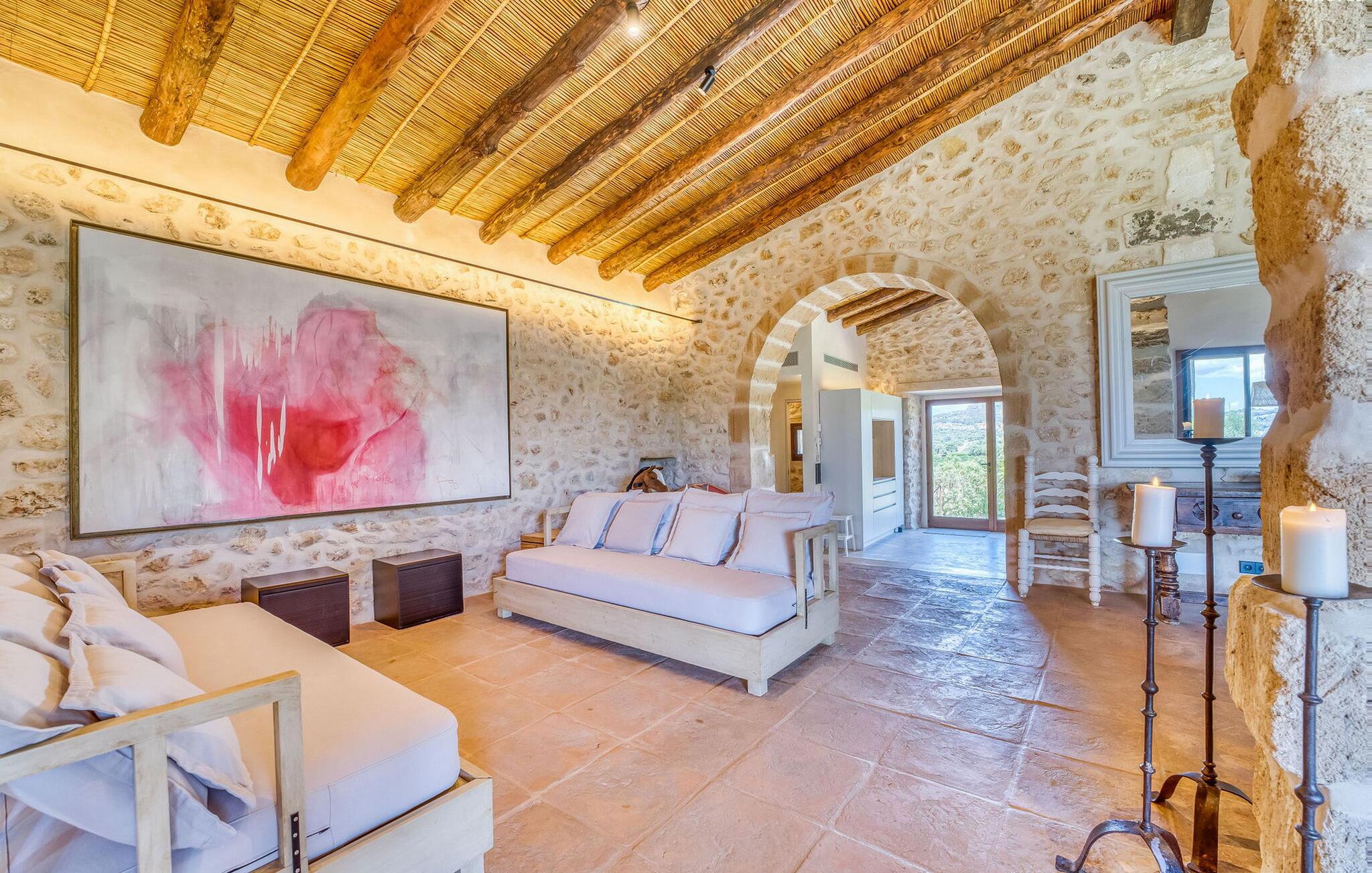 Slap af mellem bakker og marker på en 10.000 m² privat ejendom, slap af i en renoveret "komfortvilla" fra 1600-tallet, nyd livets solrige side eller undslipp de kolde vintermåneder - denne ejendom er ideel til alt. Udefra ligner det en ejendom, I har læst om i en historiebog, med gamle naturstensmure omgivet af bougainvillea. Interiøret er til gengæld moderne, elegant og udstyret med moderne teknologi som gulvvarme og radiatorer. En perle midt i et velholdt parklandskab er den buede svømmehal med sine 15 m lange baner, kun en kort gåtur fra huset. Her kan I slappe af jeres trætte ryg i fred på de solbeskinnede trappetrin og moderne liggestole eller måske endda nyde en udendørs massage under forteltet. Adgang til området gennem porte og mure minimerer risikoen for de små, der rejser med jer. I nærheden af huset finder I et rustikt udekøkken med indbygget grill, en vask og et træbord, som indbyder til magiske grillsessioner. En mobil gasgrill er også tilgængelig. Interiøret: Rummeligt, komfortabelt og unikt! Den store stue - en ombygget lade - sætter imponerende accenter med sit høje loft, gamle træbjælker, synlige stenvægge og hvide siddepladser. Hvem vil ikke gerne sidde i hjørnet af pejsen foran den brølende ild eller spise ved stearinlysets skær ved det lange træbord... Men køkkenet, der er bygget i en halvcirkelform et par trin lavere, er også et hyggeligt sted at sidde og nyde jeres morgenkaffe, mens I er inde, tænk roligt over avisen. Og mangler I et hjemmekontor på ferien, er I godt udstyret med det elegante kontorstudie med bibliotek, pejs, TV og WiFi. Opdelingen i tre dobbelt- og to enkeltværelser i hovedhuset gør det nemmere at rejse med familie og venner: Suite nr. 1 består af et dobbeltværelse, et enkeltværelse og separat adgang. Disse to soveværelser deler badeværelse med bruser og to håndvaske. Suite #2 er placeret bag kontorstudiet og har en stor dobbeltseng, walk-in closet, pengeskab og langt brusebad/badeværelse med dobbelt håndvask. Her kan I nyde solopgangen over markerne om morgenen. Suite nr. 3 (med kommode) er kun tilgængelig via haven. Suiten har eget badeværelse med bruser. Et gæstetoilet og et toilet giver ekstra komfort. Med Sant Llorenç des Cardassar, Porto Cristo og Manacor tilbyder Mallorcas østkyst feriegæster et 3-i-1 tilbud: land-, kyst- og shoppingture er nemme at nå fra Villa "Samu", MA-3323 tager jer hurtigt til jeres destination . Cykling og korte vandreture rundt i den rolige by, nyder friskfanget fisk i den historiske gamle bydel i den lille havneby eller slentrer gennem den omfattende gågade i ø-metropolen - alt dette gør en vellykket ferie farverig og varieret. Der er fire golfbaner i området (Golf Son Servera, Pula Golf og de grønne fairways i Canyamel og Capdepera). De smukke bugter i den østlige del af Mallorca kan nås på cirka 20-30 minutter: Playa de Muro, Son Serra de Marina, Cala Torta, Cala Mesquida, Costa des Pins, Cala Agulla, Cala Mendia, Cala Anguila, Porto Colom, Cala Sa Nau og Cala Mondrago. På den østlige del af øen, indlejret i en parklignende ejendom mellem Manacor og Sant Llorenç, finder I denne familievenlige villaresidens, der opfylder selv de højeste krav. På et kvarters kørsel kan I nå både byen og shoppingmetropolen, der er omkring 20 km til Artà, den lille havneby Porto Cristo og Badia d'Alcúdia. Med den omfattende strand Son Serra de Marina er denne bugt ideel til svømning og surfing, og vandreområdet omkring Betlem er tæt på.