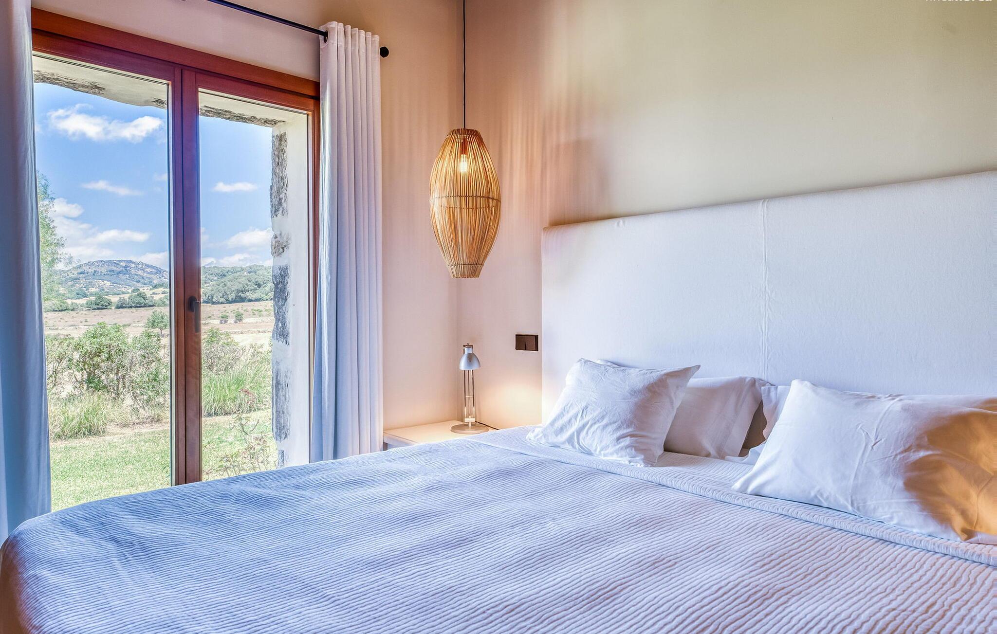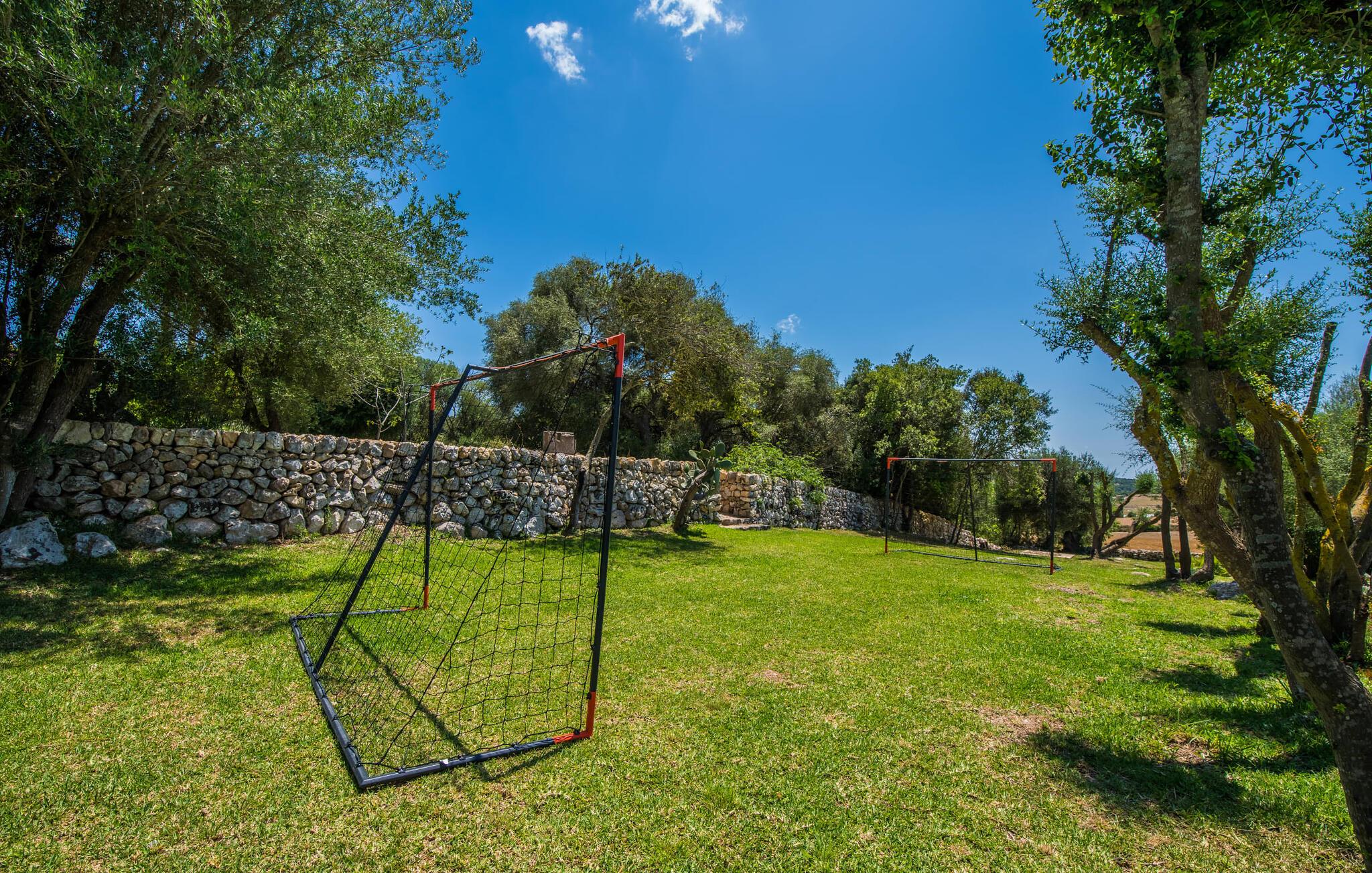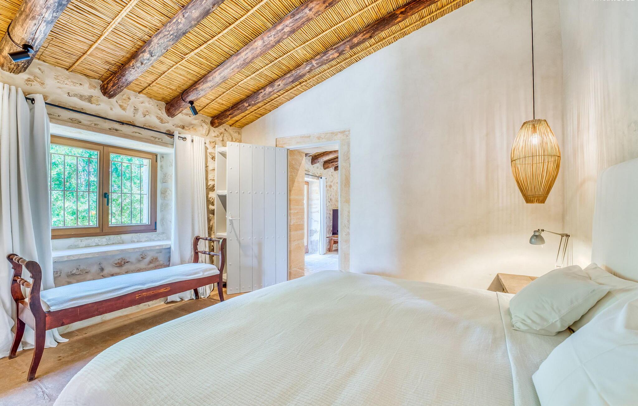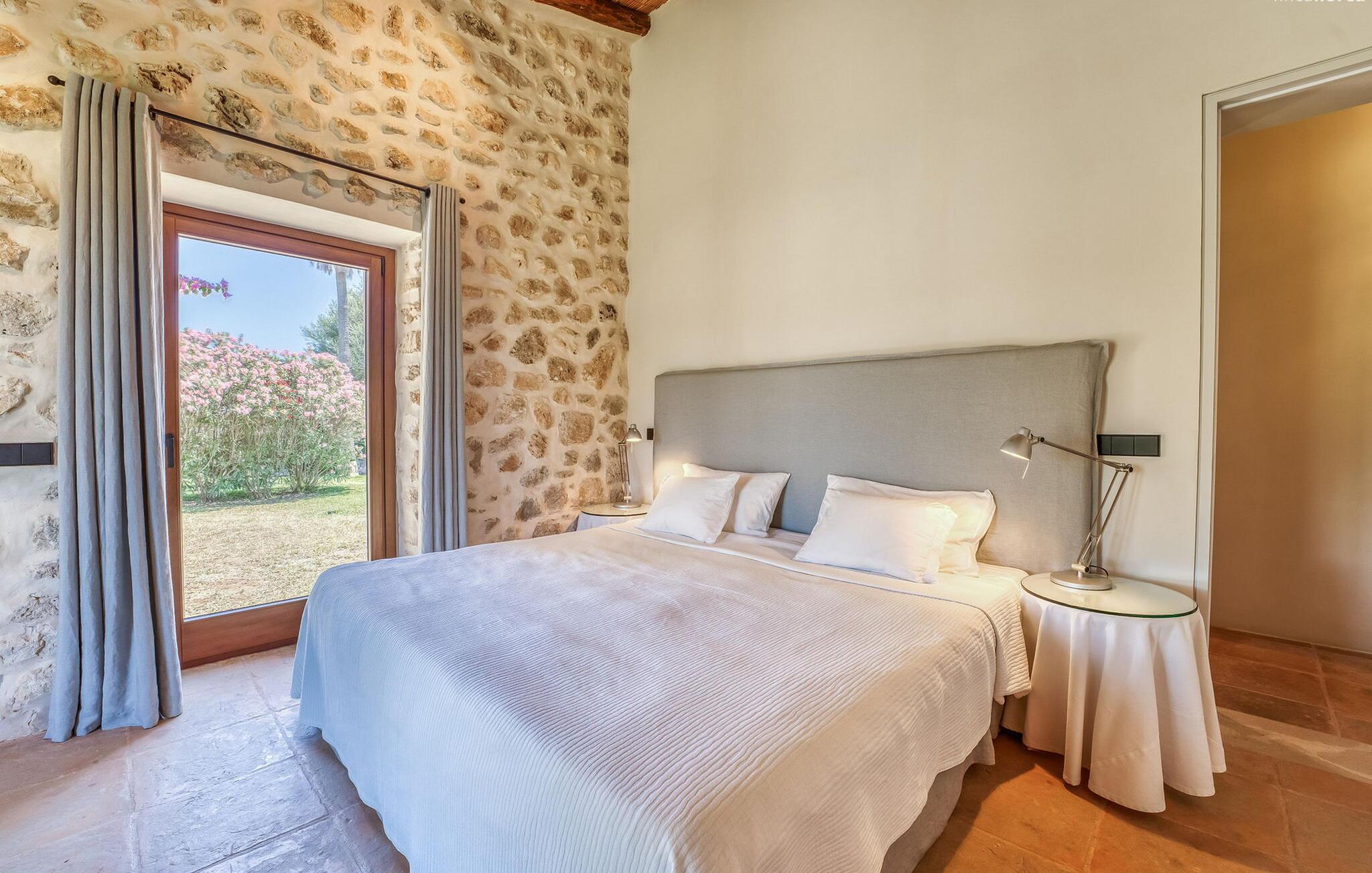 Slap af mellem bakker og marker på en 10.000 m² privat ejendom, slap af i en renoveret "komfortvilla" fra 1600-tallet, nyd livets solrige side eller undslipp de kolde vintermåneder - denne ejendom er ideel til alt. Udefra ligner det en ejendom, I har læst om i en historiebog, med gamle naturstensmure omgivet af bougainvillea. Interiøret er til gengæld moderne, elegant og udstyret med moderne teknologi som gulvvarme og radiatorer. En perle midt i et velholdt parklandskab er den buede svømmehal med sine 15 m lange baner, kun en kort gåtur fra huset. Her kan I slappe af jeres trætte ryg i fred på de solbeskinnede trappetrin og moderne liggestole eller måske endda nyde en udendørs massage under forteltet. Adgang til området gennem porte og mure minimerer risikoen for de små, der rejser med jer. I nærheden af huset finder I et rustikt udekøkken med indbygget grill, en vask og et træbord, som indbyder til magiske grillsessioner. En mobil gasgrill er også tilgængelig. Interiøret: Rummeligt, komfortabelt og unikt! Den store stue - en ombygget lade - sætter imponerende accenter med sit høje loft, gamle træbjælker, synlige stenvægge og hvide siddepladser. Hvem vil ikke gerne sidde i hjørnet af pejsen foran den brølende ild eller spise ved stearinlysets skær ved det lange træbord... Men køkkenet, der er bygget i en halvcirkelform et par trin lavere, er også et hyggeligt sted at sidde og nyde jeres morgenkaffe, mens I er inde, tænk roligt over avisen. Og mangler I et hjemmekontor på ferien, er I godt udstyret med det elegante kontorstudie med bibliotek, pejs, TV og WiFi. Opdelingen i tre dobbelt- og to enkeltværelser i hovedhuset gør det nemmere at rejse med familie og venner: Suite nr. 1 består af et dobbeltværelse, et enkeltværelse og separat adgang. Disse to soveværelser deler badeværelse med bruser og to håndvaske. Suite #2 er placeret bag kontorstudiet og har en stor dobbeltseng, walk-in closet, pengeskab og langt brusebad/badeværelse med dobbelt håndvask. Her kan I nyde solopgangen over markerne om morgenen. Suite nr. 3 (med kommode) er kun tilgængelig via haven. Suiten har eget badeværelse med bruser. Et gæstetoilet og et toilet giver ekstra komfort. Med Sant Llorenç des Cardassar, Porto Cristo og Manacor tilbyder Mallorcas østkyst feriegæster et 3-i-1 tilbud: land-, kyst- og shoppingture er nemme at nå fra Villa "Samu", MA-3323 tager jer hurtigt til jeres destination . Cykling og korte vandreture rundt i den rolige by, nyder friskfanget fisk i den historiske gamle bydel i den lille havneby eller slentrer gennem den omfattende gågade i ø-metropolen - alt dette gør en vellykket ferie farverig og varieret. Der er fire golfbaner i området (Golf Son Servera, Pula Golf og de grønne fairways i Canyamel og Capdepera). De smukke bugter i den østlige del af Mallorca kan nås på cirka 20-30 minutter: Playa de Muro, Son Serra de Marina, Cala Torta, Cala Mesquida, Costa des Pins, Cala Agulla, Cala Mendia, Cala Anguila, Porto Colom, Cala Sa Nau og Cala Mondrago. På den østlige del af øen, indlejret i en parklignende ejendom mellem Manacor og Sant Llorenç, finder I denne familievenlige villaresidens, der opfylder selv de højeste krav. På et kvarters kørsel kan I nå både byen og shoppingmetropolen, der er omkring 20 km til Artà, den lille havneby Porto Cristo og Badia d'Alcúdia. Med den omfattende strand Son Serra de Marina er denne bugt ideel til svømning og surfing, og vandreområdet omkring Betlem er tæt på.