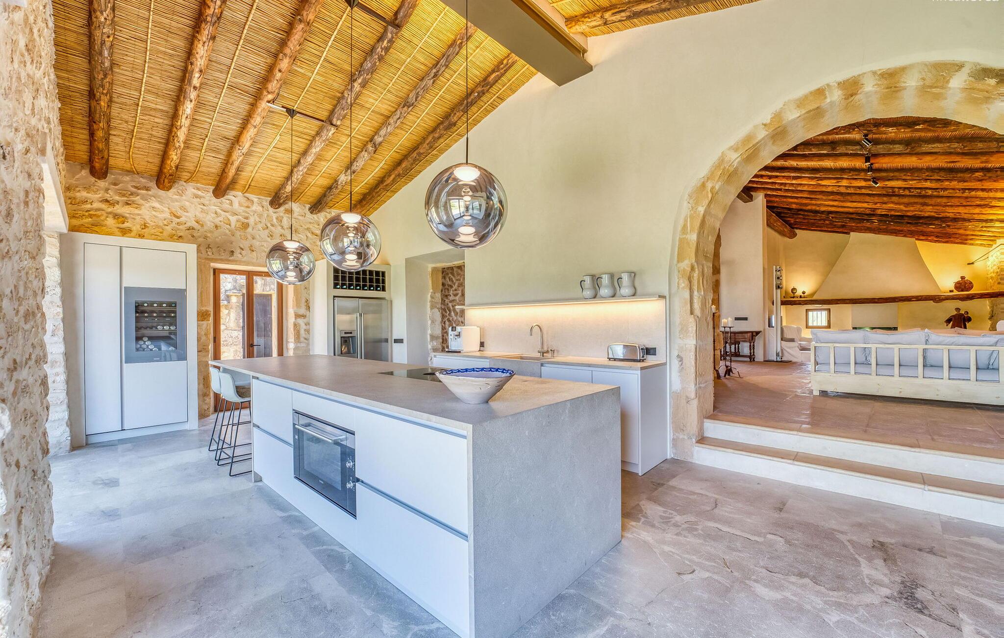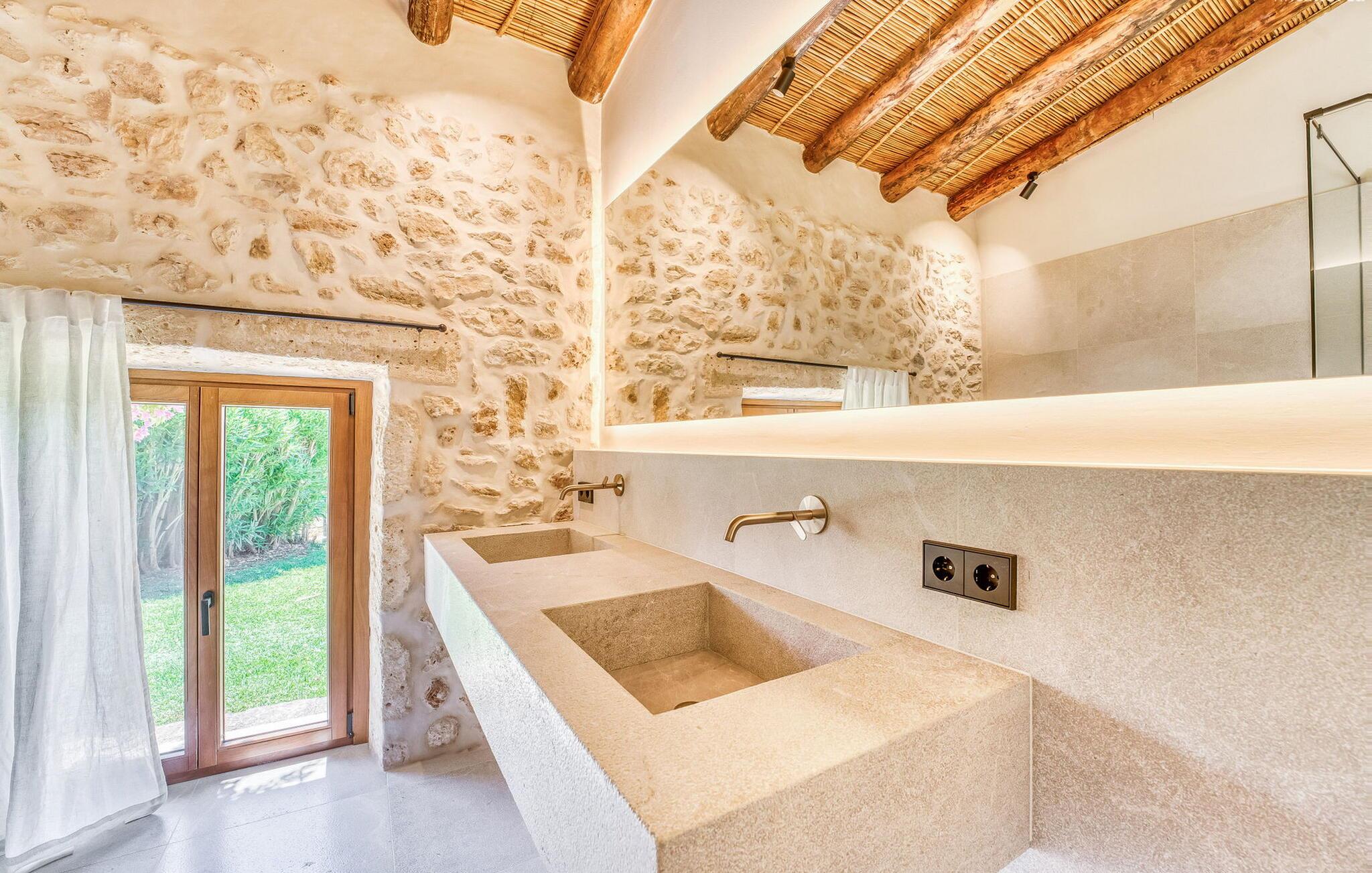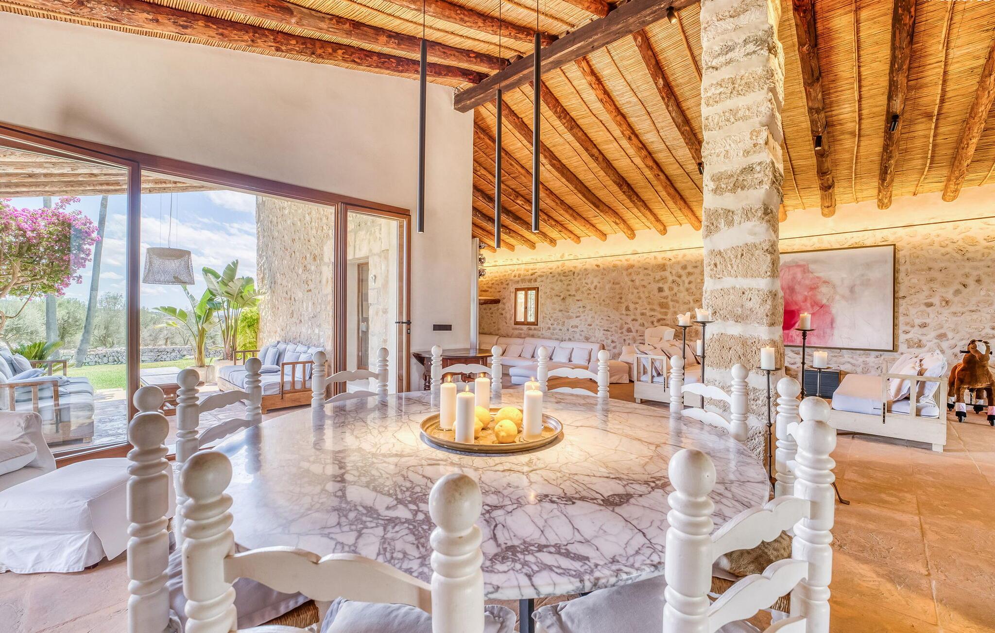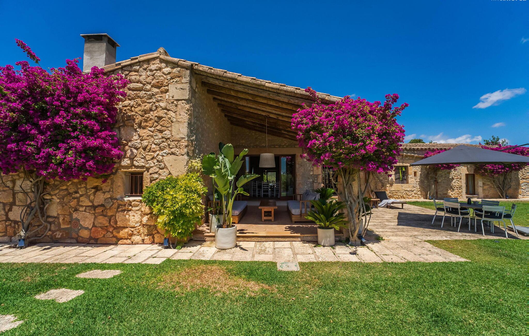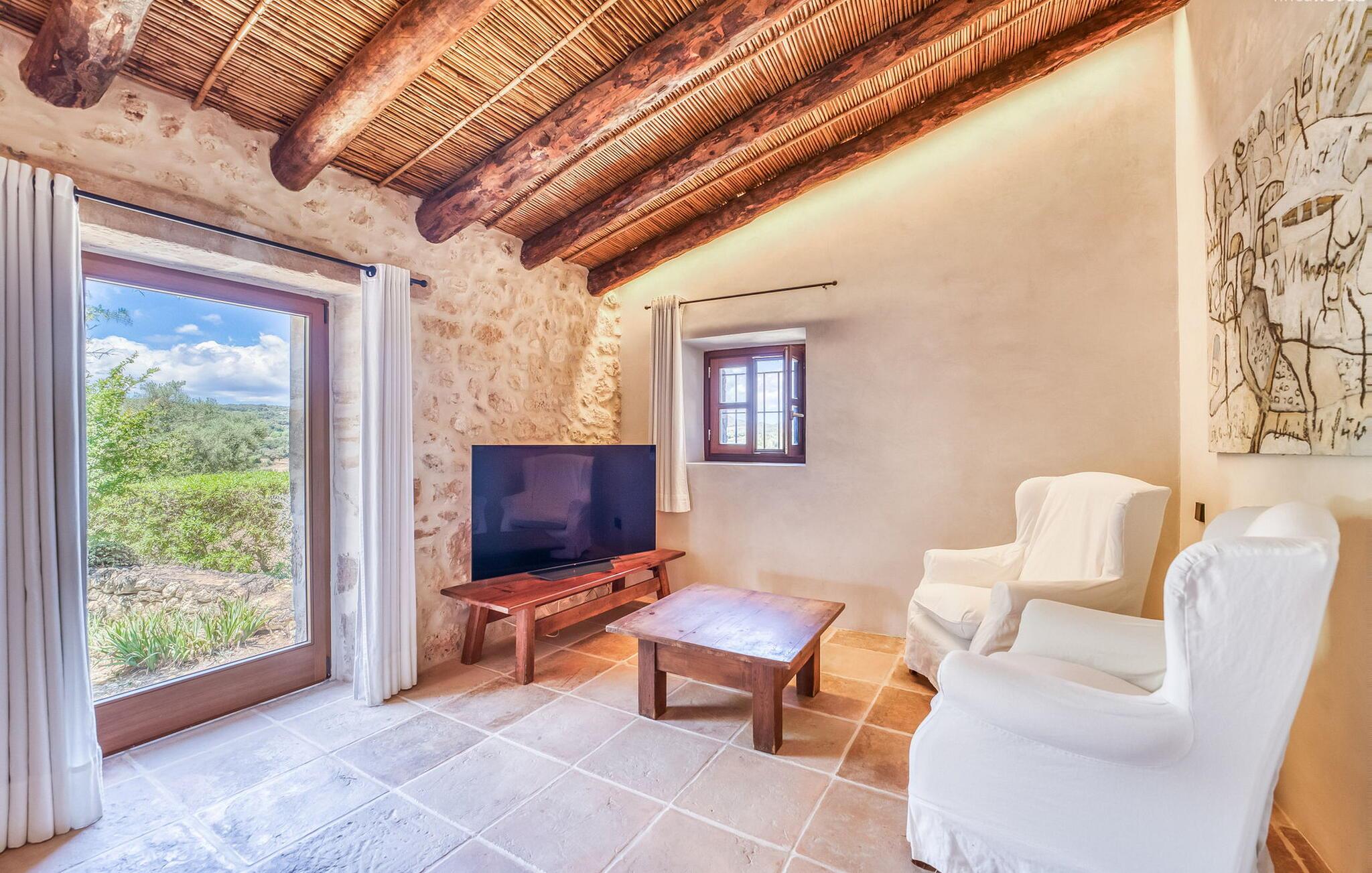Slap af mellem bakker og marker på en 10.000 m² privat ejendom, slap af i en renoveret "komfortvilla" fra 1600-tallet, nyd livets solrige side eller undslipp de kolde vintermåneder - denne ejendom er ideel til alt. Udefra ligner det en ejendom, I har læst om i en historiebog, med gamle naturstensmure omgivet af bougainvillea. Interiøret er til gengæld moderne, elegant og udstyret med moderne teknologi som gulvvarme og radiatorer. En perle midt i et velholdt parklandskab er den buede svømmehal med sine 15 m lange baner, kun en kort gåtur fra huset. Her kan I slappe af jeres trætte ryg i fred på de solbeskinnede trappetrin og moderne liggestole eller måske endda nyde en udendørs massage under forteltet. Adgang til området gennem porte og mure minimerer risikoen for de små, der rejser med jer. I nærheden af huset finder I et rustikt udekøkken med indbygget grill, en vask og et træbord, som indbyder til magiske grillsessioner. En mobil gasgrill er også tilgængelig. Interiøret: Rummeligt, komfortabelt og unikt! Den store stue - en ombygget lade - sætter imponerende accenter med sit høje loft, gamle træbjælker, synlige stenvægge og hvide siddepladser. Hvem vil ikke gerne sidde i hjørnet af pejsen foran den brølende ild eller spise ved stearinlysets skær ved det lange træbord... Men køkkenet, der er bygget i en halvcirkelform et par trin lavere, er også et hyggeligt sted at sidde og nyde jeres morgenkaffe, mens I er inde, tænk roligt over avisen. Og mangler I et hjemmekontor på ferien, er I godt udstyret med det elegante kontorstudie med bibliotek, pejs, TV og WiFi. Opdelingen i tre dobbelt- og to enkeltværelser i hovedhuset gør det nemmere at rejse med familie og venner: Suite nr. 1 består af et dobbeltværelse, et enkeltværelse og separat adgang. Disse to soveværelser deler badeværelse med bruser og to håndvaske. Suite #2 er placeret bag kontorstudiet og har en stor dobbeltseng, walk-in closet, pengeskab og langt brusebad/badeværelse med dobbelt håndvask. Her kan I nyde solopgangen over markerne om morgenen. Suite nr. 3 (med kommode) er kun tilgængelig via haven. Suiten har eget badeværelse med bruser. Et gæstetoilet og et toilet giver ekstra komfort. Med Sant Llorenç des Cardassar, Porto Cristo og Manacor tilbyder Mallorcas østkyst feriegæster et 3-i-1 tilbud: land-, kyst- og shoppingture er nemme at nå fra Villa "Samu", MA-3323 tager jer hurtigt til jeres destination . Cykling og korte vandreture rundt i den rolige by, nyder friskfanget fisk i den historiske gamle bydel i den lille havneby eller slentrer gennem den omfattende gågade i ø-metropolen - alt dette gør en vellykket ferie farverig og varieret. Der er fire golfbaner i området (Golf Son Servera, Pula Golf og de grønne fairways i Canyamel og Capdepera). De smukke bugter i den østlige del af Mallorca kan nås på cirka 20-30 minutter: Playa de Muro, Son Serra de Marina, Cala Torta, Cala Mesquida, Costa des Pins, Cala Agulla, Cala Mendia, Cala Anguila, Porto Colom, Cala Sa Nau og Cala Mondrago. På den østlige del af øen, indlejret i en parklignende ejendom mellem Manacor og Sant Llorenç, finder I denne familievenlige villaresidens, der opfylder selv de højeste krav. På et kvarters kørsel kan I nå både byen og shoppingmetropolen, der er omkring 20 km til Artà, den lille havneby Porto Cristo og Badia d'Alcúdia. Med den omfattende strand Son Serra de Marina er denne bugt ideel til svømning og surfing, og vandreområdet omkring Betlem er tæt på.
