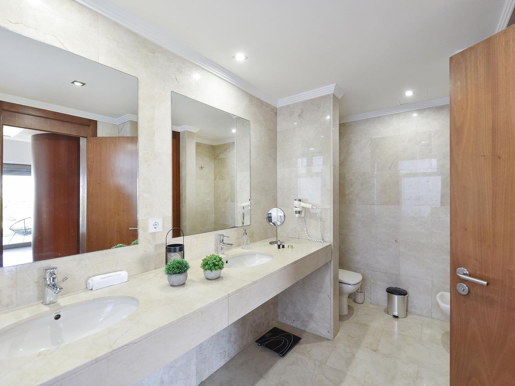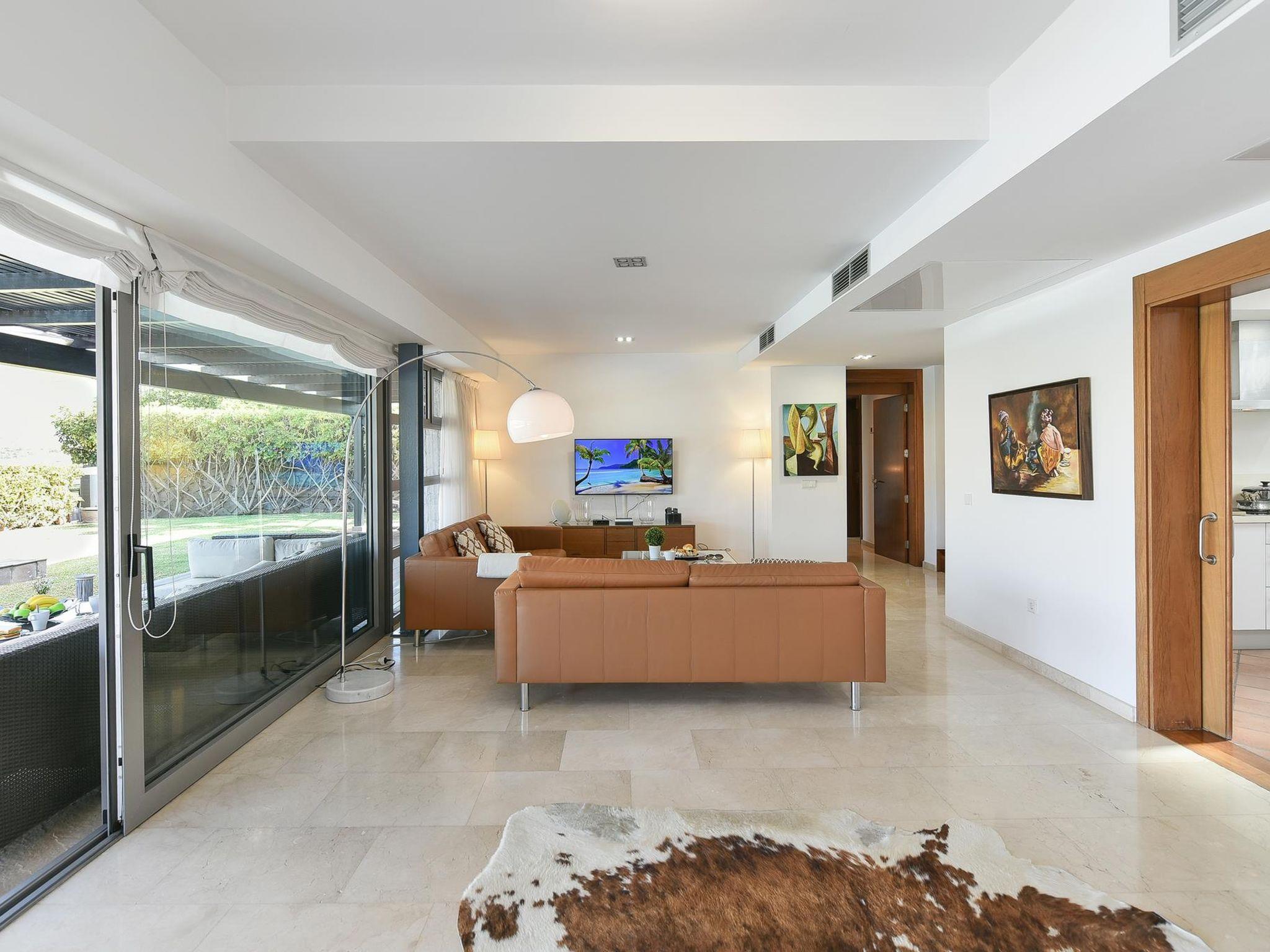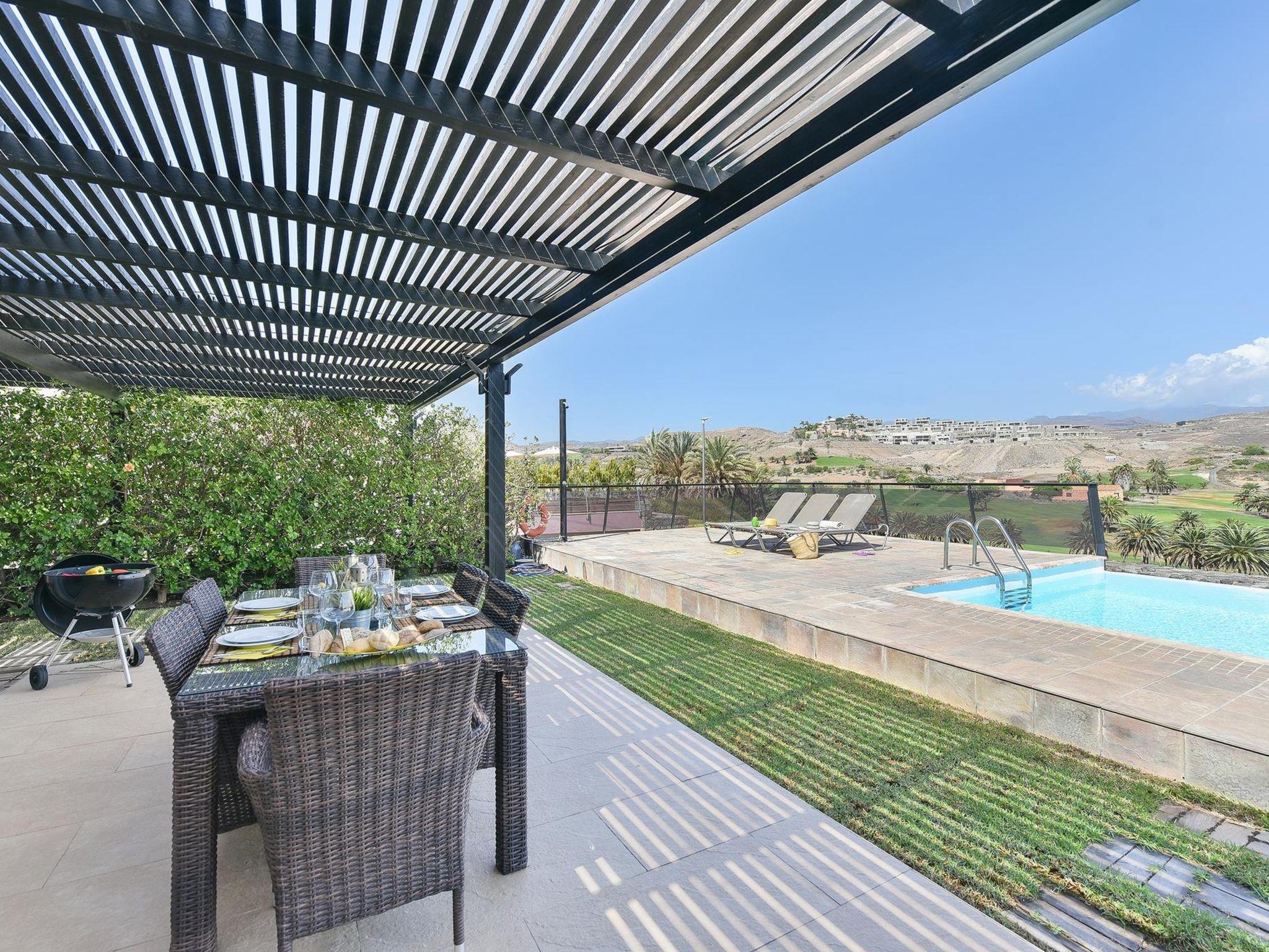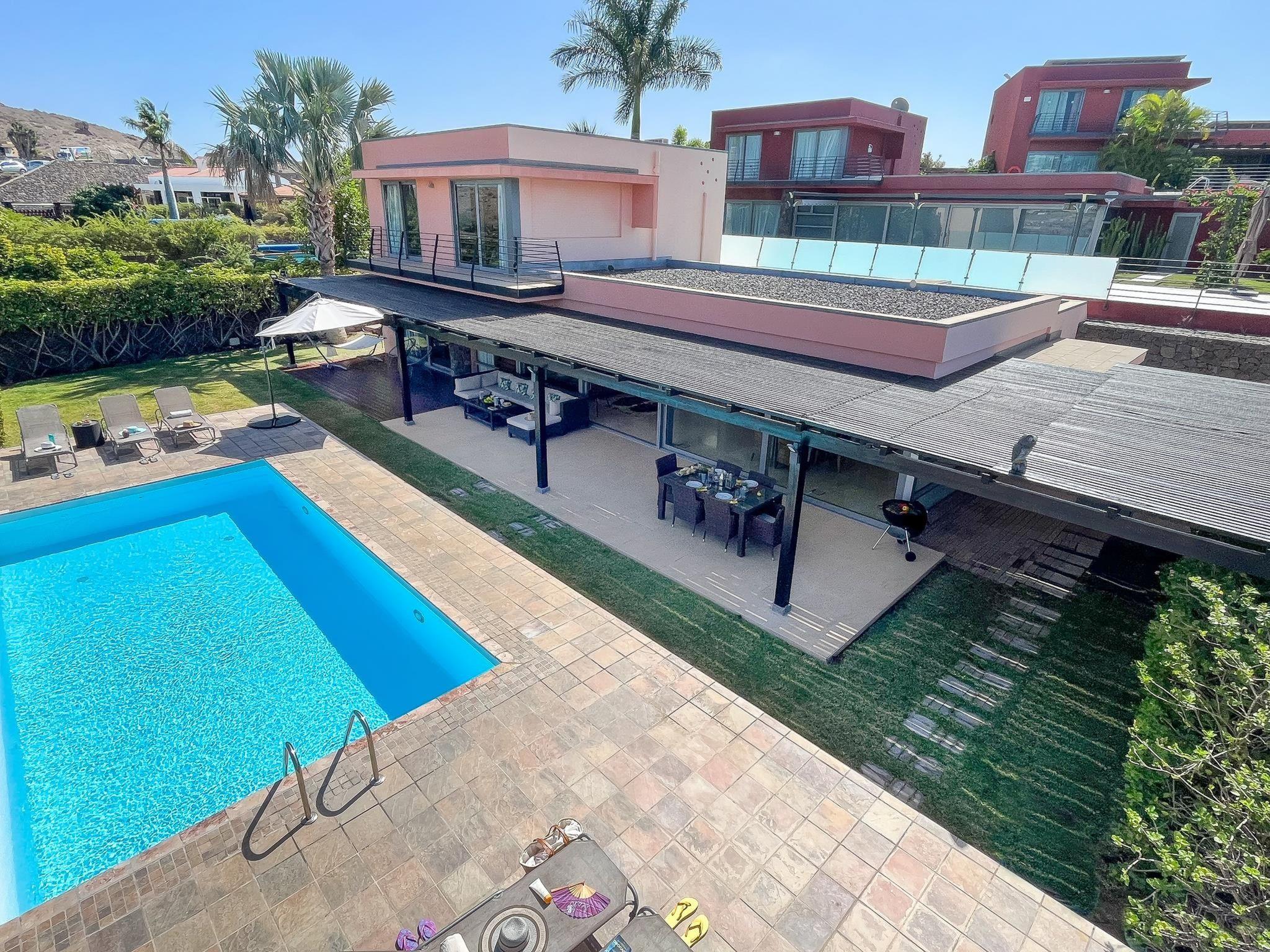"Salobre Villa 2", 5-room house 200 m2. Living/sleeping room with TV and air conditioning. Exit to the patio with 1 double bed and shower/WC. Exit to the patio with 1 double bed and shower/WC with 2 beds and bathroom. Kitchen (oven, dishwasher, 3 ceramic glass hob hotplates, microwave, freezer) with dining table. Natural stone floors. Facilities: washing machine, safe, iron, children's high chair, baby cot for up to 2 year olds, hair dryer. Internet (WiFi). Suitable for families. Maximum 1 pet/ dog allowed. 2016/1443 // Reg. Nr.: ESFCTU0000350120002921450000000000000VV-35-1-00016834