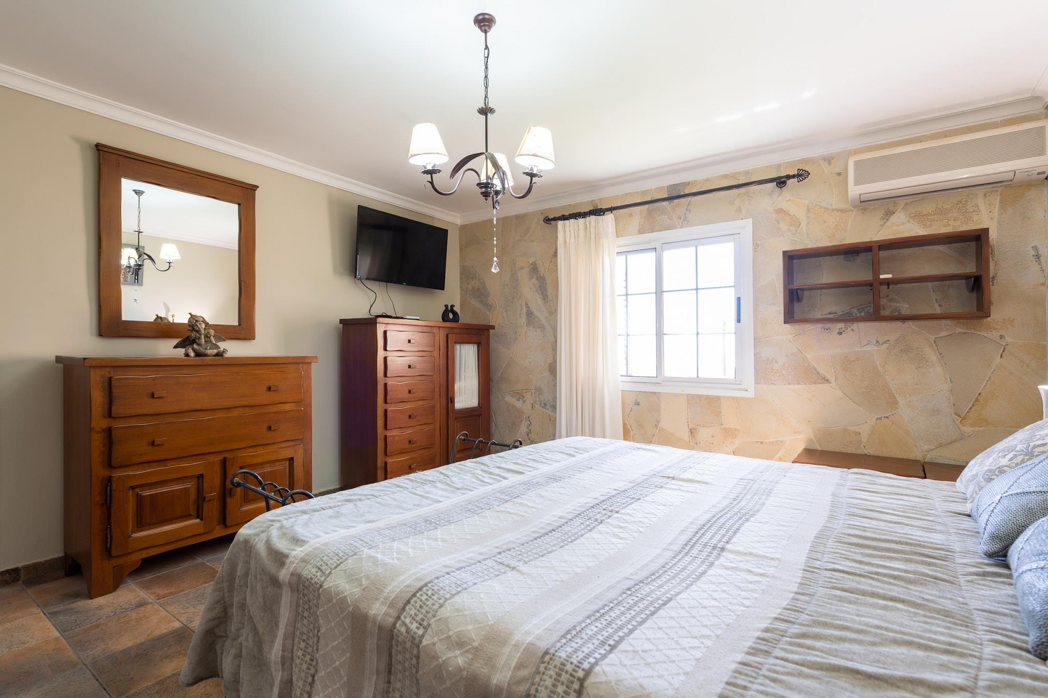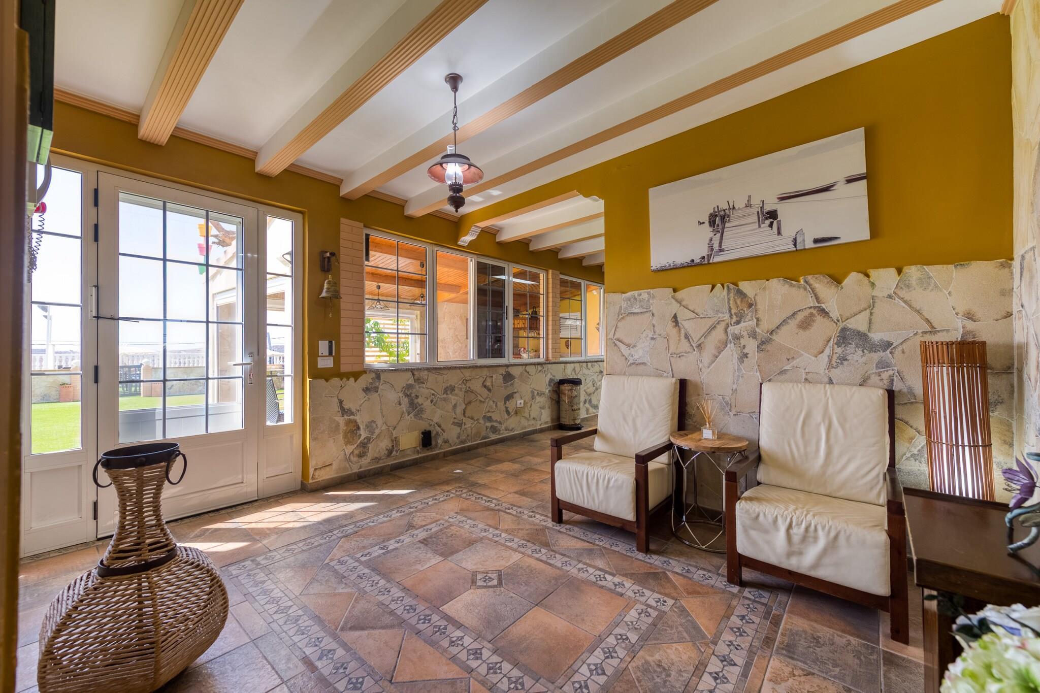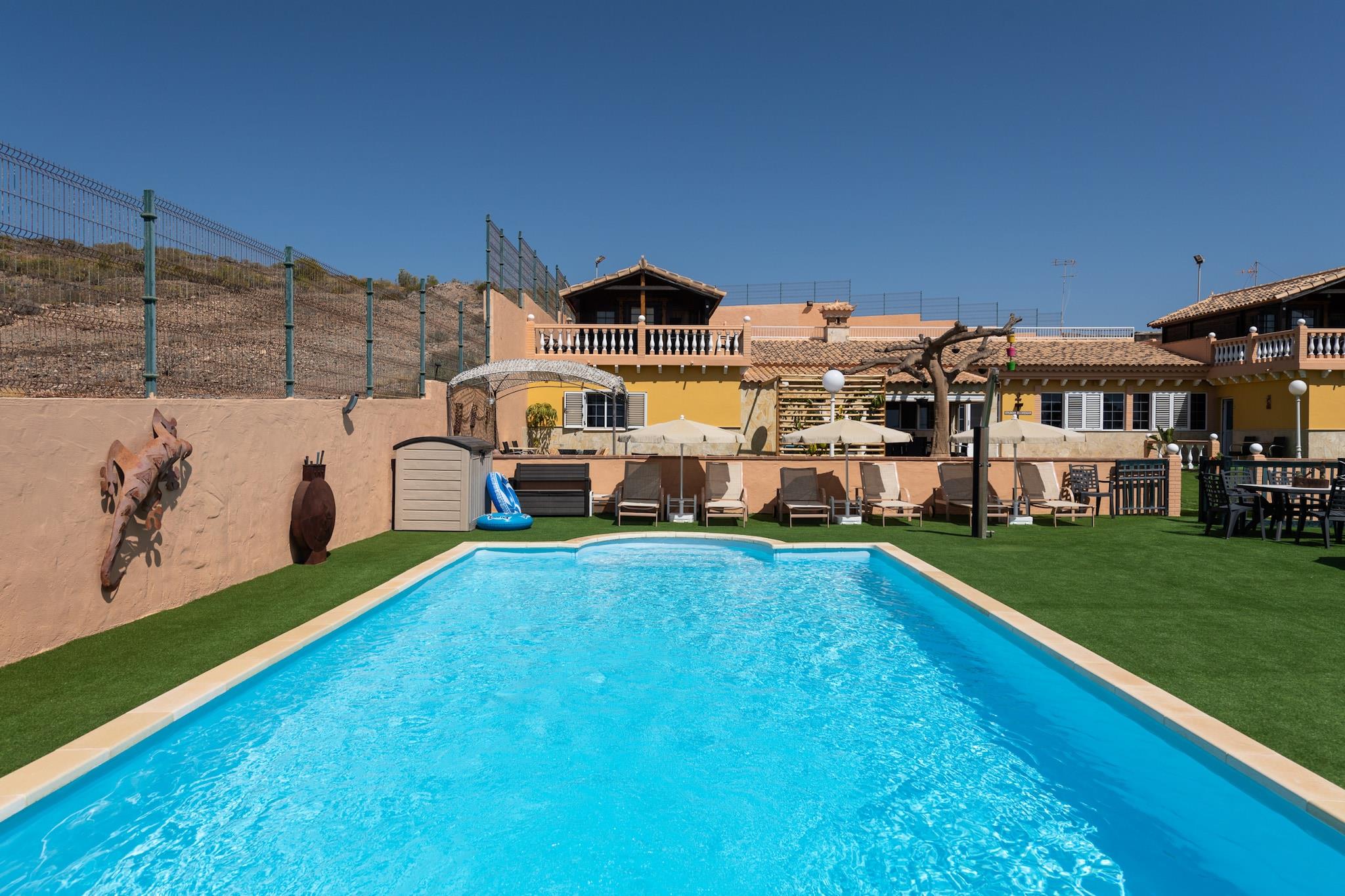 Flygt til denne fantastiske villa i Maspalomas, perfekt til familiesammenkomster eller grupper, der søger afslapning og sjov. Ejendommen har et rummeligt design og har en stor opvarmet pool, omgivet af et frodigt kunstgræsareal, der er ideelt til at slappe af eller lege. Nyd en række udendørs aktiviteter, herunder tennis, fodbold, basketball og bordtennis, eller slap af i chill-out-området med en grill. Villaen byder på rigelig plads til op til 12 gæster plus 2 ekstra gæster på en sovesofa. Indenfor finder du fire smukt designede soveværelser, hver udstyret med sengetøj af høj kvalitet for maksimal komfort. Hovedhuset omfatter et fuldt udstyret køkken med moderne apparater, en spisestue med plads til 14 og en hyggelig stue med et smart-tv. To private hytter med uafhængig adgang giver ekstra privatliv, hver med en terrasse, en-suite badeværelse og aircondition. Villaen er perfekt til en fredfyldt atmosfære, kun 15 minutter fra en ferie. Strand. For familier med små børn er barnesenge og høje stole tilgængelige efter anmodning. Derudover tilbyder villaen aircondition i de fleste værelser, Wi-Fi og parkering til flere biler. Det omkringliggende område er stille og fredeligt, så du kan nyde roen på øen, mens nærliggende attraktioner såsom indkøbscentre, golfbaner og strande er kun en kort køretur væk.