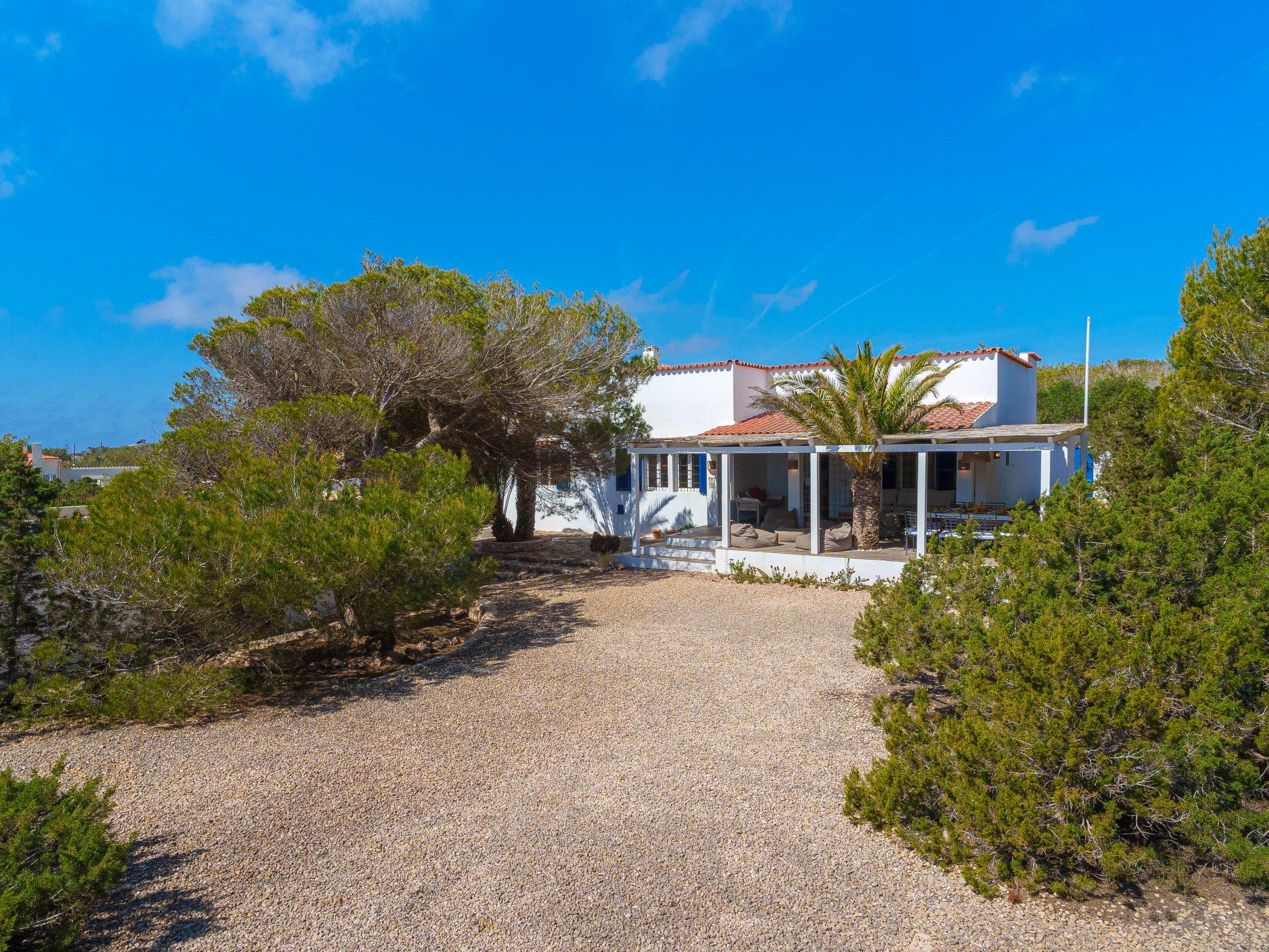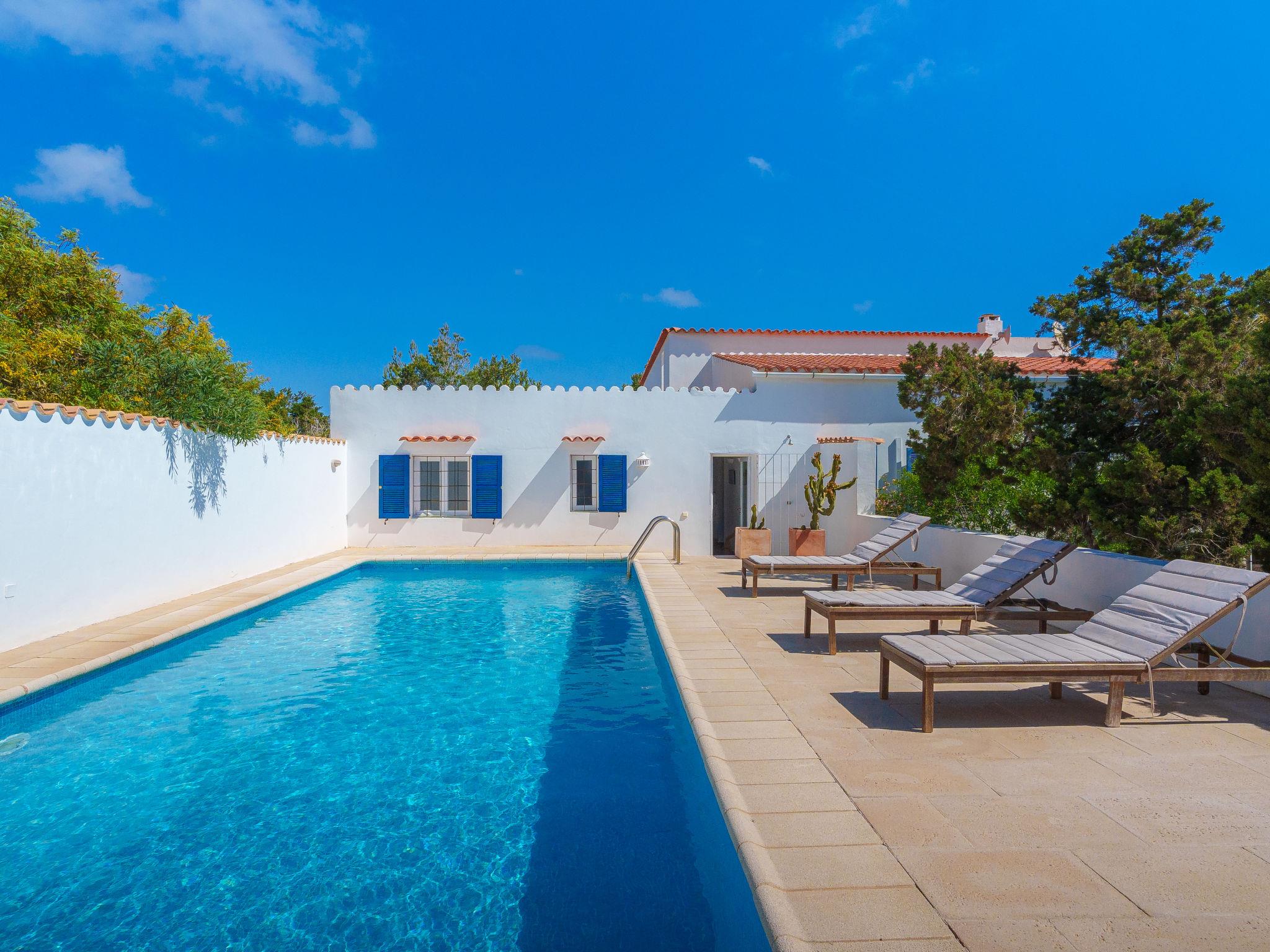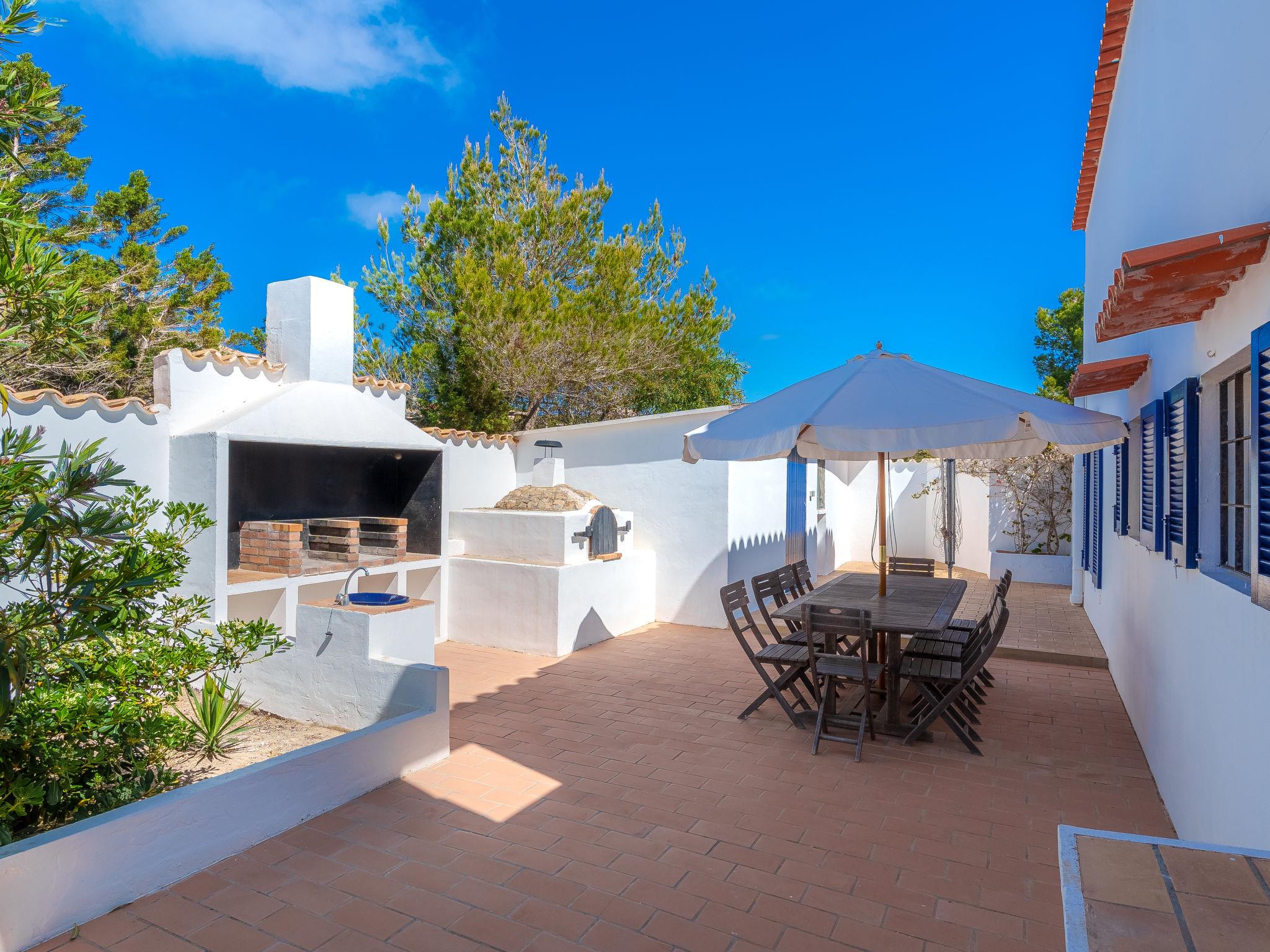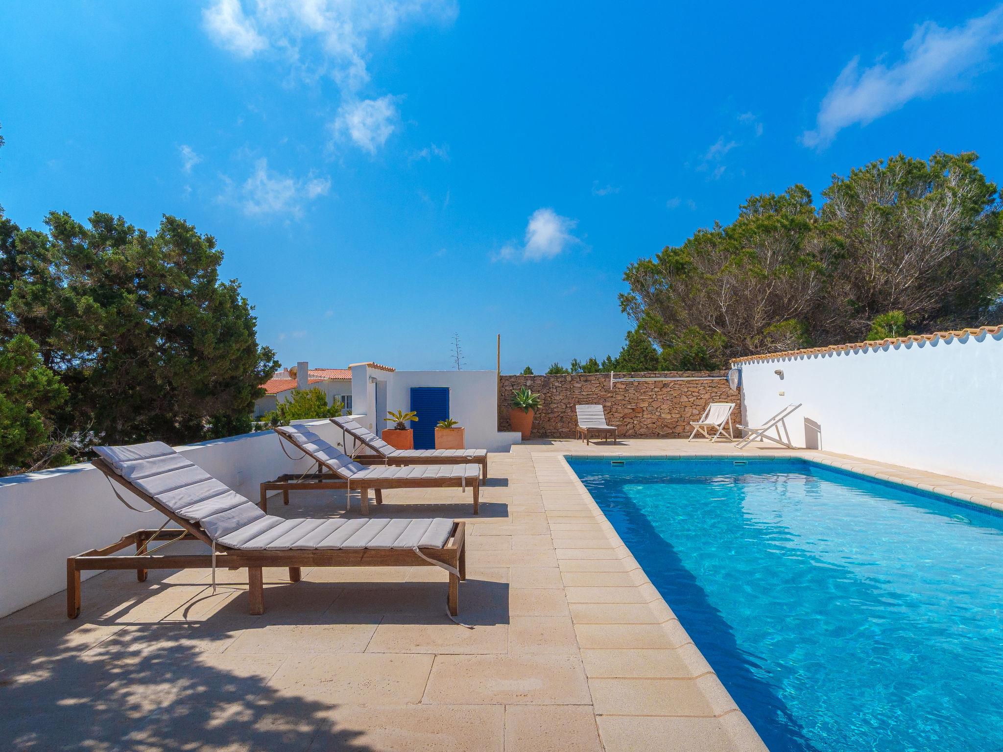 Formentera 1 km from Sant Ferran: Beautiful, comfortable villa "Casa Rubi", surrounded by trees. On the outskirts, 1 km from the centre of Sant Ferran, in a quiet, sunny position, traffic calmed area, 100 m from the edge of the forest, 150 m from the sea, east facing position. Private: 1'000 m2, natural garden, lawn for sunbathing, beautiful garden to relax, swimming pool angular (10 x 4 m, 40 m2, depth 130 - 160 cm, seasonal availability: 01.May. - 30.Sep.). Shower/WC in the pool area, patio, arbour, pergola (90 m2), garden furniture, barbecue. In the house: internet access, WiFi, washing machine. Parking at the house on the premises. Shop 2 km, grocery 2 km, supermarket 2 km, restaurant 2 km, bar 2 km, bakery 2 km, café 2 km, 15 minute walk to the centre, bus stop "Sant Ferran" 2 km, ferry "La Savina" 5 km, sandy beach "Illetes" 7 km, rocky beach "Cala en Baster" 50 m (small). Sports harbour 6 km, marina 6 km, walking paths from the house, cycle lane 100 m. Nearby attractions: Playa de Ses Illetes 8 km, Es Cap de Barbaria 7 km, Cala Saona 9 km, Platja de Migjorn 4 km. Hiking paths: Sant Ferrán-Ses Roques-cala En Baster 100 m. Please note: car recommended. Suitable for seniors baby equipment on request (included). Object suitable for 10 adults. The owner does not accept any youth groups. Loading and unloading of baggage is possible at the holiday house. Neighbourhood highly sensitive to noise. Quietness and good behaviour expected.
